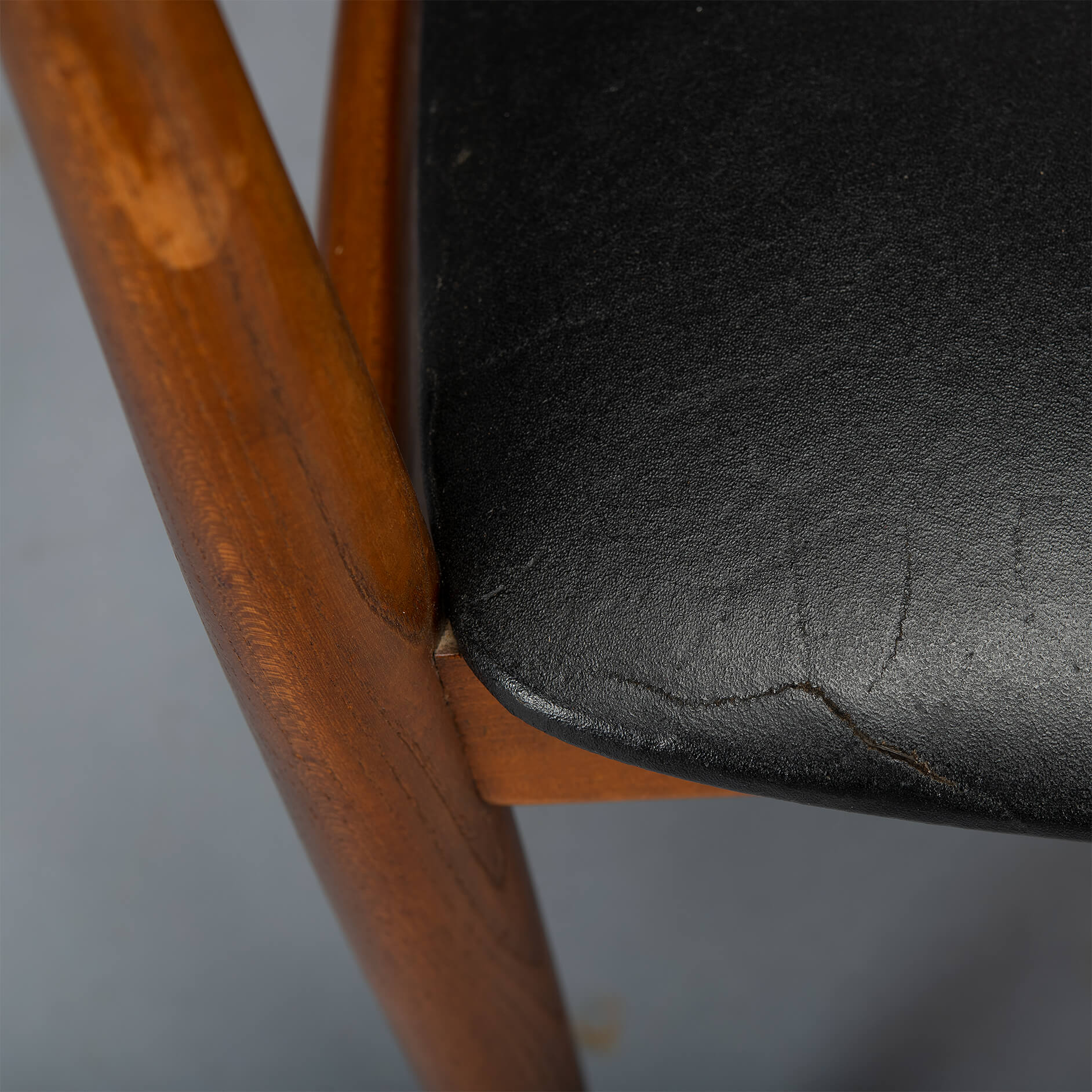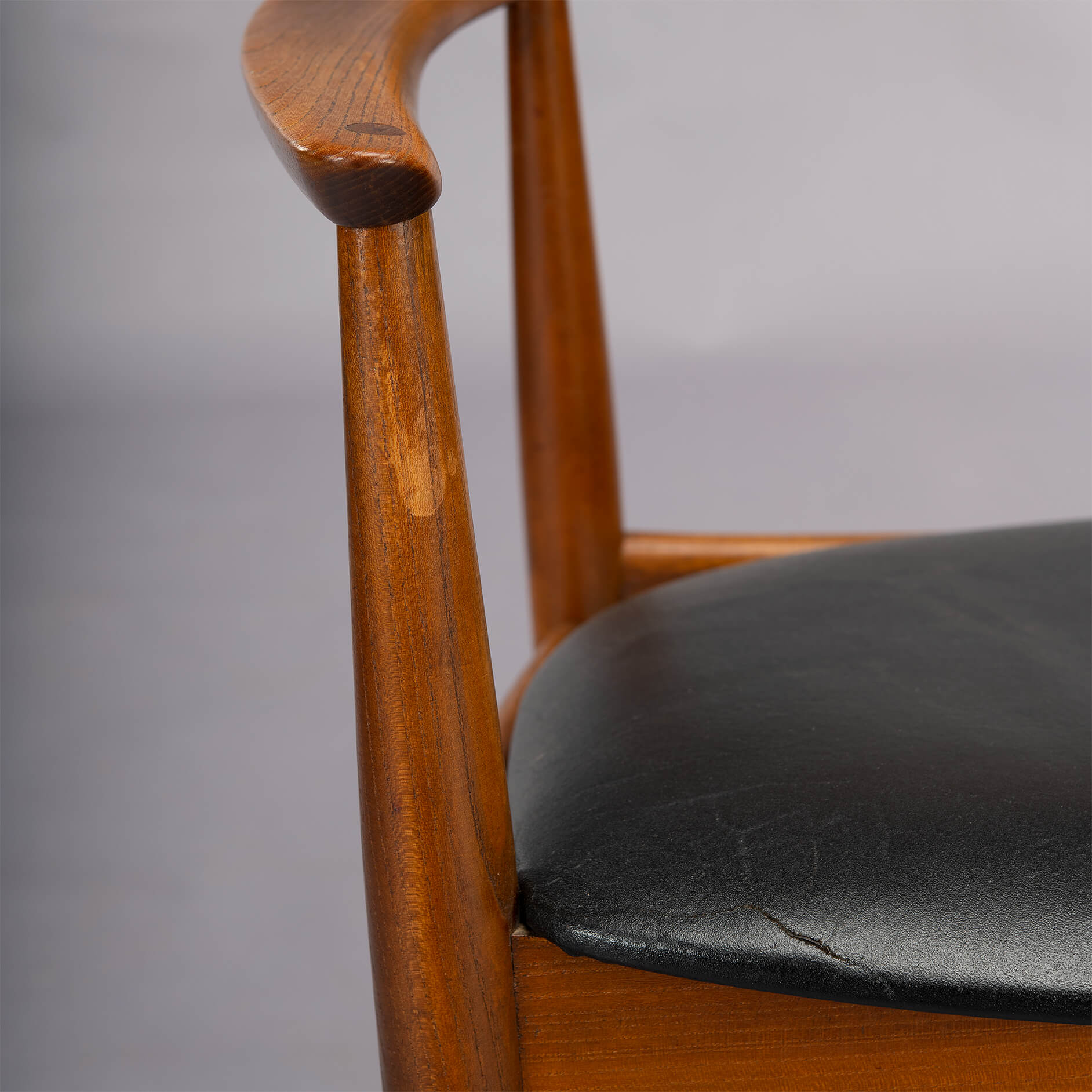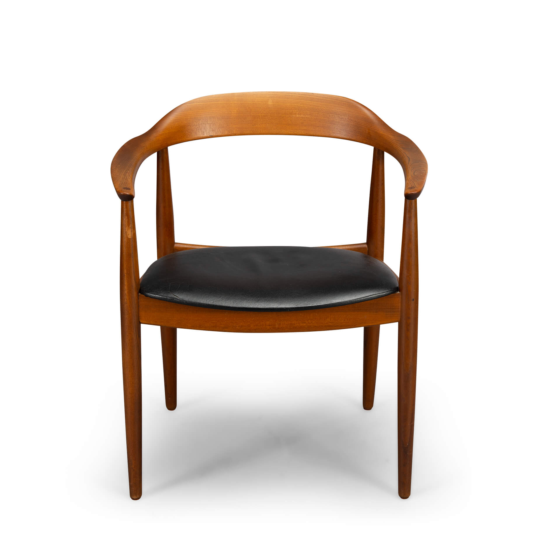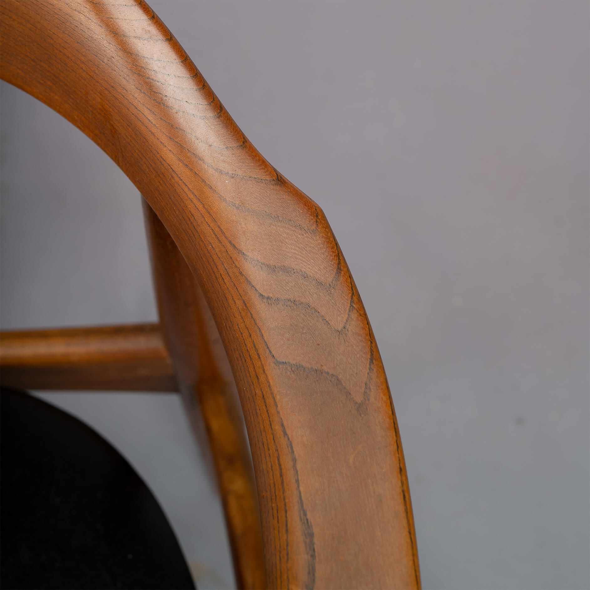 Spotted in the blink of an eye, this is an Eilersen! Design is often attributed to Illum Wikkelsø but it was Arne Wahl Iversen who designed this chair, regardless it is instantaneously recognisable as an Niels Eilersen. Producer Eilersen was proficient in steam bending of wood and made the back of the chair and armrests in one piece.