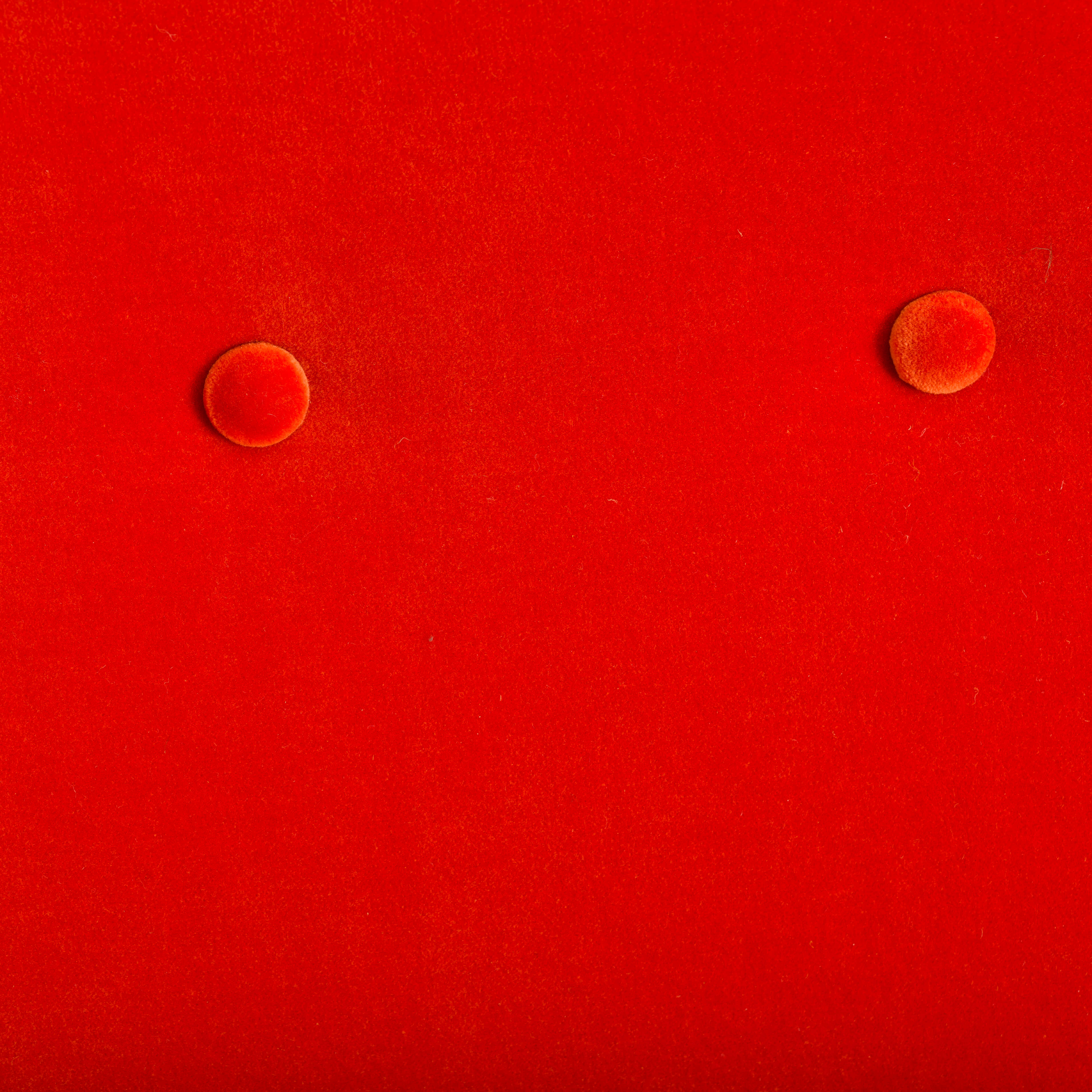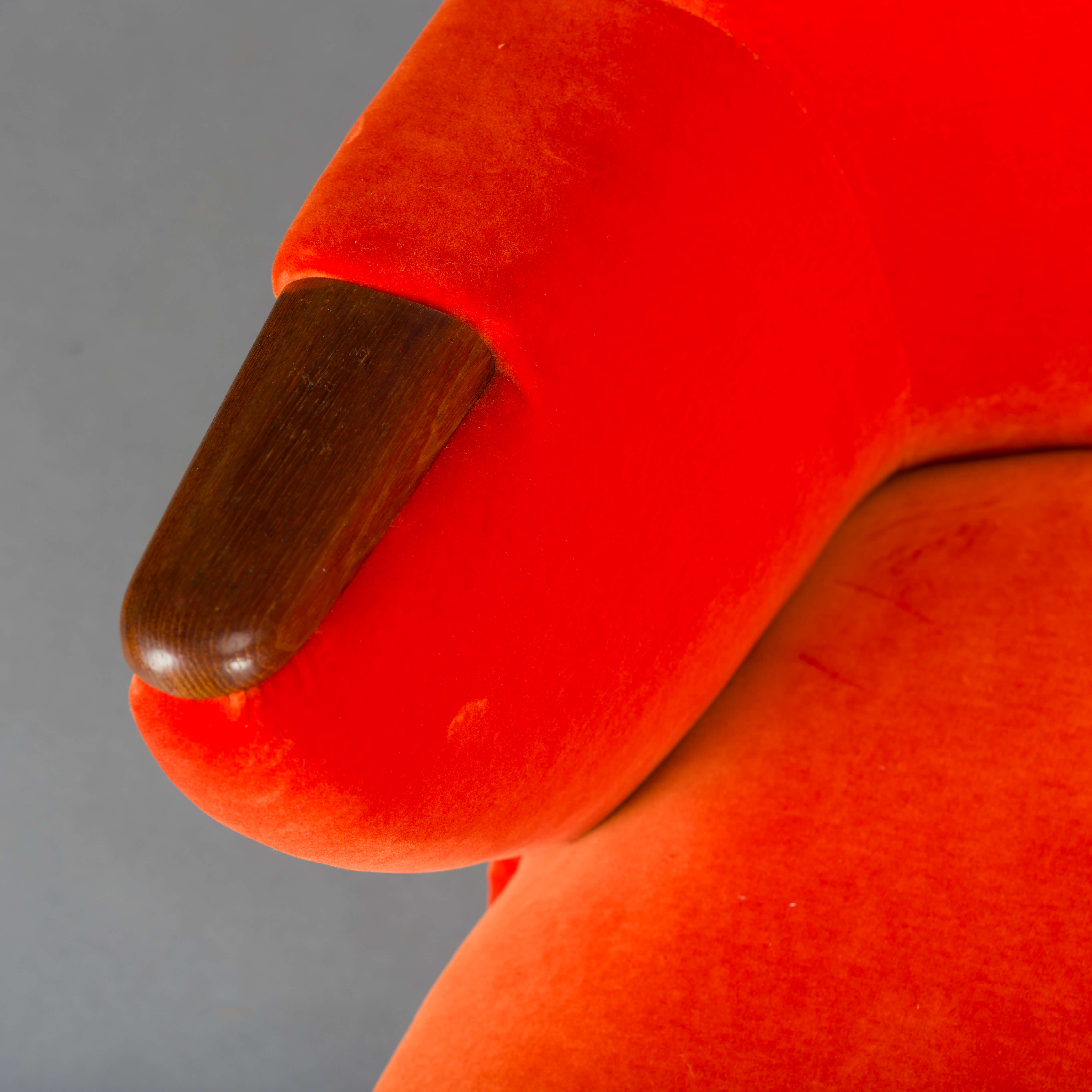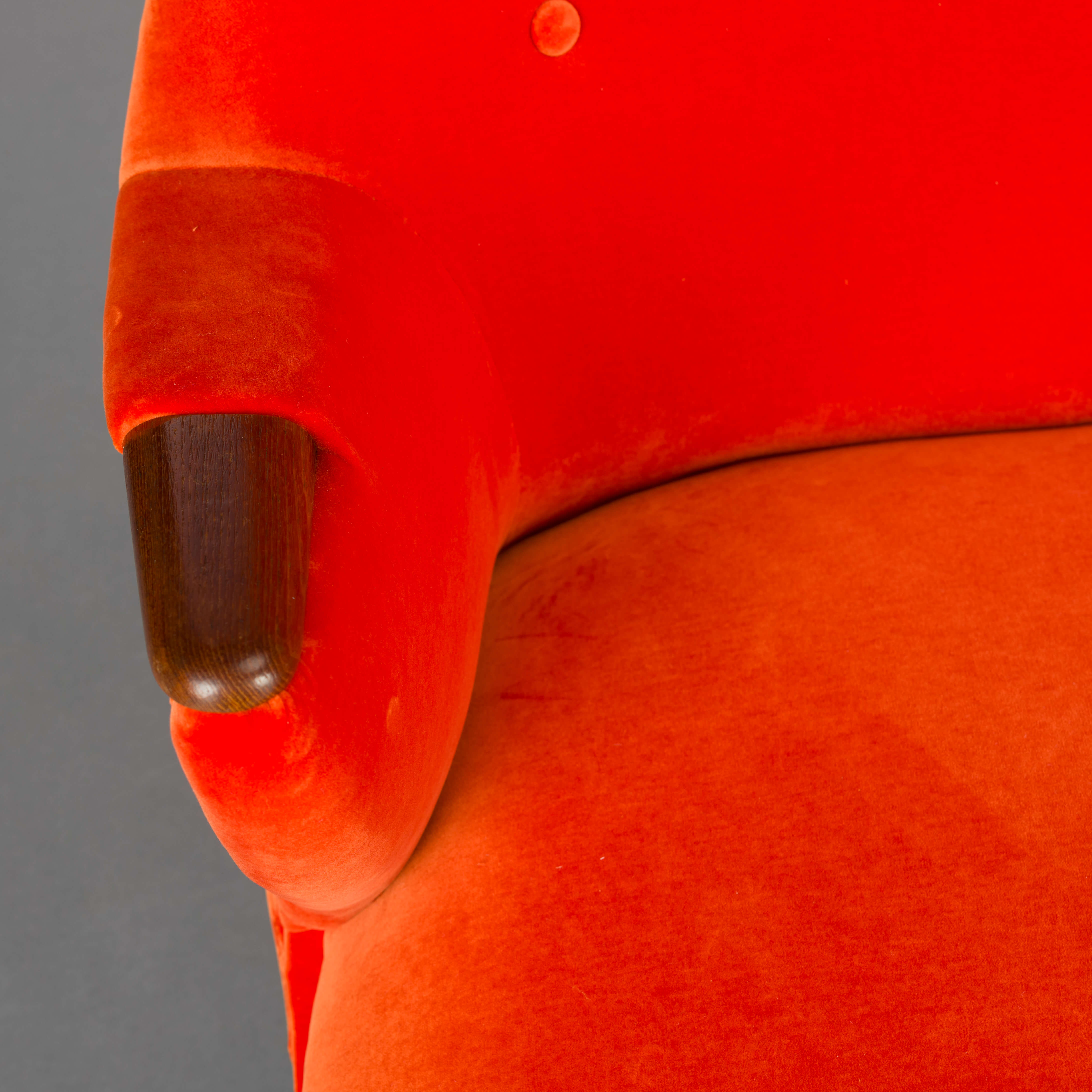 Very elegantly lined curved vintage design sofa that has taken in some of the design signatures of Finn Juhl and Kurt Olsen. Although no make marks were found we believe this piece was made mid 60s in the CFC Silkeborg furniture factory. The sofa has been reupholstered with Kvadrat Harald 3 a fresh soft velvet fabric. It has a very intense orange colour that colour shifts depending on the perspective. Fabric designer Raf Simons adds that this is a fabric particularly suited for interior living spaces.