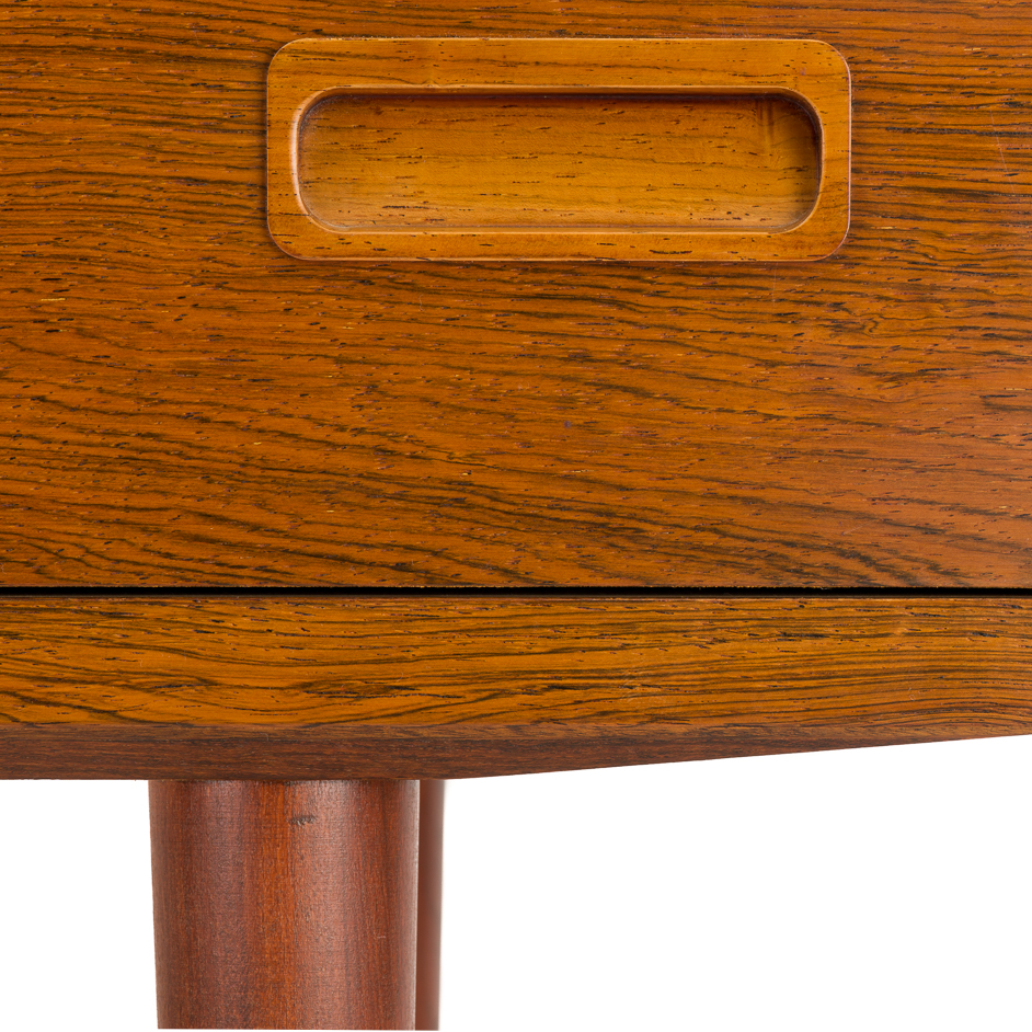 This chest of drawers has Poul Hundevad’s name all over it. It is functional, made with great attention for detail and out of carefully selected materials. It is the perfect match between form and function. Hundevad was obviously inspired for this chest by some slabs of ‘Dalbergia Sissoo’ better known as rosewood from India. A wood type with particular high hardness and some deep black growth lines in the wood.