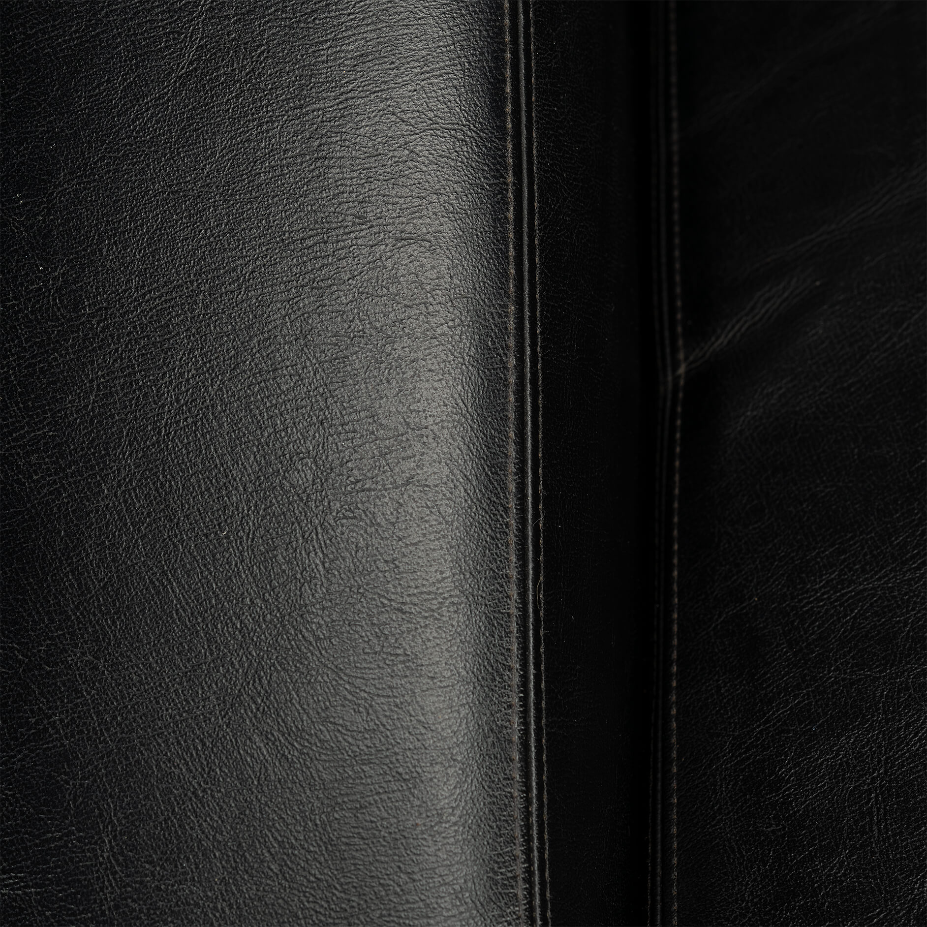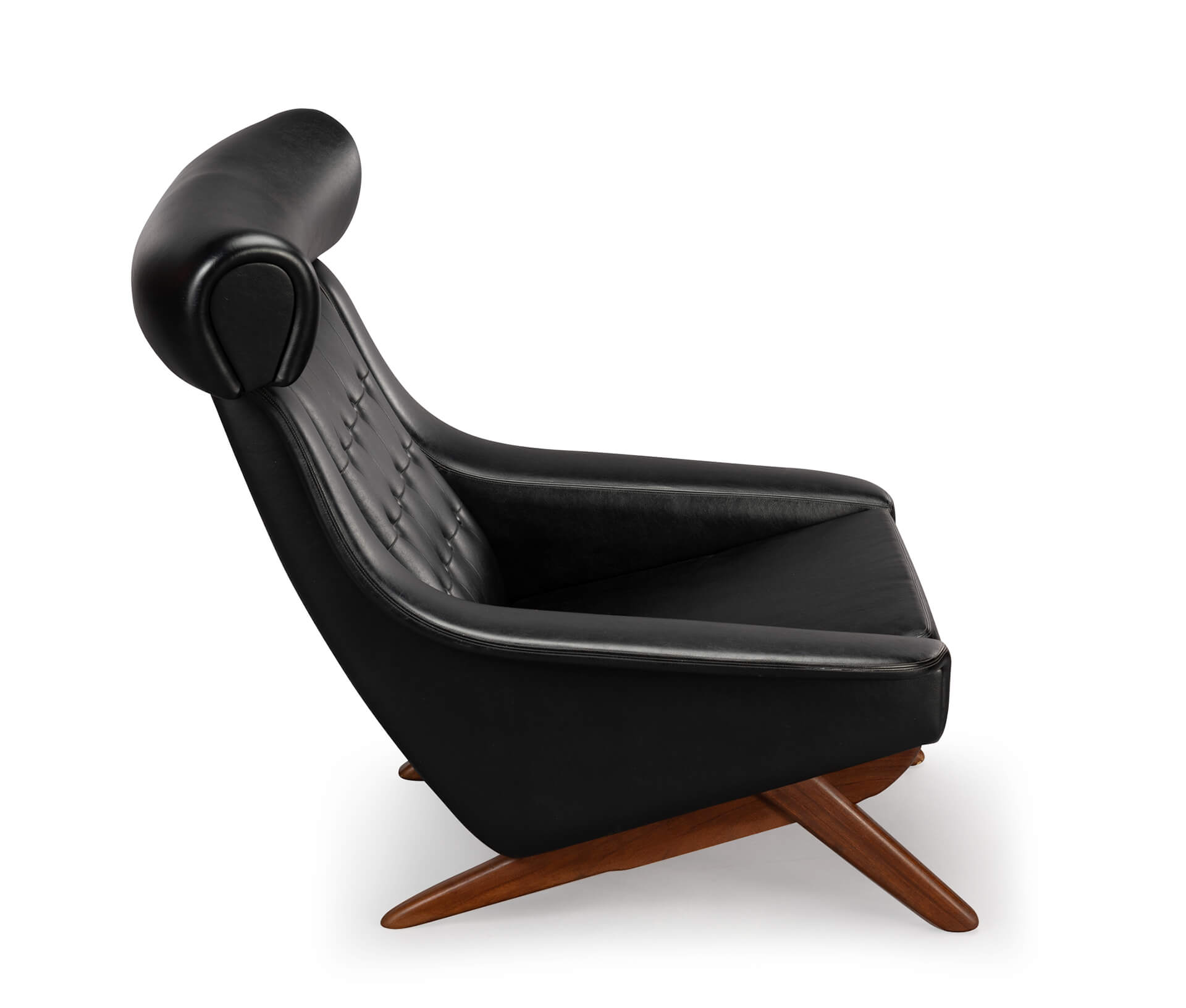This black leatherette easy chair dates most probably from the mid 60’s. It is the first of this kind that we’ve encountered on our trips and although without any clue for who designed it we couldn’t do anything else than take it with us. The chair is ideal to read a book or sleep because of the comfy en funky headrest. The teak wood is in very good condition, the upholstery in leatherette is in very good vintage condition.