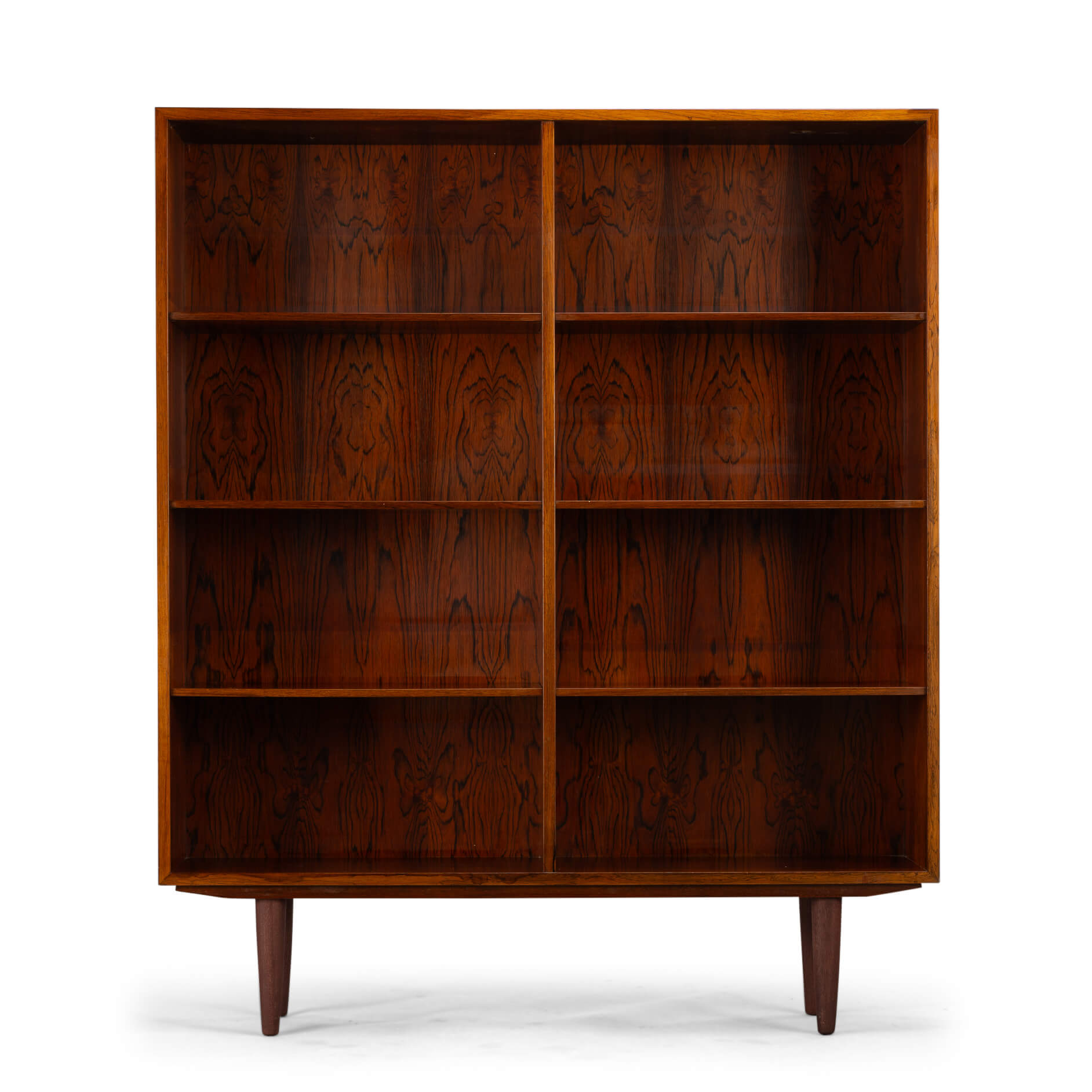 Crafted from rich rosewood, each unit showcases the distinct grain patterns and warm hues that make rosewood a coveted material among designers and collectors. The natural variations in the wood ensure that every bookcase is a unique masterpiece, exuding warmth and sophistication.