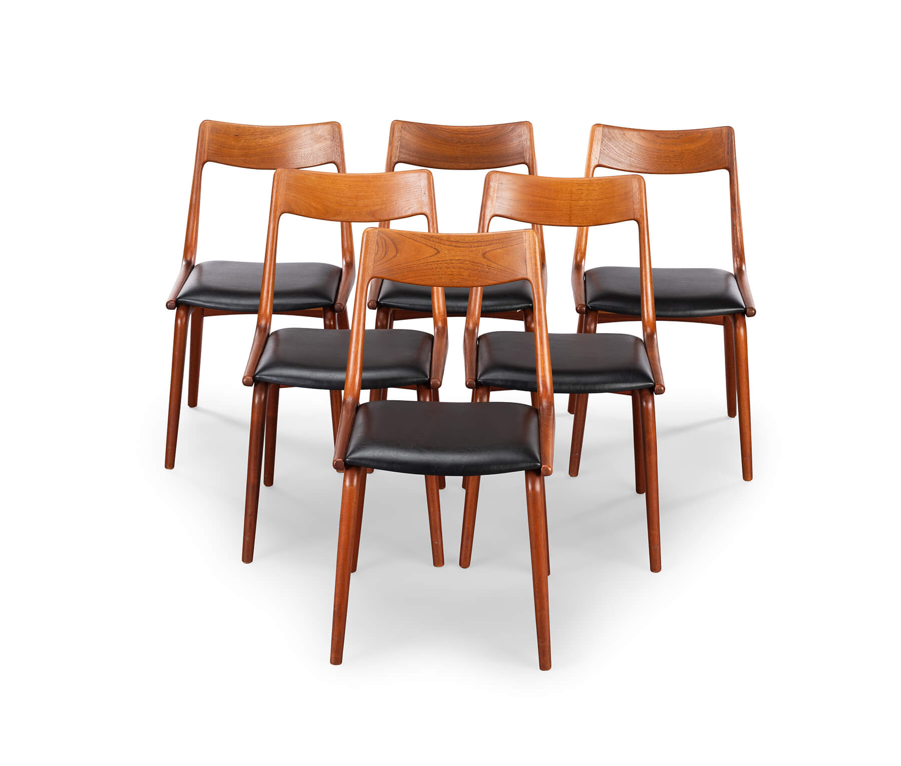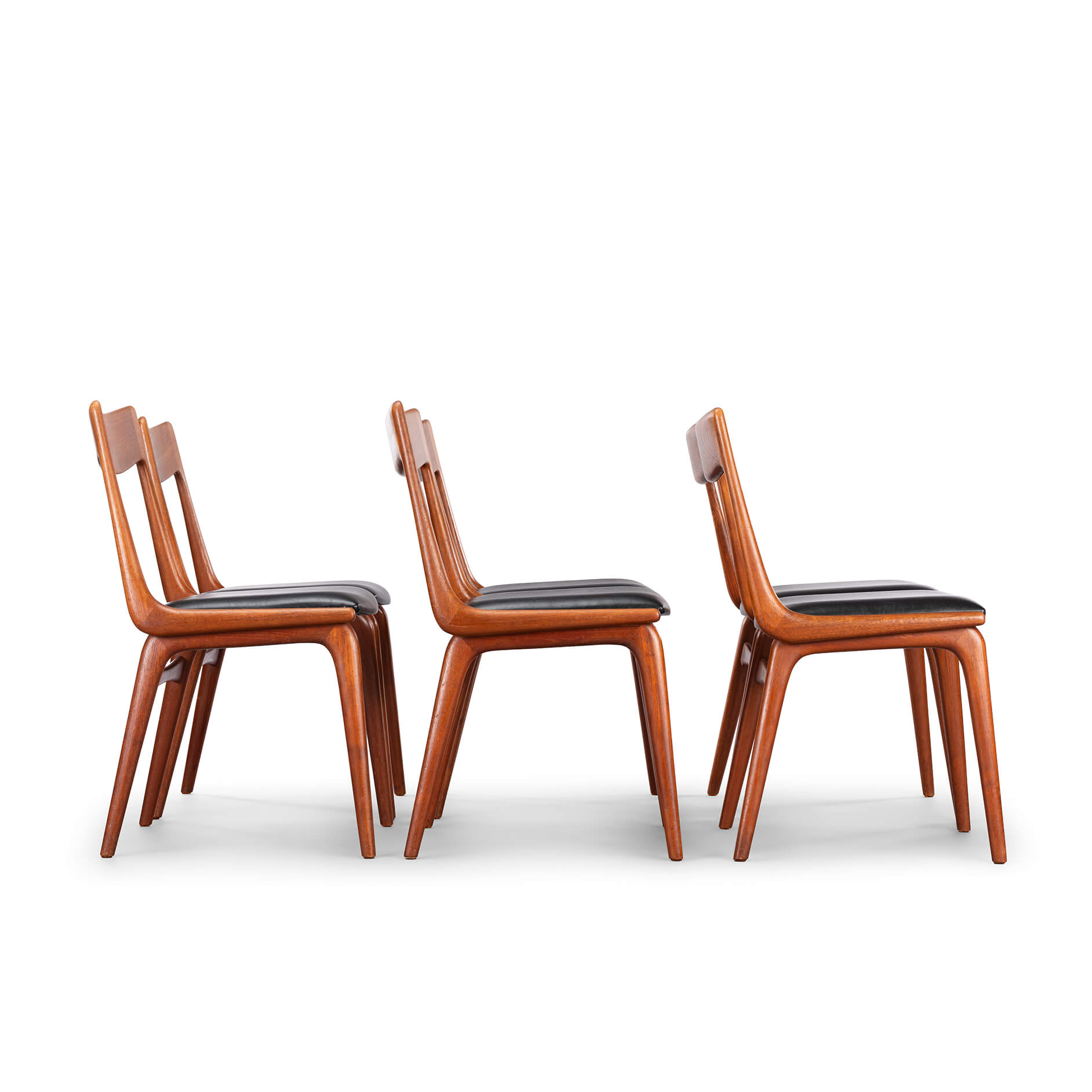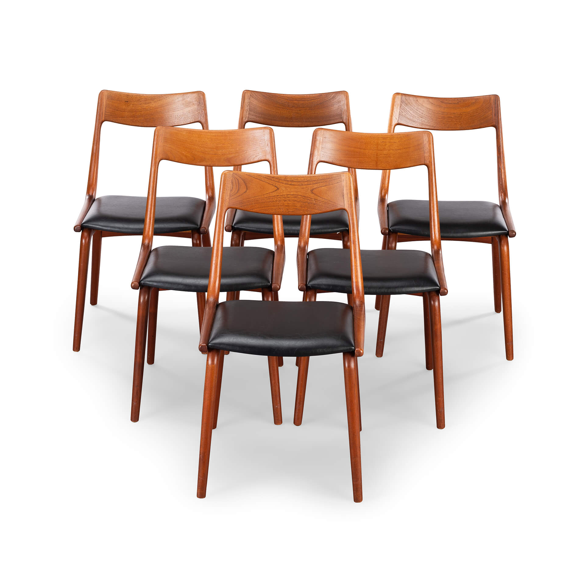 These Danish modern dining chairs from the mid-1960s were designed by Erik Christensen for Slagelse Møbelvaerk and are made from solid teak. The name and appeal of the chairs, numbered #370 is taken from the boomerang shape of the seat and back. The leatherette upholstery is completely renewed and in excellent condition. This is a set of six boomerang dining chairs # 370, great to combine with a modern design table and sold only as a set.