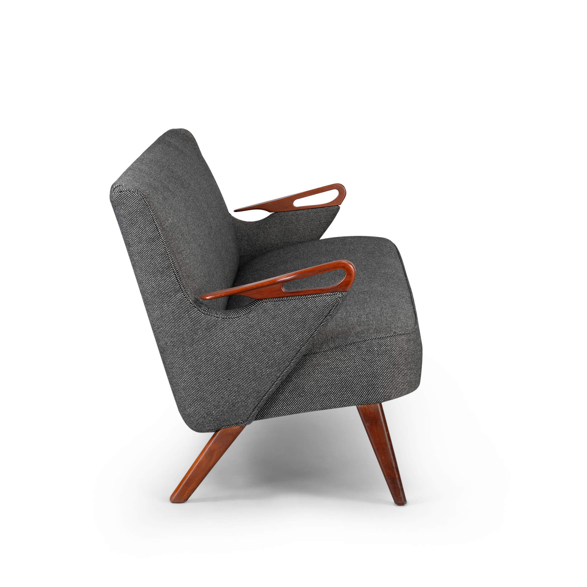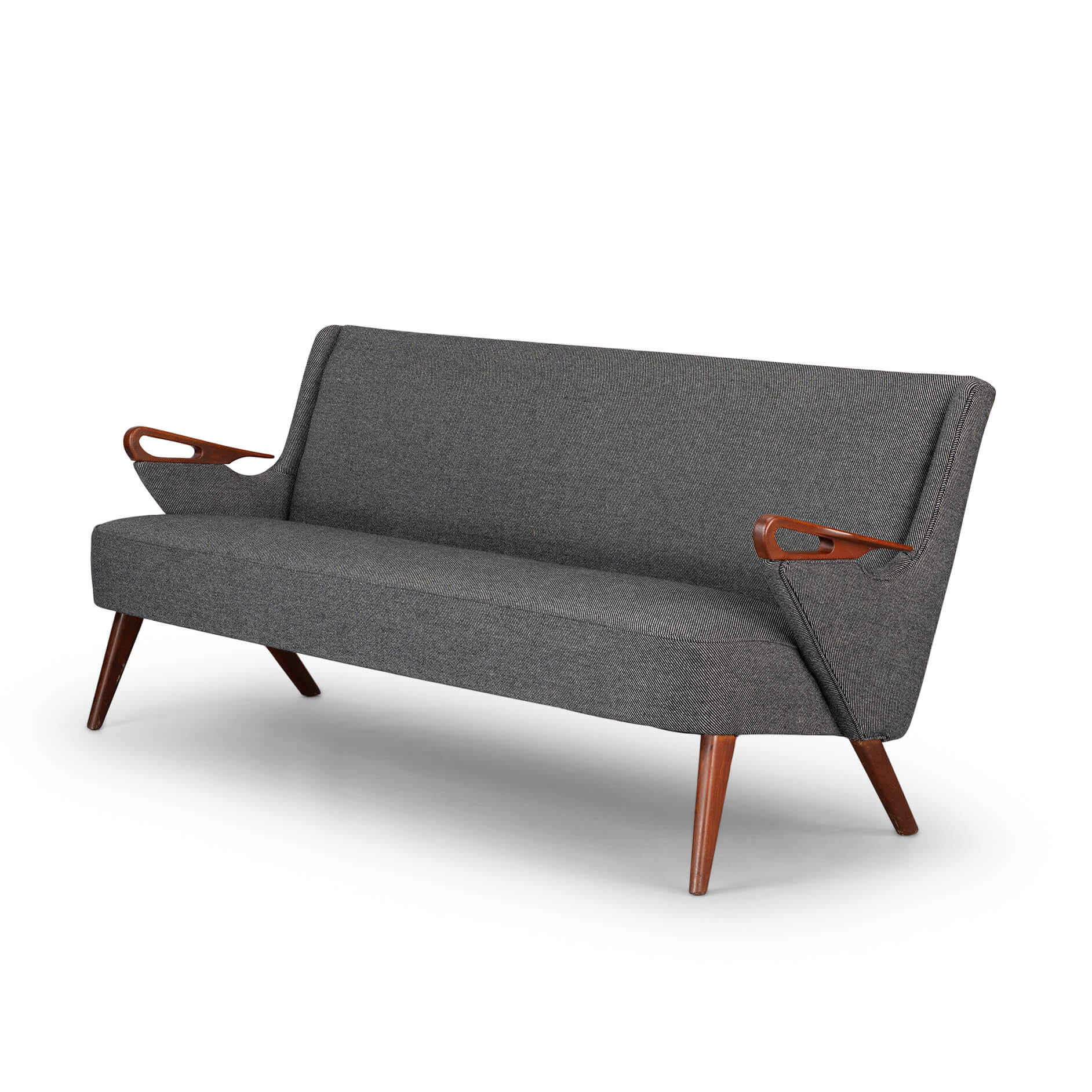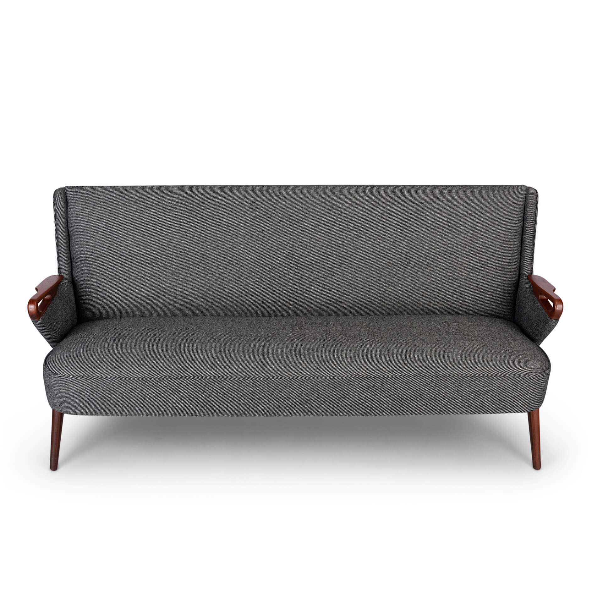 Mid century designer 2.5 seater sofa by Chresten Findahl Brodersen. This sofa was made under design Number CFB52 in the Skaerbaek South Jutland Findahl Møbelfabrik in the mid 50s. This is as pure as midcentury quality in sofa form gets, beautiful lines and well crafted teak armrests. Reupholstered in a de Ploeg Berger 11/83 fabric by a professional upholsterer to make sure the design was kept as Chresten intended it. Because of this the vintage condition is excellent.