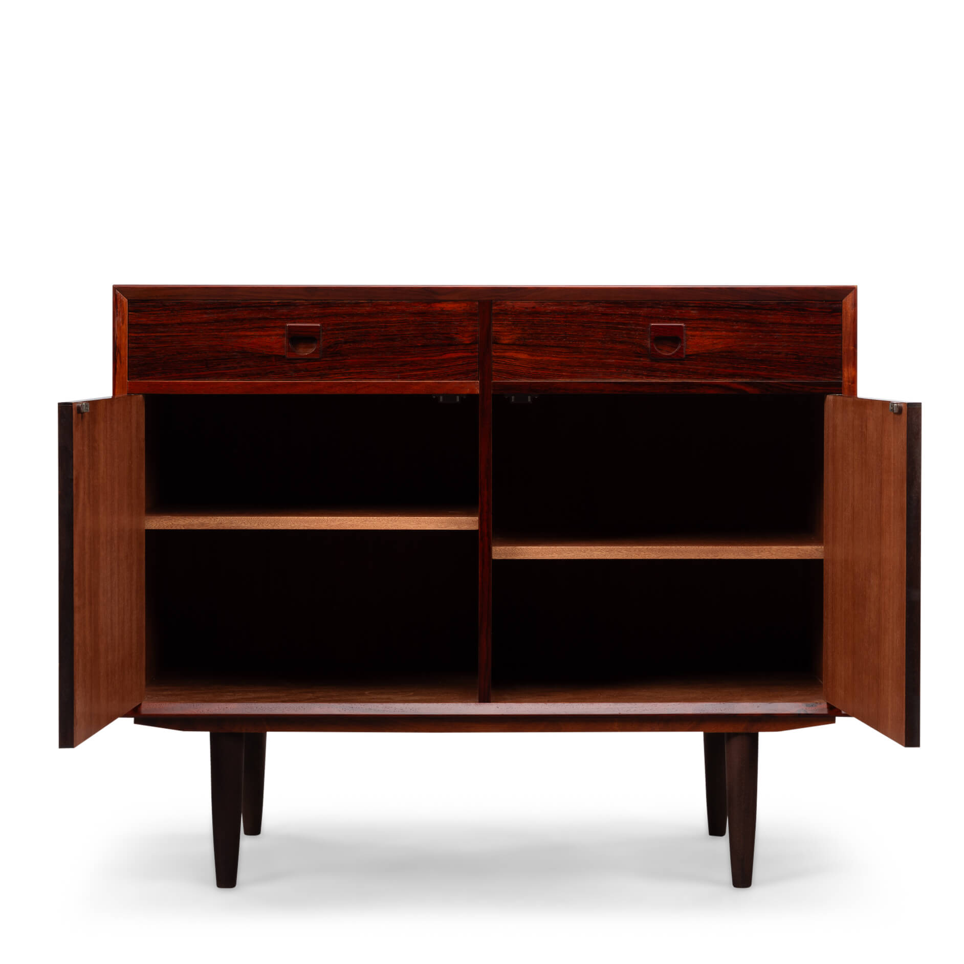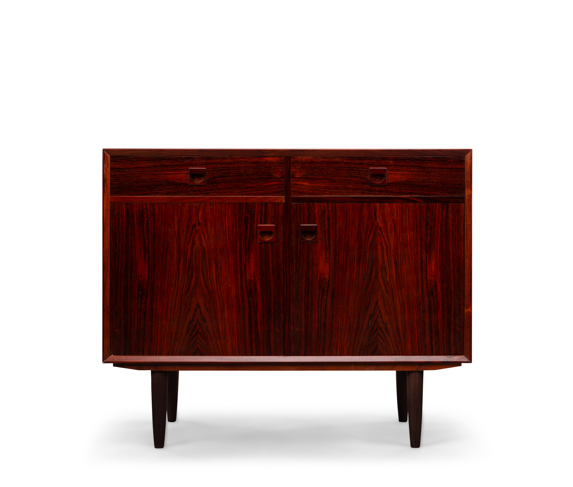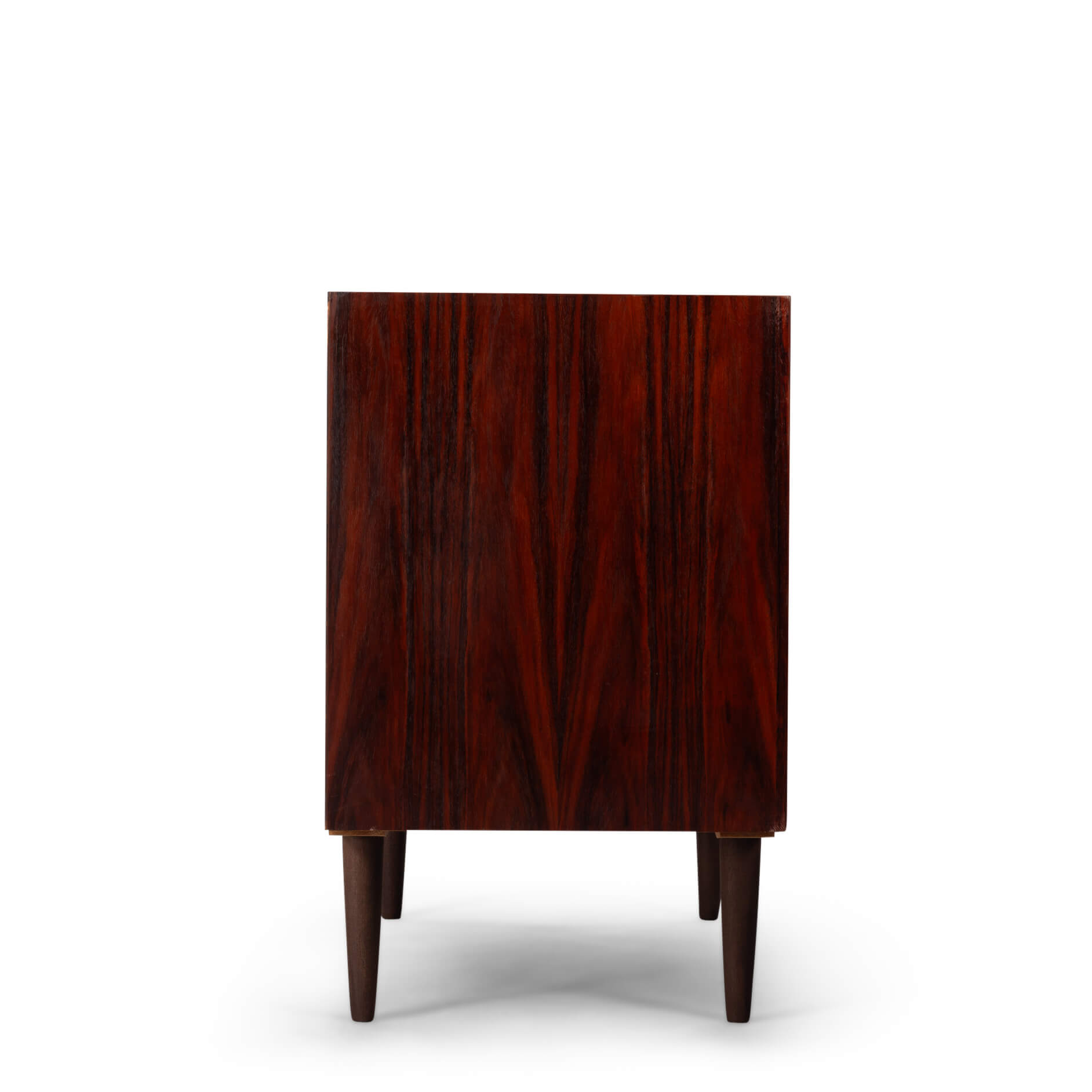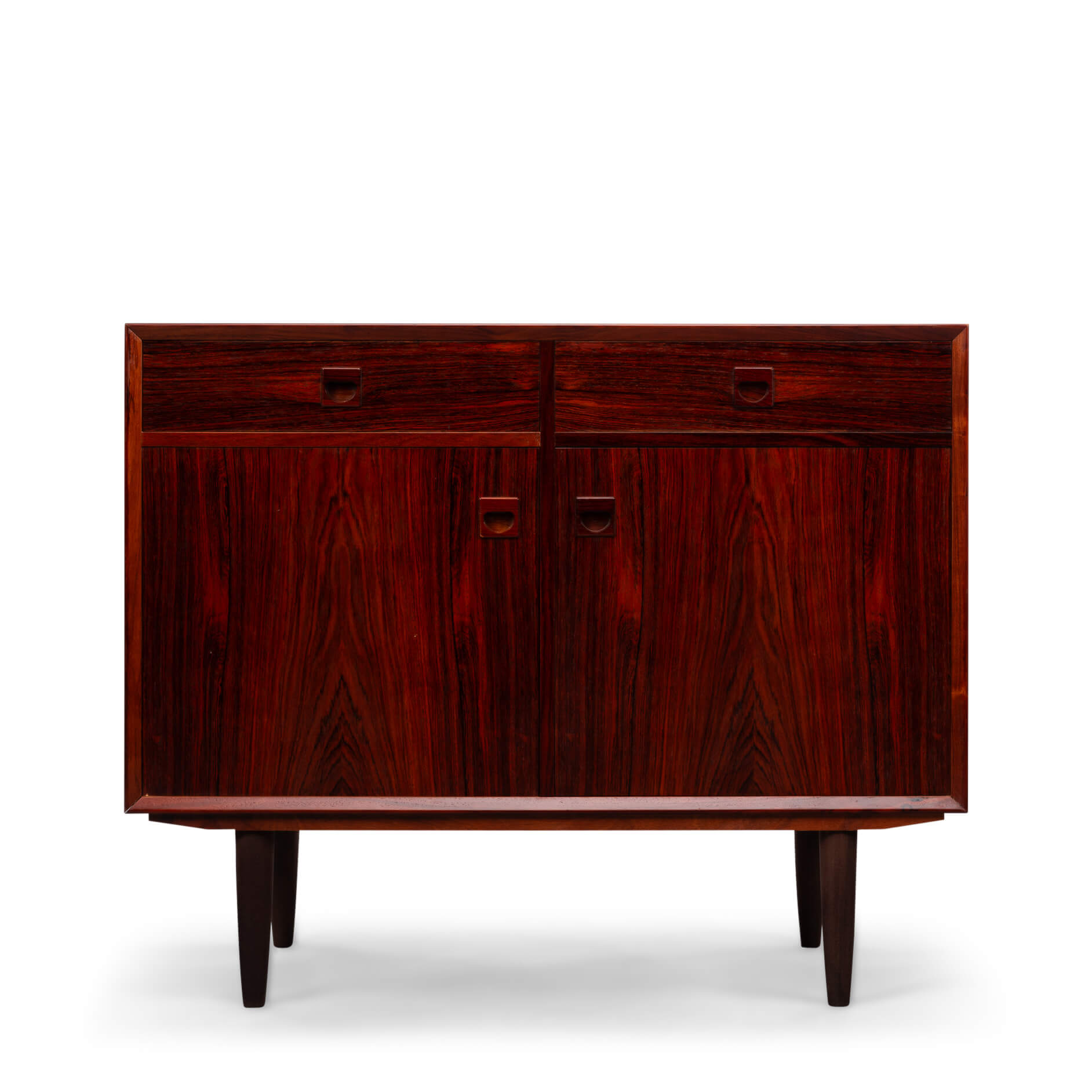 Rosewood anybody?! This medium sized sideboard is all about the print and colour of the rosewood veneer. Very much an eye catcher in any modern and light interior. It has the design signature of Brouer all over it with it's top expressive drawing in the veneer and a superb fit of drawers and doors.