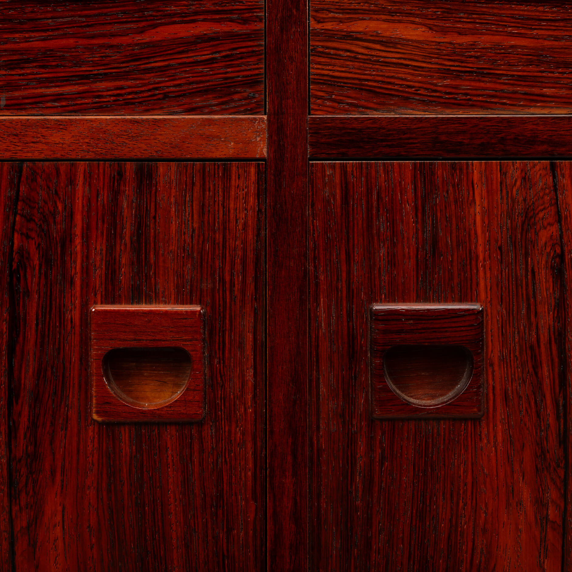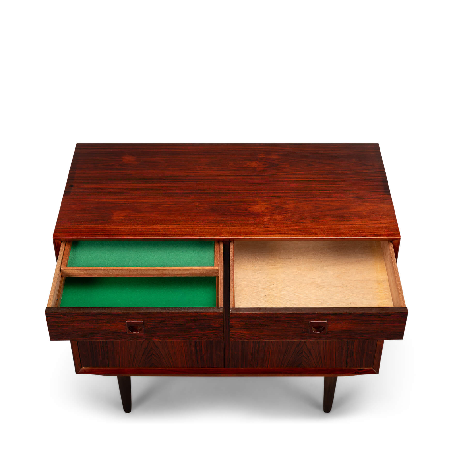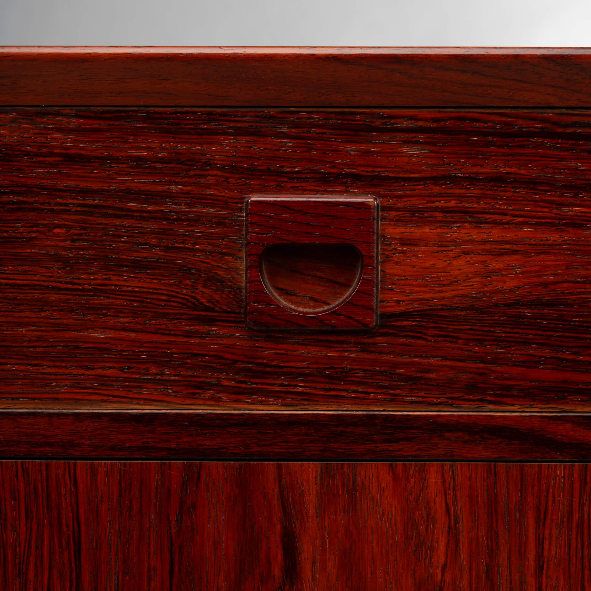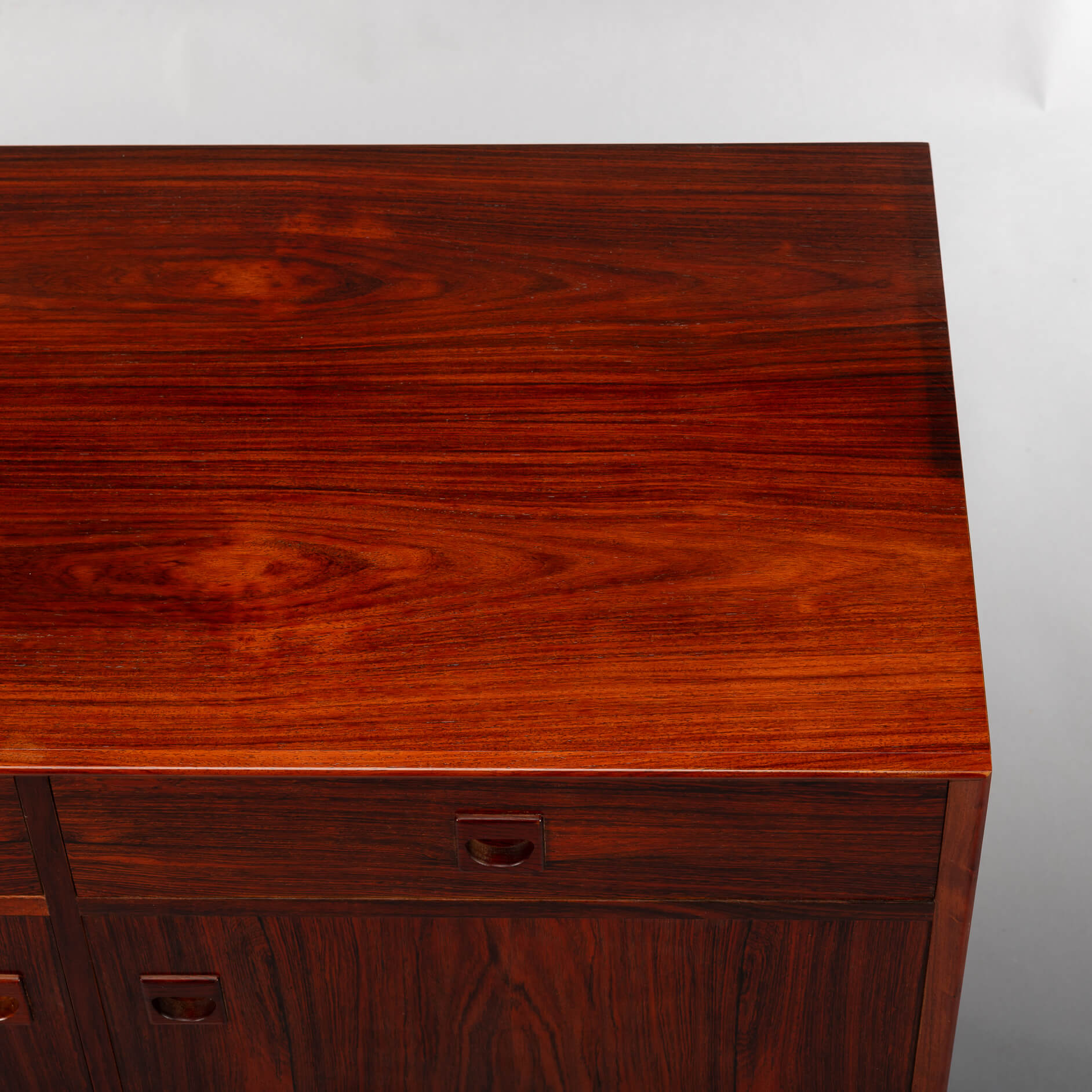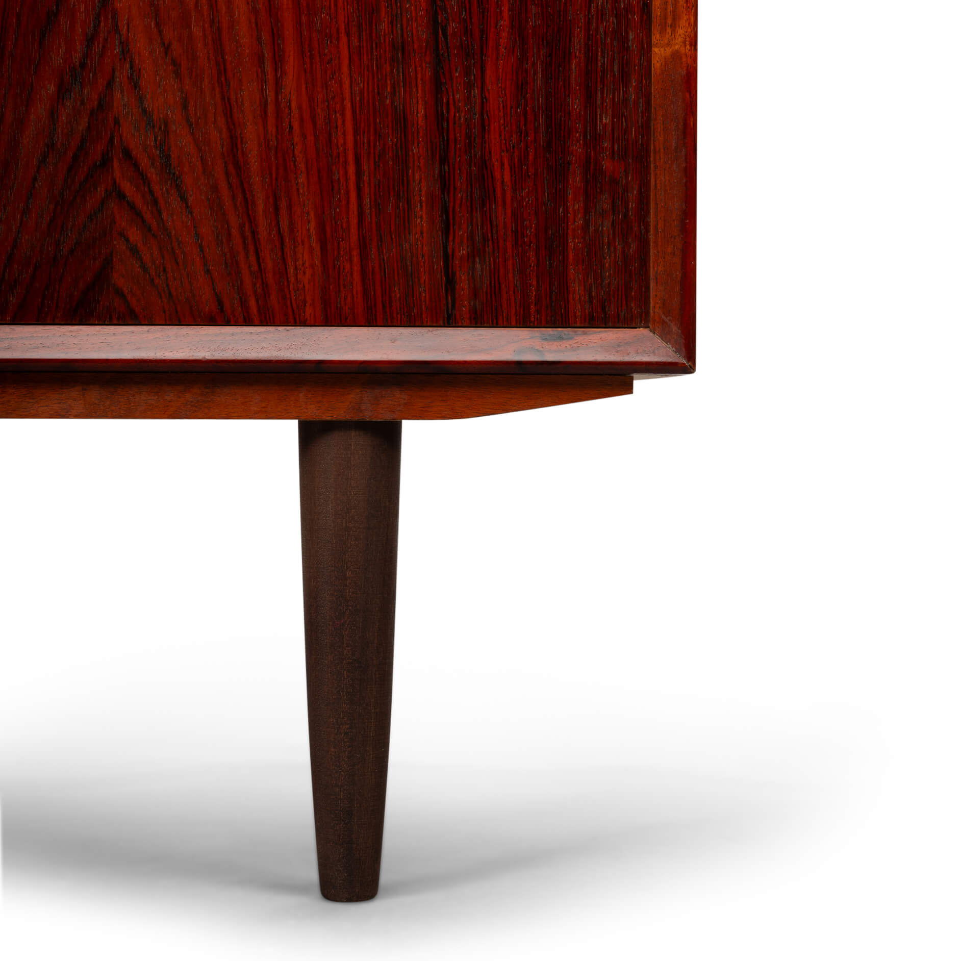 Rosewood anybody?! This medium sized sideboard is all about the print and colour of the rosewood veneer. Very much an eye catcher in any modern and light interior. It has the design signature of Brouer all over it with it's top expressive drawing in the veneer and a superb fit of drawers and doors.