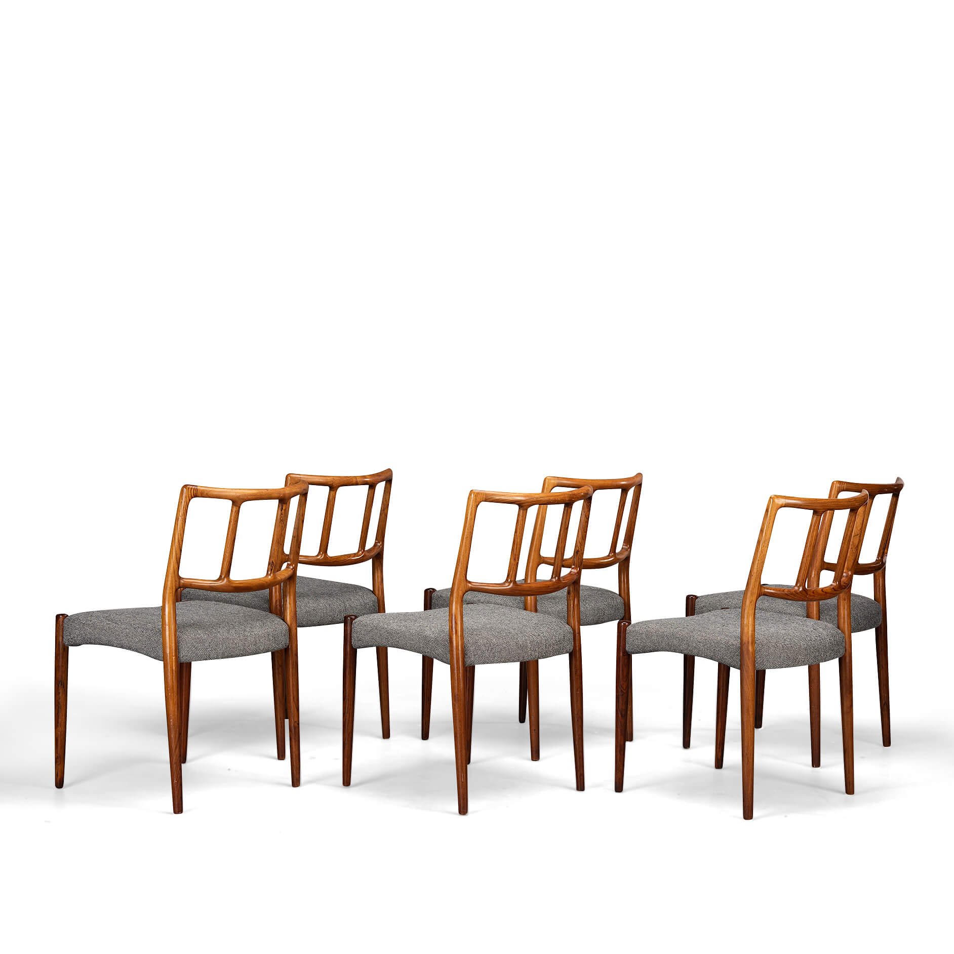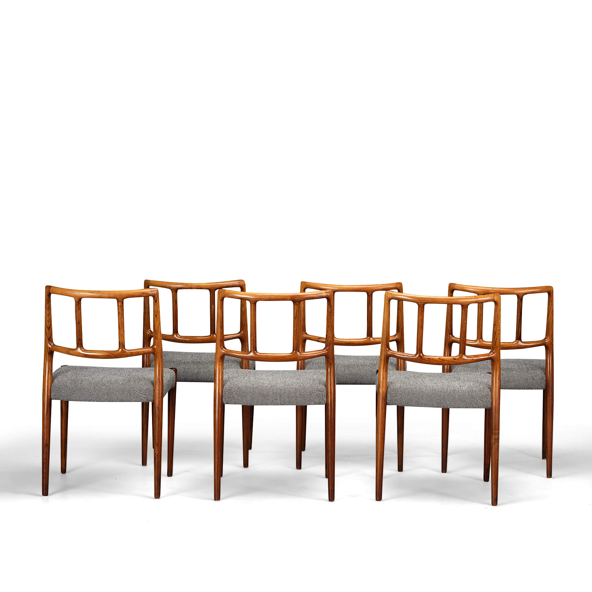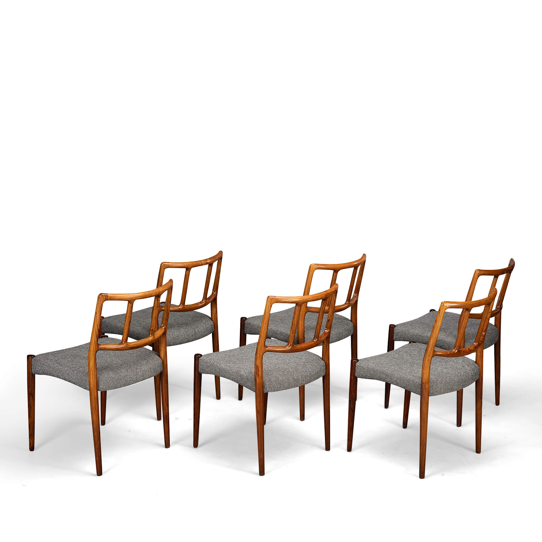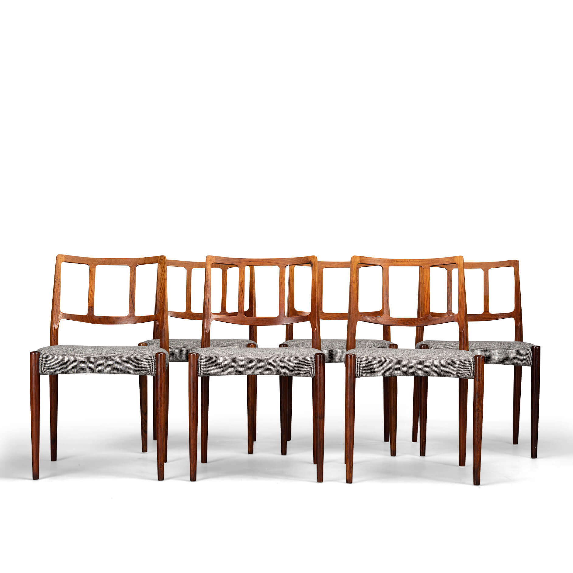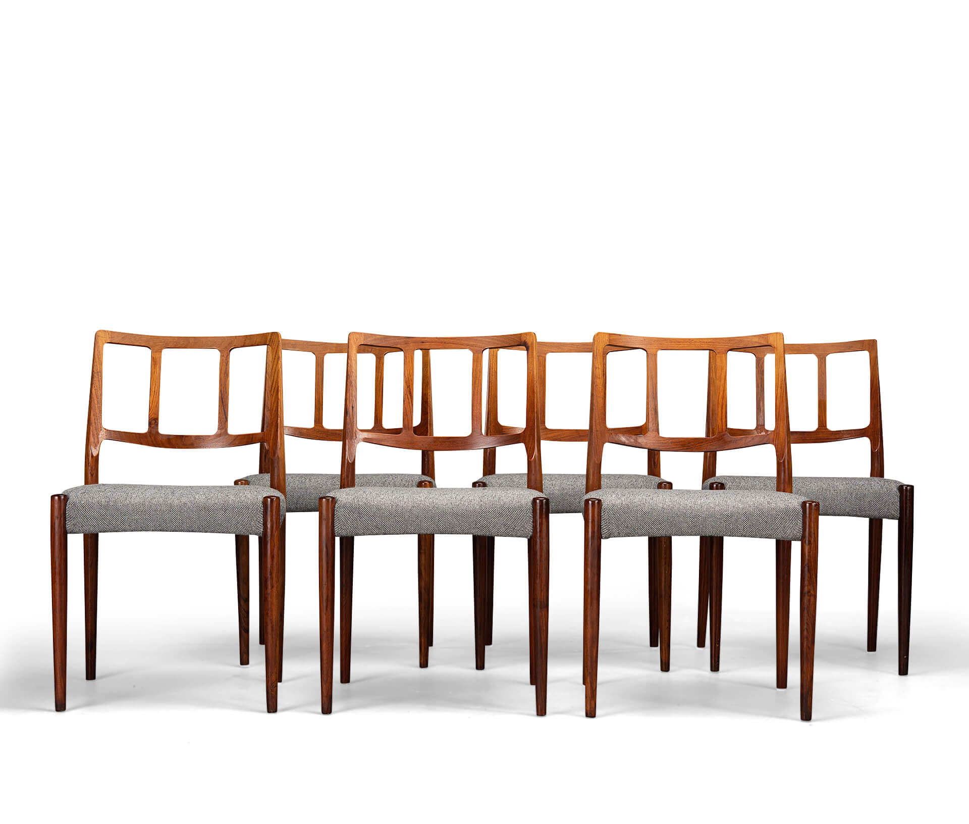 A set of six Johannes Andersen chairs made by Uldum Møbelfabrik in beautiful rosewood. The organically shaped backrest is so characteristic of Johannes Andersen. All chairs are marked with the Uldum stamp on the underside of the seat. We have had these beautiful chairs professionally reupholstered. The interior of these chairs has also been completely renewed, with jute webbing, 2 cm thick polyether and covered with 100 grams Dacron.