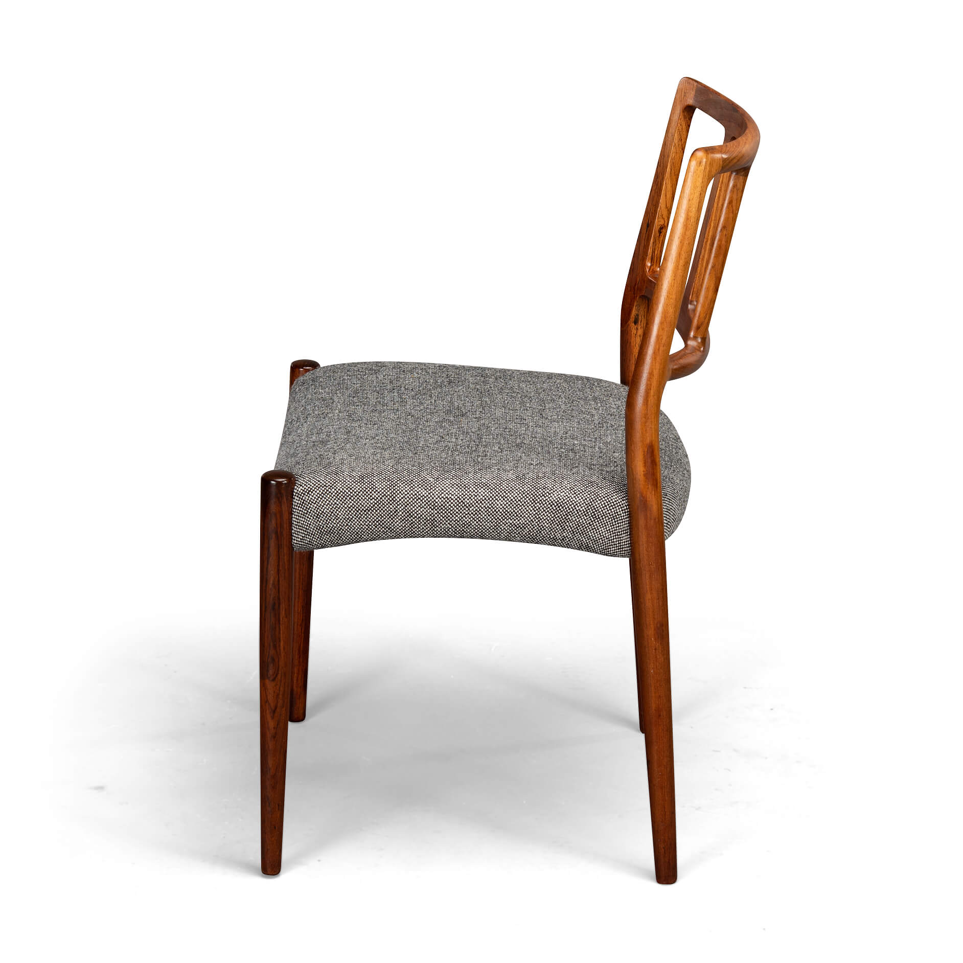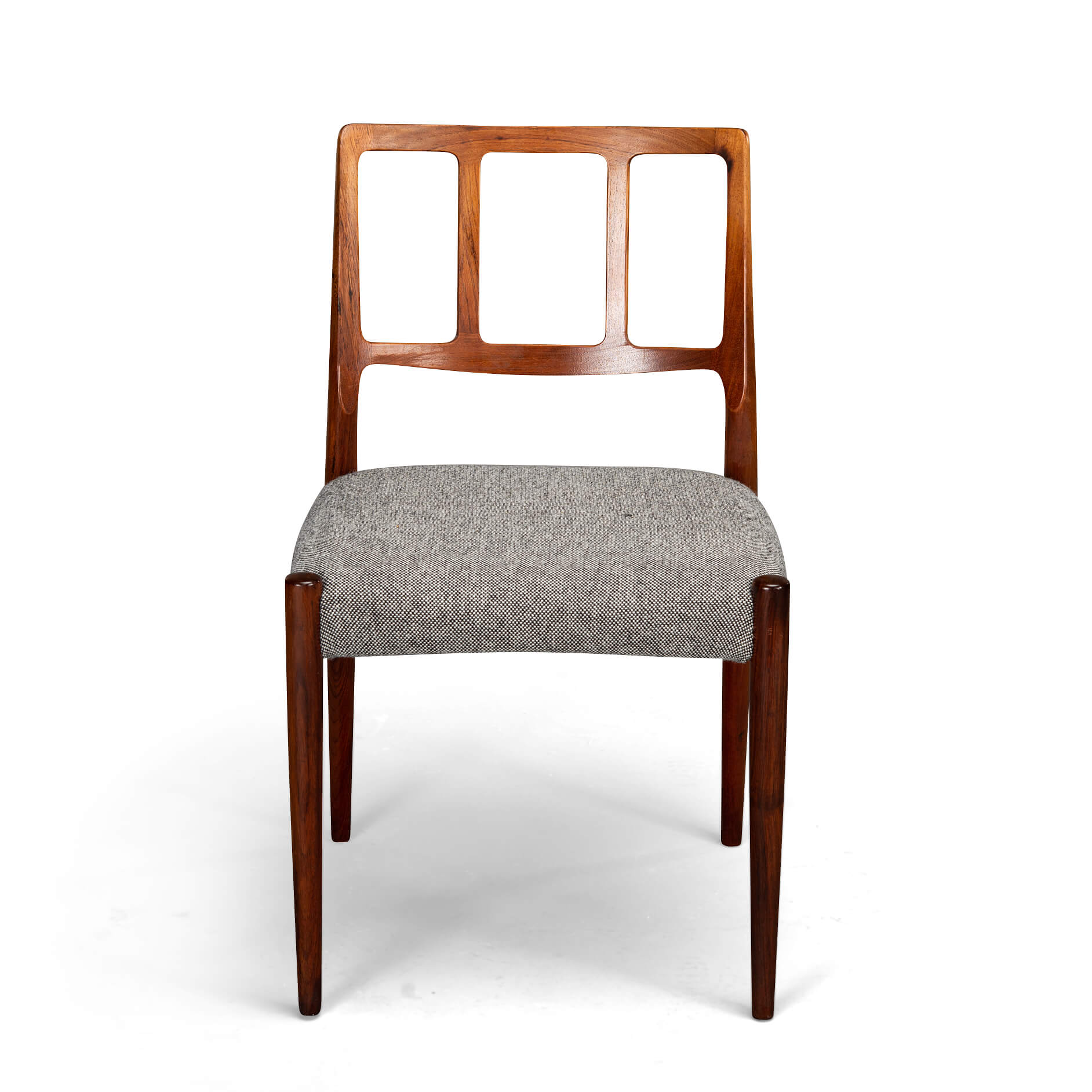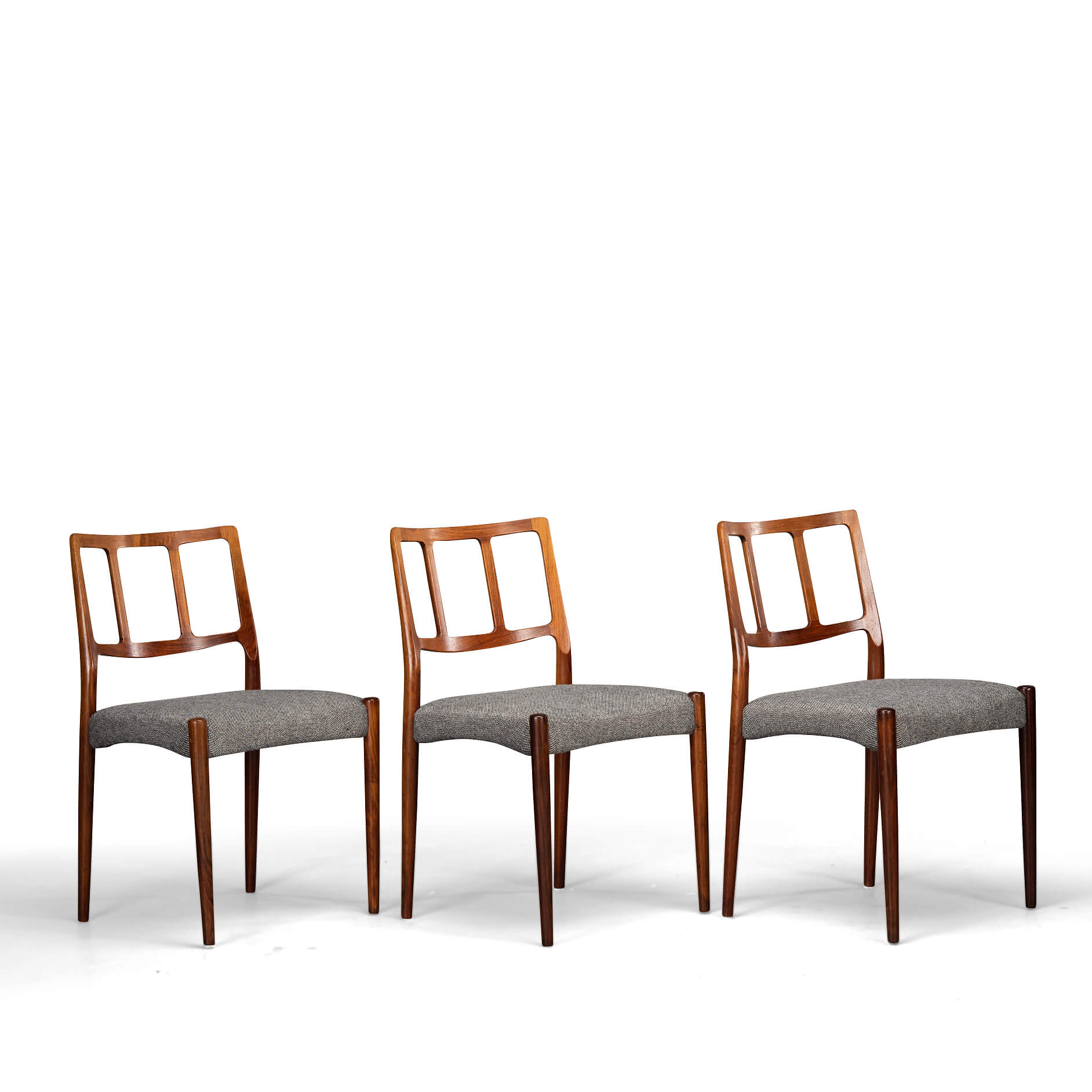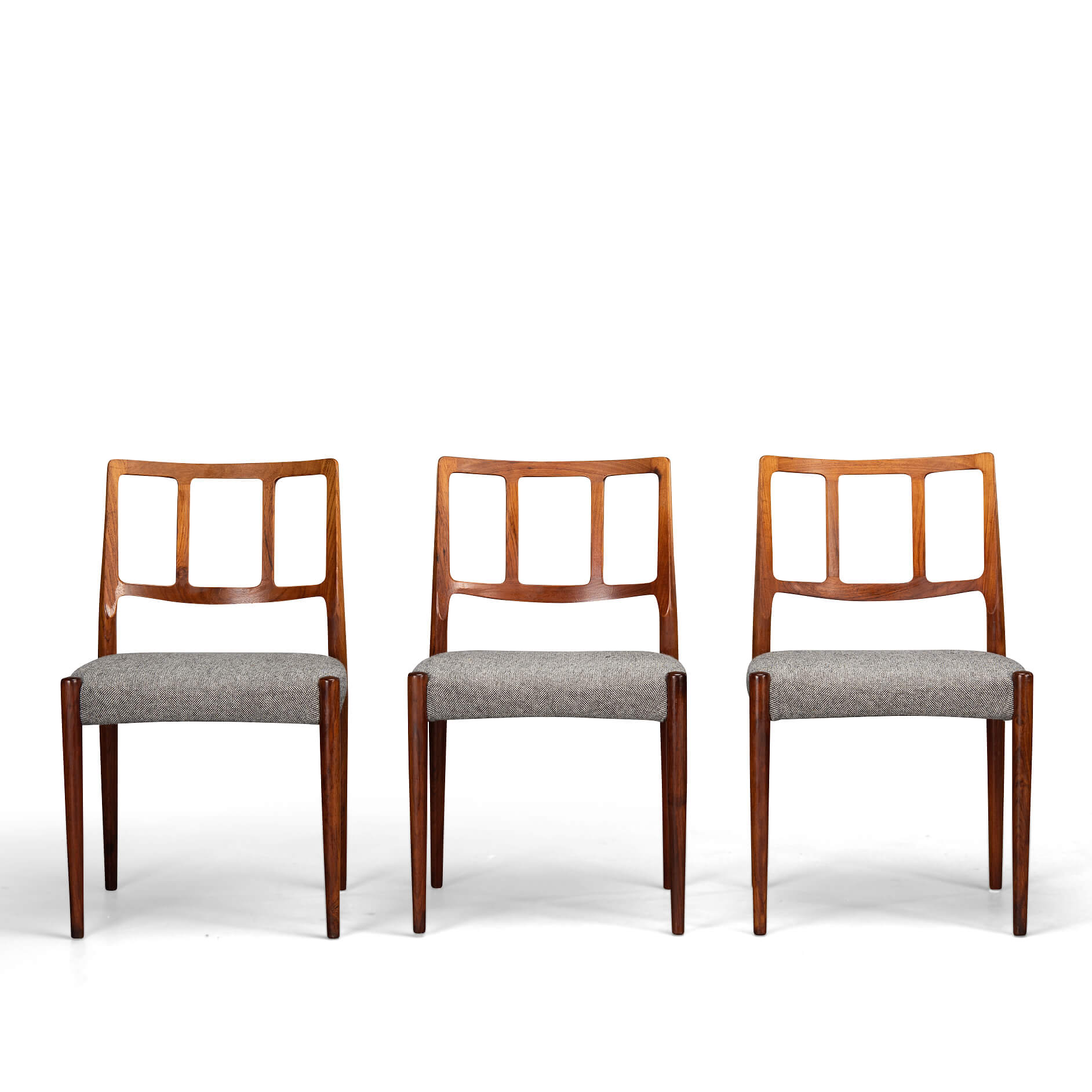 A set of six Johannes Andersen chairs made by Uldum Møbelfabrik in beautiful rosewood. The organically shaped backrest is so characteristic of Johannes Andersen. All chairs are marked with the Uldum stamp on the underside of the seat. We have had these beautiful chairs professionally reupholstered. The interior of these chairs has also been completely renewed, with jute webbing, 2 cm thick polyether and covered with 100 grams Dacron.