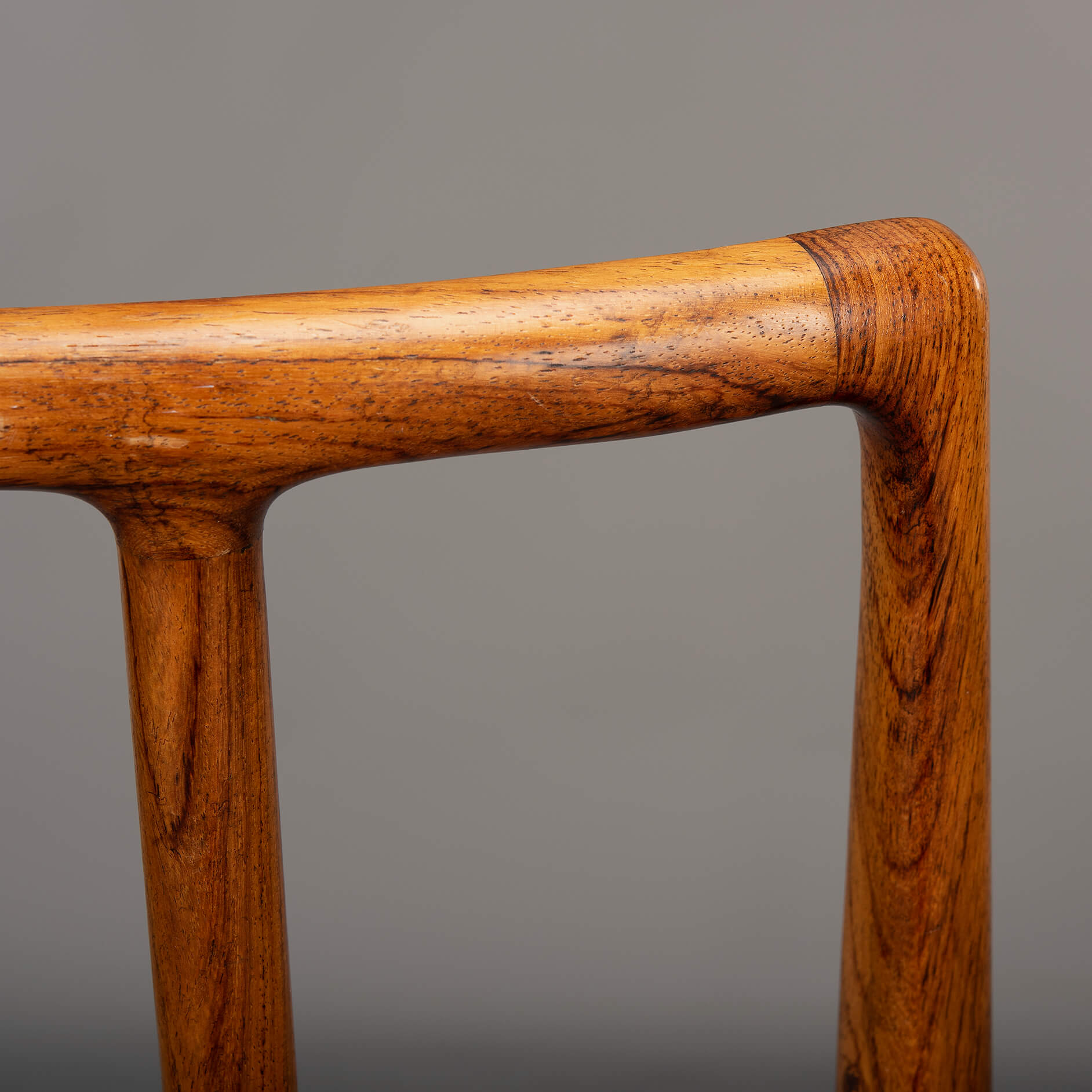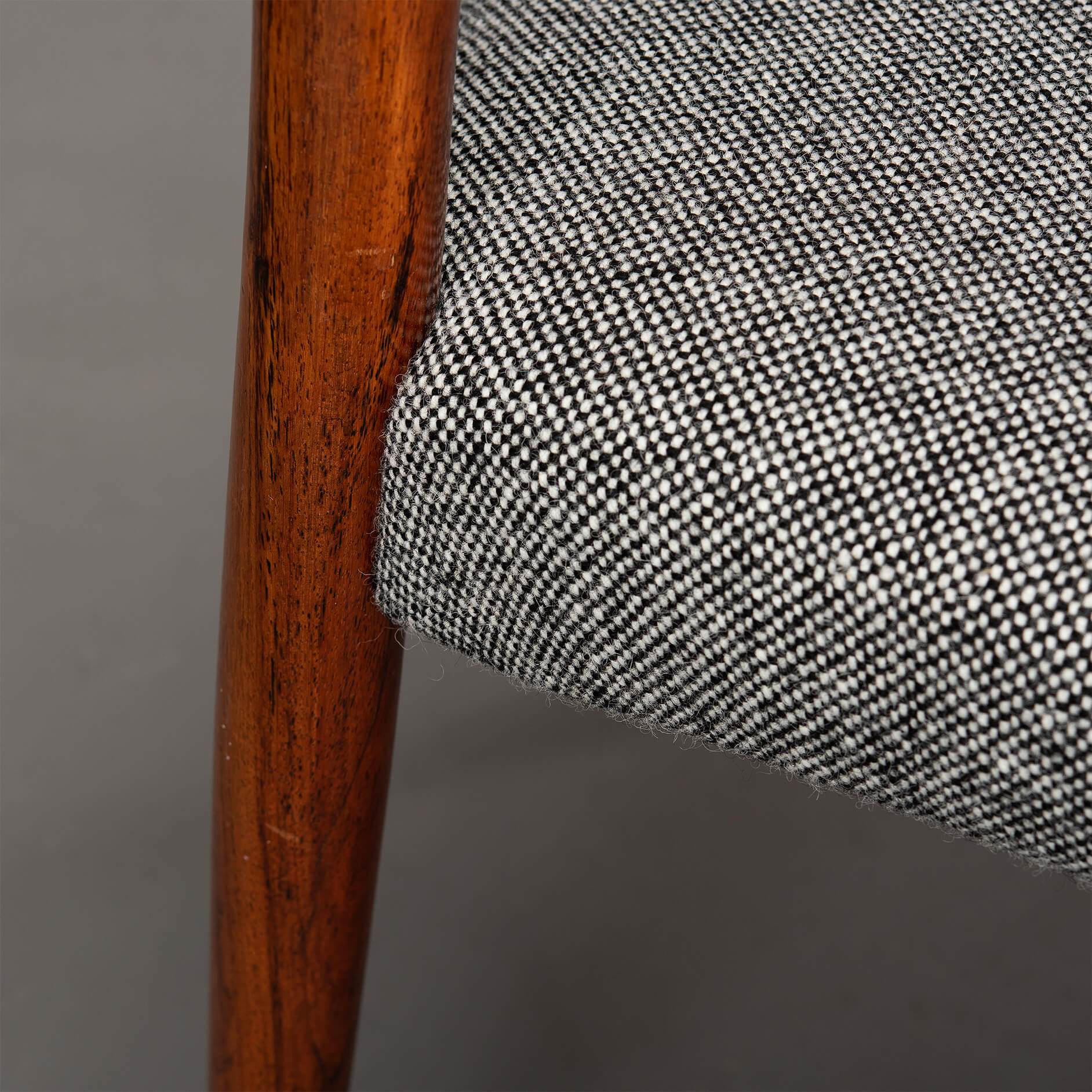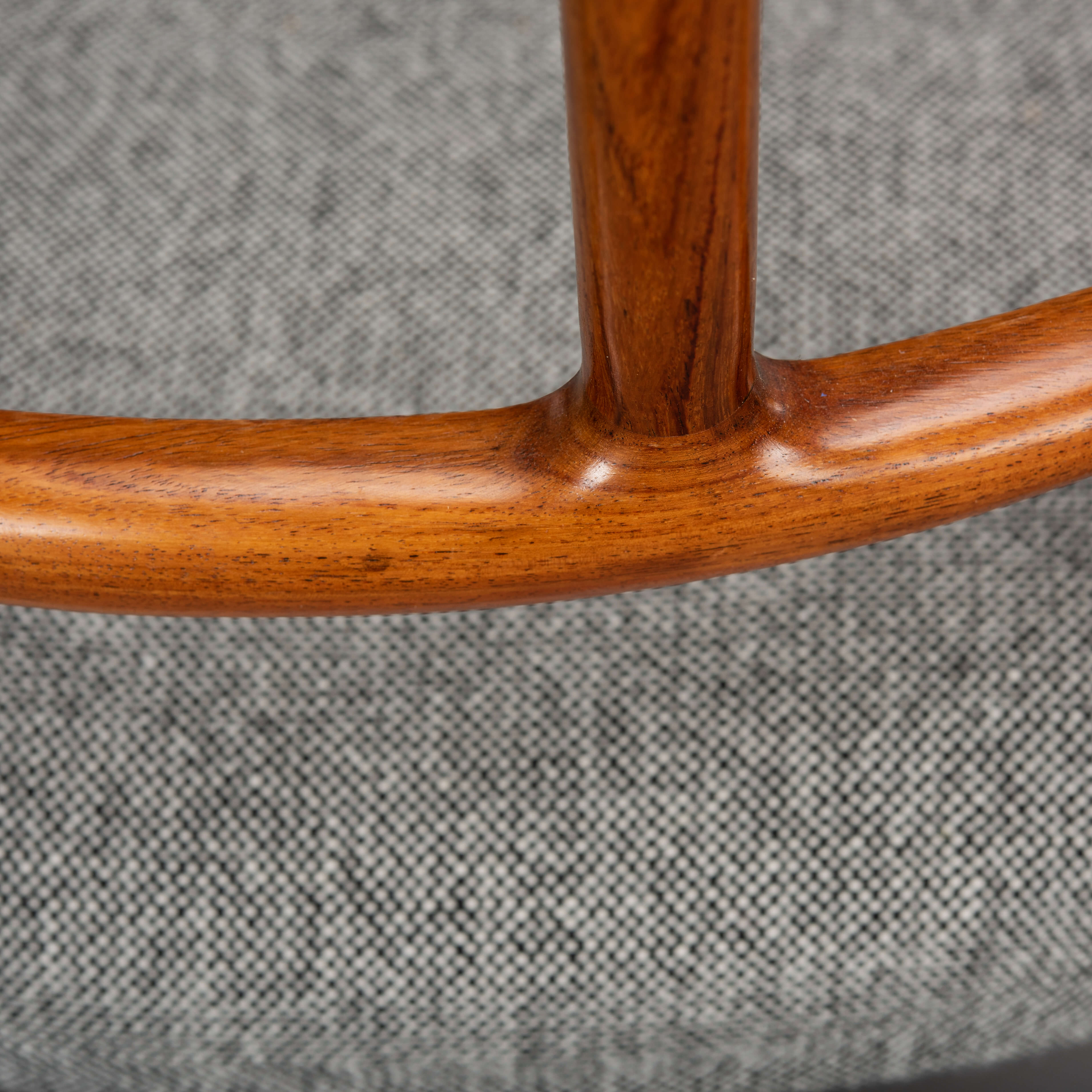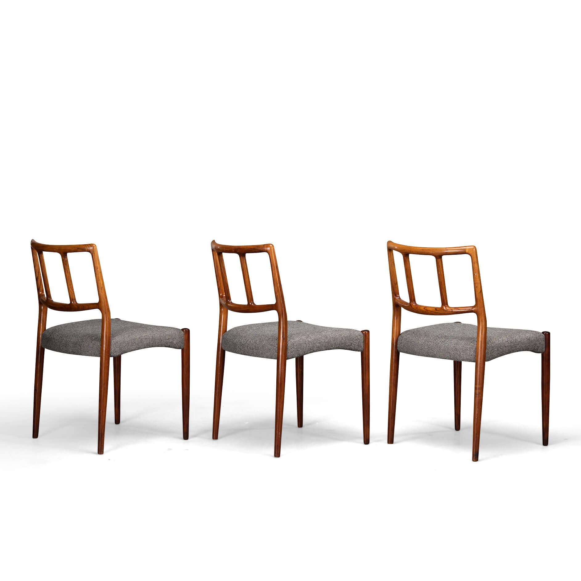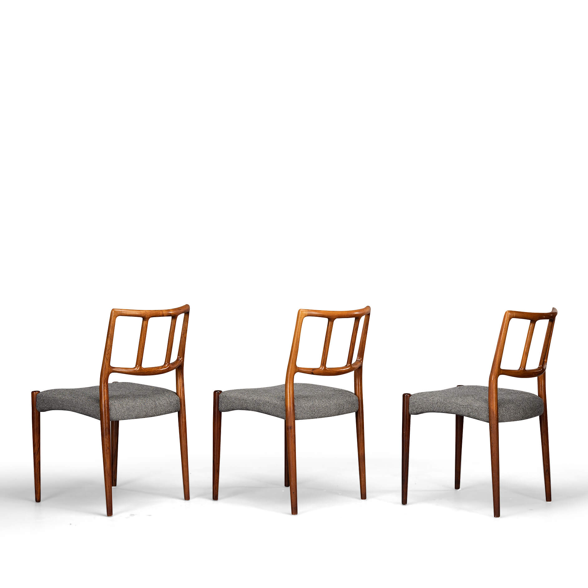 A set of six Johannes Andersen chairs made by Uldum Møbelfabrik in beautiful rosewood. The organically shaped backrest is so characteristic of Johannes Andersen. All chairs are marked with the Uldum stamp on the underside of the seat. We have had these beautiful chairs professionally reupholstered. The interior of these chairs has also been completely renewed, with jute webbing, 2 cm thick polyether and covered with 100 grams Dacron.