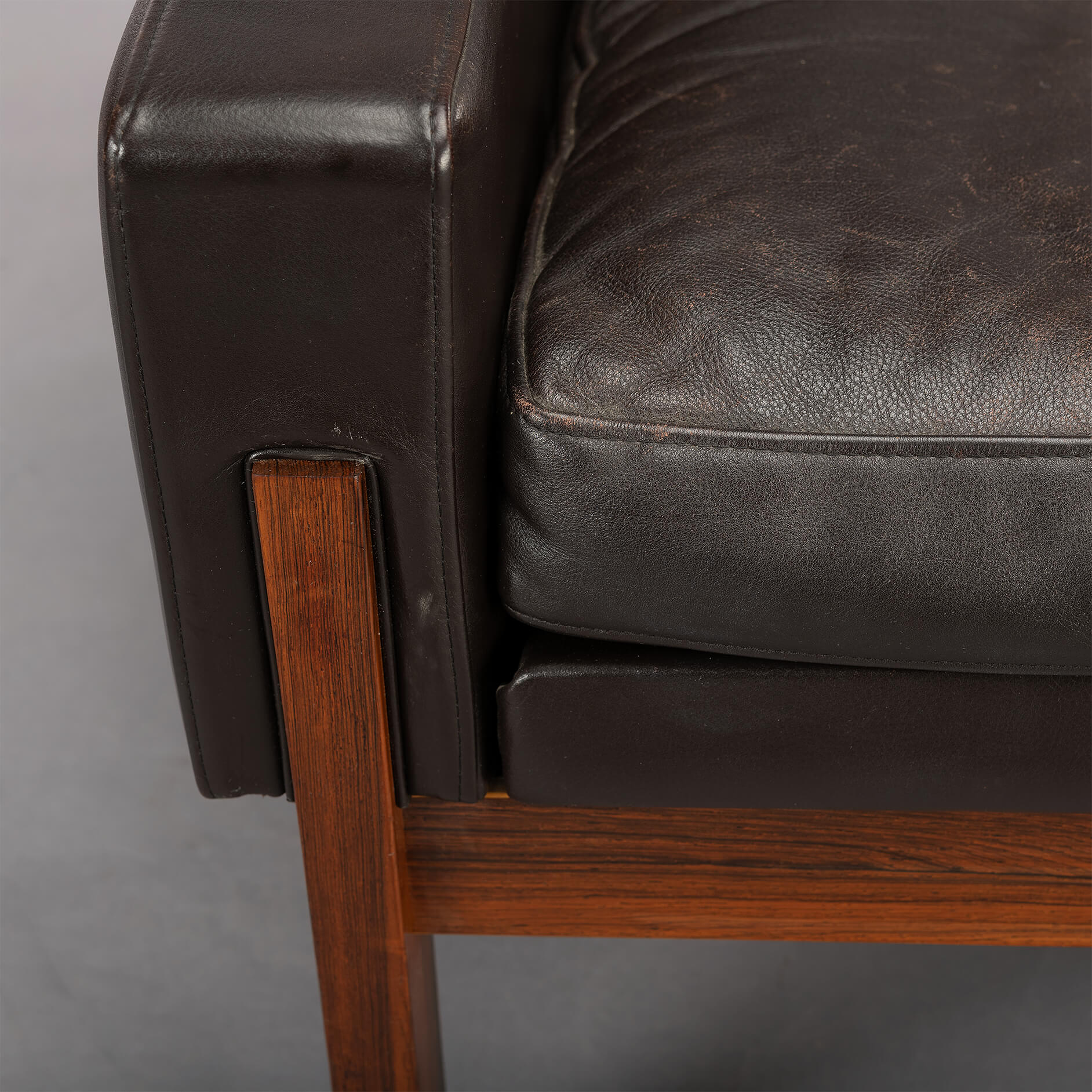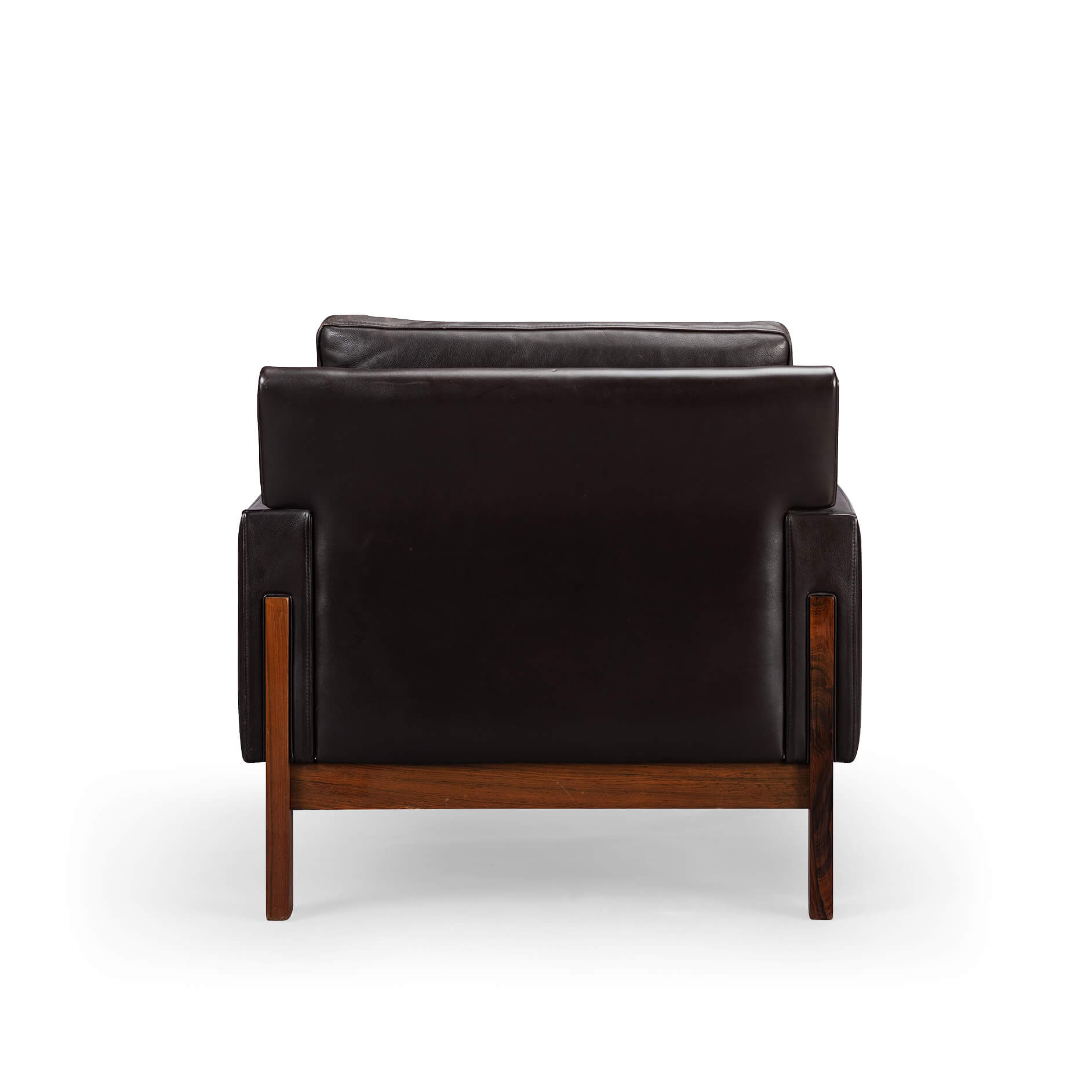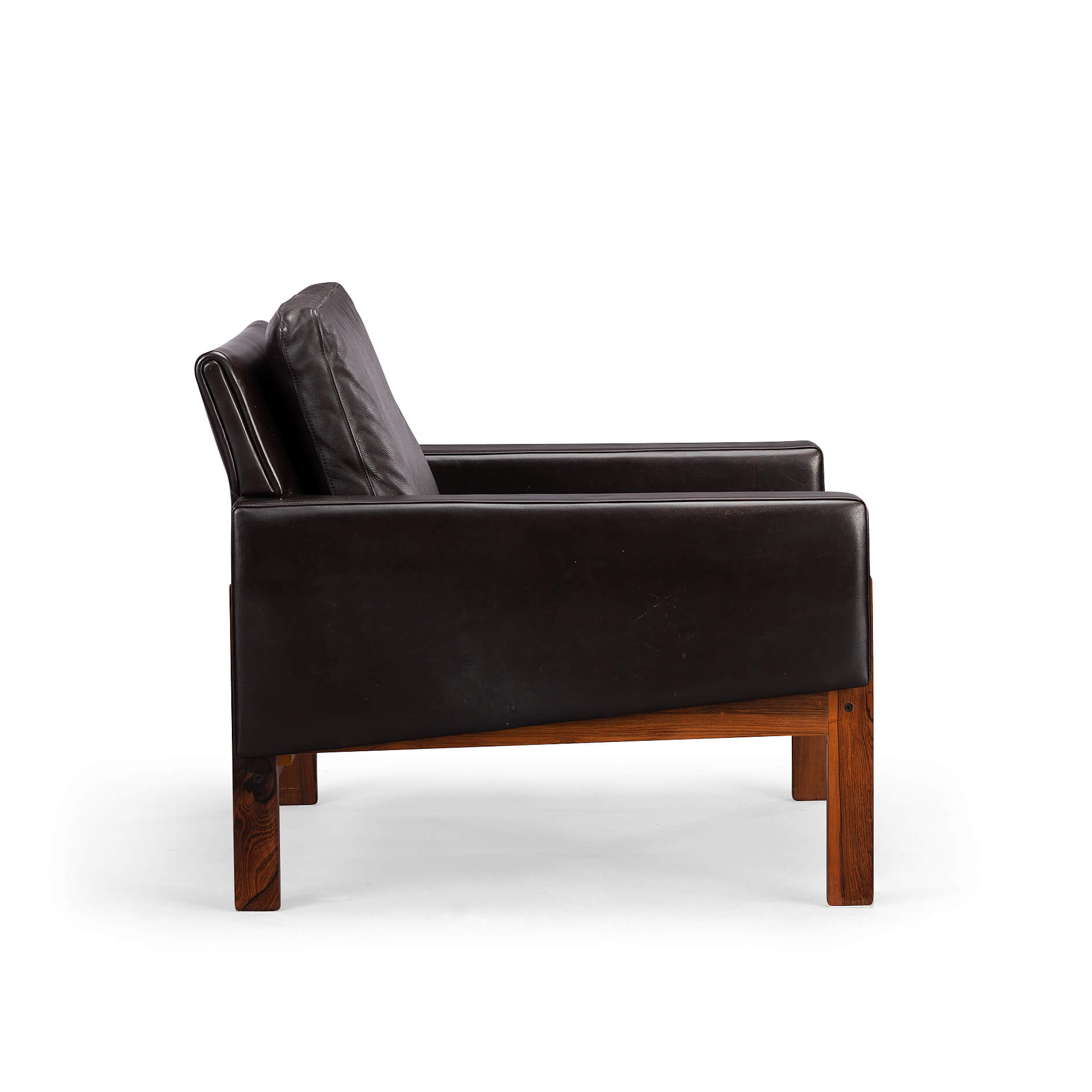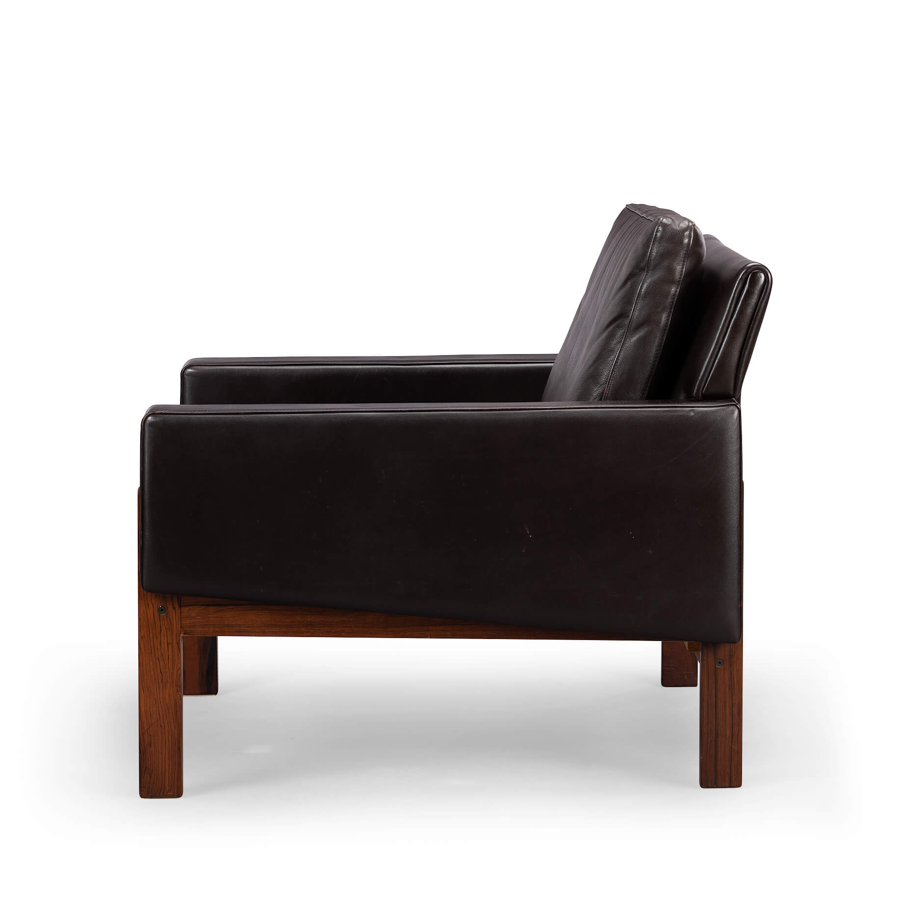 Black as night, faster than a shadow but also remarkably comfy folks! This mid century Danish easy chair by Dux with base and legs in a deep dark rosewood has a lot going for it. Pure craftsmanship and durability to start with that are showcased by a significant weight of the chair, rarely this is not an indication of quality. Leather is fully original and in nice glossy condition with only minor signs of age and use. The frame remotely resembles the France and Søn Moduline style hence it does combine well with it.