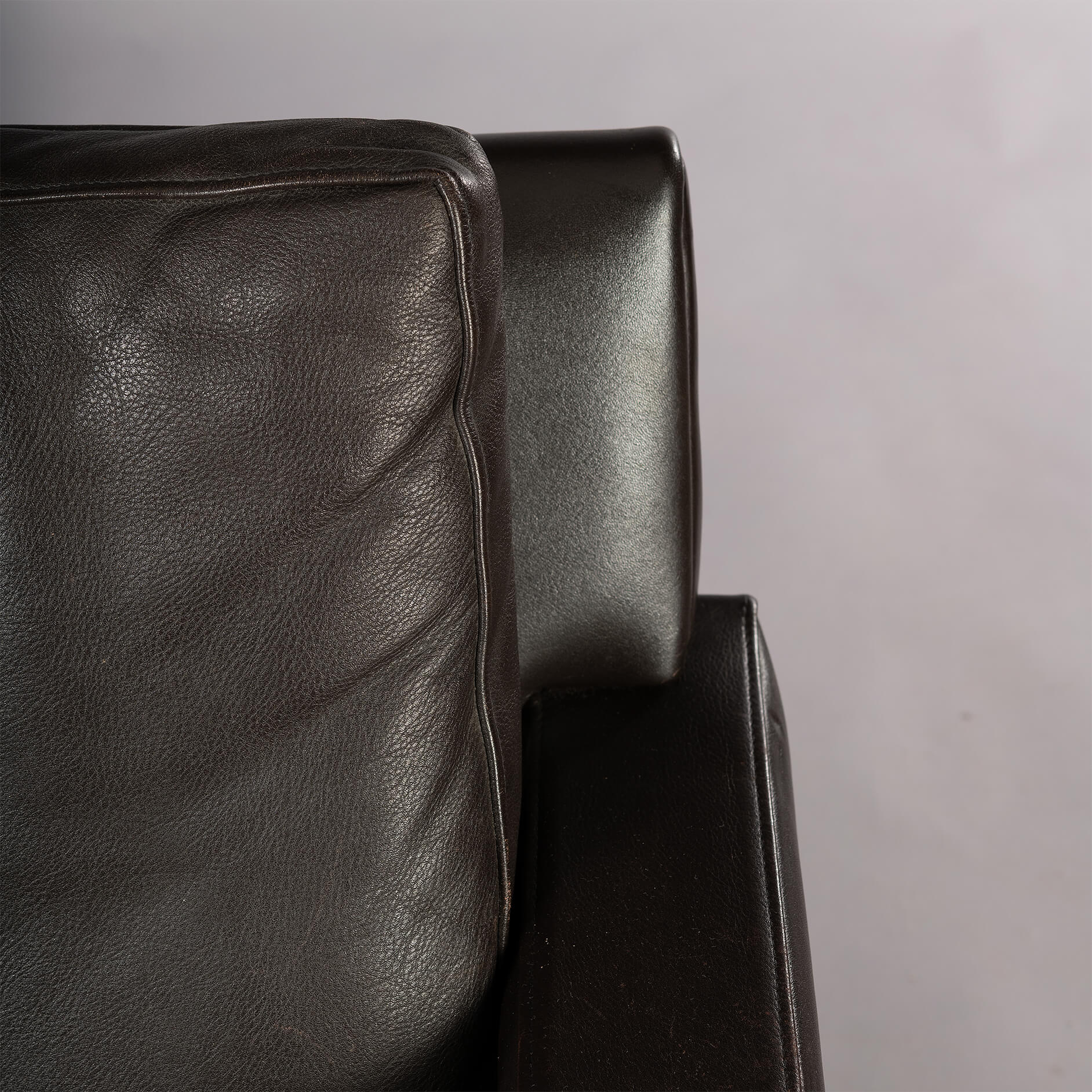 The back shows a reclined curve which eyes lovely from the side, in many ways this piece would do well in a free standing setup with the matching sofa we also have listed. Overall vintage condition is very good