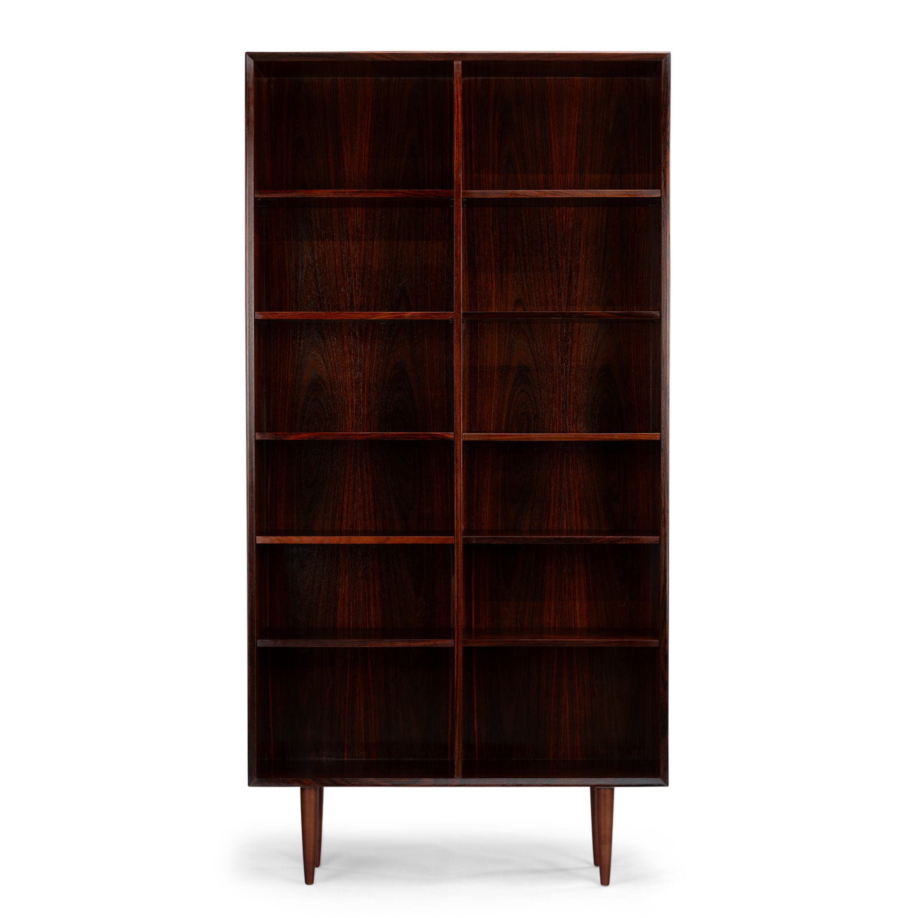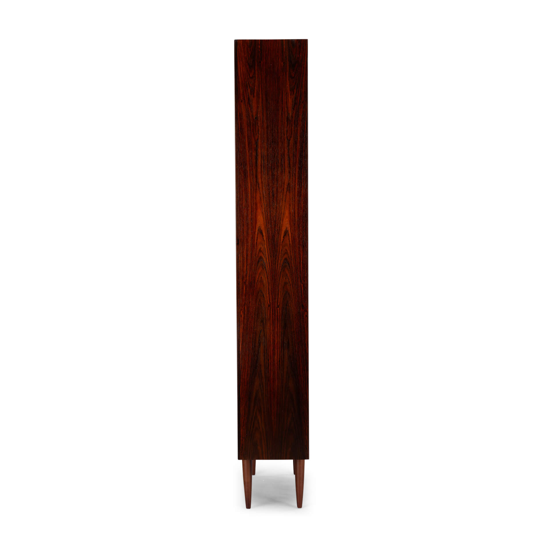 Danish high bookcase in beautiful rosewood veneer. This bookcase is in very good vintage condition with in total 10 in height adjustable shelves.