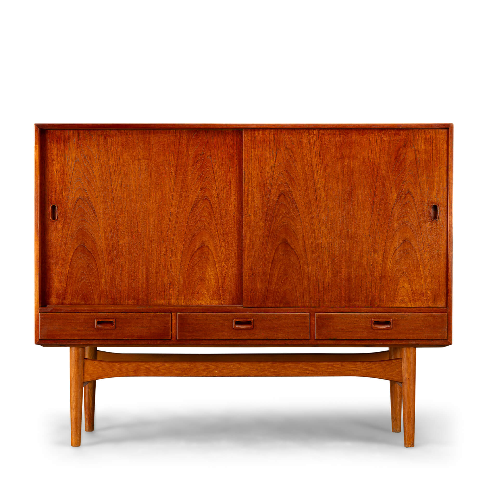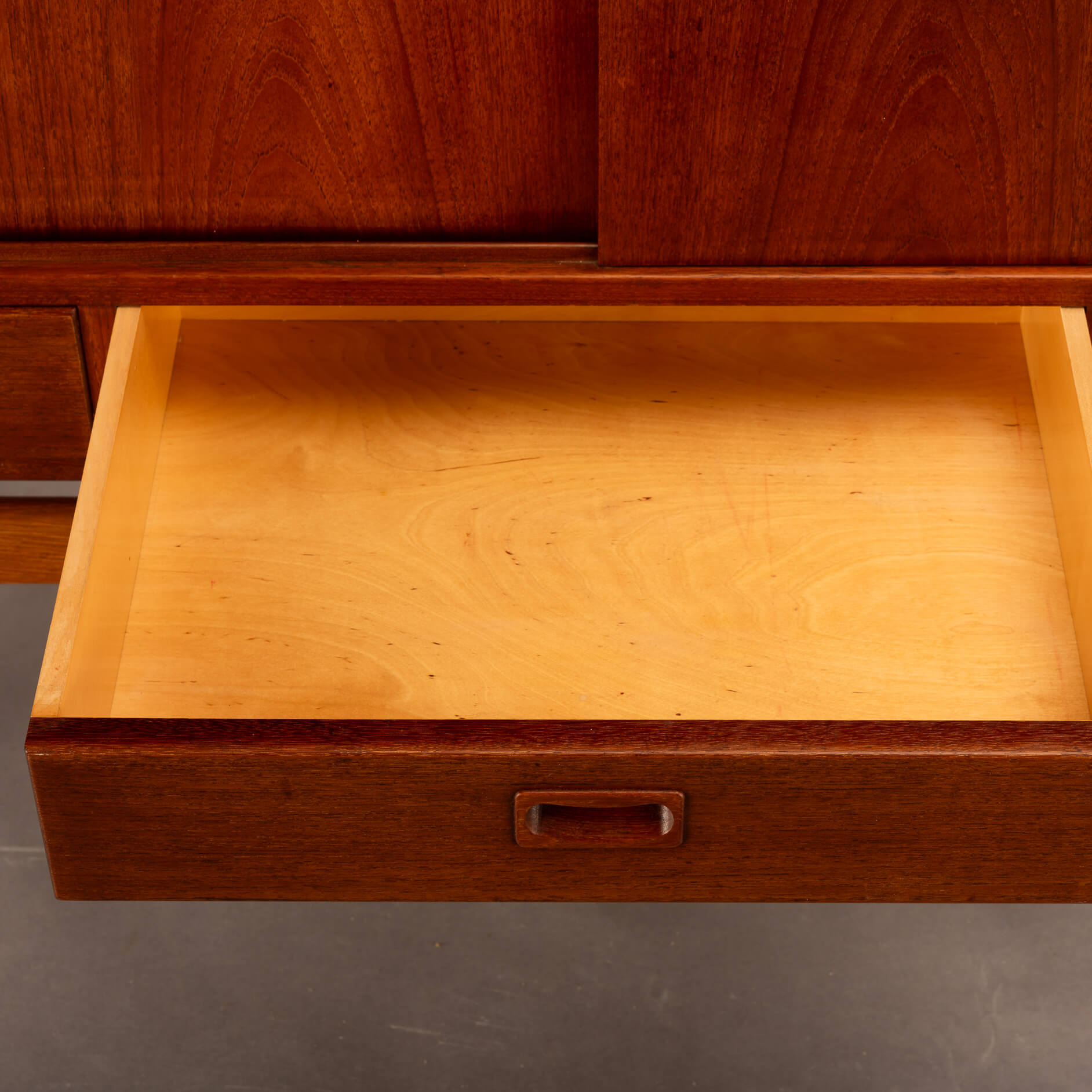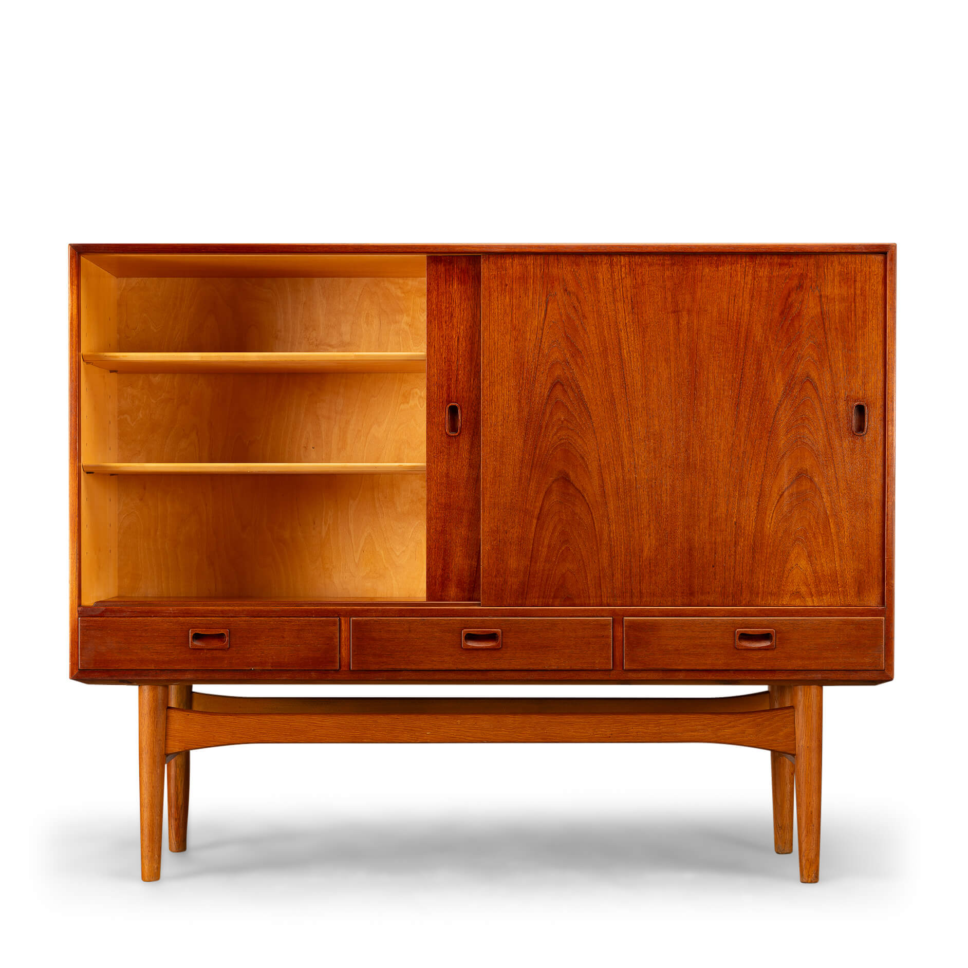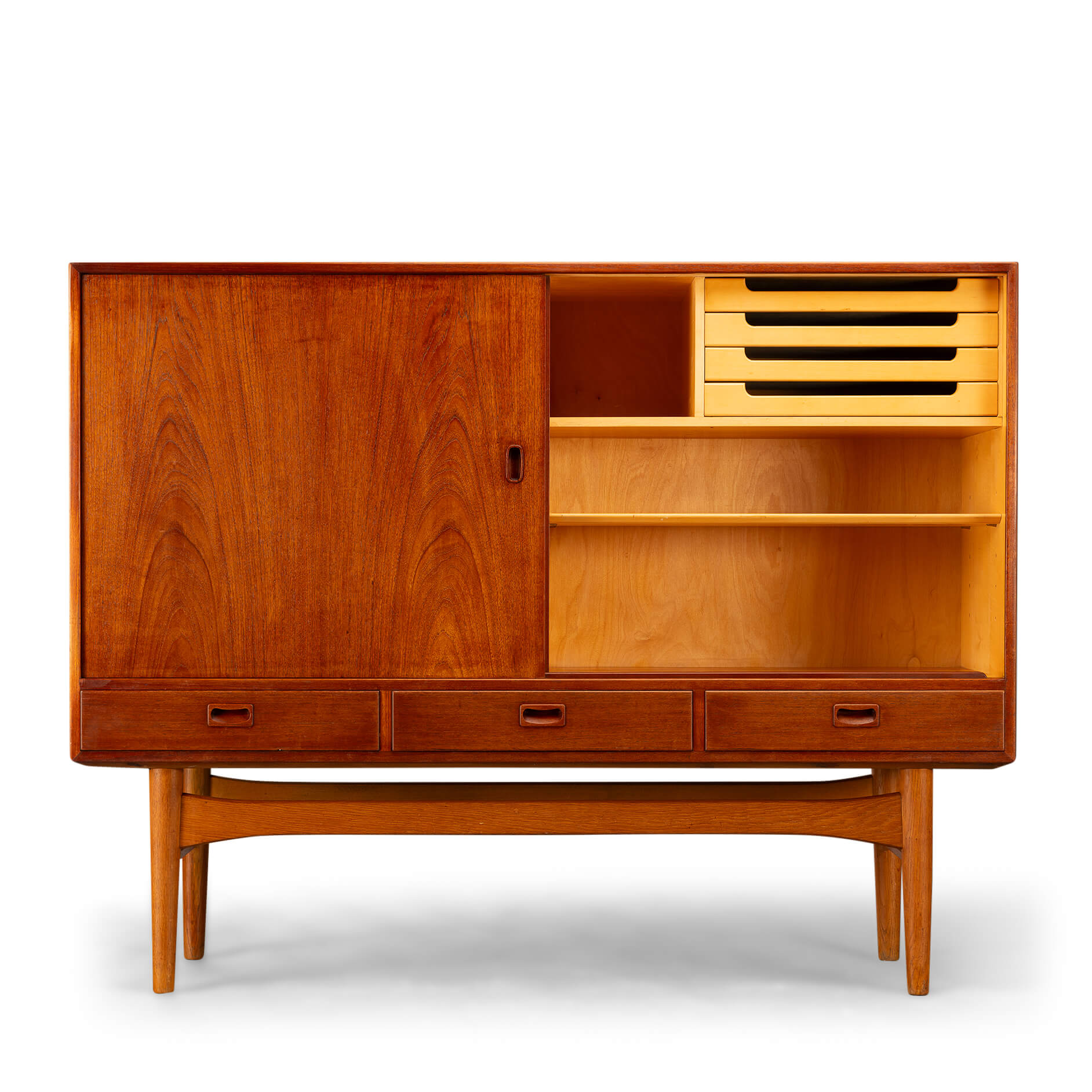 This Danish Design high sideboard, with its teak body and oak base, epitomizes mid-century modern elegance. It features two large sliding doors and three external drawers, plus an interior section with four small drawers for organized storage. The designer and producer are unknown, so this sideboard offers an attractive value for its stylish and functional design.