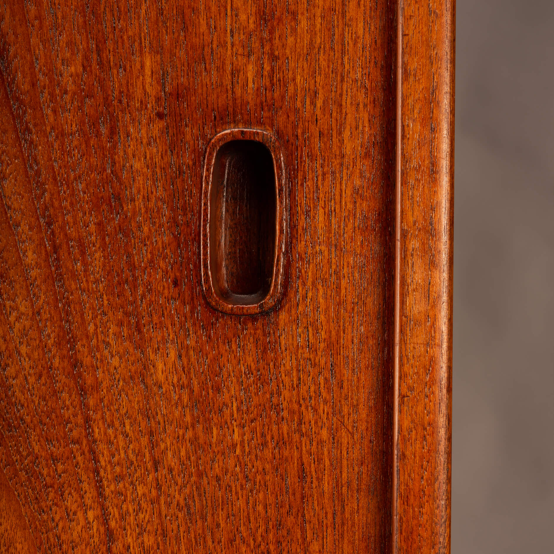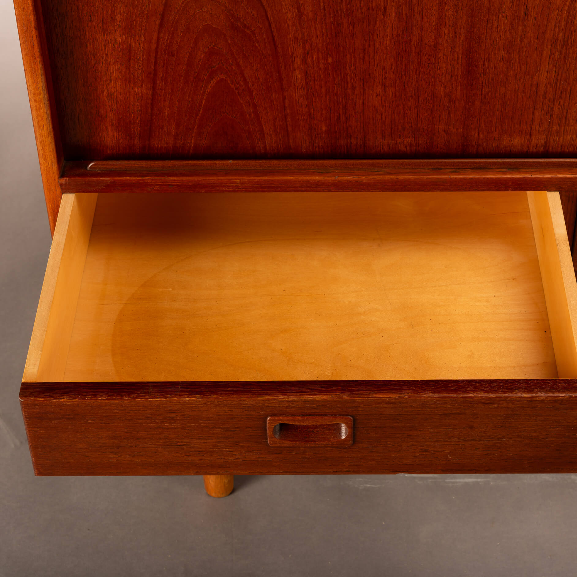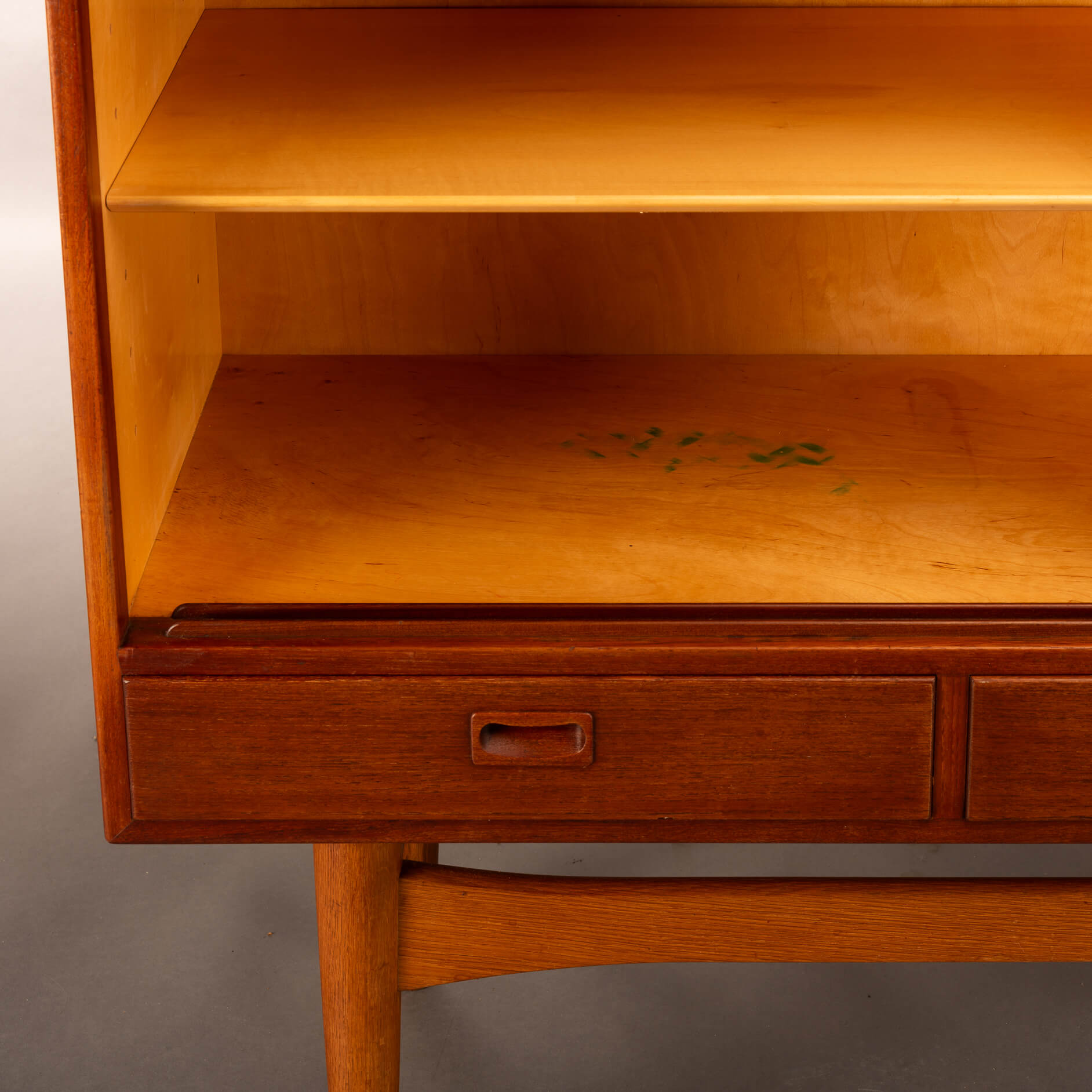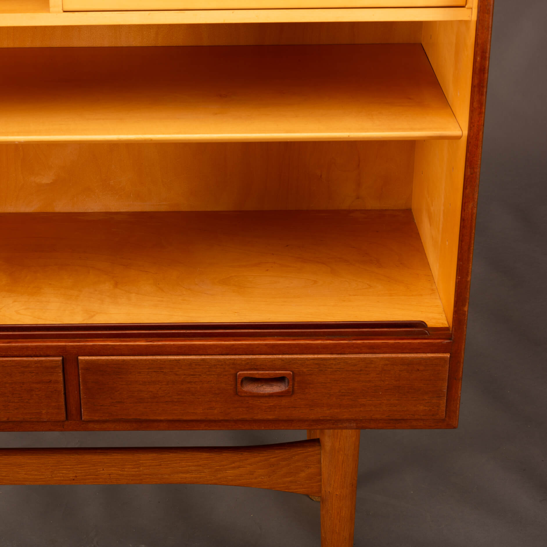This Danish Design high sideboard, with its teak body and oak base, epitomizes mid-century modern elegance. It features two large sliding doors and three external drawers, plus an interior section with four small drawers for organized storage. The designer and producer are unknown, so this sideboard offers an attractive value for its stylish and functional design.