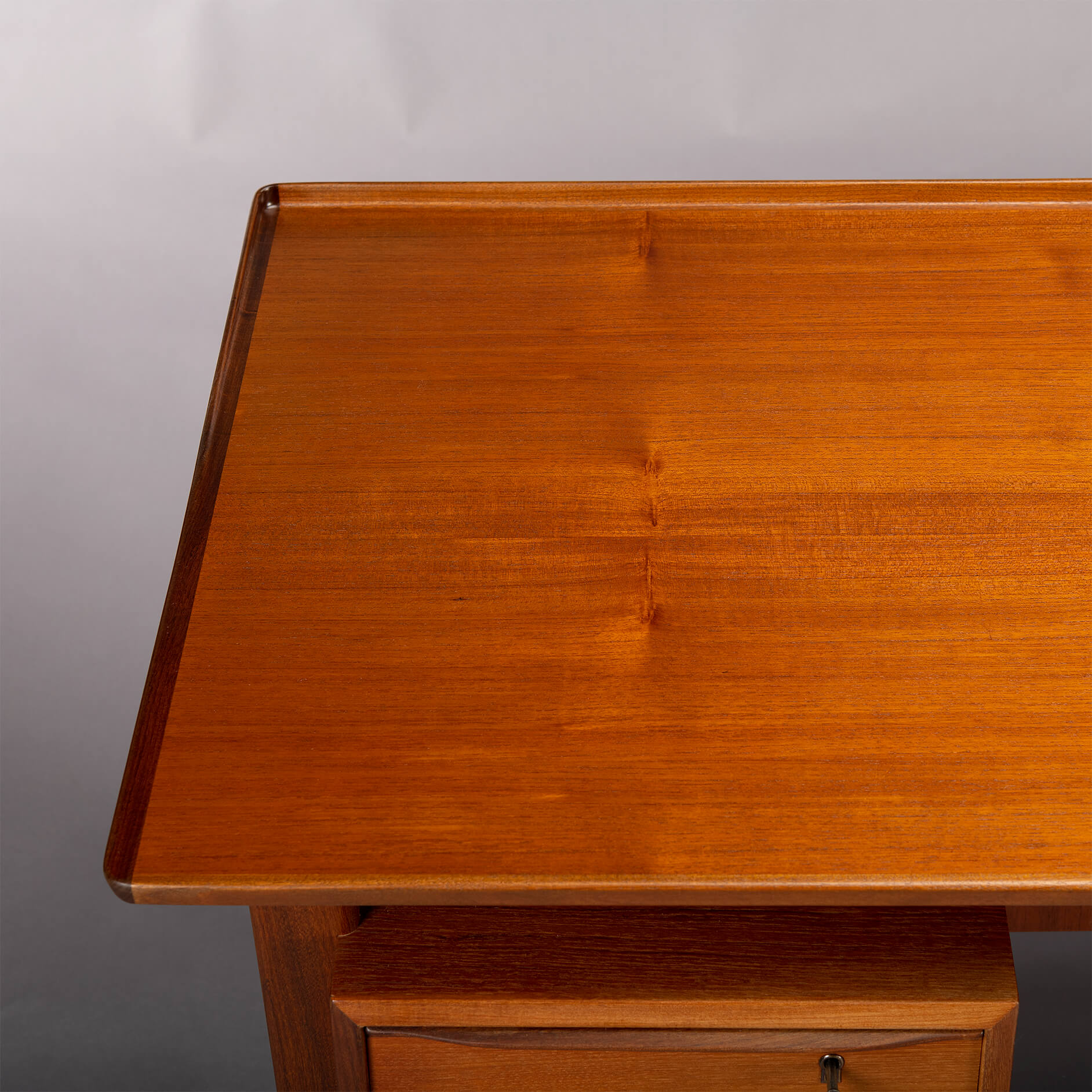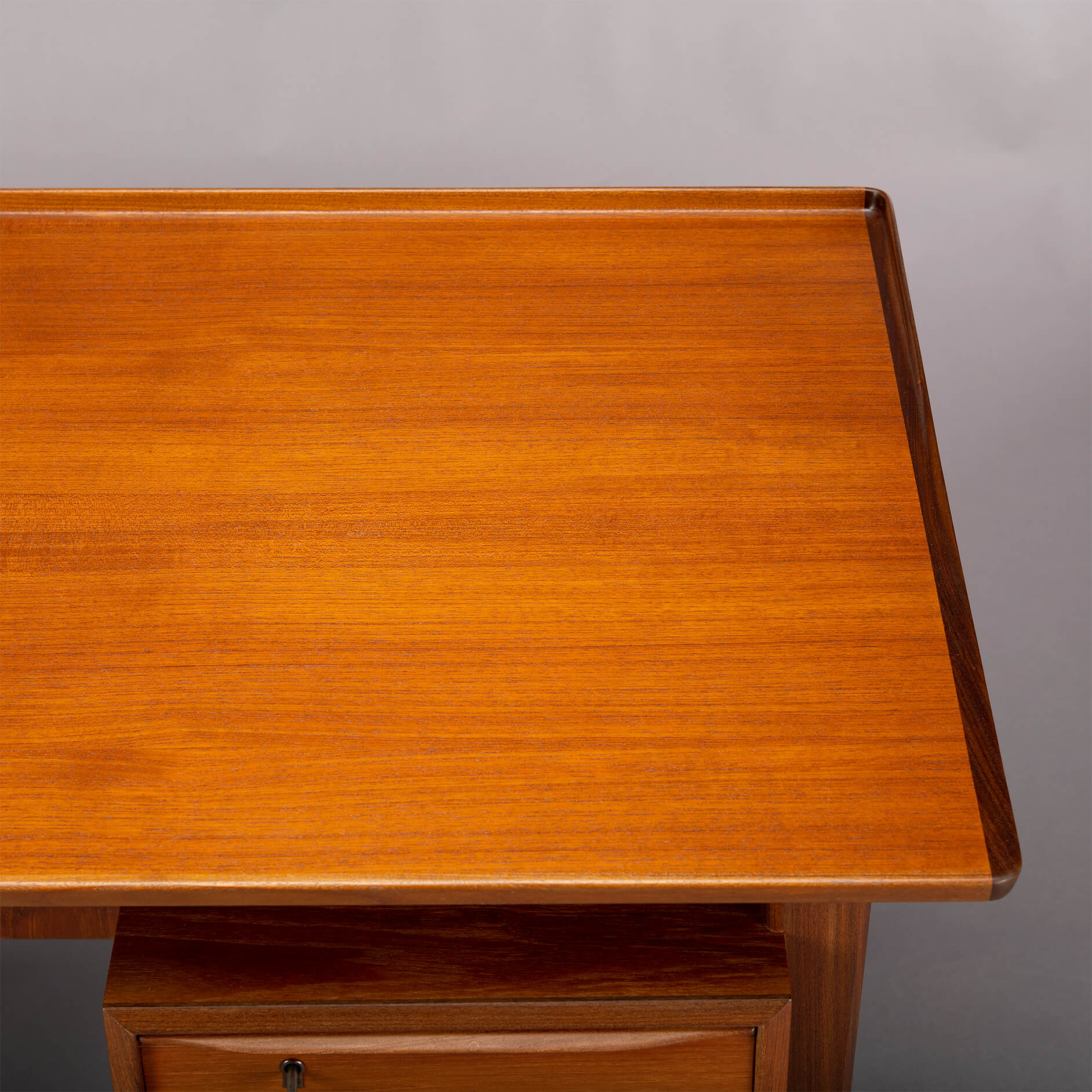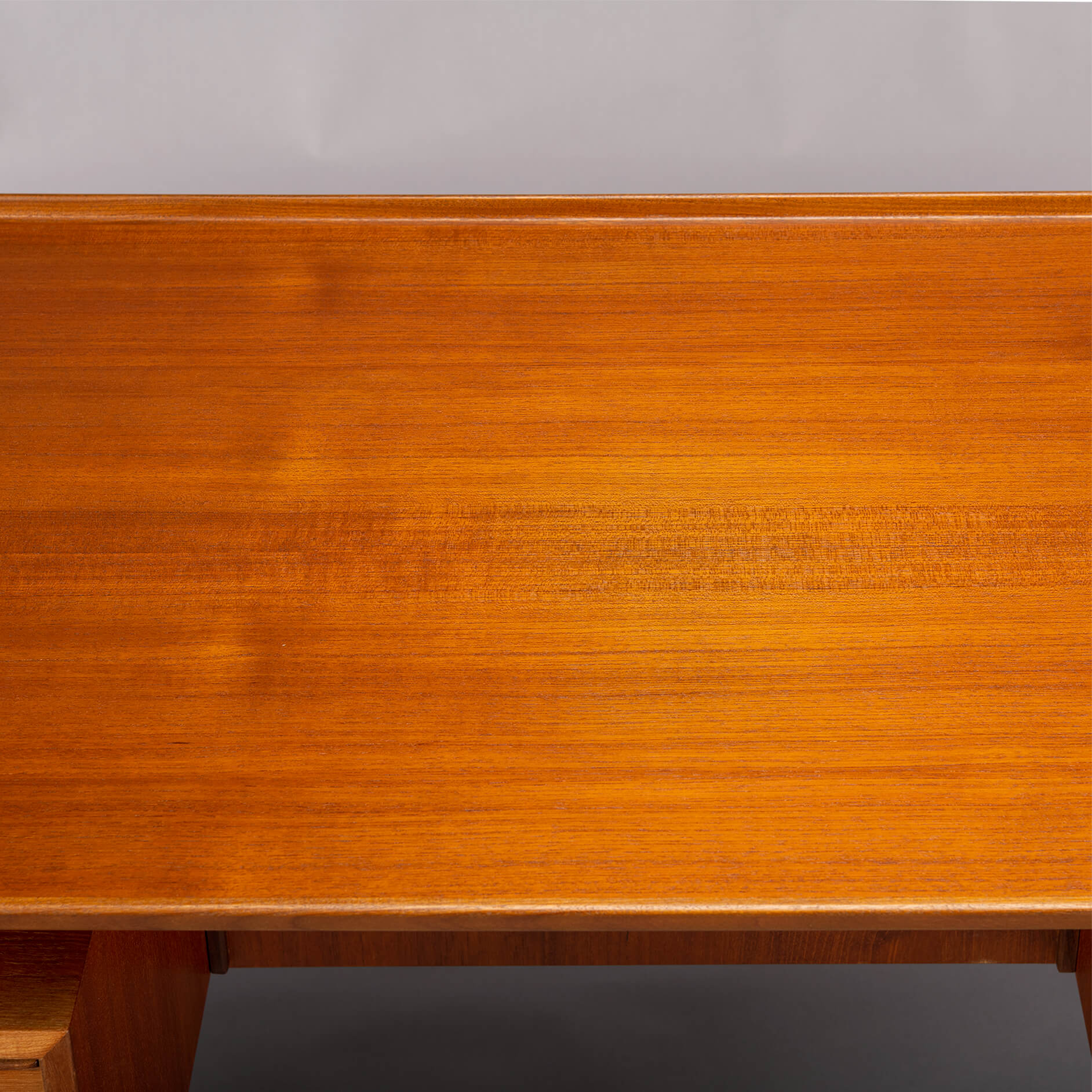 We had the top refinished with a cellulose laquer system minimizing the impact on the pure teak feel but adding a layer of robustness to the top. There are signs of use and time on the frame and the drawer banks but none of those disturb really. For this reason we give this desk a very good vintage condition mark.