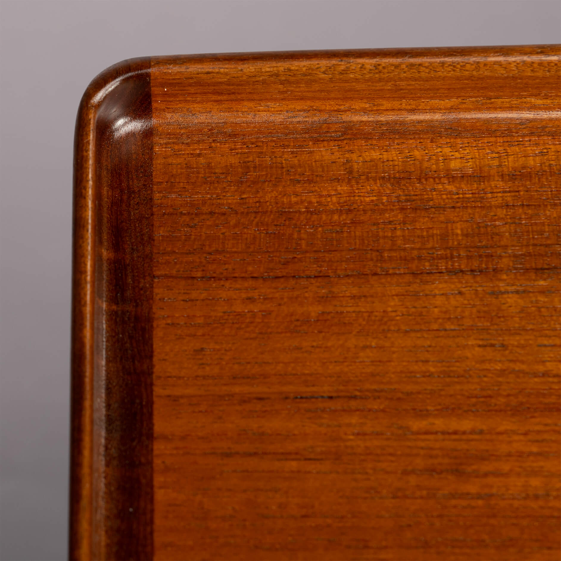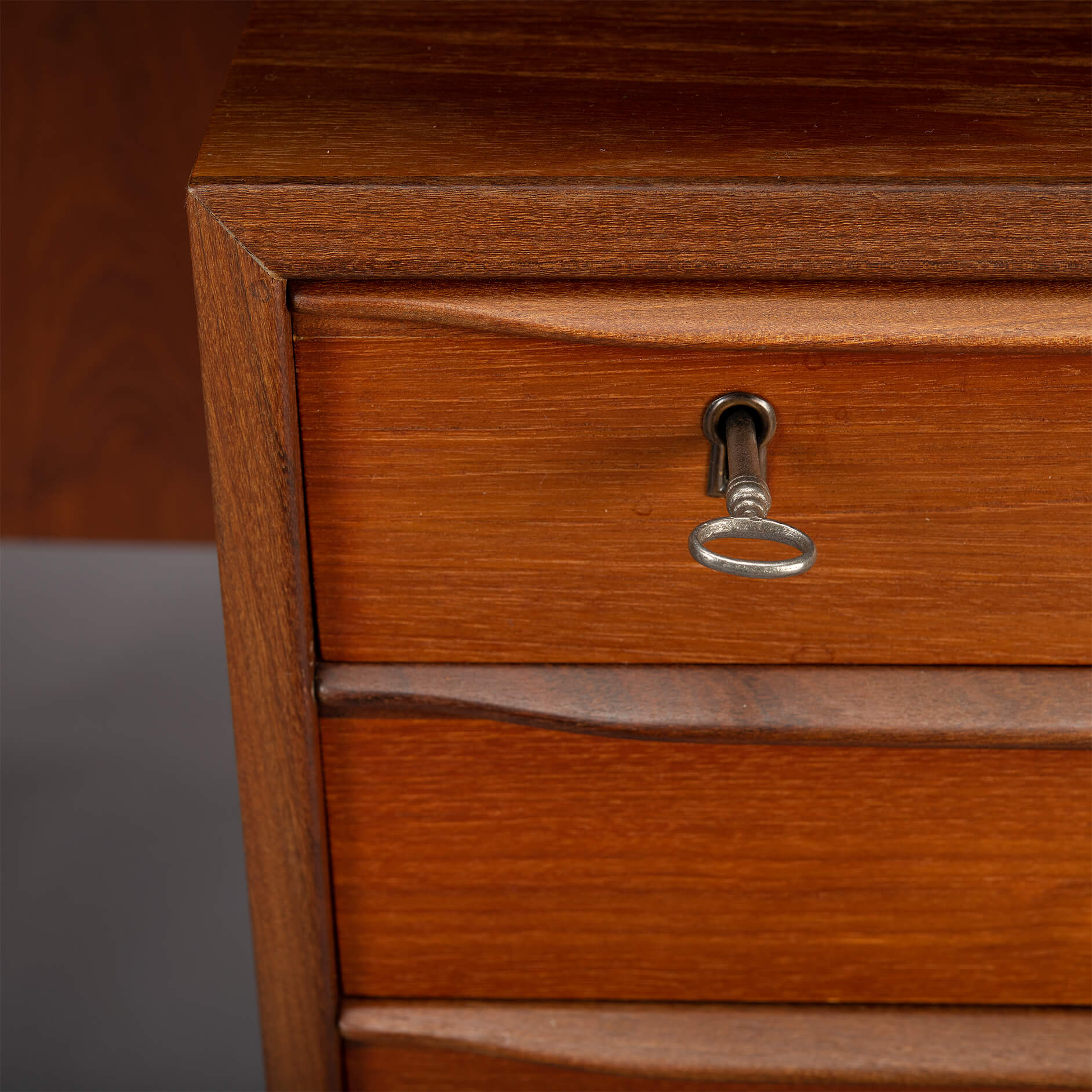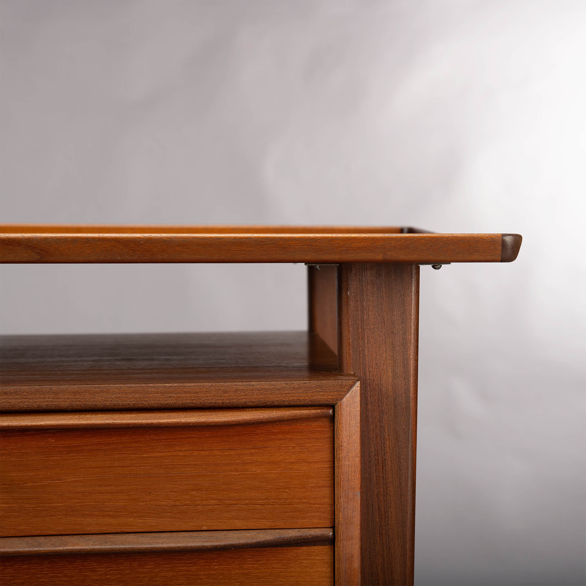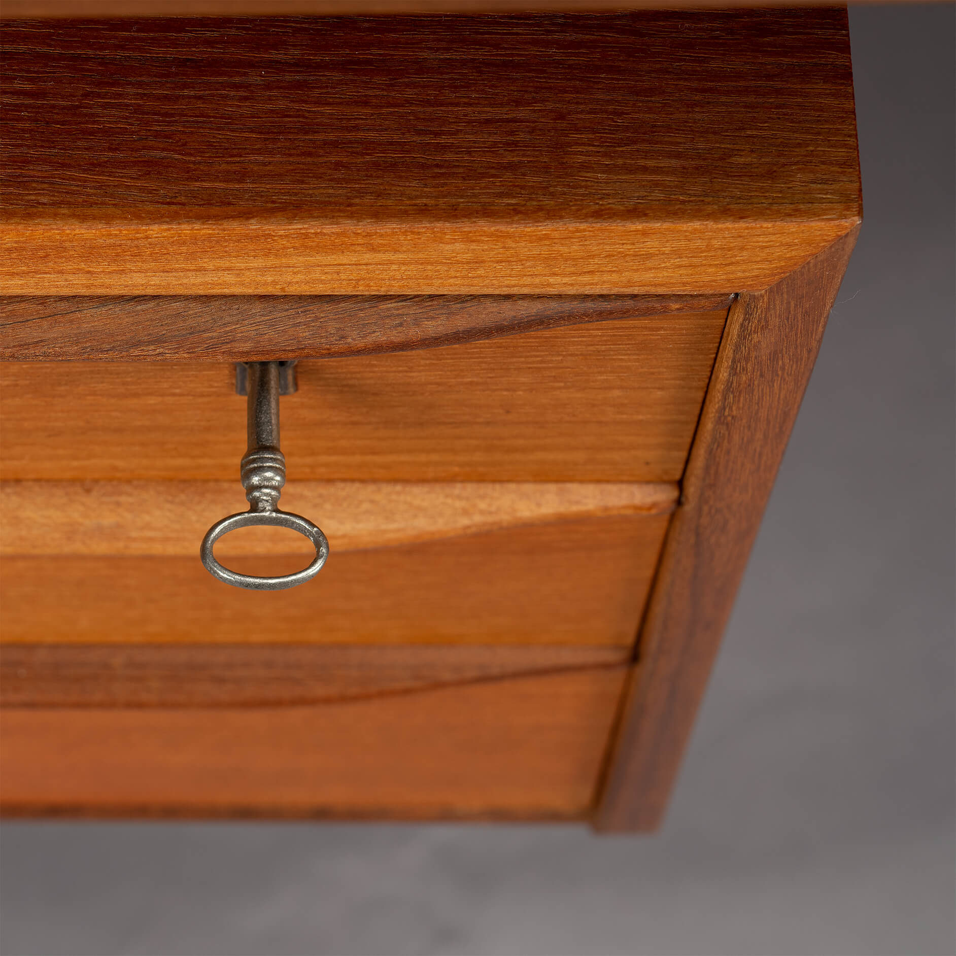 We had the top refinished with a cellulose laquer system minimizing the impact on the pure teak feel but adding a layer of robustness to the top. There are signs of use and time on the frame and the drawer banks but none of those disturb really. For this reason we give this desk a very good vintage condition mark.