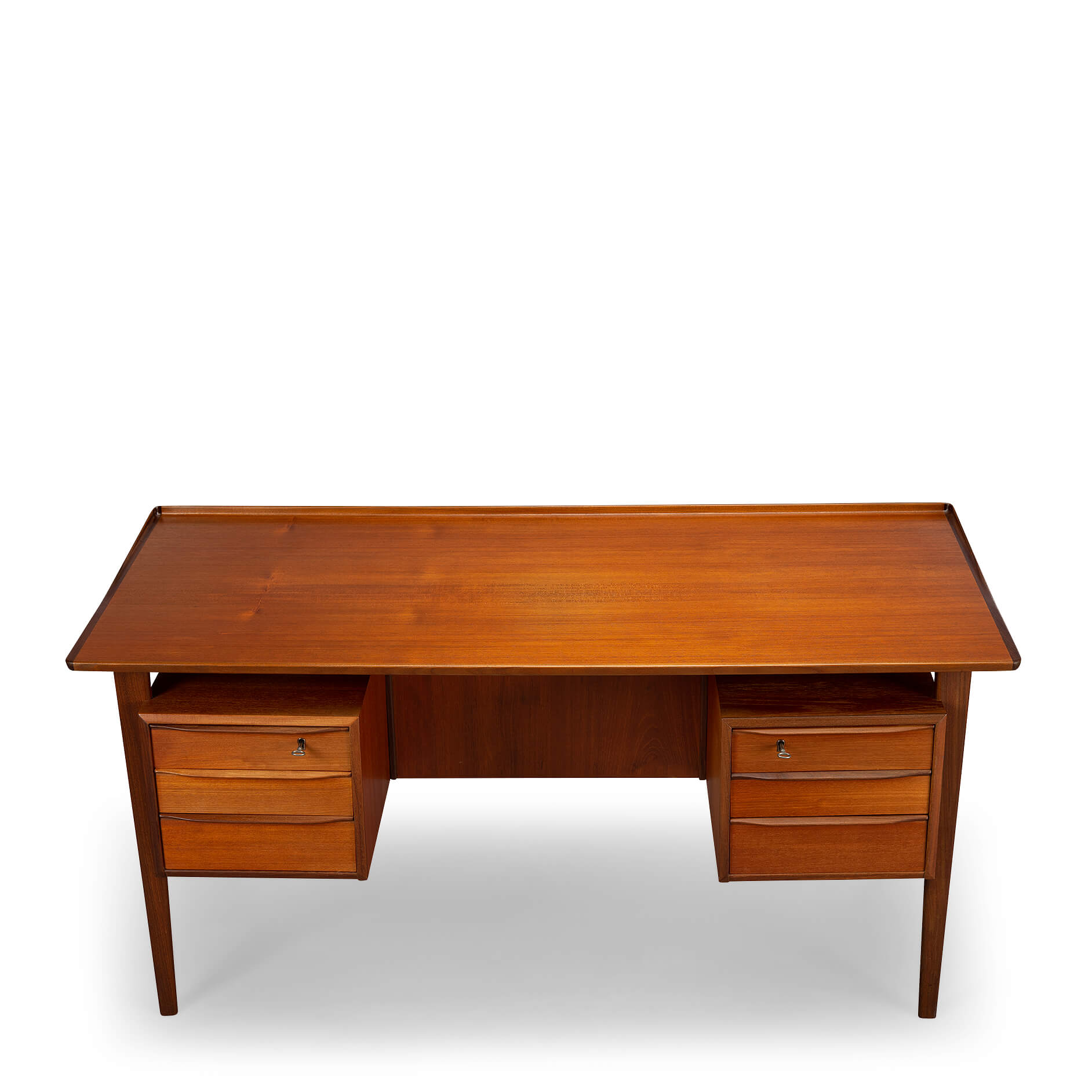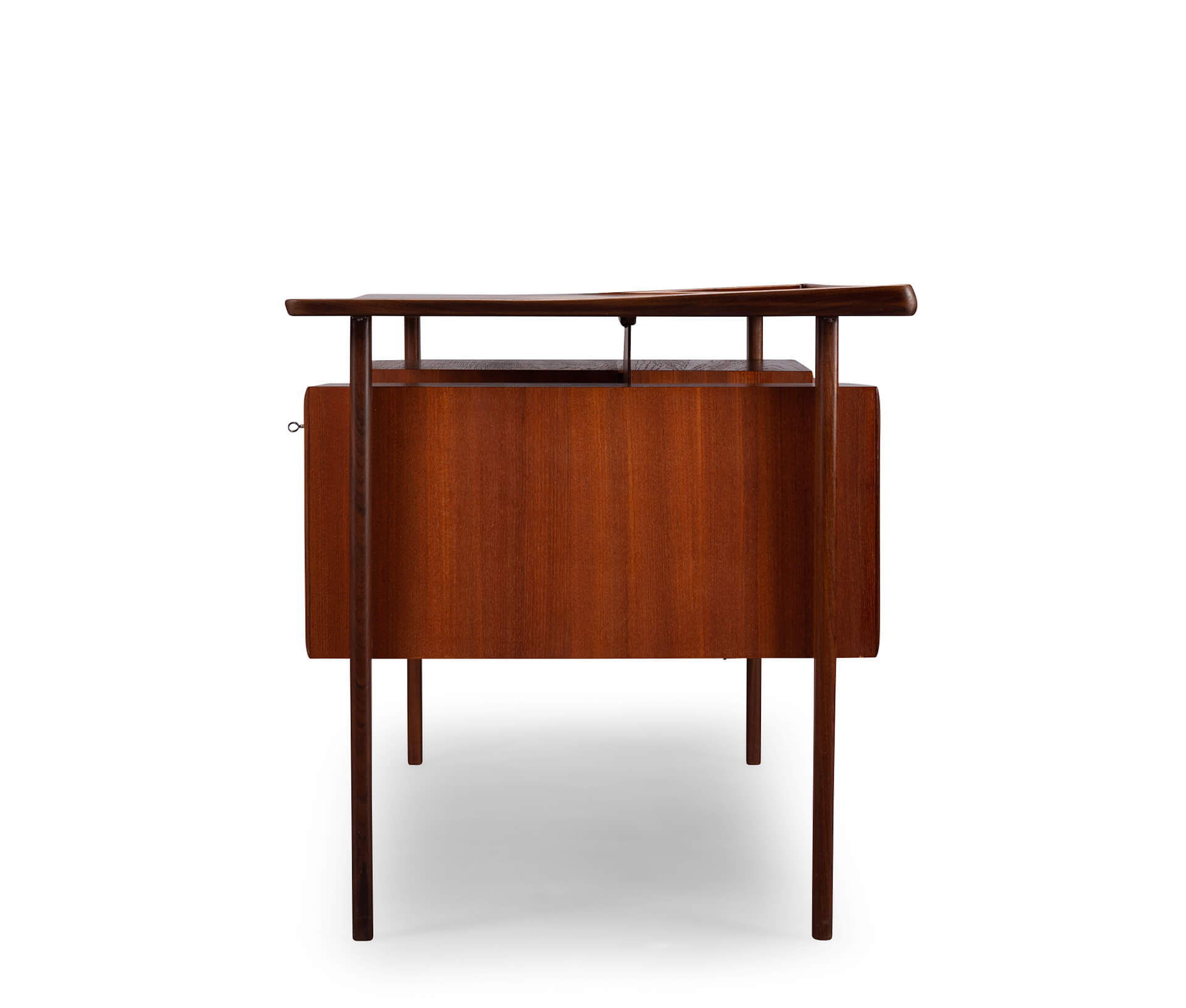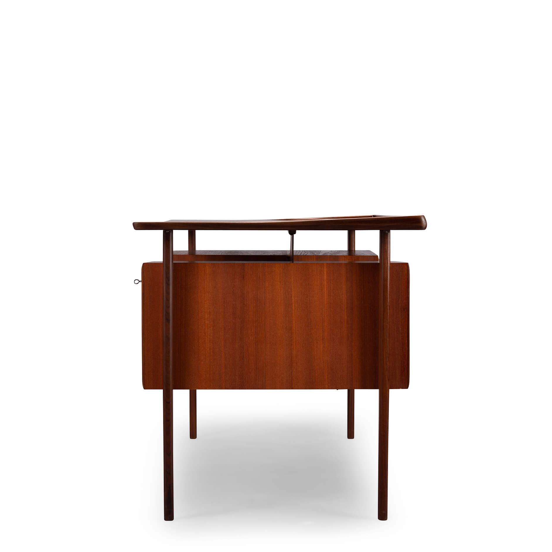 This mid century teak desk will provide for all your home office needs and more. It comprises two banks of drawers of which the top drawers can be locked and on the back has shelves for books. The desk will look great as free standing piece. The curved up back edge tapers down on the sides and is made in solid teak. It adds to the quality and looks of the desk. Also the legs of the desk are made out of solid teak.