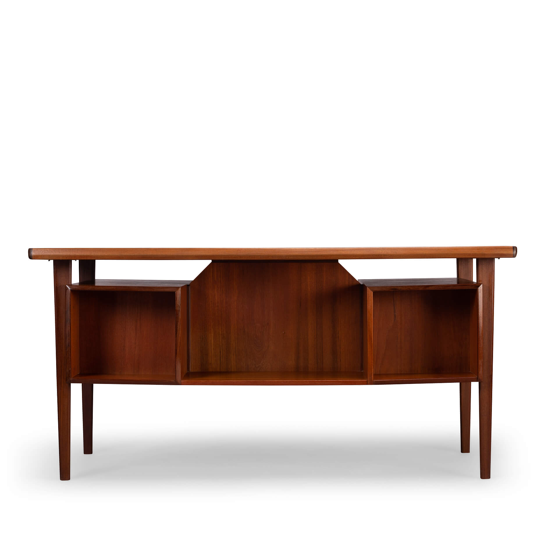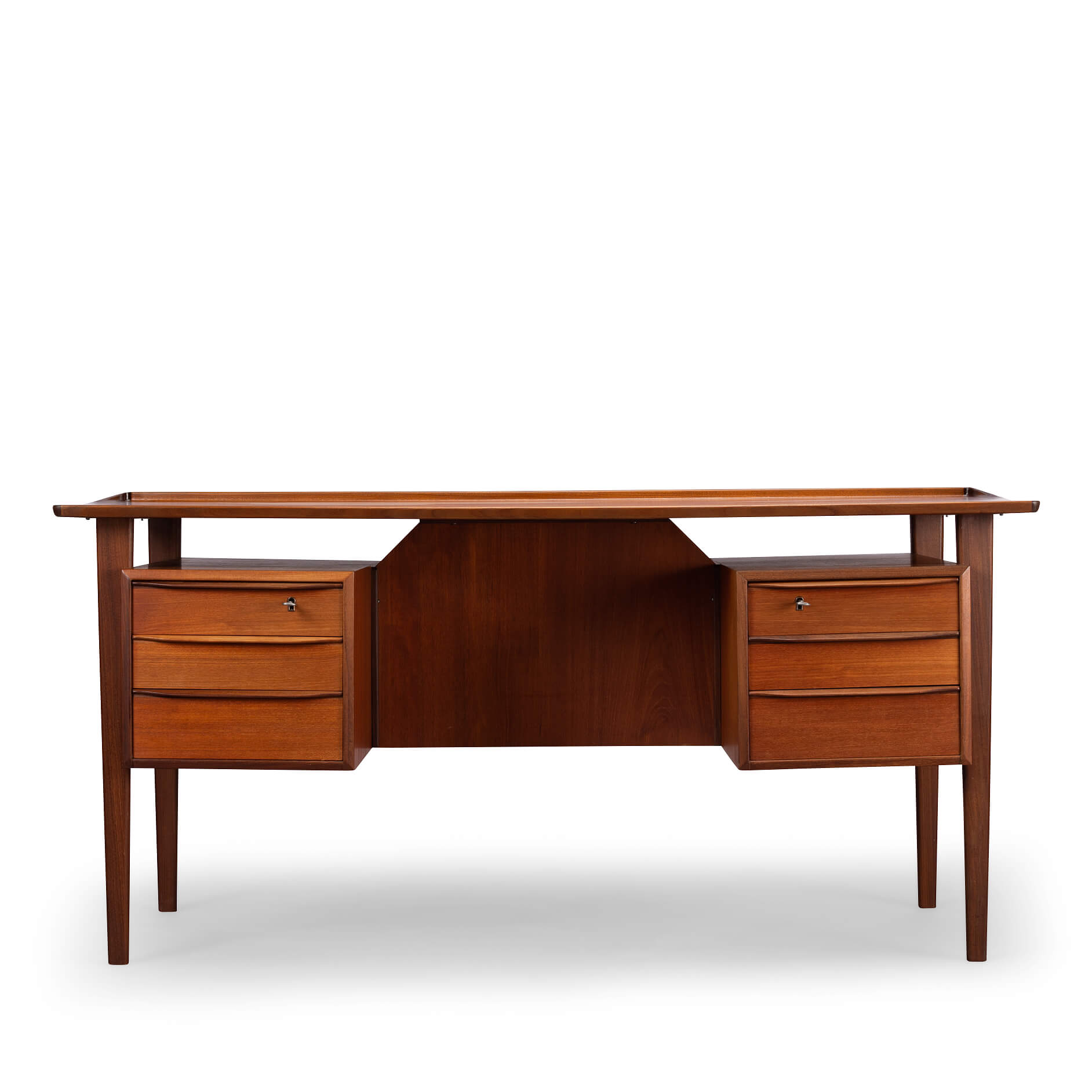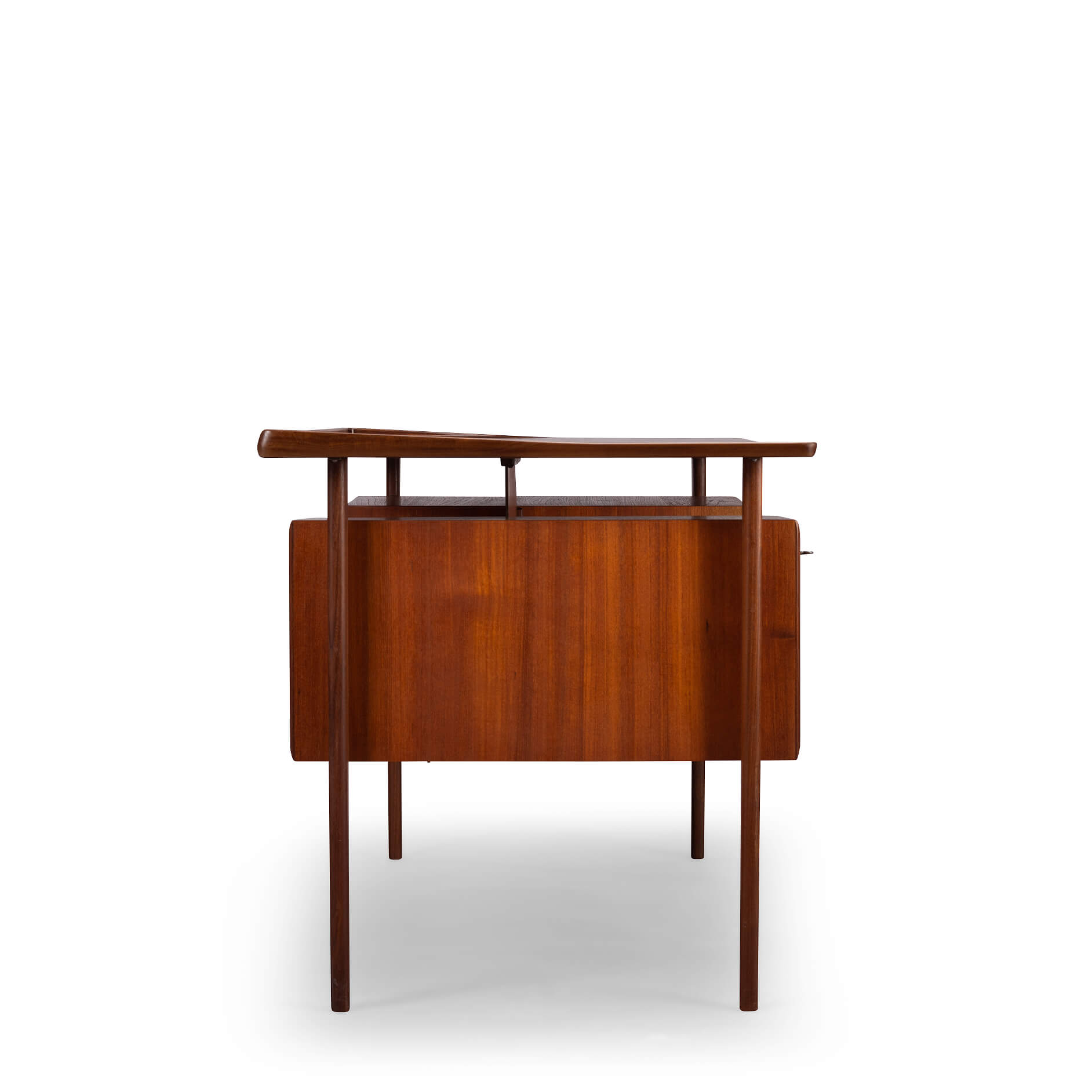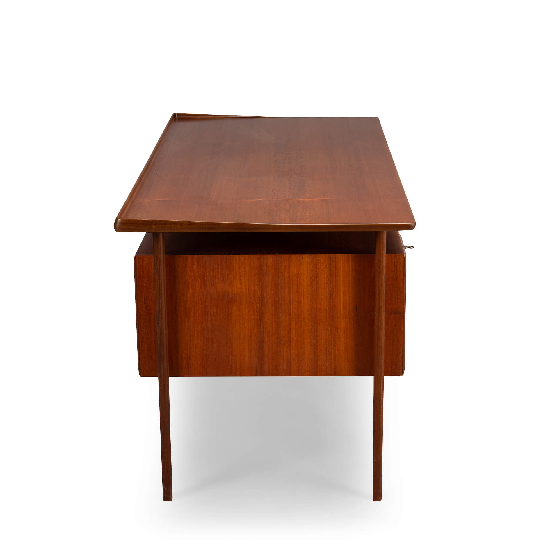 This mid century teak desk will provide for all your home office needs and more. It comprises two banks of drawers of which the top drawers can be locked and on the back has shelves for books. The desk will look great as free standing piece. The curved up back edge tapers down on the sides and is made in solid teak. It adds to the quality and looks of the desk. Also the legs of the desk are made out of solid teak.
