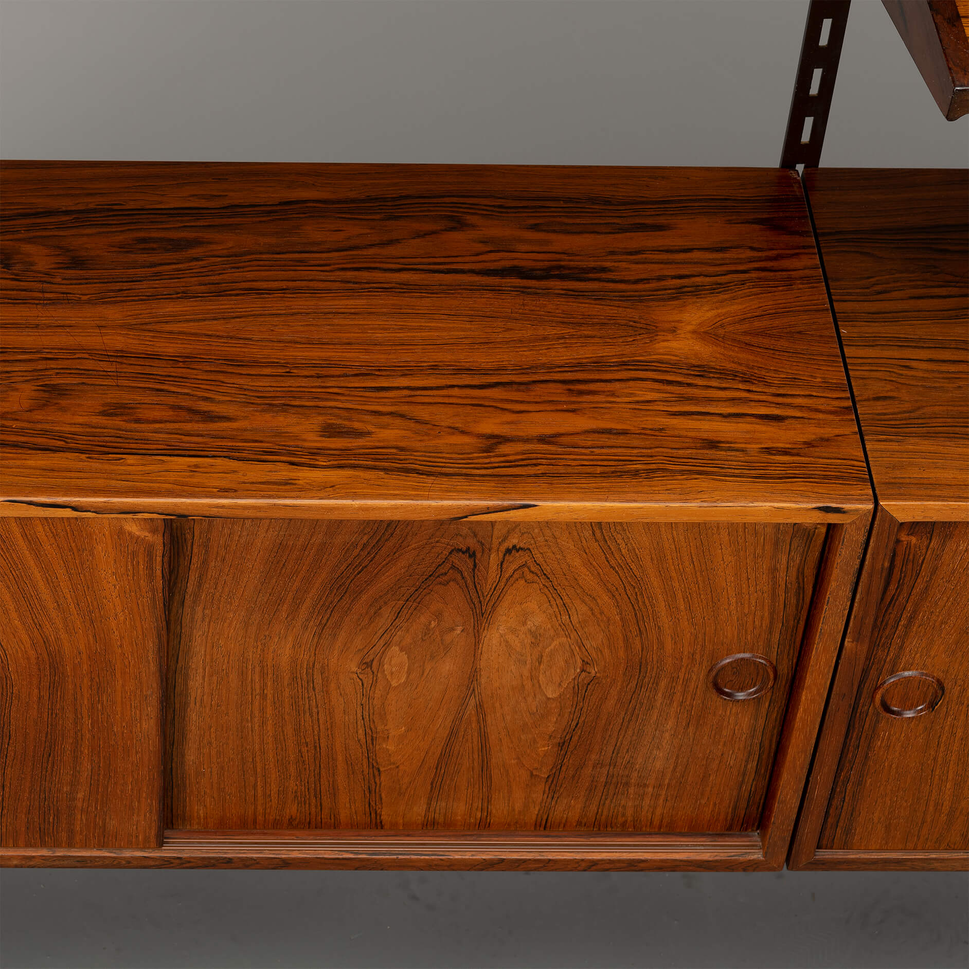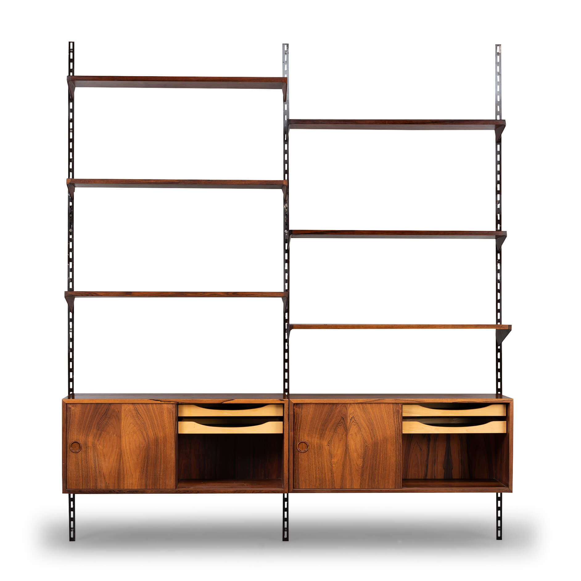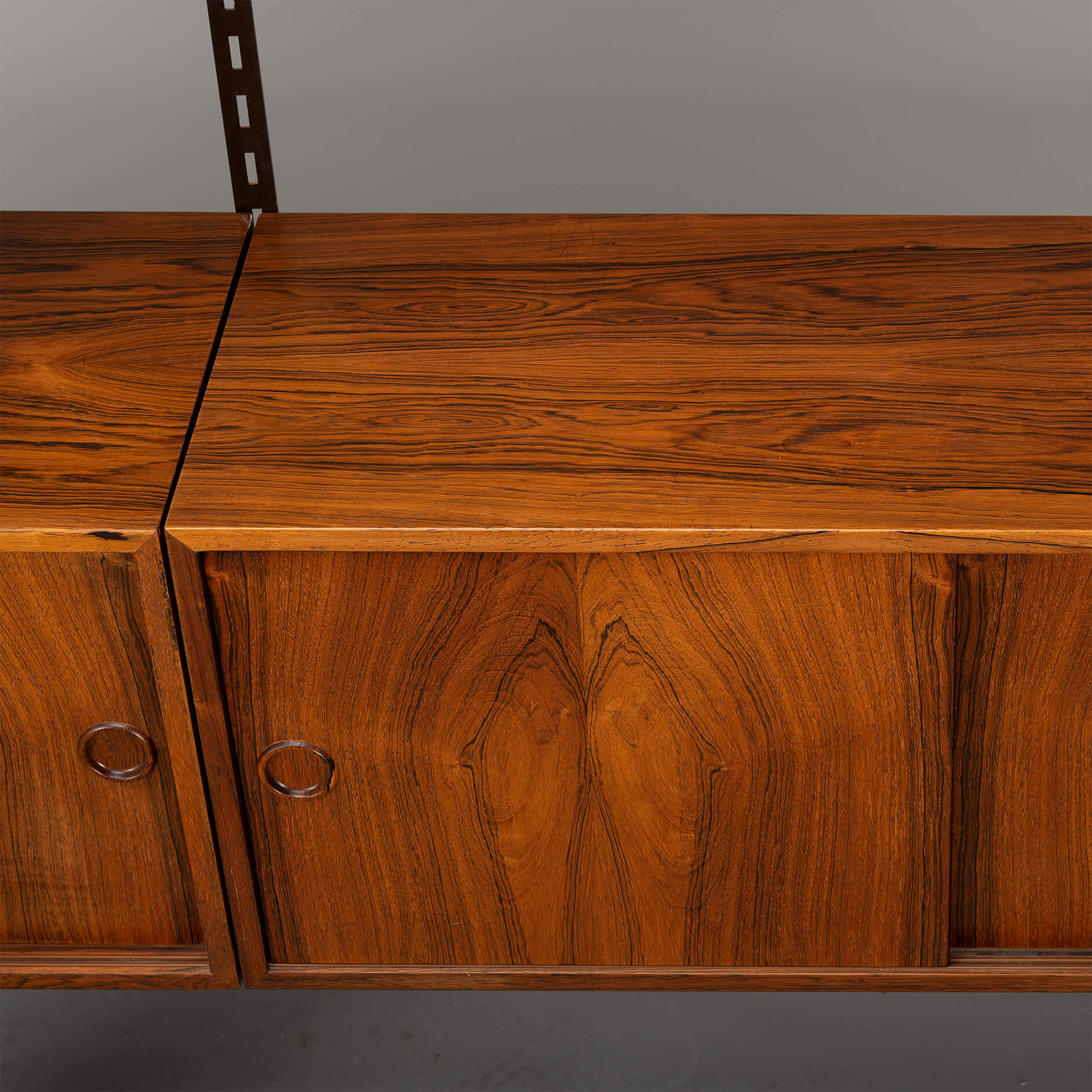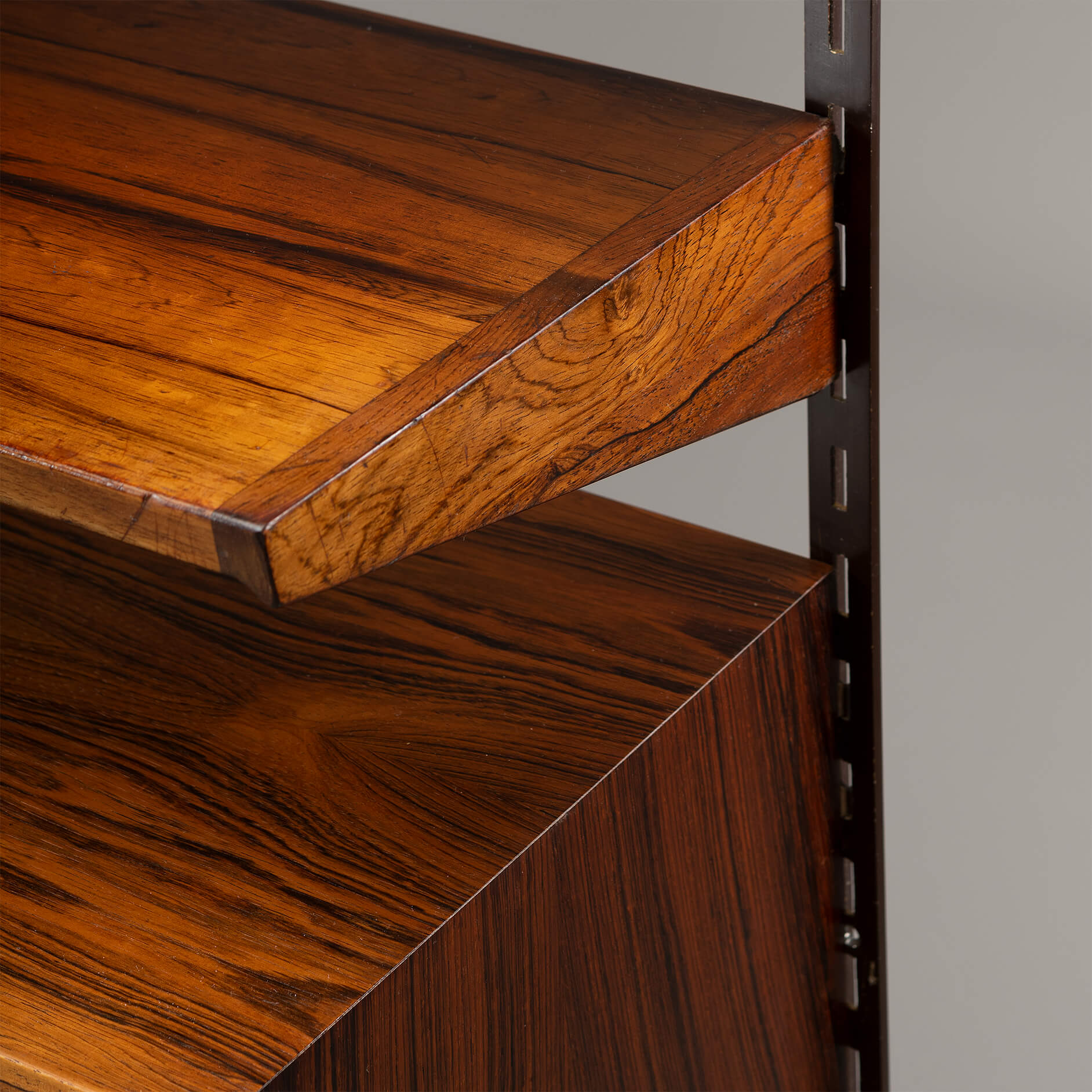 This particular rosewood Reolsystem has 3 metal uprights, two cabinets and 6 shelves, with three different sizes. The size of the big shelve is width 85cm and depth 28 cm. Also one shelf width 85cm and depth 24cm. And 4 smaller shelves width 85cm and depth 18cm.