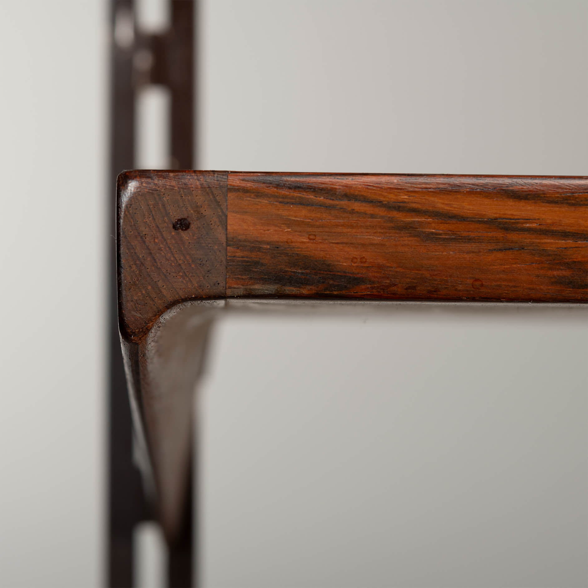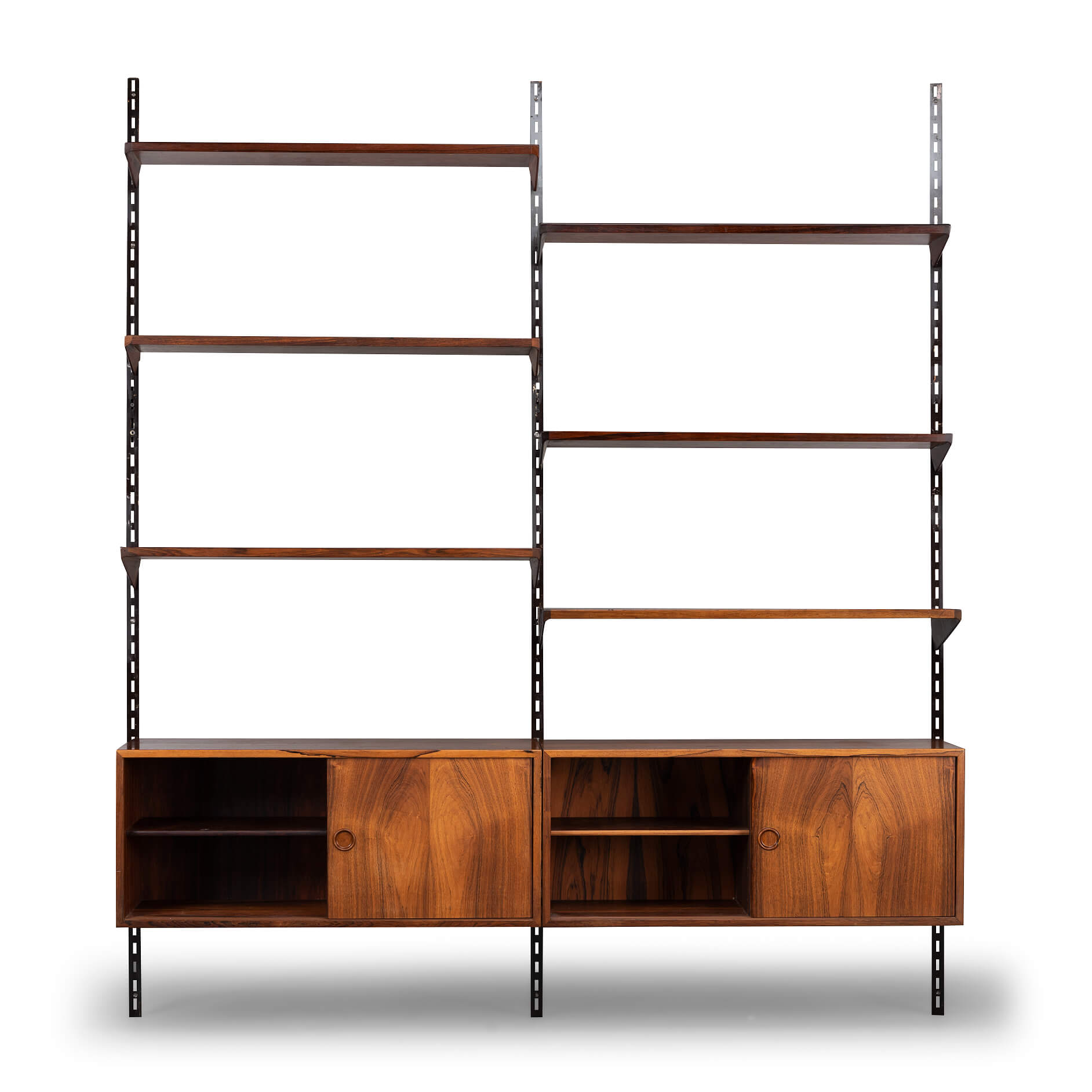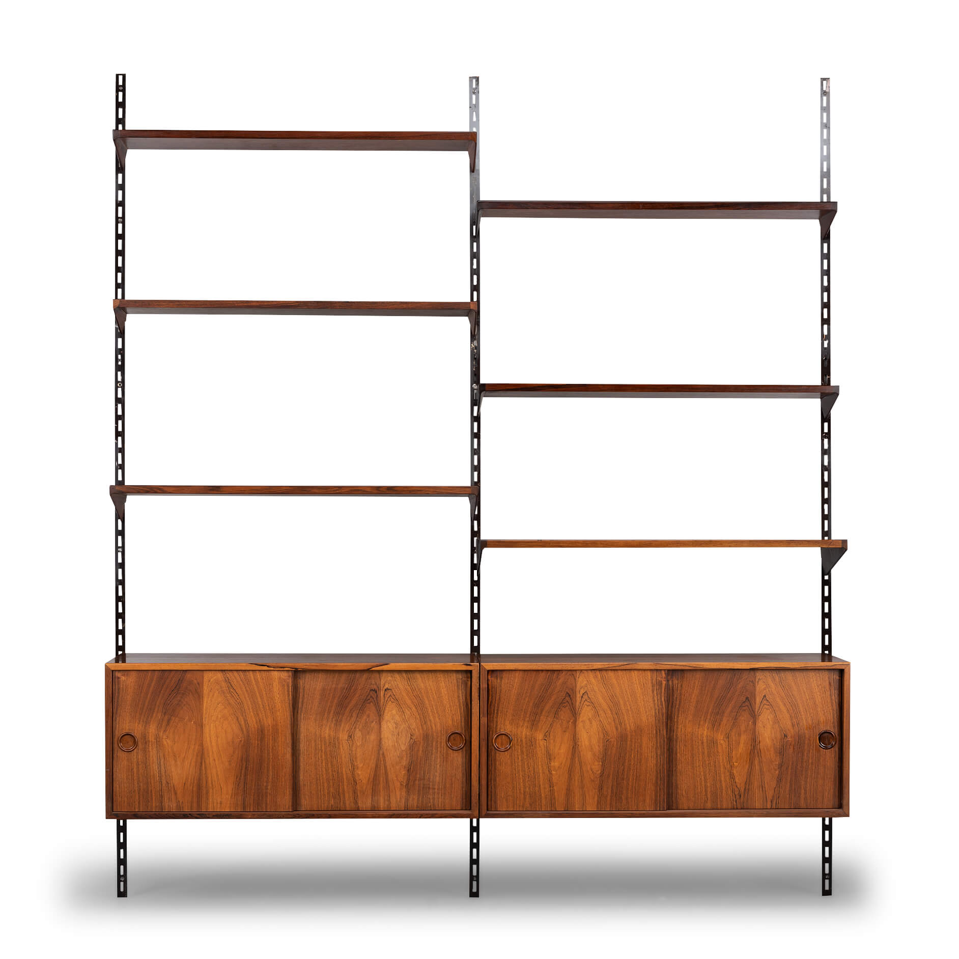 This particular rosewood Reolsystem has 3 metal uprights, two cabinets and 6 shelves, with three different sizes. The size of the big shelve is width 85cm and depth 28 cm. Also one shelf width 85cm and depth 24cm. And 4 smaller shelves width 85cm and depth 18cm.