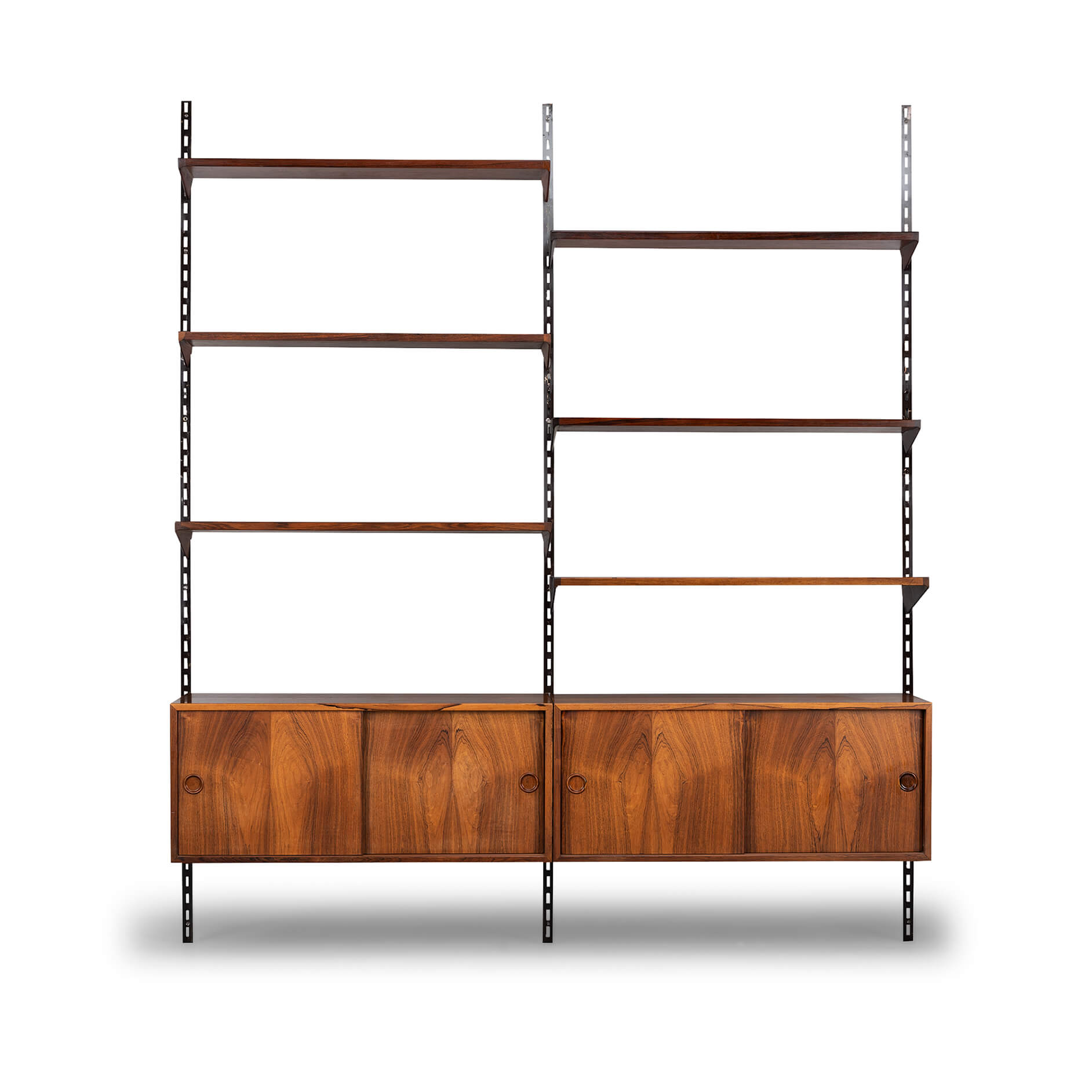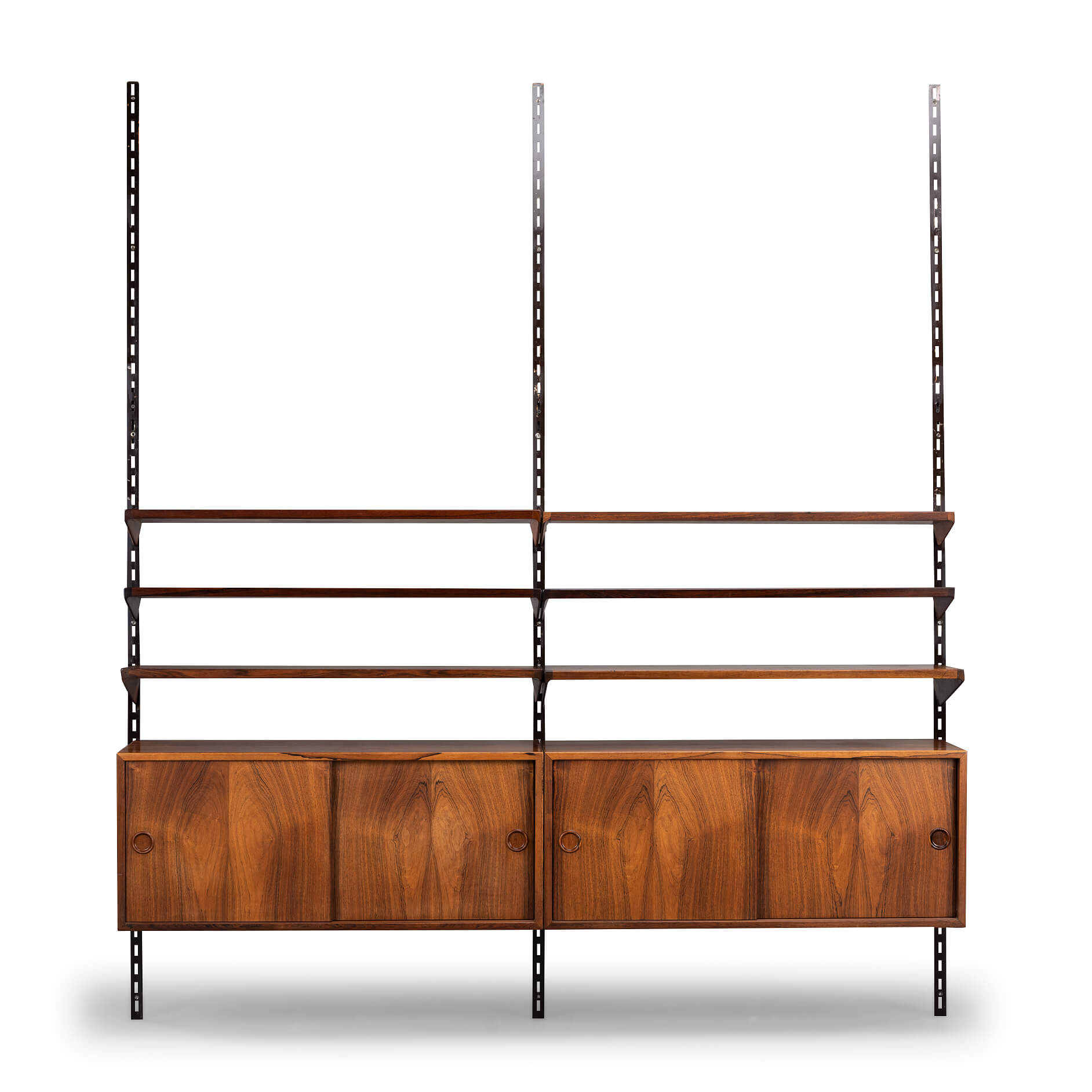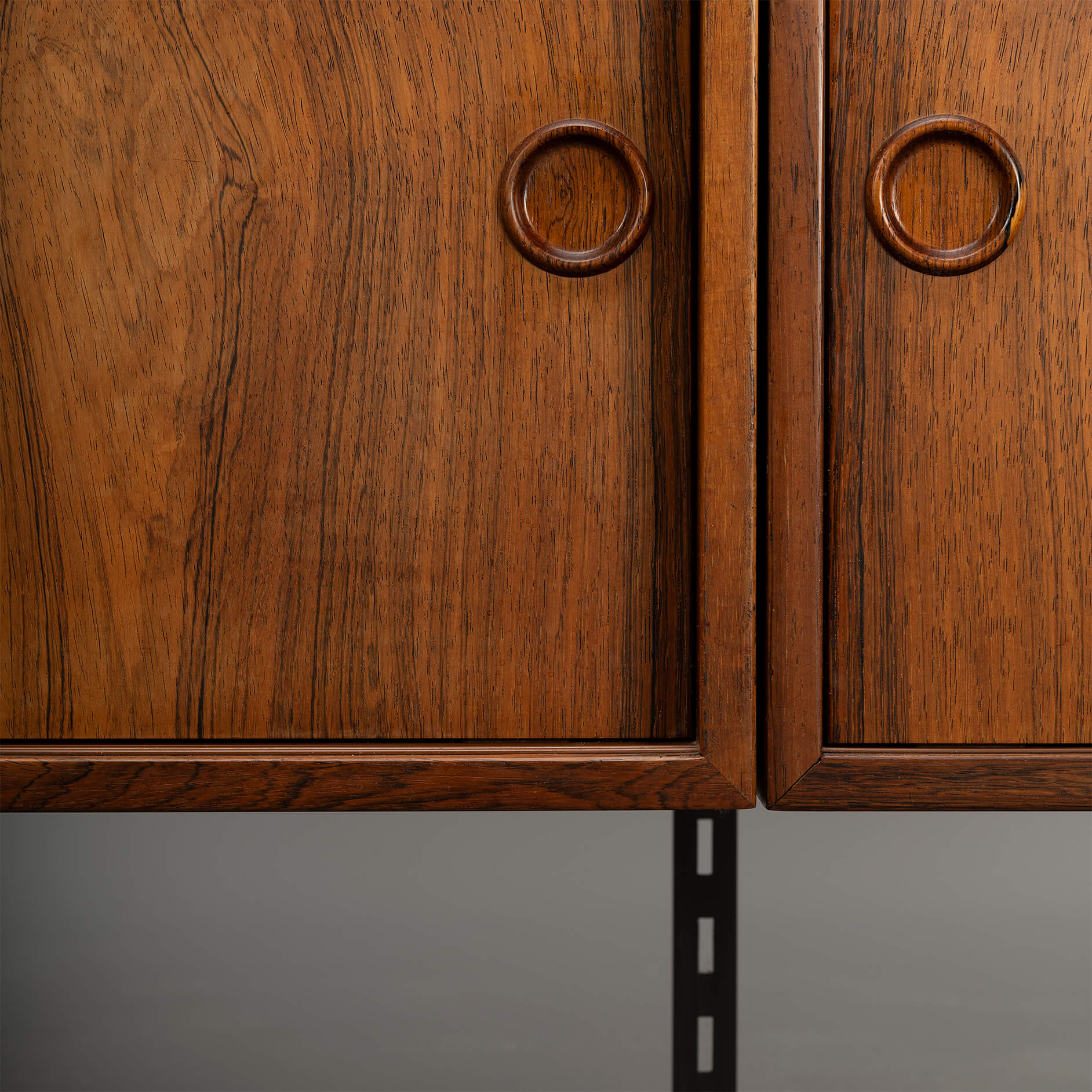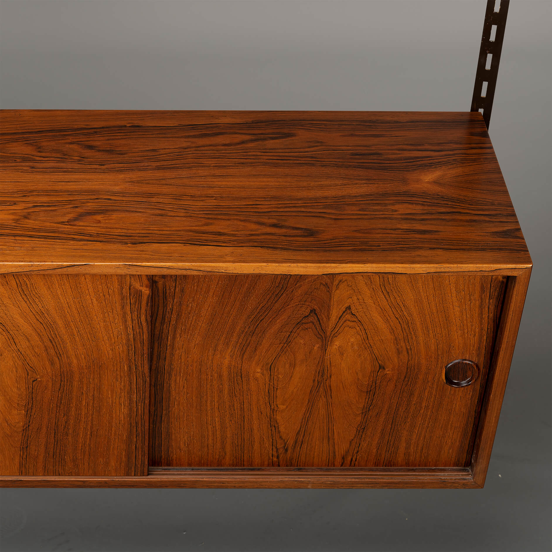This particular rosewood Reolsystem has 3 metal uprights, two cabinets and 6 shelves, with three different sizes. The size of the big shelve is width 85cm and depth 28 cm. Also one shelf width 85cm and depth 24cm. And 4 smaller shelves width 85cm and depth 18cm.