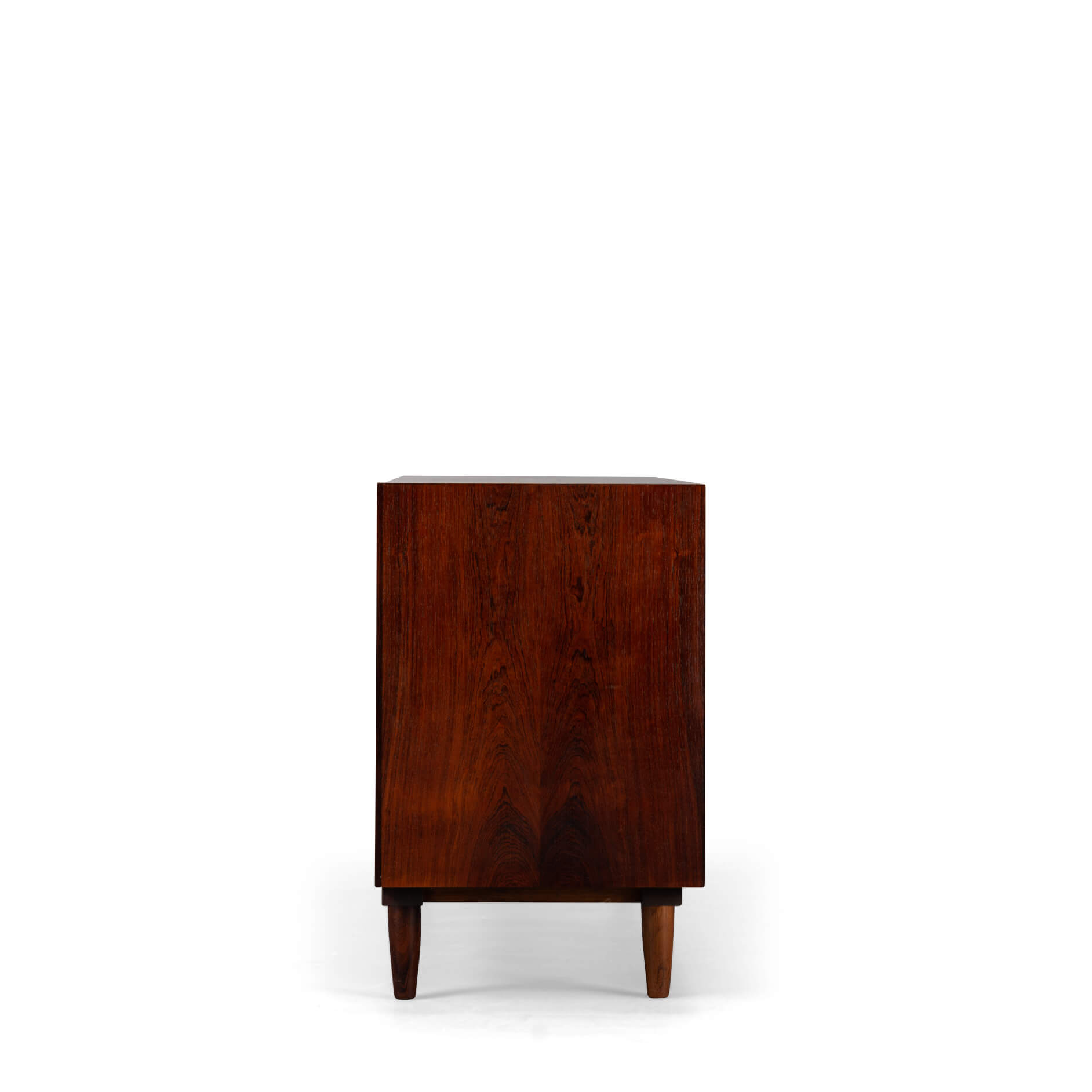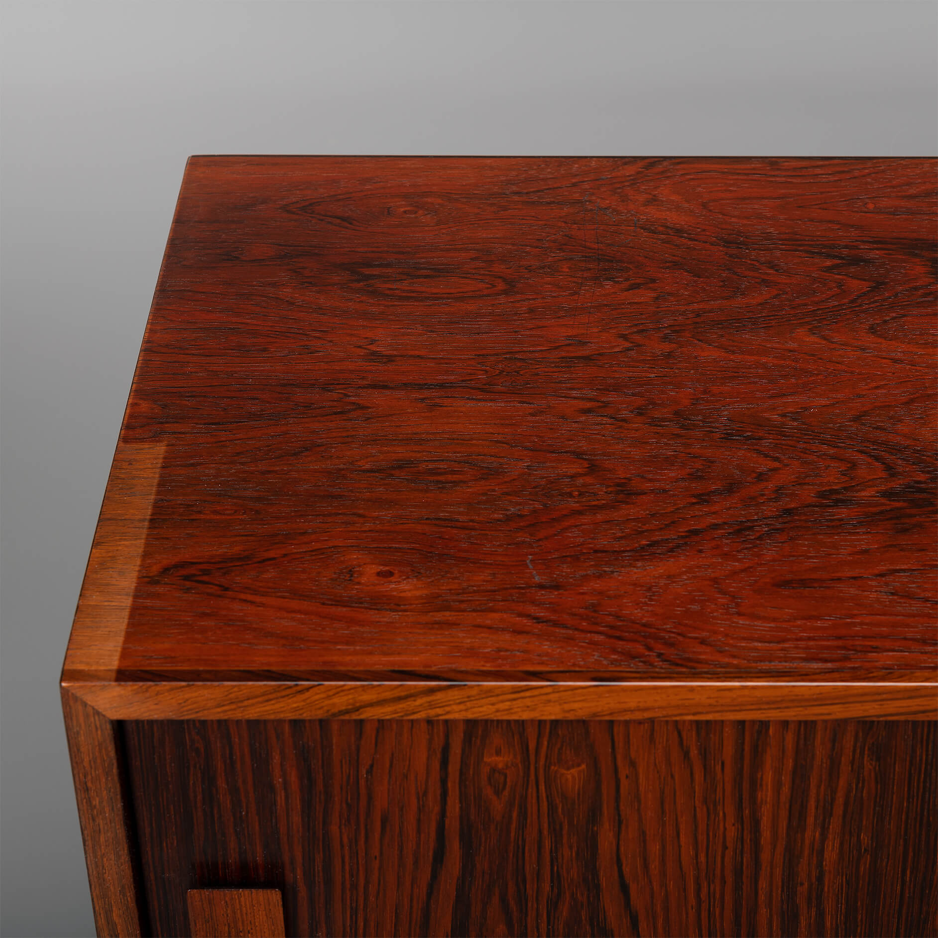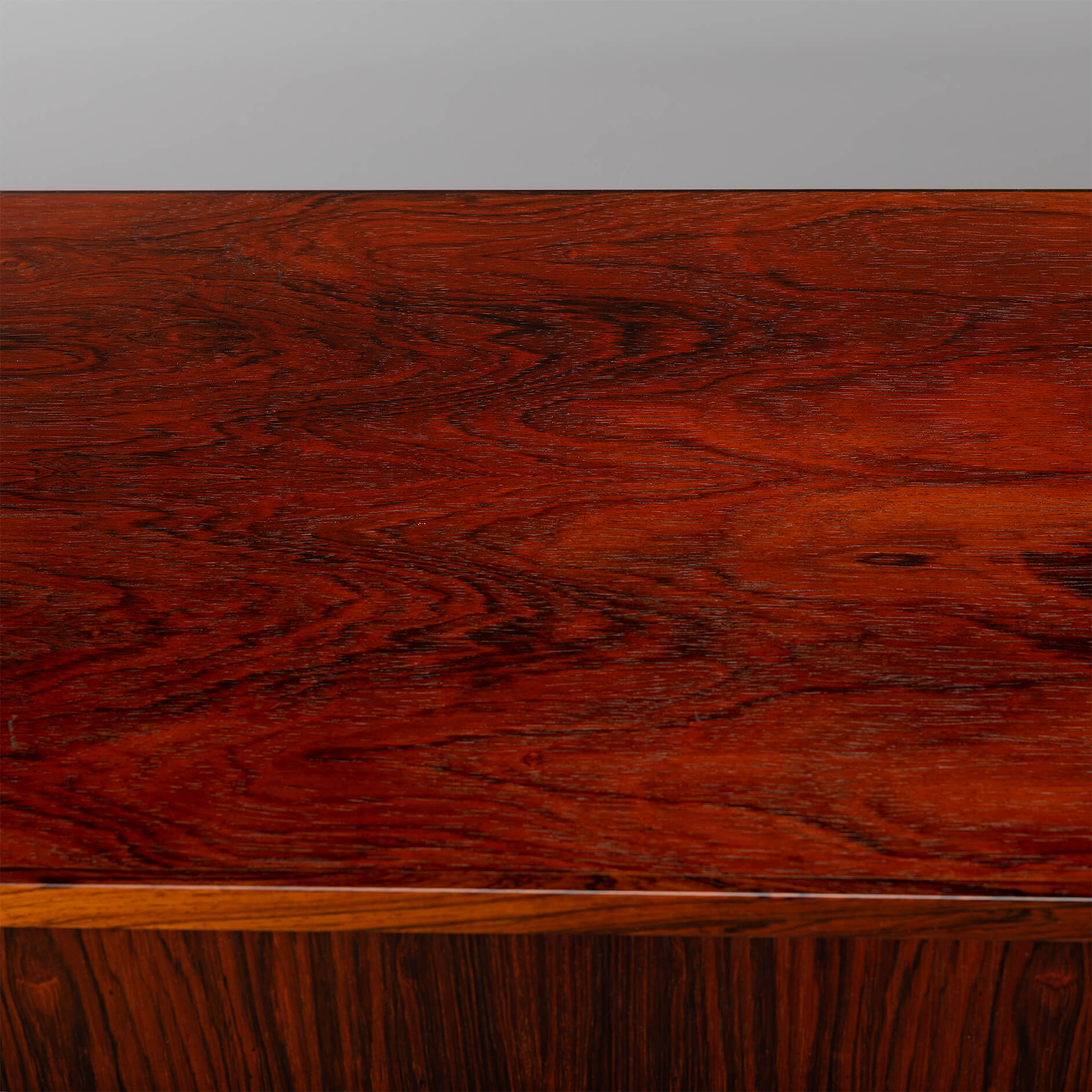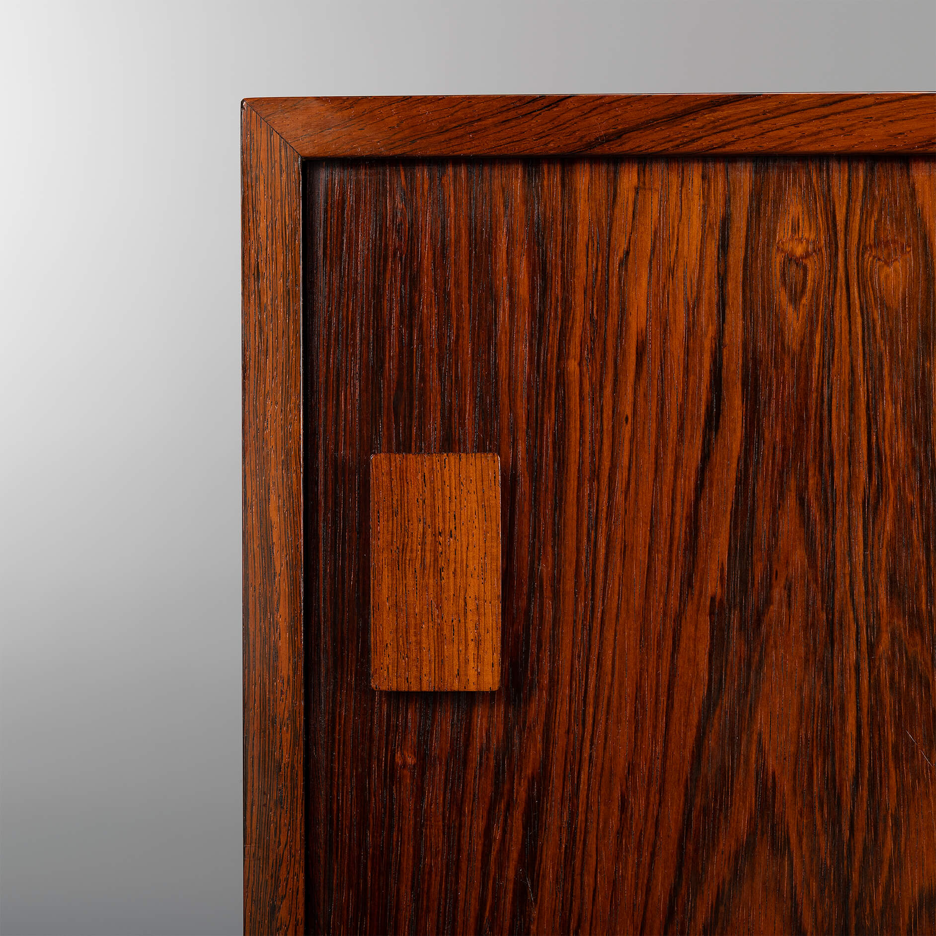 It always sparks our happiness when we return with a piece like this from our trips. Ultra slick design, not overdone on detailing and rosewood veneer. Rosewood comes with much more pronounced veining of the wood than teak. Some areas are almost black and provides for a dark and mysterious vibe of this small credenza. The storage space can be divided with height-adjustable shelves. Rectangular facet-sawn handles give the cabinet a sleek and functional look.