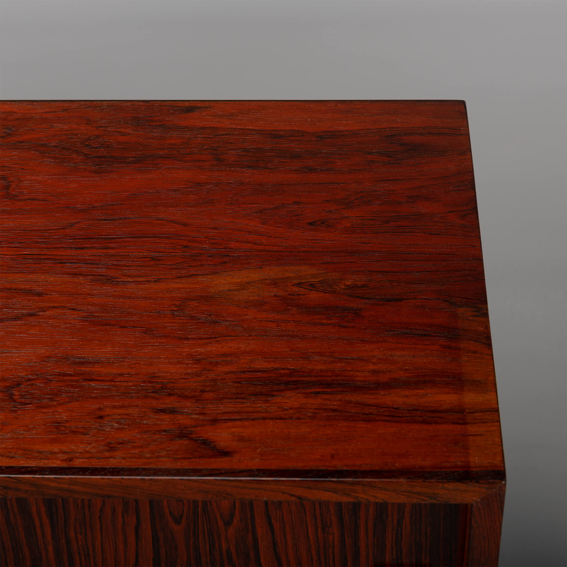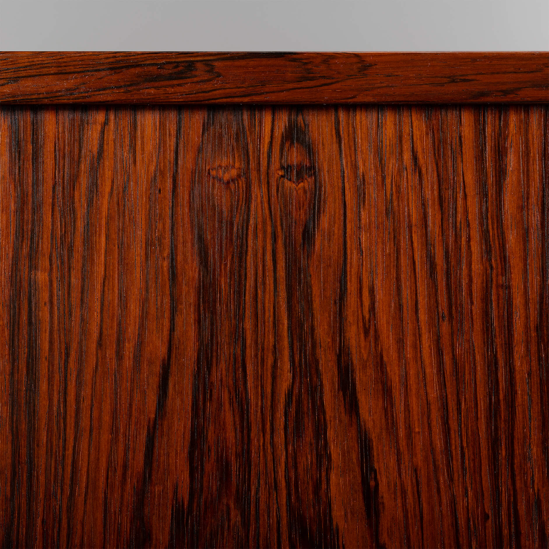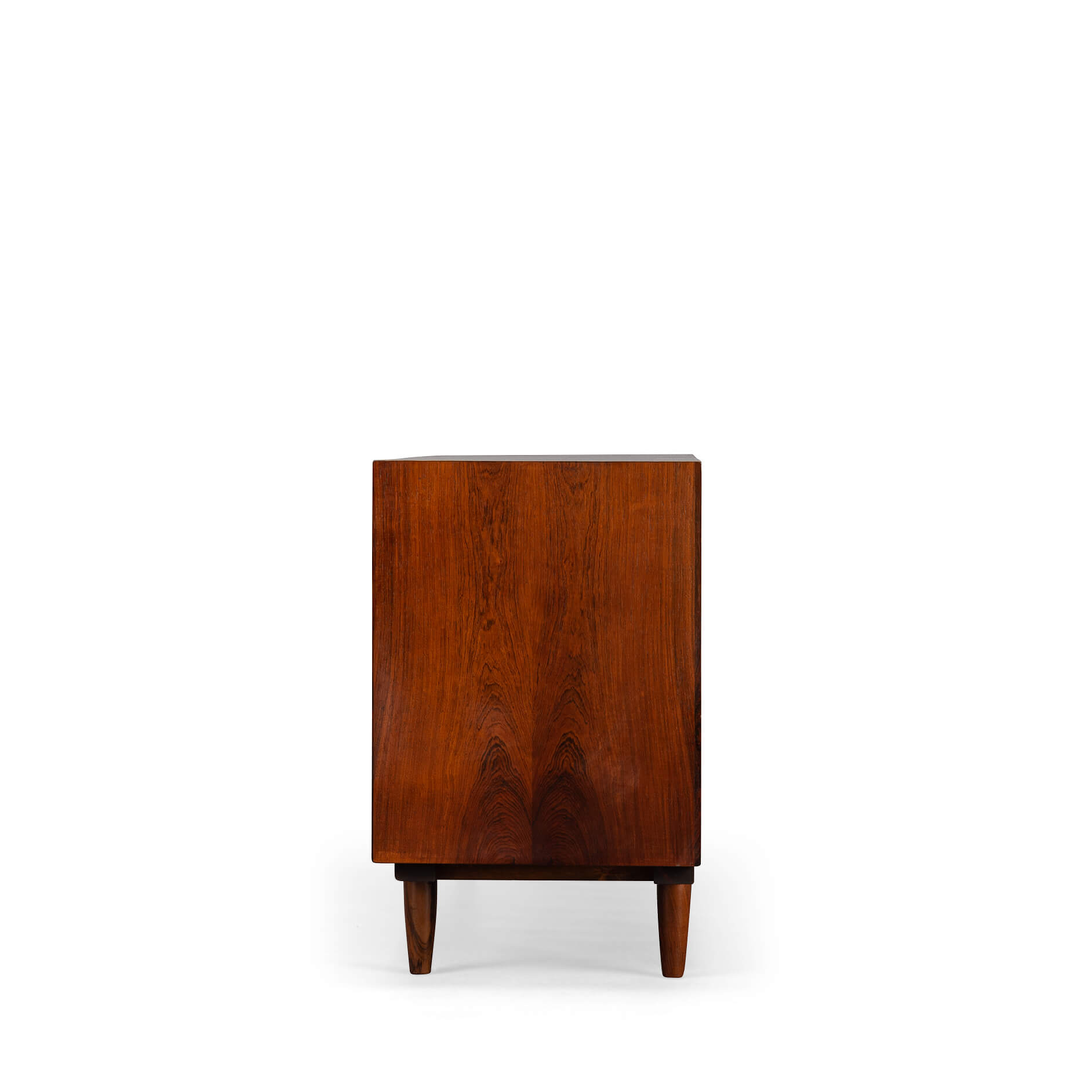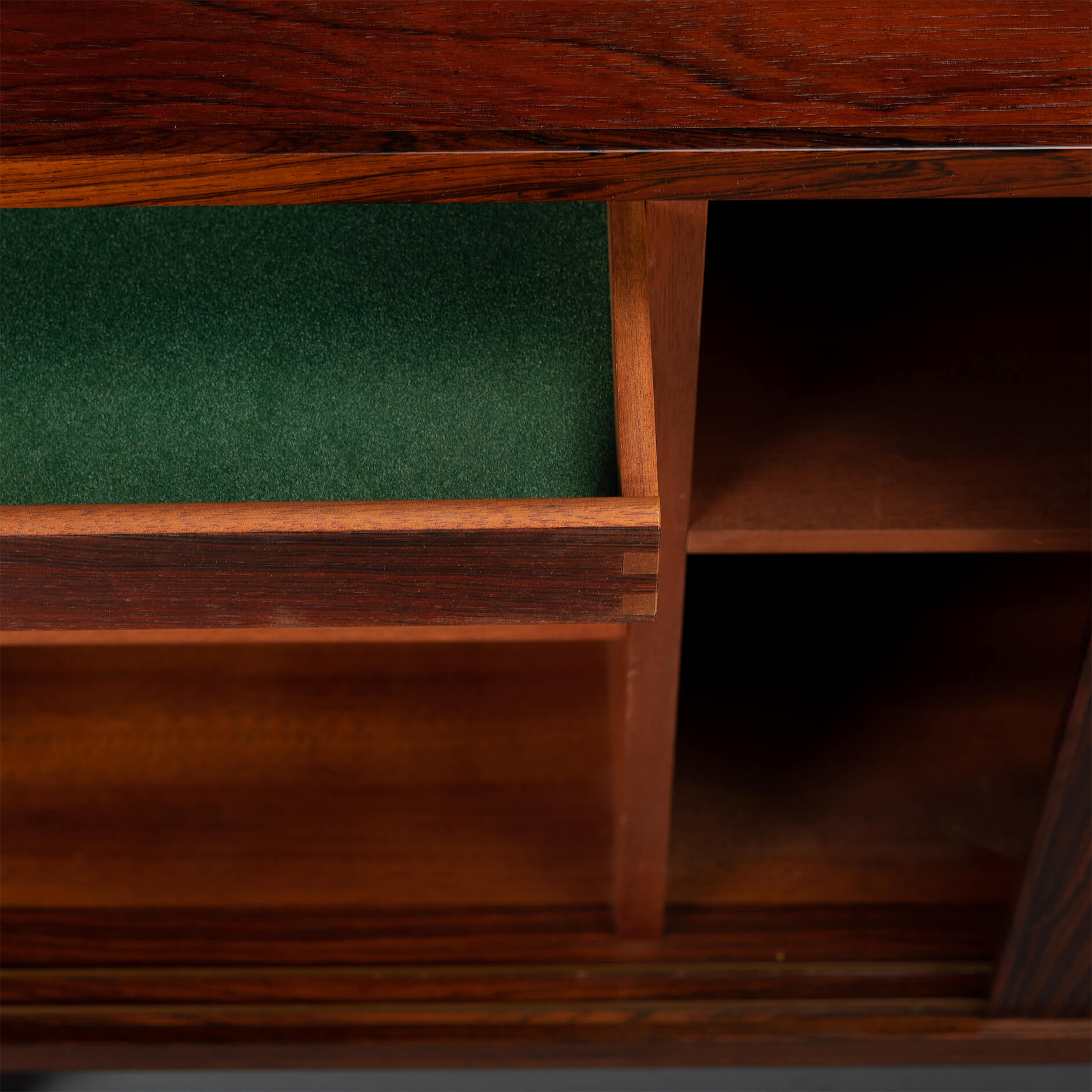 It always sparks our happiness when we return with a piece like this from our trips. Ultra slick design, not overdone on detailing and rosewood veneer. Rosewood comes with much more pronounced veining of the wood than teak. Some areas are almost black and provides for a dark and mysterious vibe of this small credenza. The storage space can be divided with height-adjustable shelves. Rectangular facet-sawn handles give the cabinet a sleek and functional look.