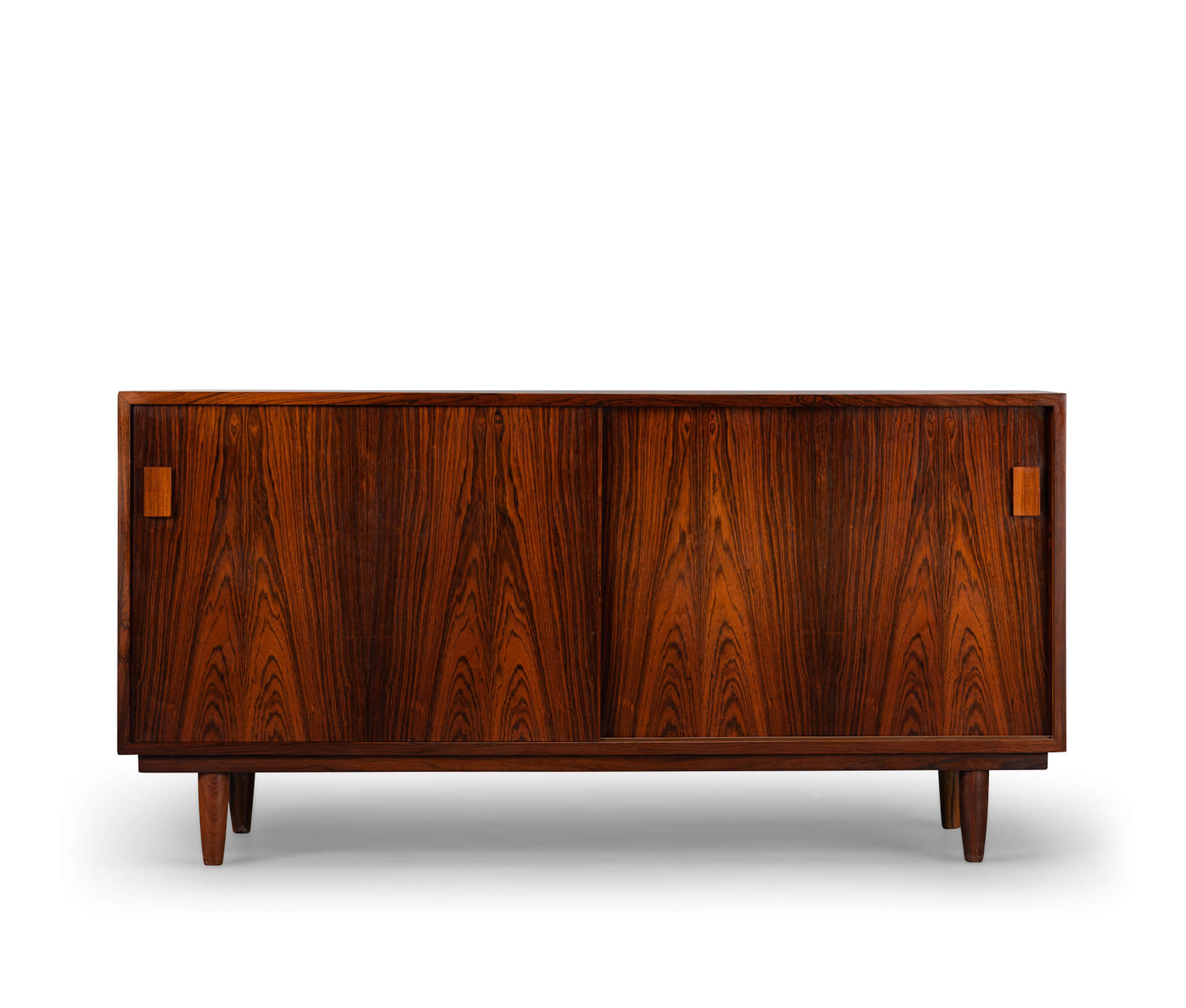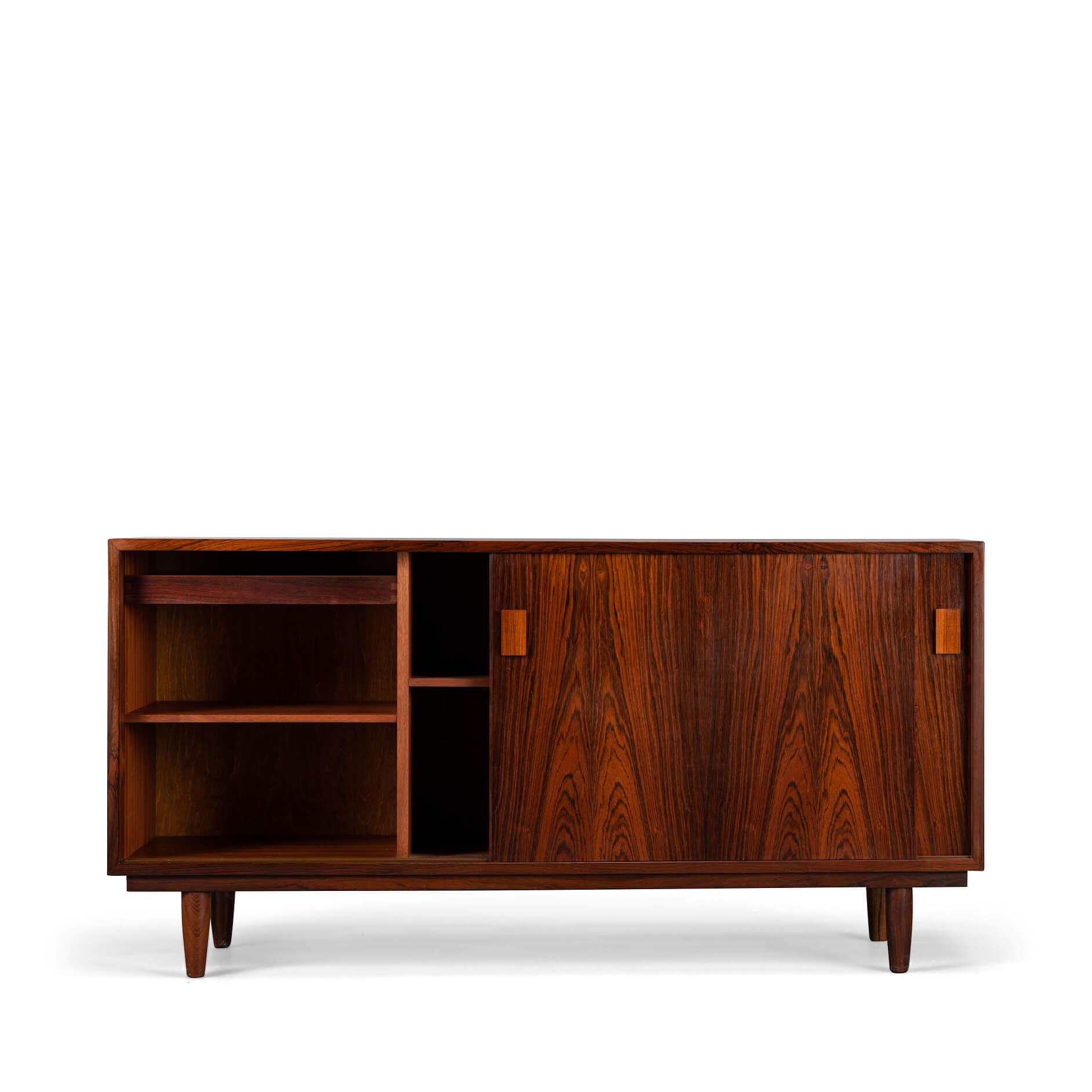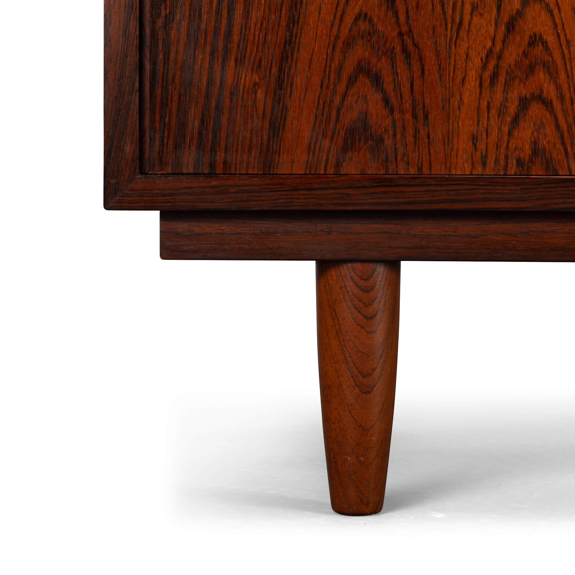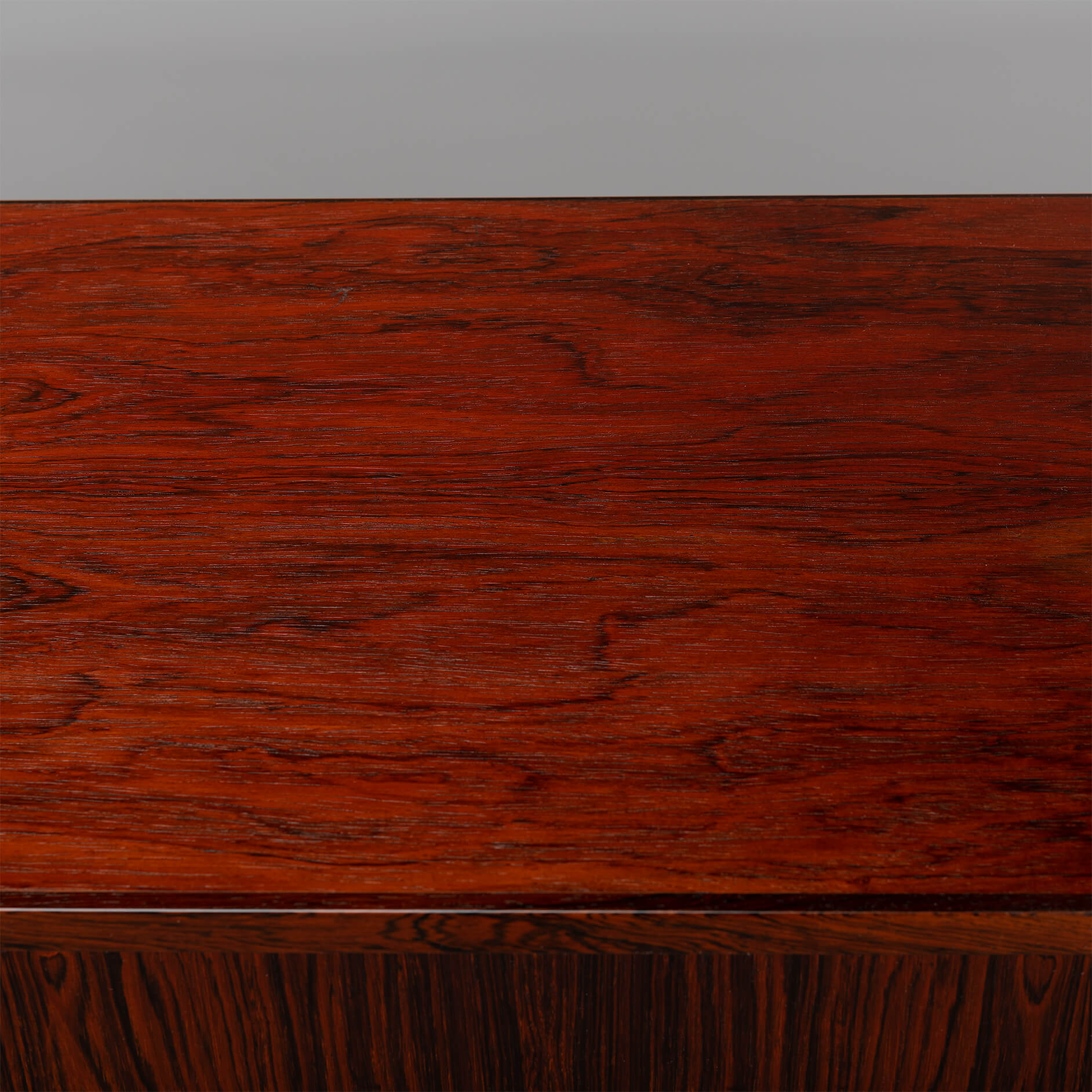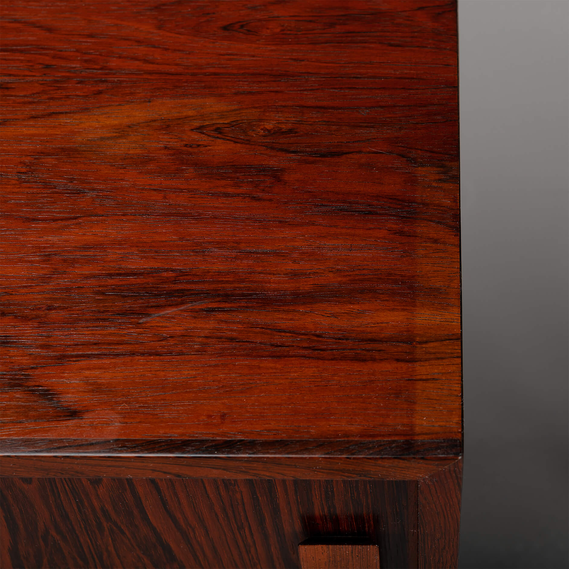 It always sparks our happiness when we return with a piece like this from our trips. Ultra slick design, not overdone on detailing and rosewood veneer. Rosewood comes with much more pronounced veining of the wood than teak. Some areas are almost black and provides for a dark and mysterious vibe of this small credenza. The storage space can be divided with height-adjustable shelves. Rectangular facet-sawn handles give the cabinet a sleek and functional look.