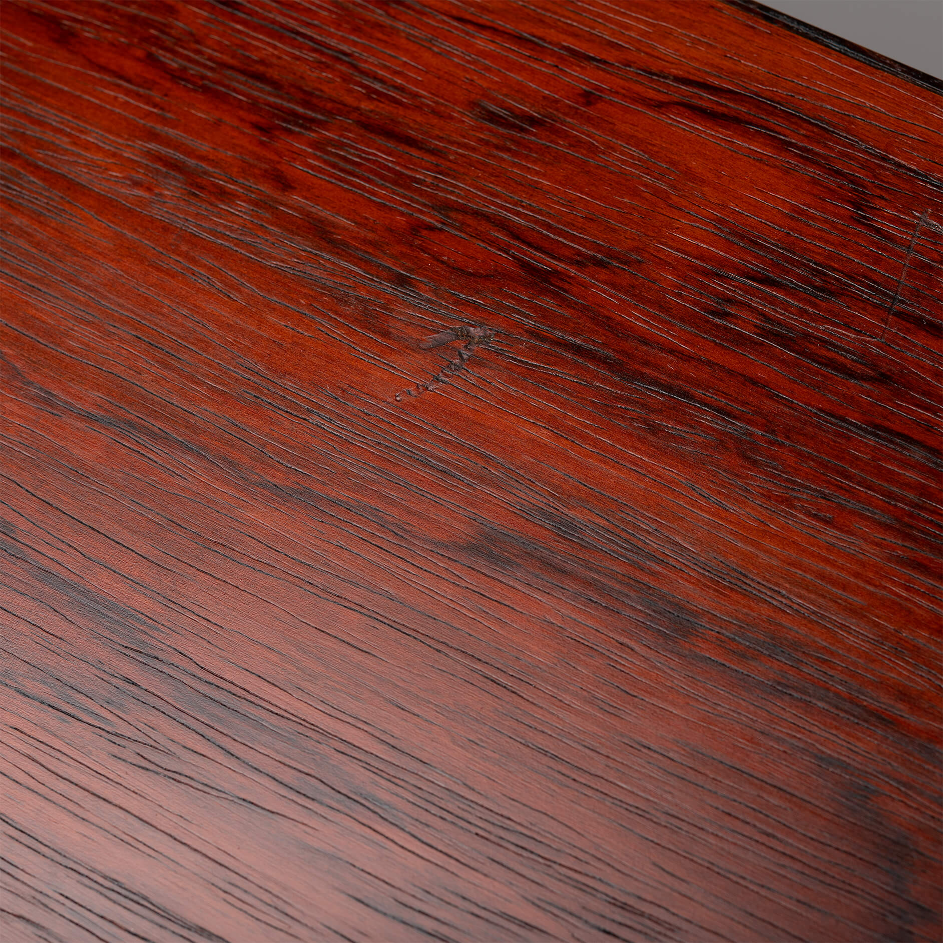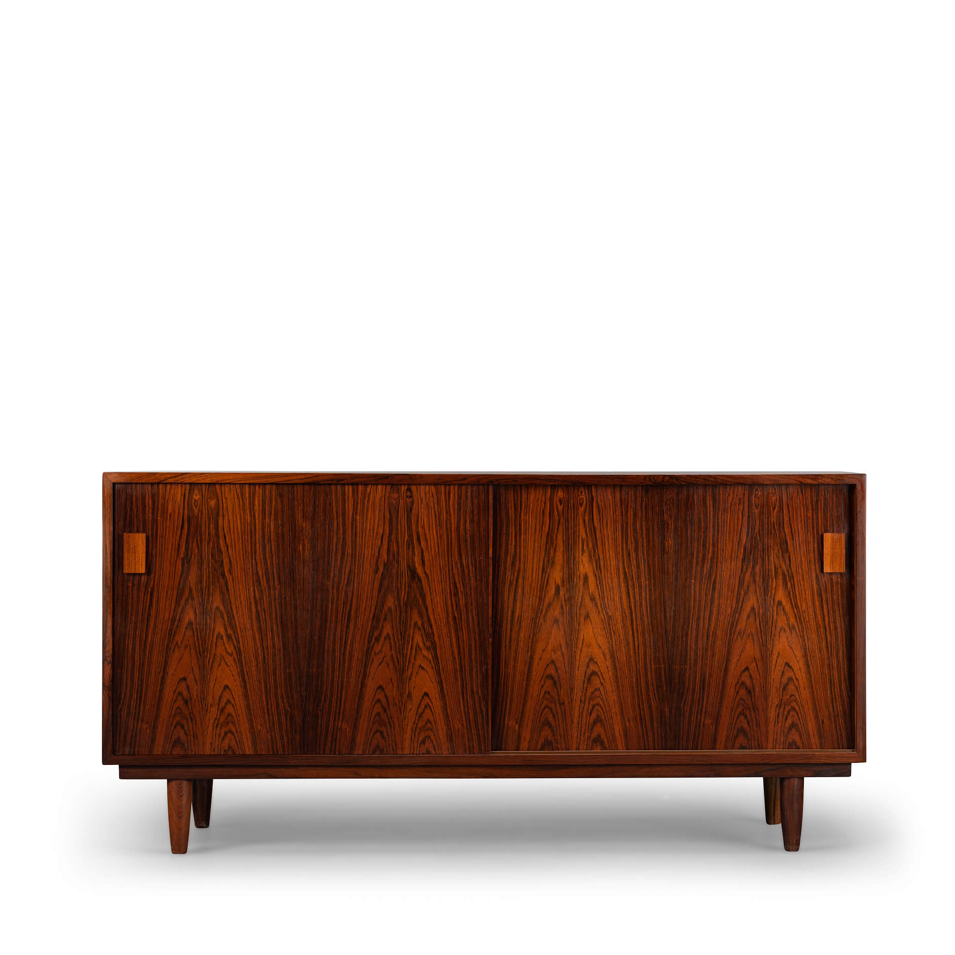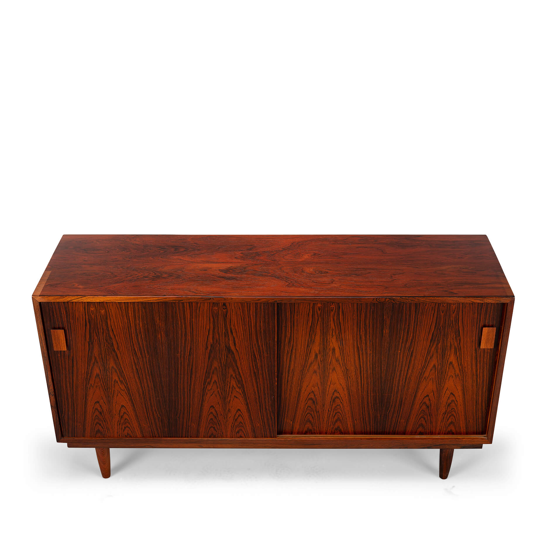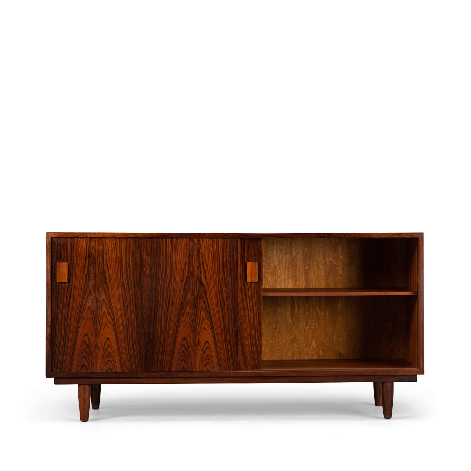 It always sparks our happiness when we return with a piece like this from our trips. Ultra slick design, not overdone on detailing and rosewood veneer. Rosewood comes with much more pronounced veining of the wood than teak. Some areas are almost black and provides for a dark and mysterious vibe of this small credenza. The storage space can be divided with height-adjustable shelves. Rectangular facet-sawn handles give the cabinet a sleek and functional look.