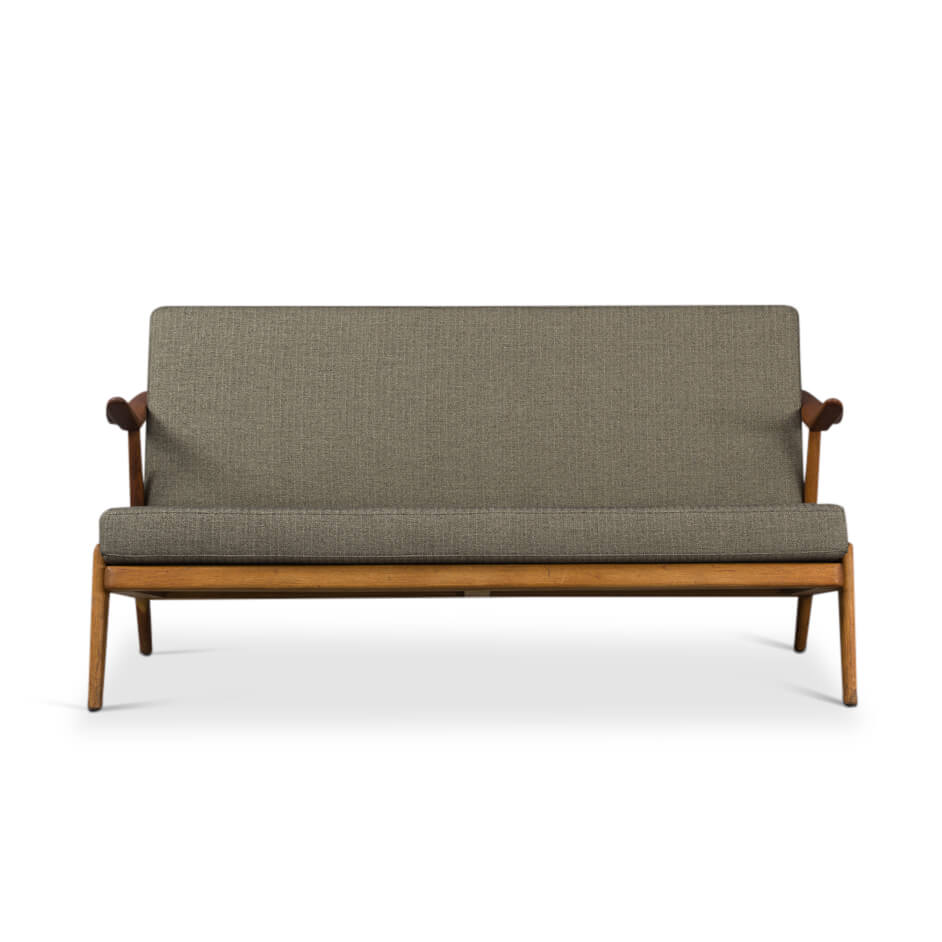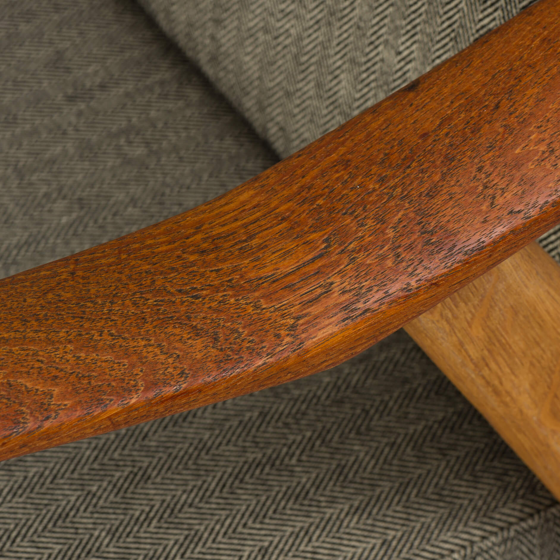A truly remarkable sofa and lounge seat designed by H. Brockmann Pedersen in the mid 50s for Komfort. The set has a powerful appearance with the upward facing armrests made out of solid teak. Rest of the frame comprises solid oak and its lighter sap wood.