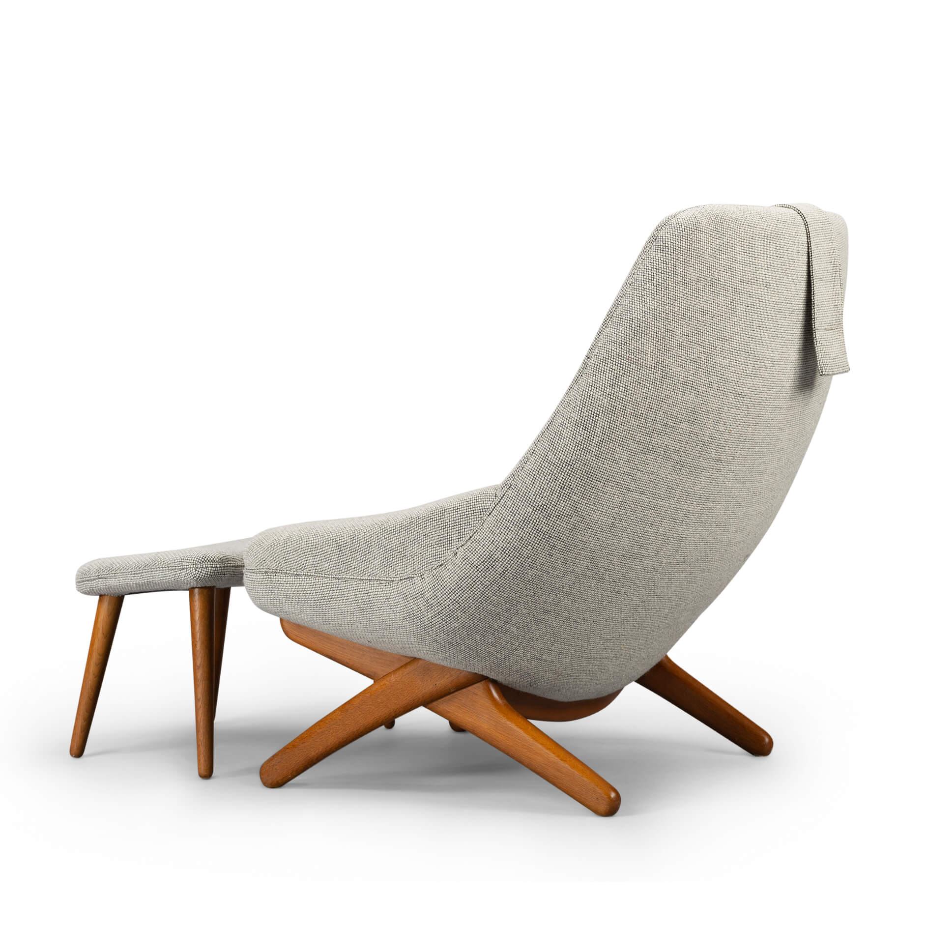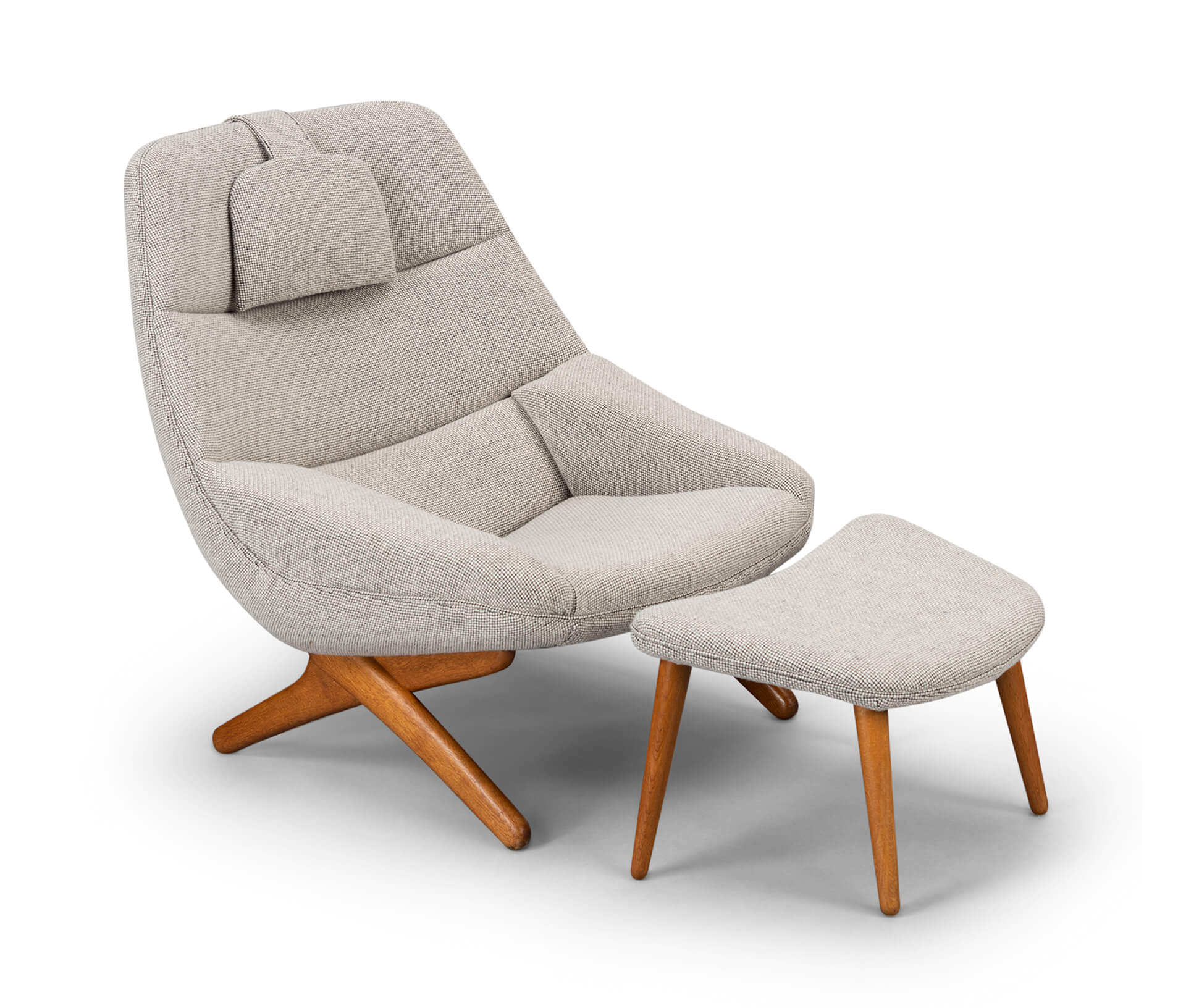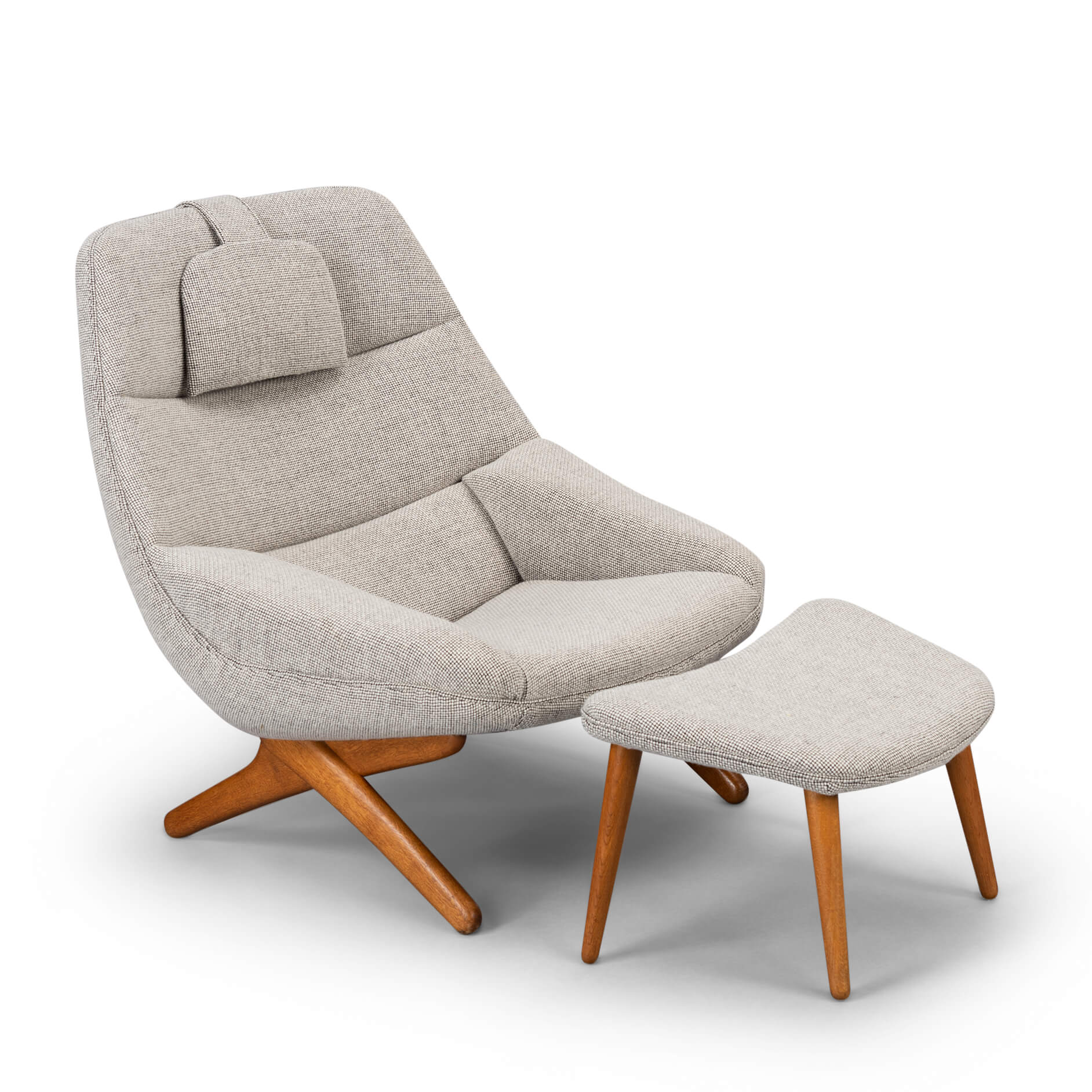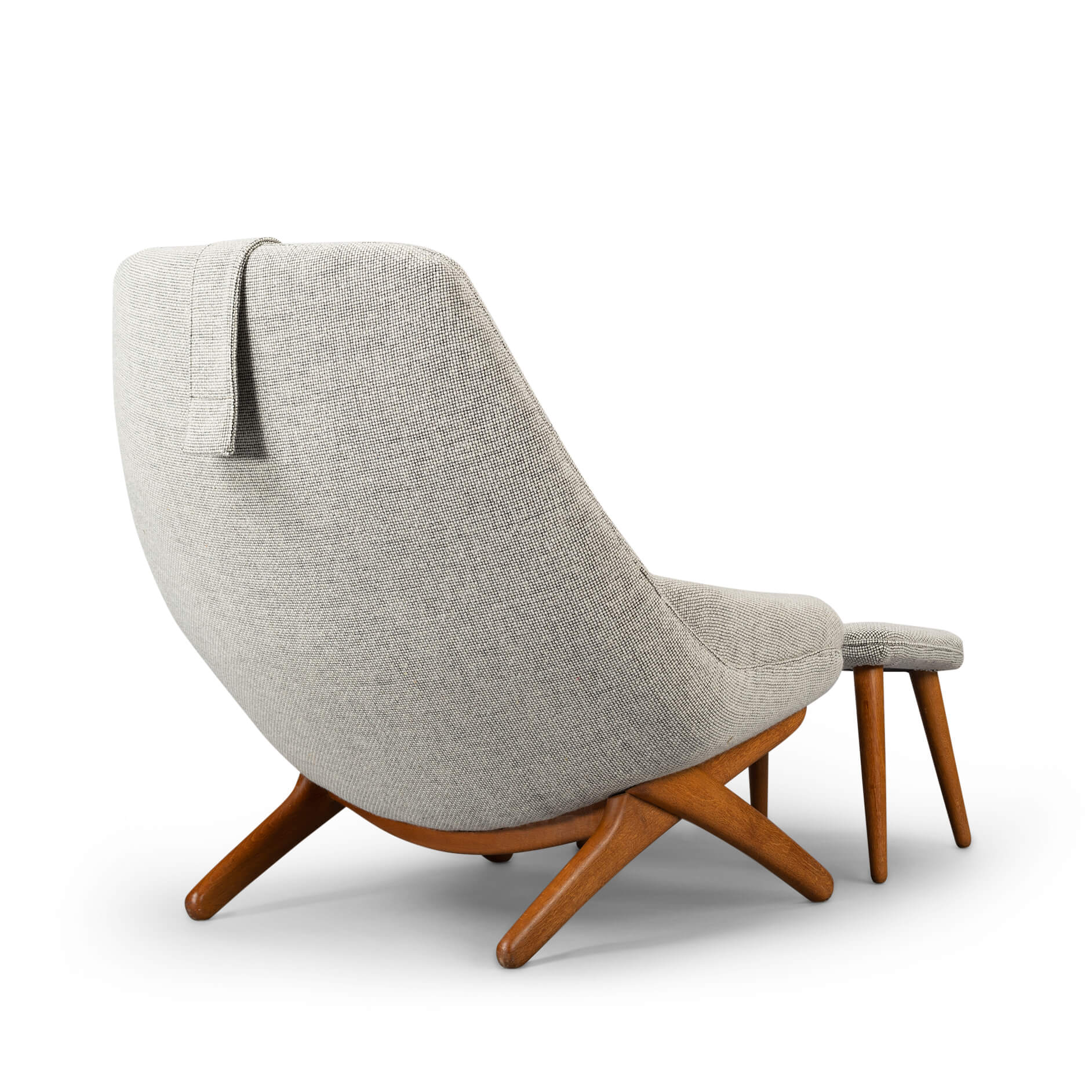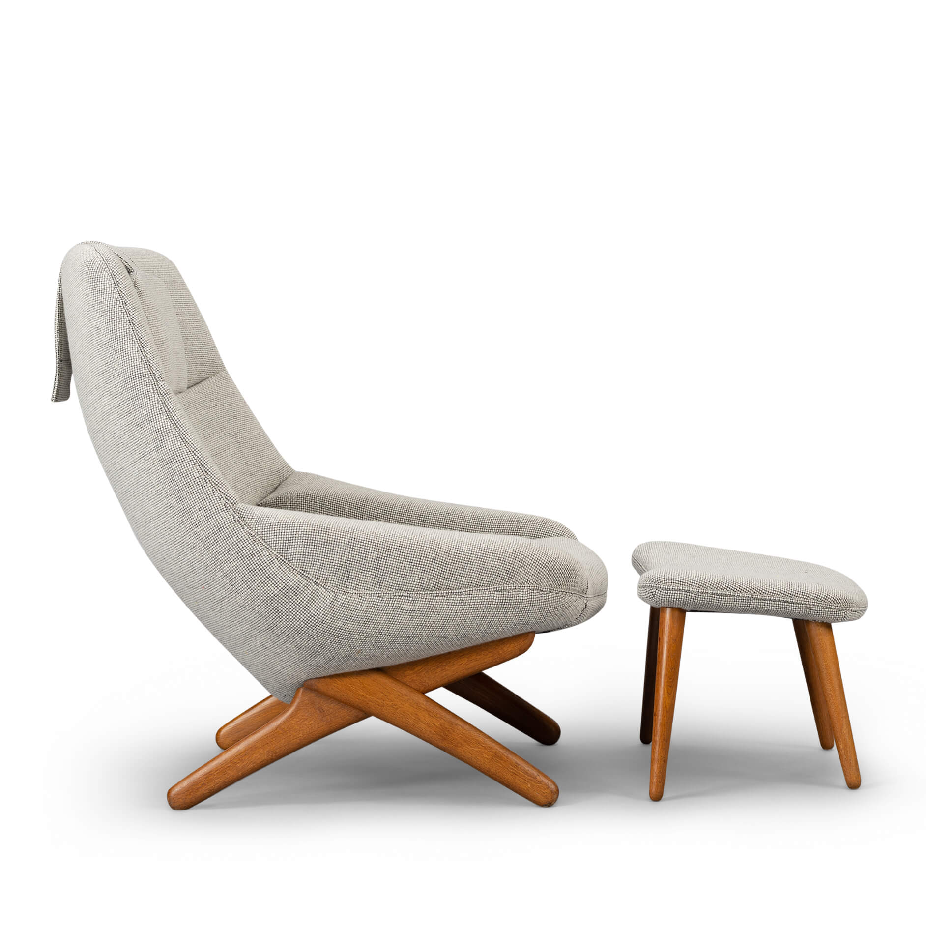Clearly recognisable as a Illum Wikkelsø design is this comfortable ML-91 easy chair. This chair was made mid sixties by the Michael Laursen factory. A fairly unconventional design with crossed solid teak legs that support the back what makes it really edgy. This lounge chair has been reupholstered by a professional reupholsterer in a quality wool from de Ploeg, Andes KL.08, with all fabric knit lines kept same as Wikkelsø's design intended it. The Andes KL.08 is a 100% wool with a wear resistance of 45000 rounds Martindale. This easy chair with ottoman is in an excellent vintage condition.