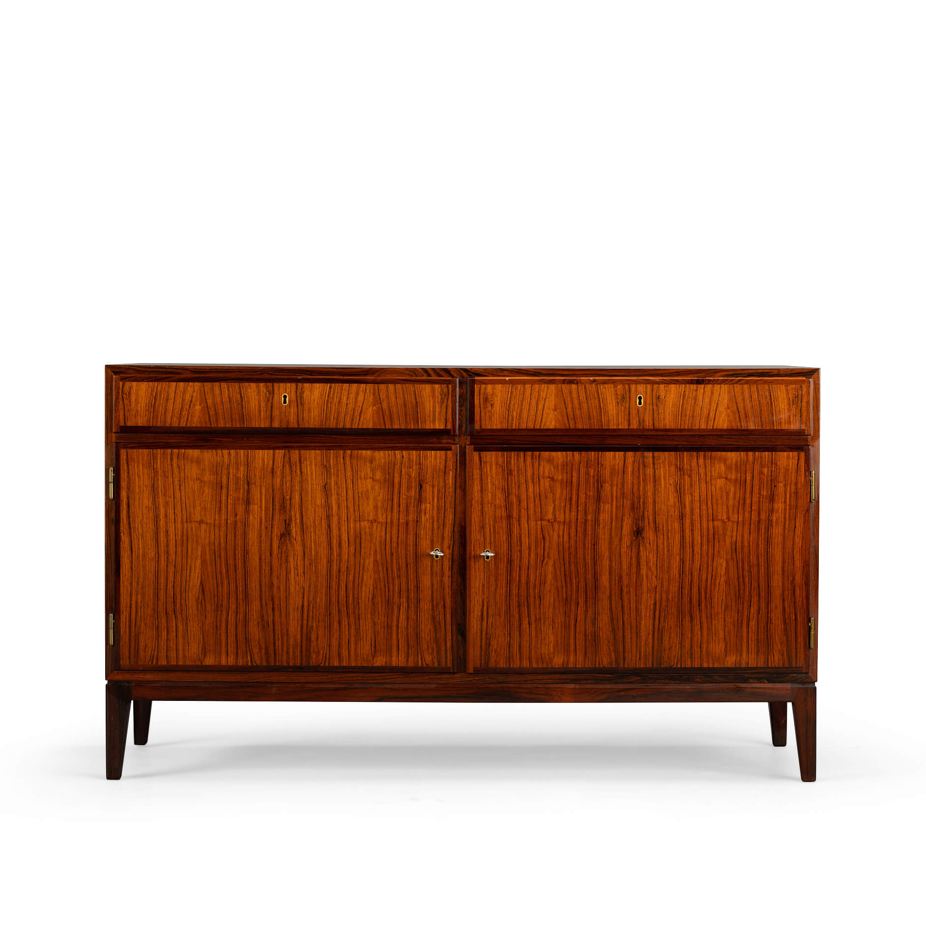 The sideboard is made of a dark-tinted rosewood with a nice symmetrical drawing. The drawing has become more expressive due to sunlight over the years. This masterpiece has the original rare fixed base. Most versions are with screw on round legs. Behind the doors there are two height-adjustable shelves.