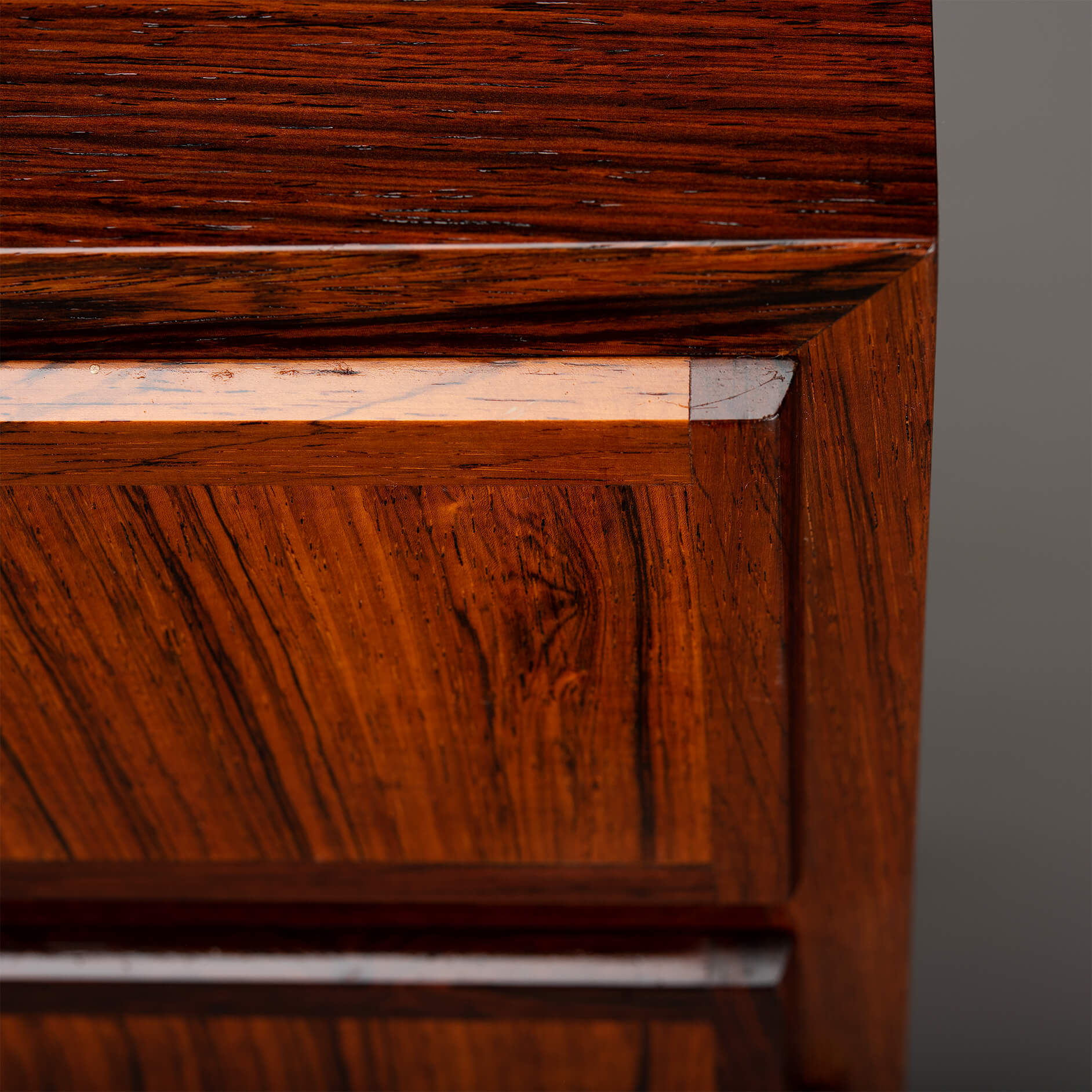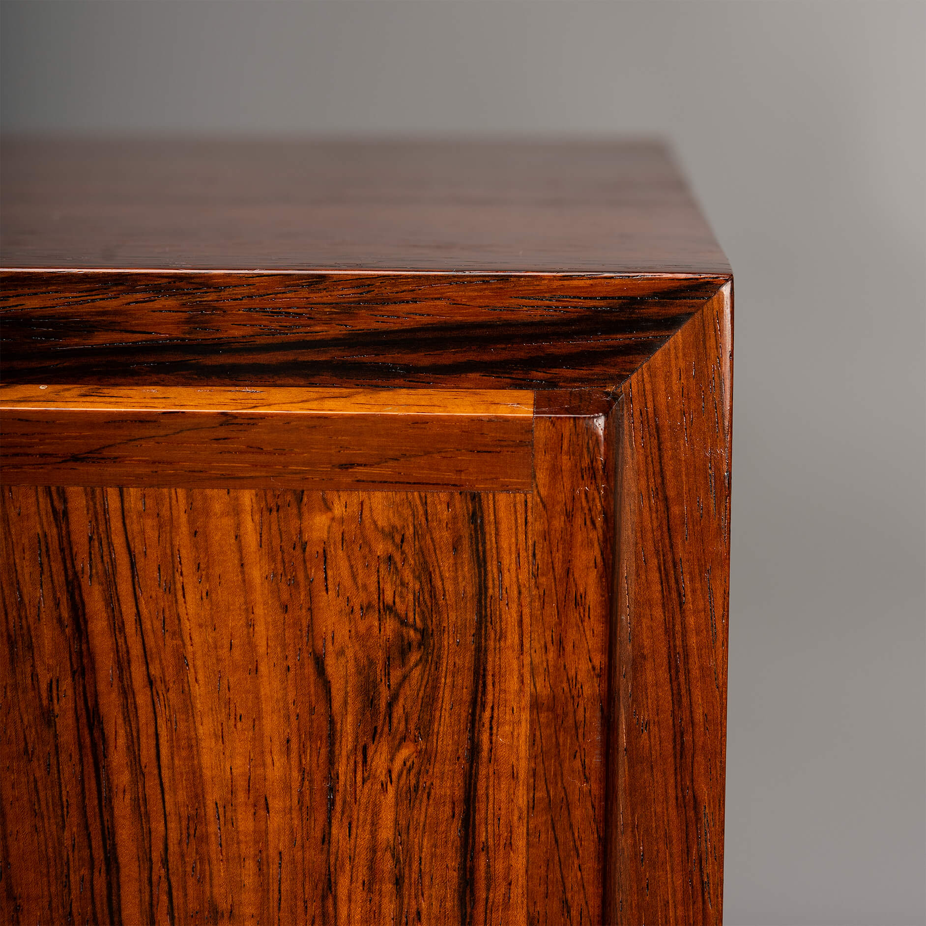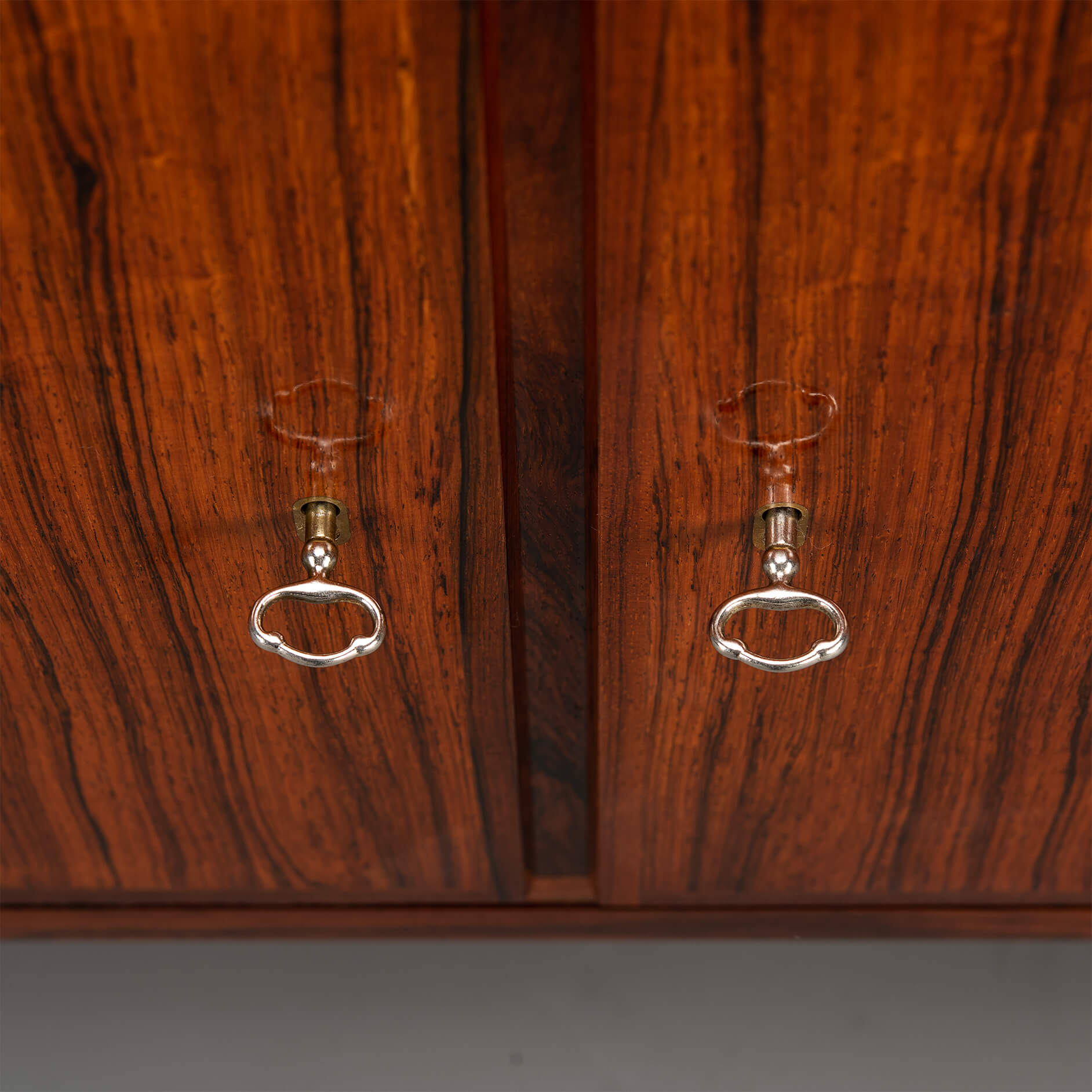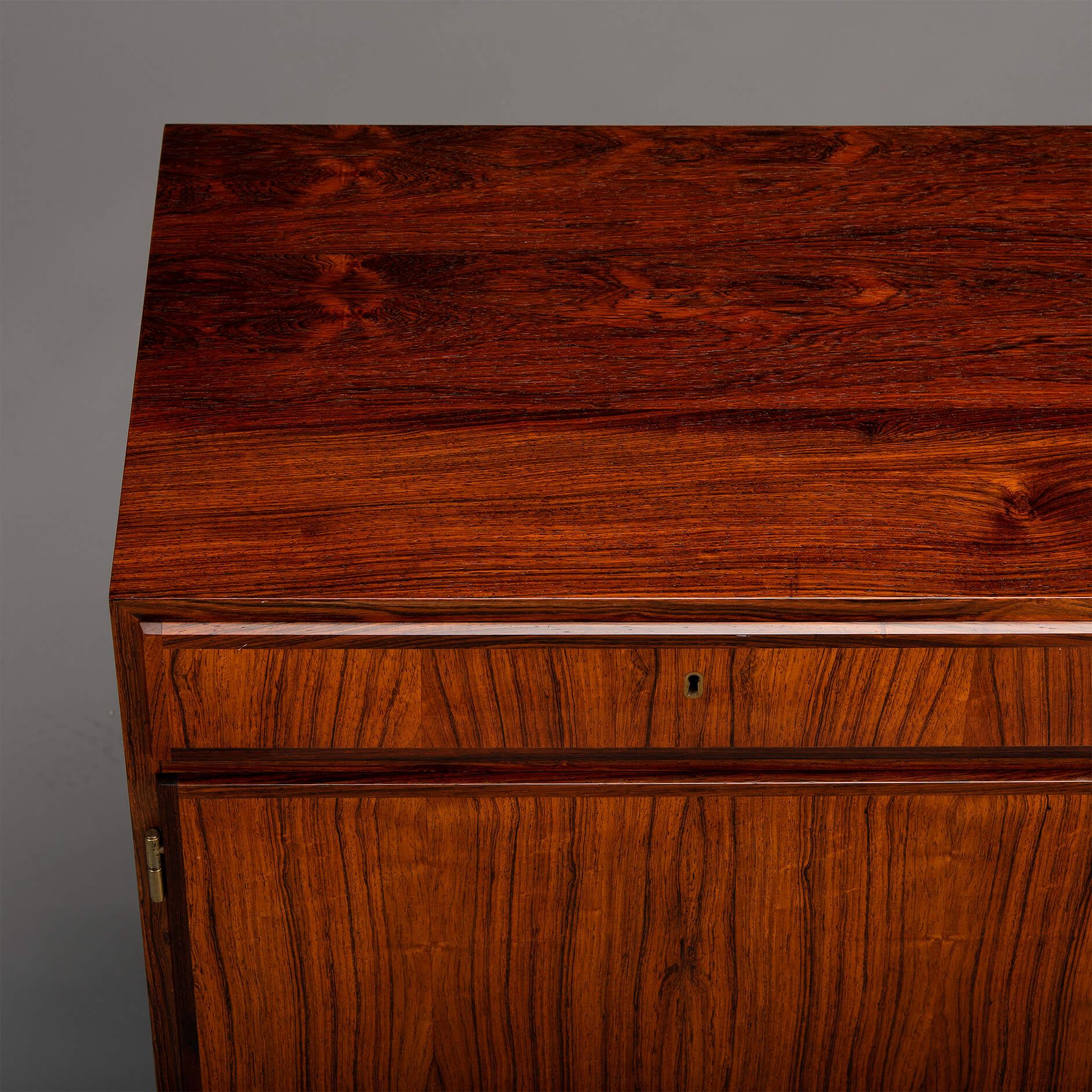 A stylish credenza, this rosewood chest Model No. 5 by Gunni Omann for Omann Jun Møbelfabrik. Superb level of quality and use of high end materials on top of its design make it a full pull. Behind the two doors is an in height adjustable shelve. The two drawers provide for enough additional storage.