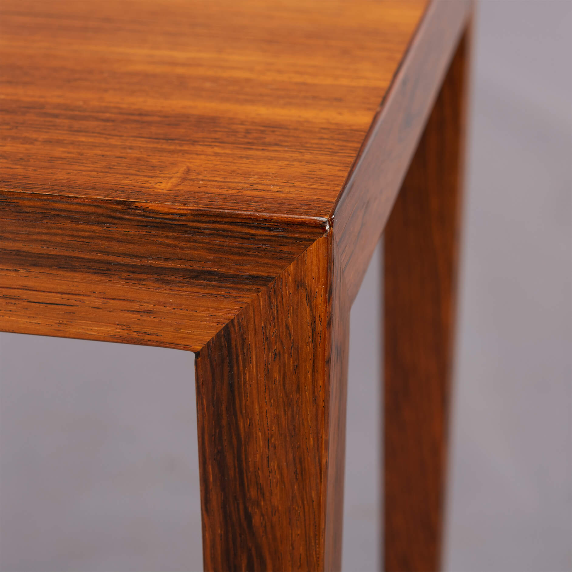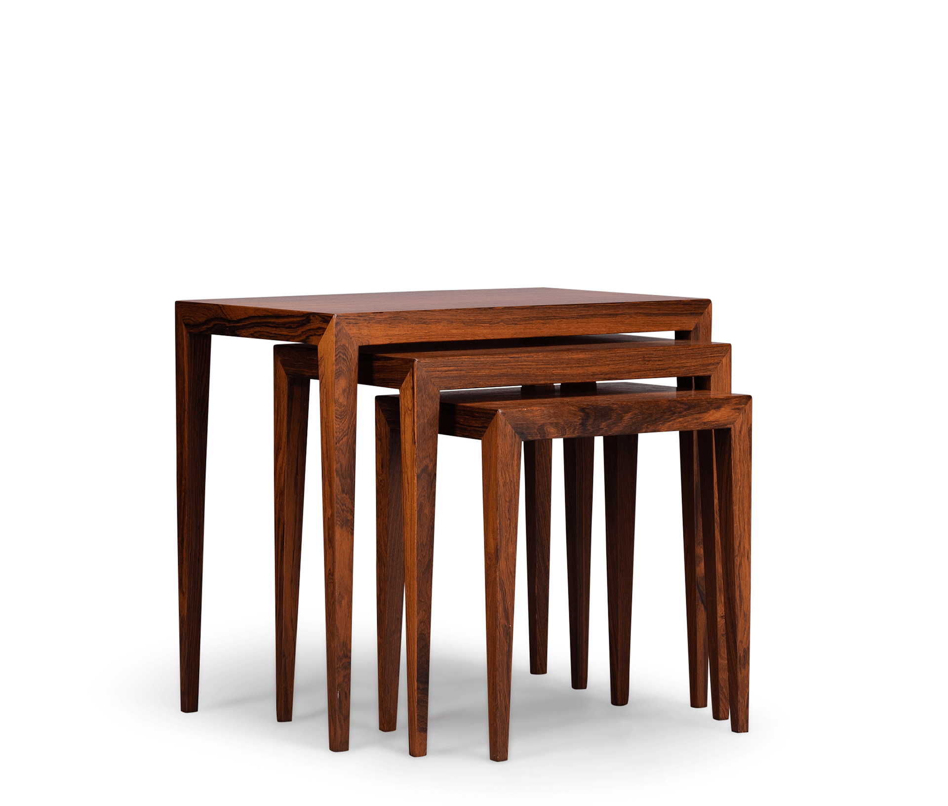 Elegant yet heavy duty set of 3 nesting tables by Severin Hansen. The beautifully cut out of solid rosewood bases give this set a high use quality.