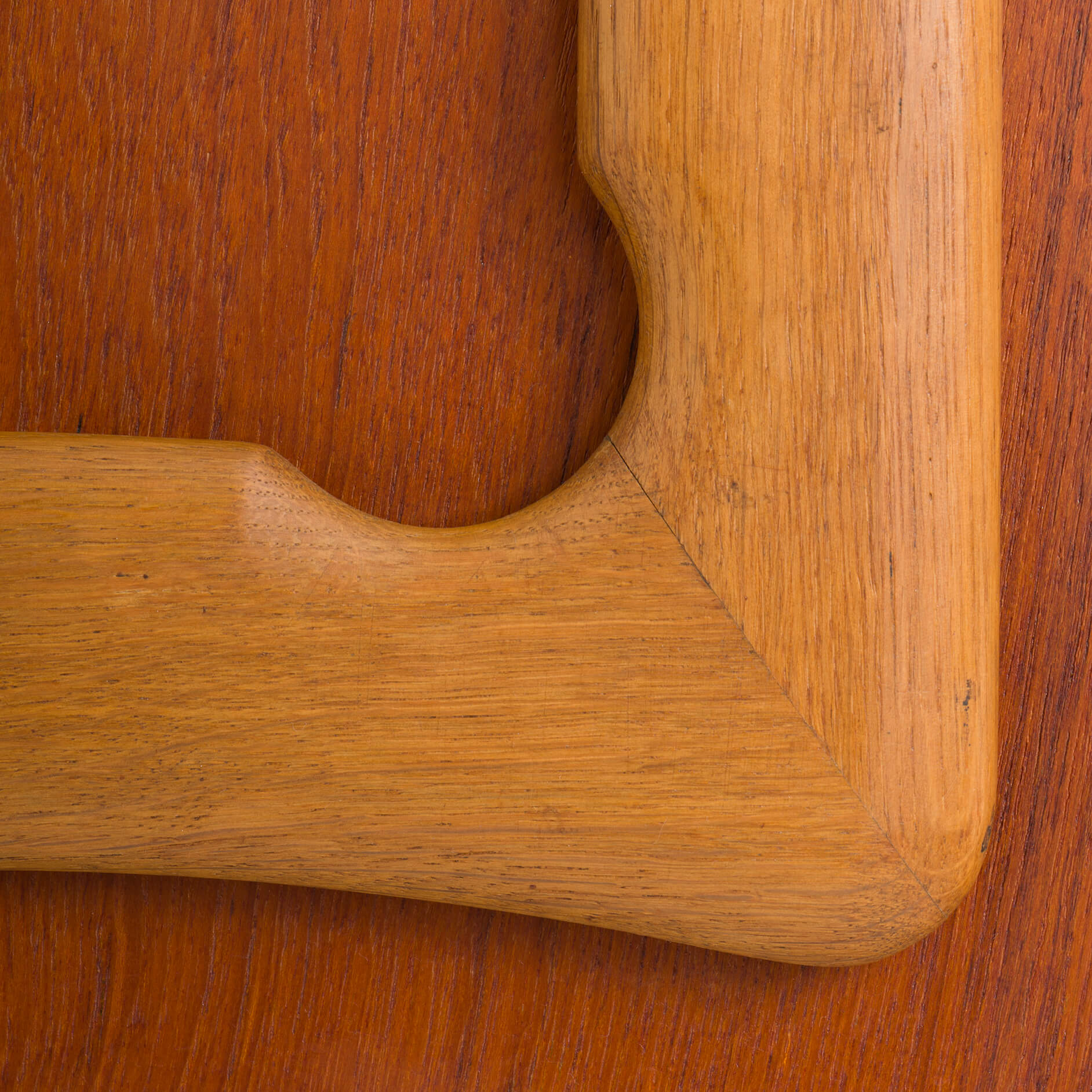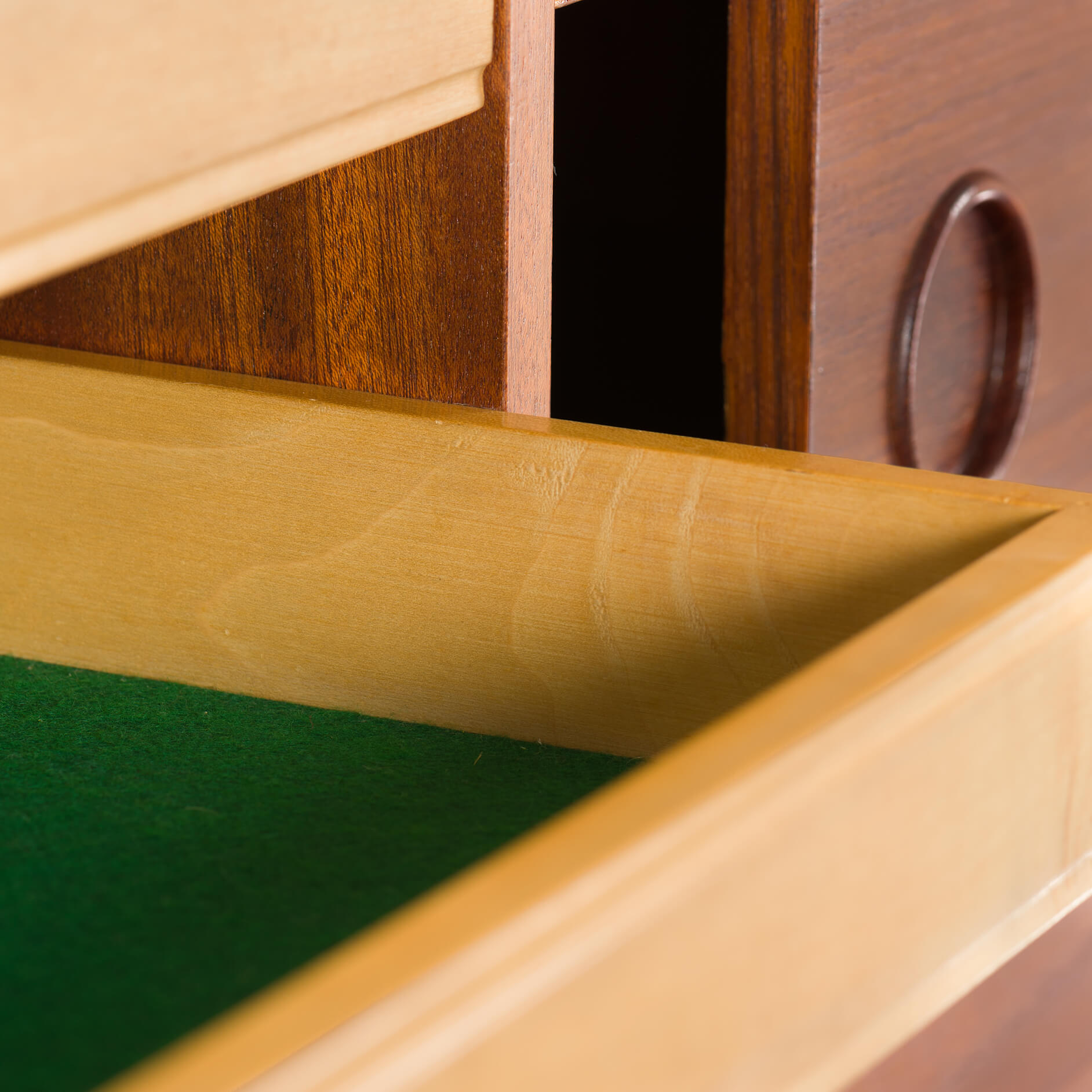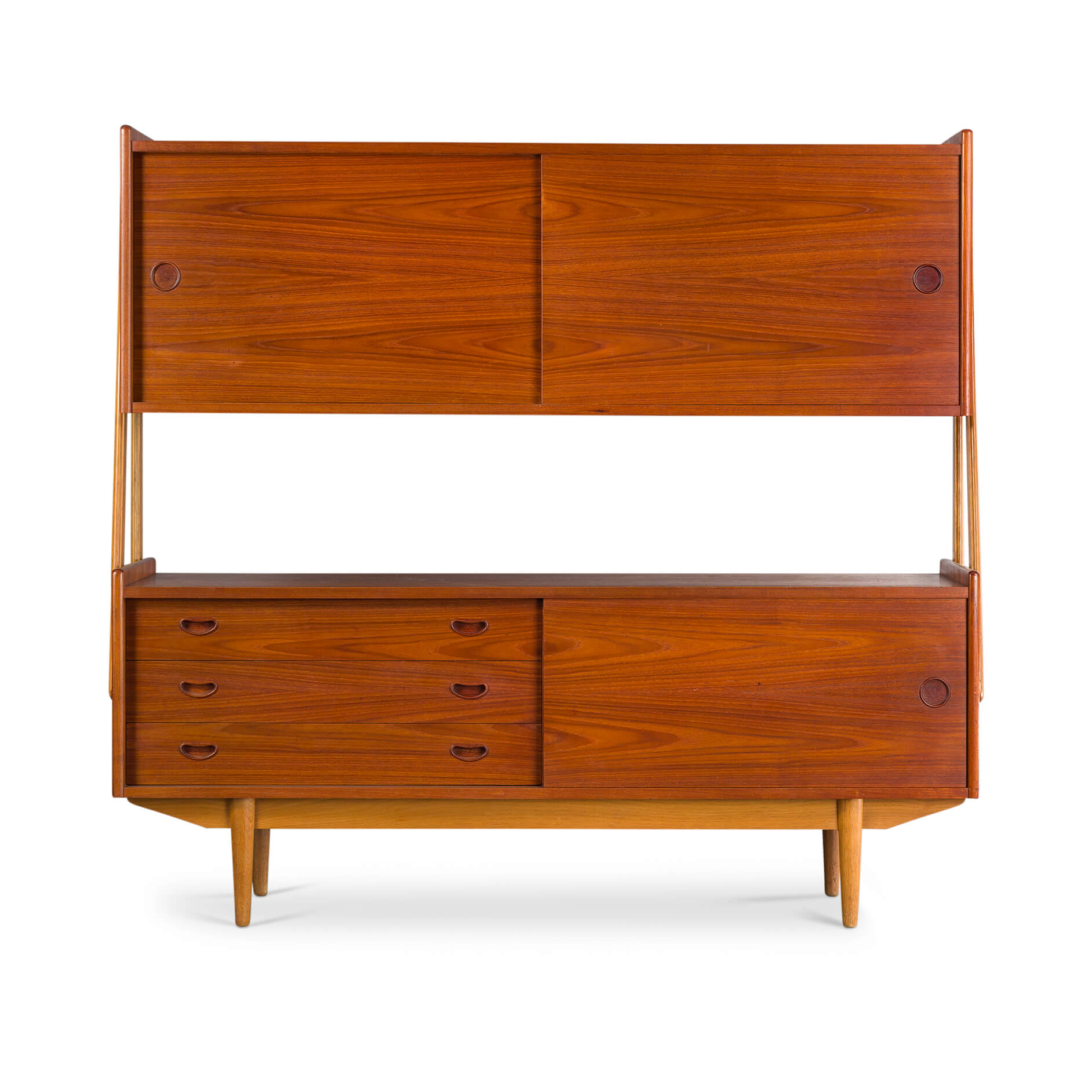 This Danish beauty is constructed out of solid oak and teak veneer. The hutch or upper segment of this split level chest credenza is held up by two pairs of organically shaped solid oak legs manufactured by Skovby Møbler. The teak veneer is placed on top of solid beach wood. This all culminates into a remarkable chest, remarkably heavy also… A design credenza like this one is in the top category of woodworking. This echos on the inside of the cabinet space. The lower part includes 5 drawers made of craftily worked ash wood and covered on the inside with green felt. The other parts have sliding doors and big drawers.