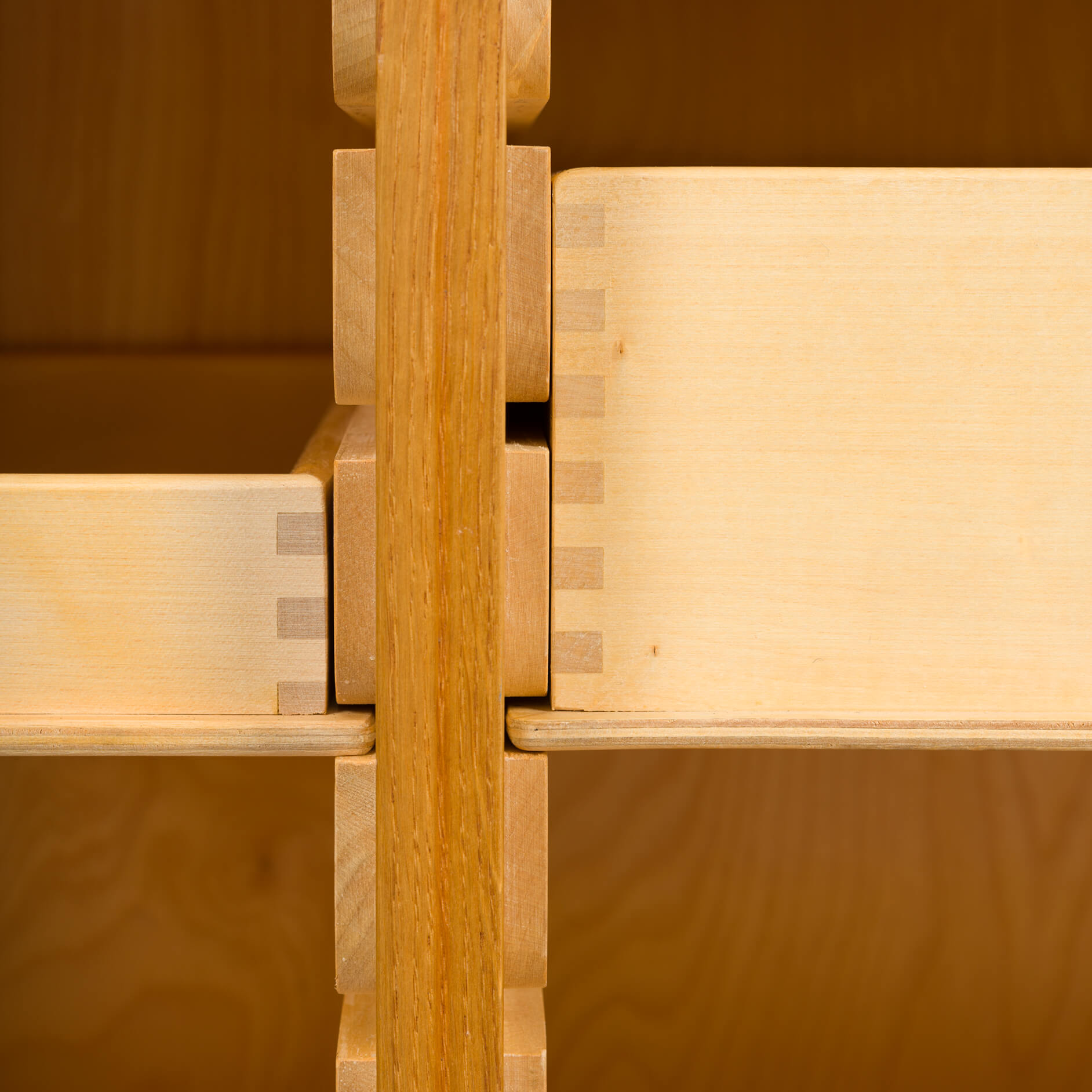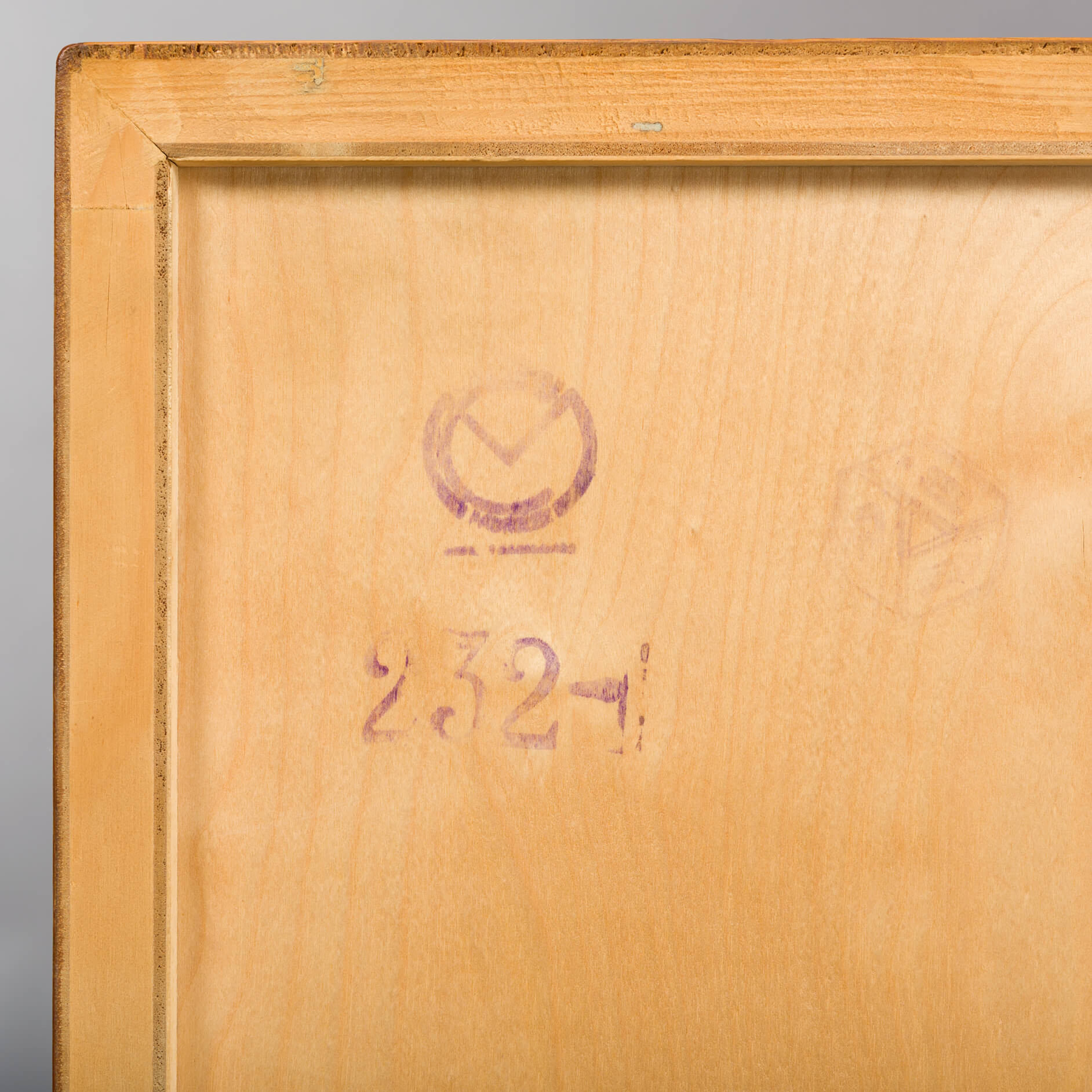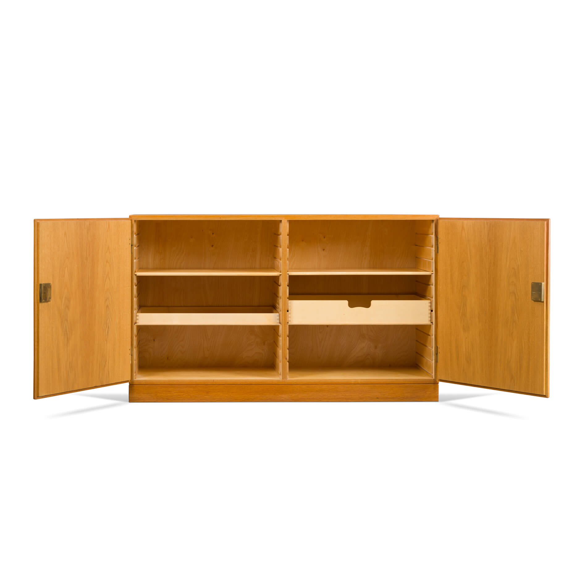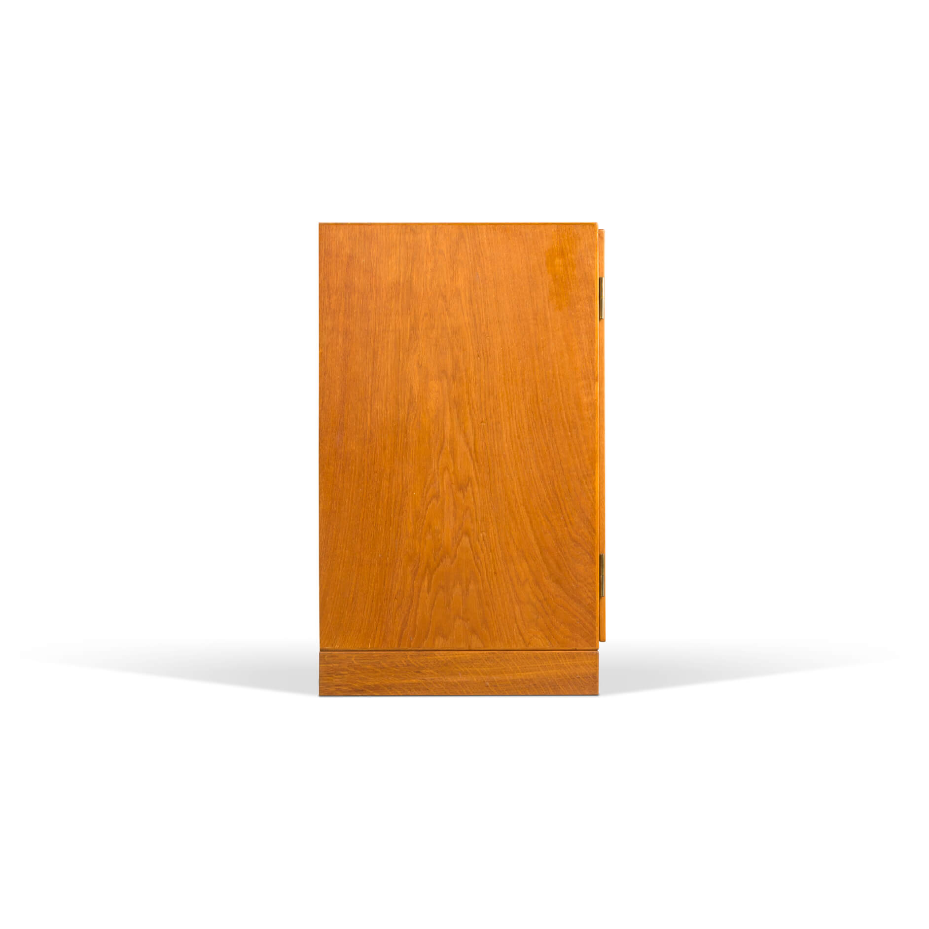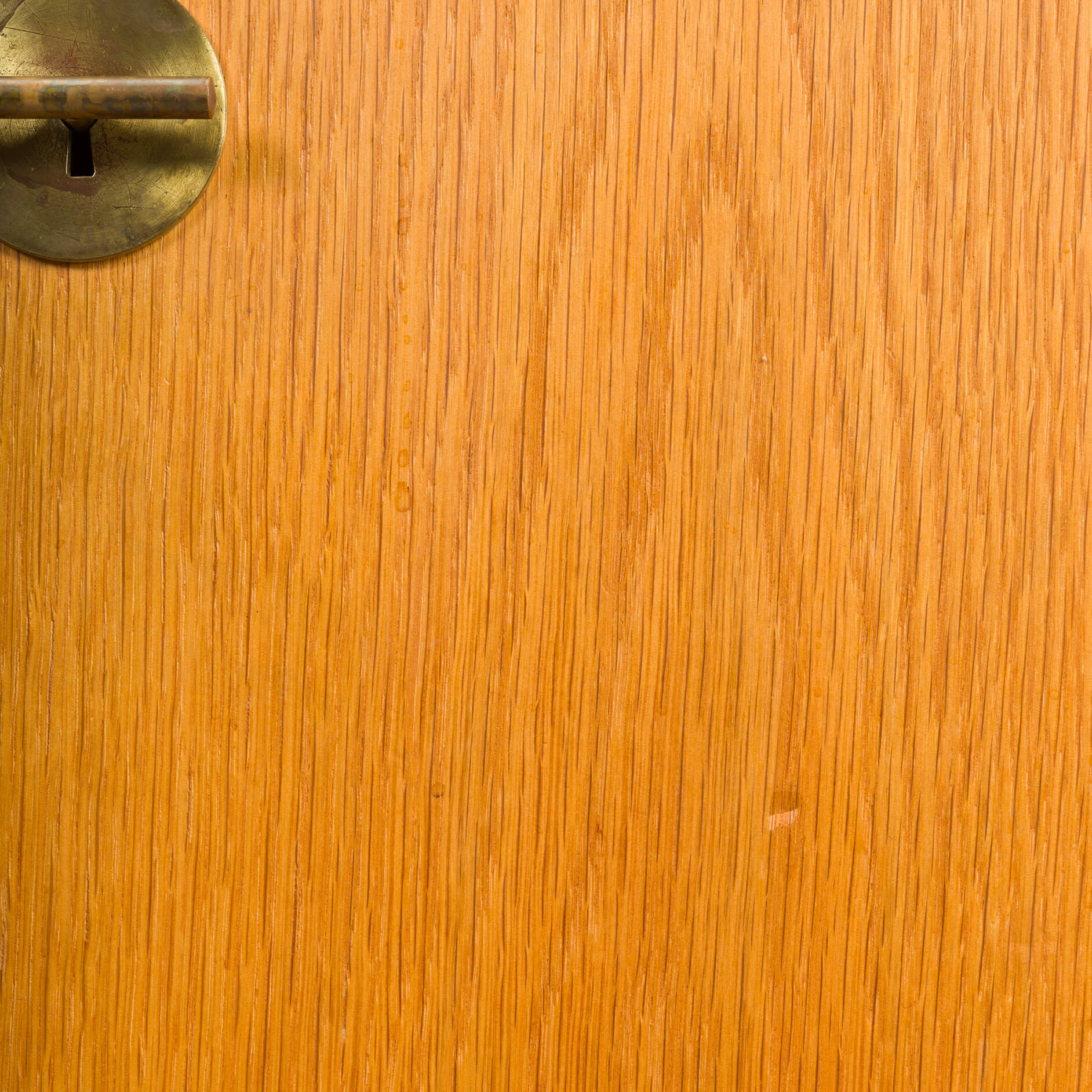 On the inside a nicely crafted cabinet interior in ash with height adjustable drawers and shelves. The oak exterior veneer shows some signs of age, see pictures. The oak veneer base of the cabinet that is fully closed and original for the design. On the back of the cabinet all governing maker stamps are present from both FDB Møbler and C.M. Madsens.