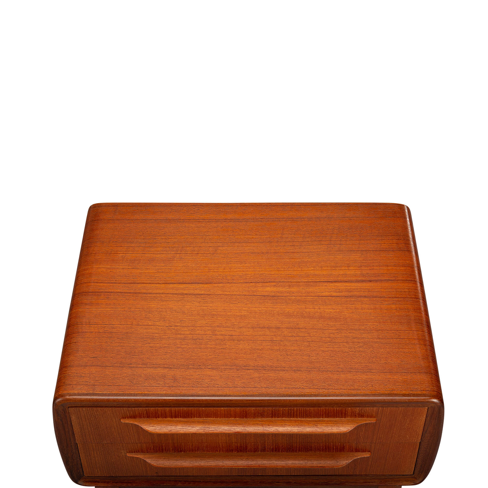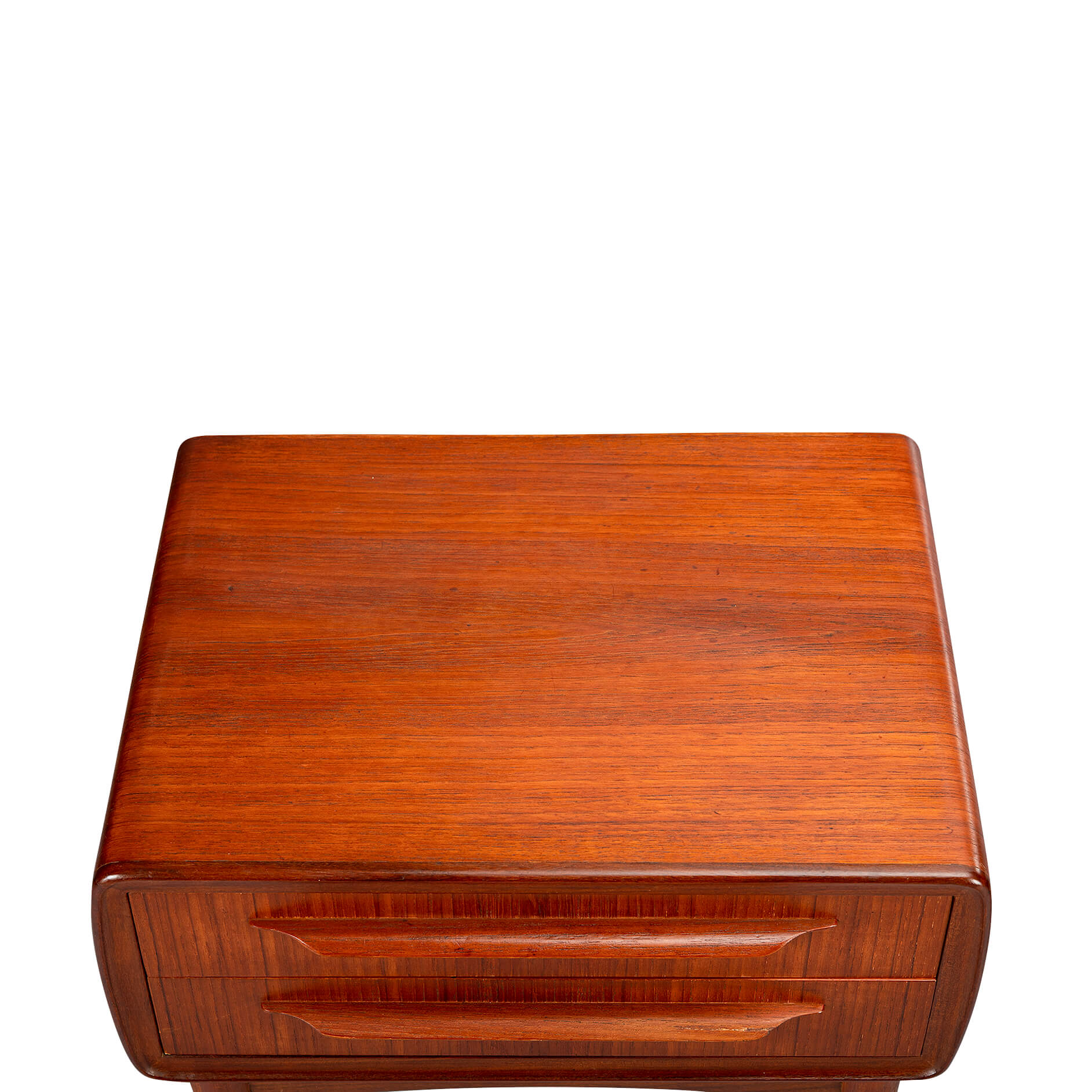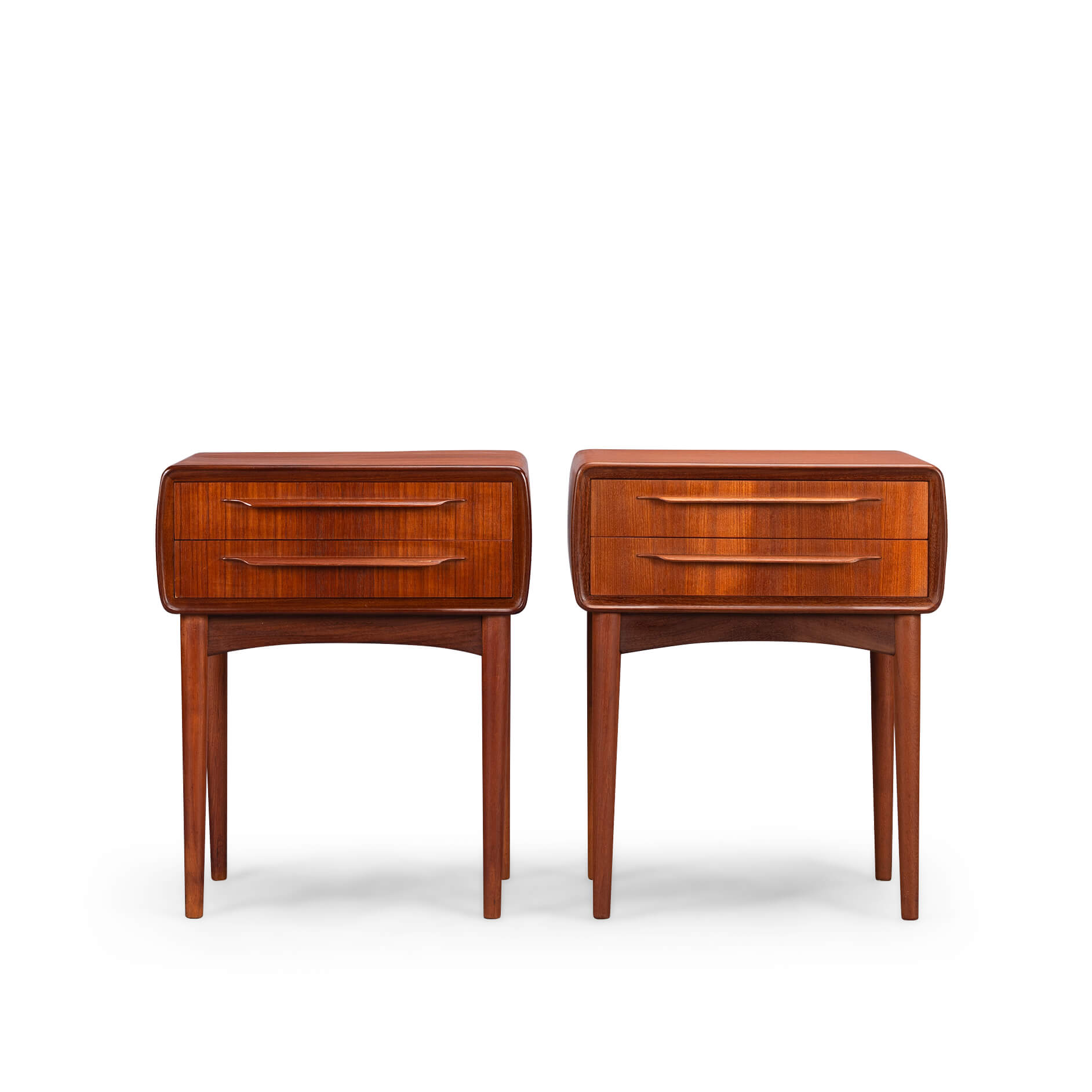 Set of Danish design teak bedside tables designed by Johannes Andersen for Silkeborg Møbelfabrik, 1960. A pair like these rare bedside tables are highly sought after these days. Each cabinet has two drawers with a nice handle.