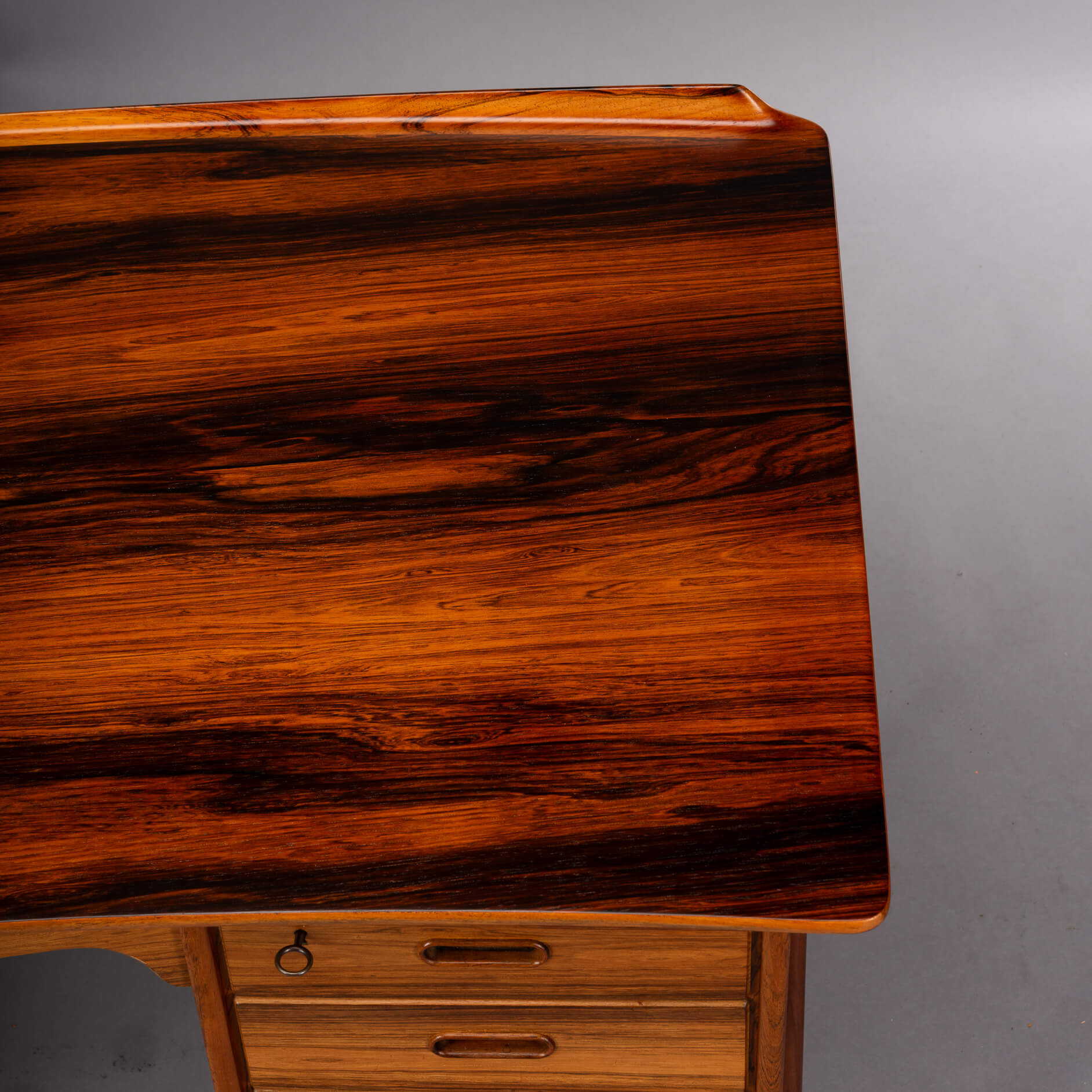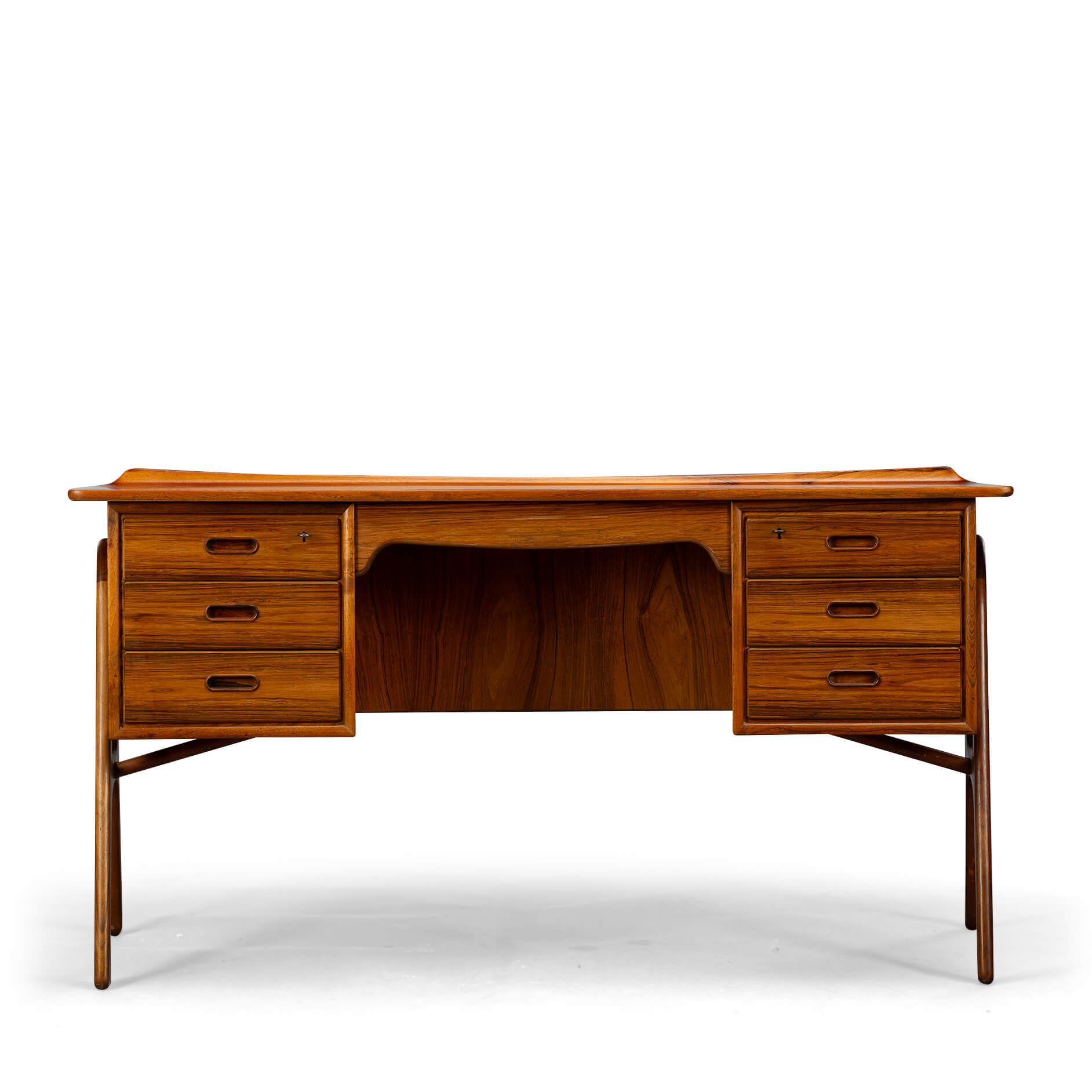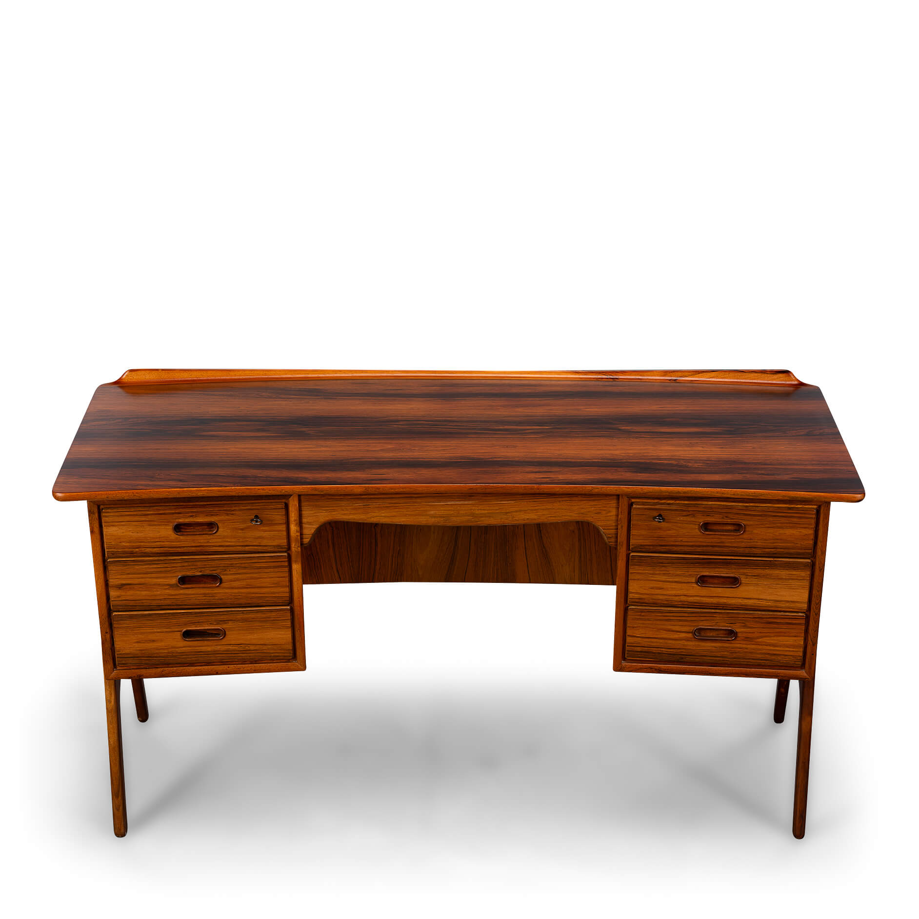 An exclusive mid-century modern large desk was designed by Svend Madsen and manufactured by HP Hansen in Denmark in the 1960s. This elegant desk features a bowed large top with beautiful rosewood wood grain and a raised lip edge. The desk provides three drawers on each side with solid rosewood recessed pull handles, while the back features a large shelf for books. The top drawers have a working lock. Two keys are included.