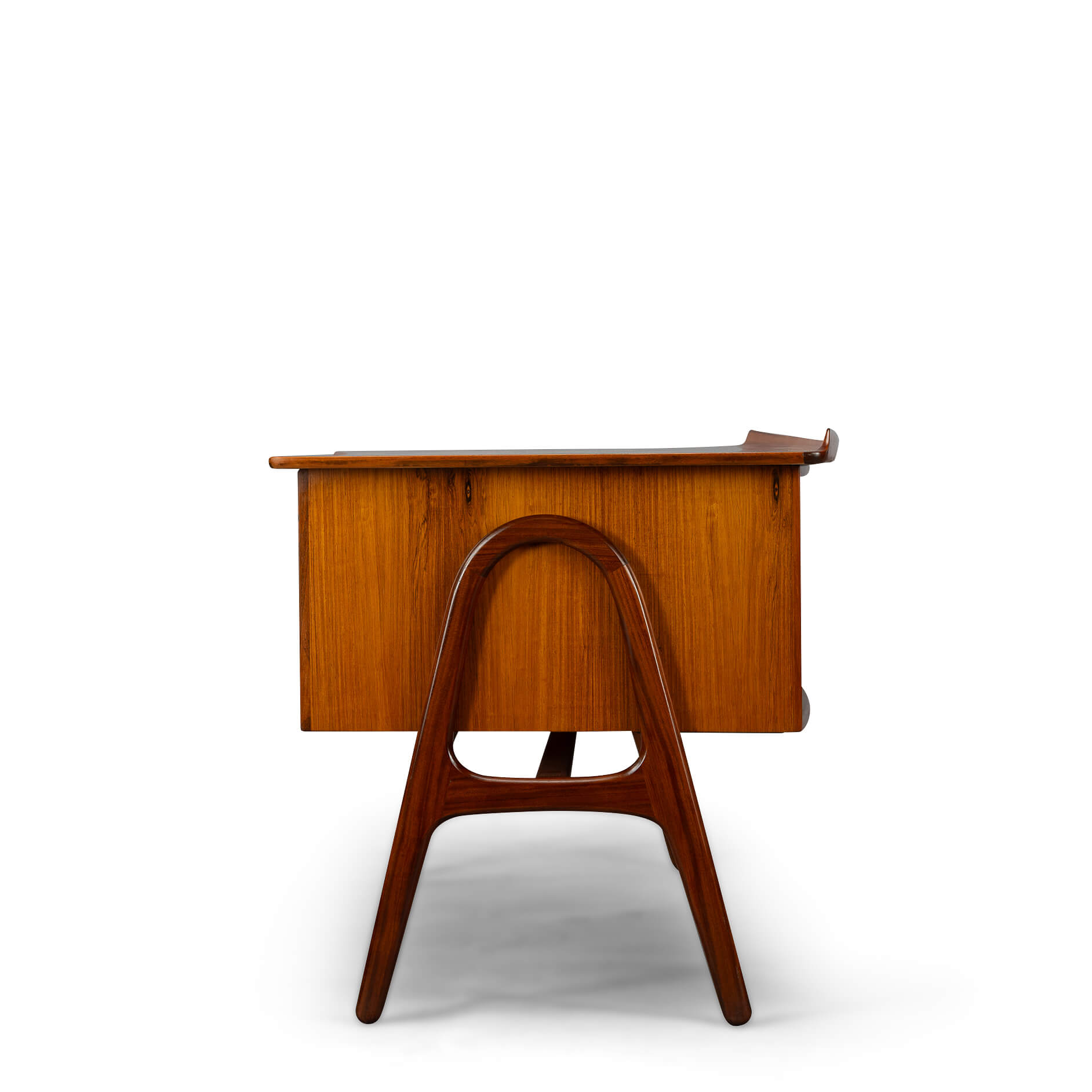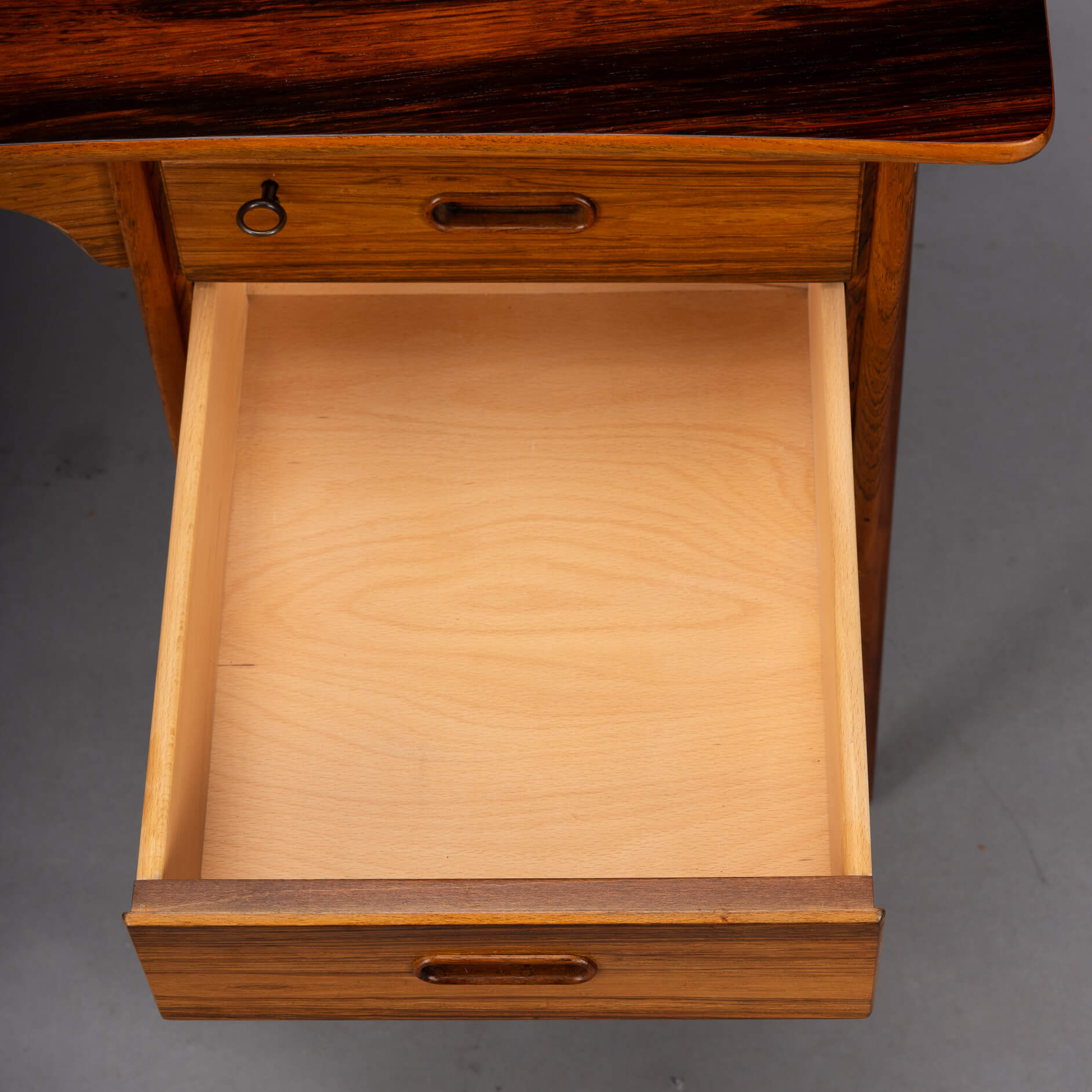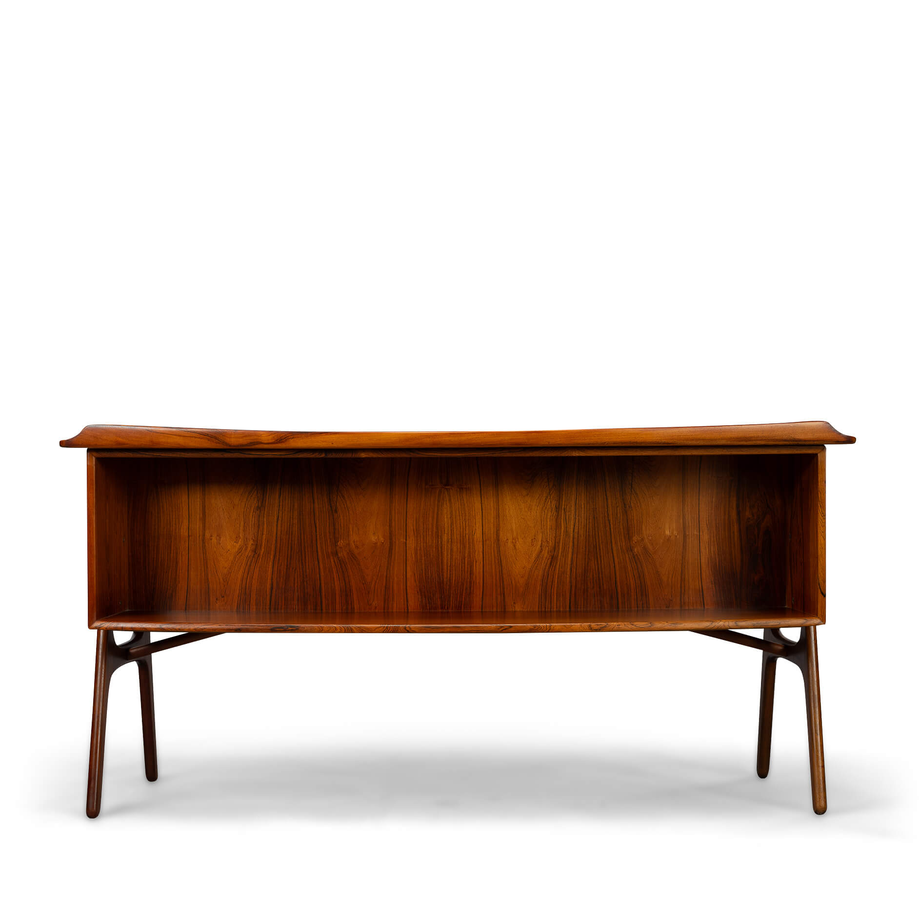 An exclusive mid-century modern large desk was designed by Svend Madsen and manufactured by HP Hansen in Denmark in the 1960s. This elegant desk features a bowed large top with beautiful rosewood wood grain and a raised lip edge. The desk provides three drawers on each side with solid rosewood recessed pull handles, while the back features a large shelf for books. The top drawers have a working lock. Two keys are included.