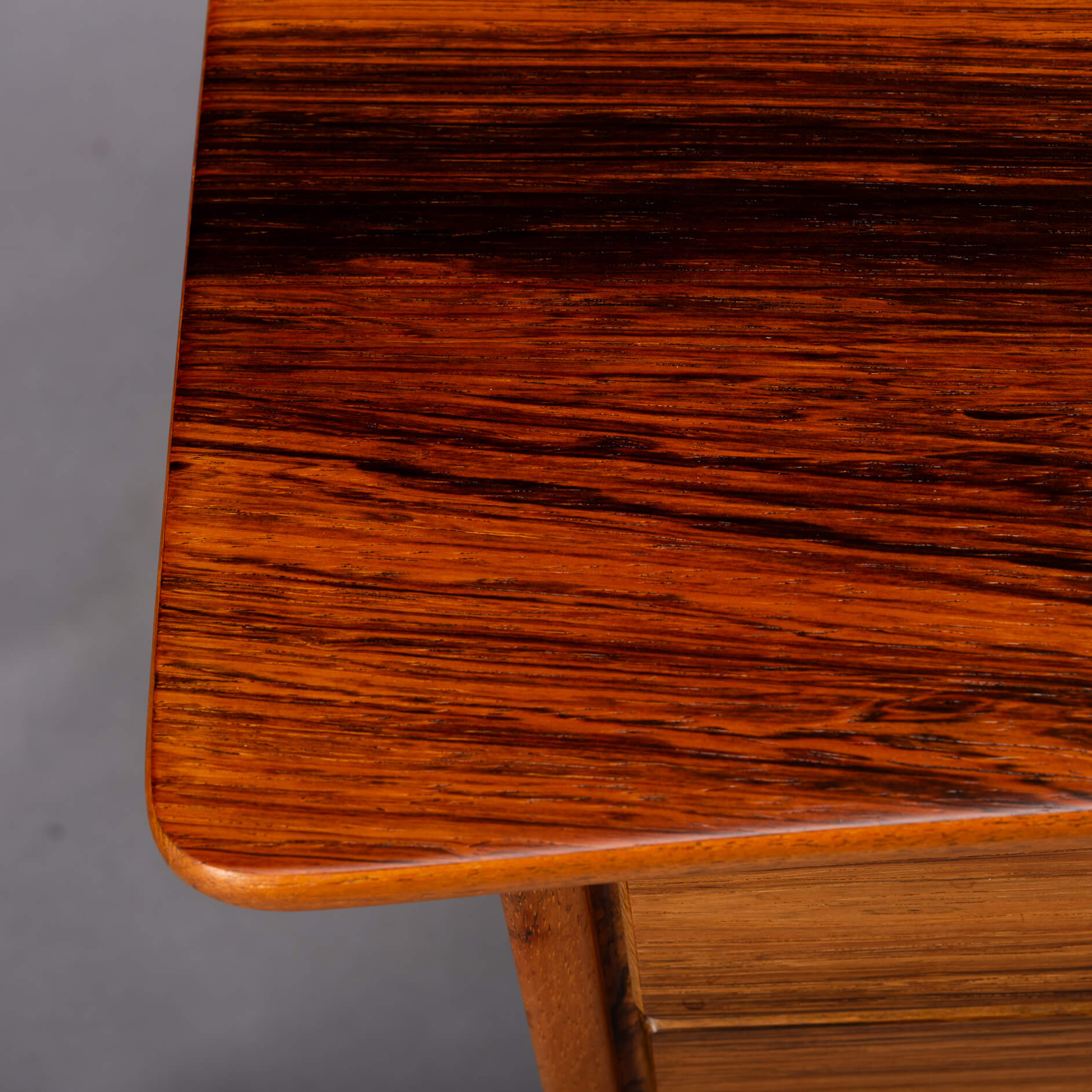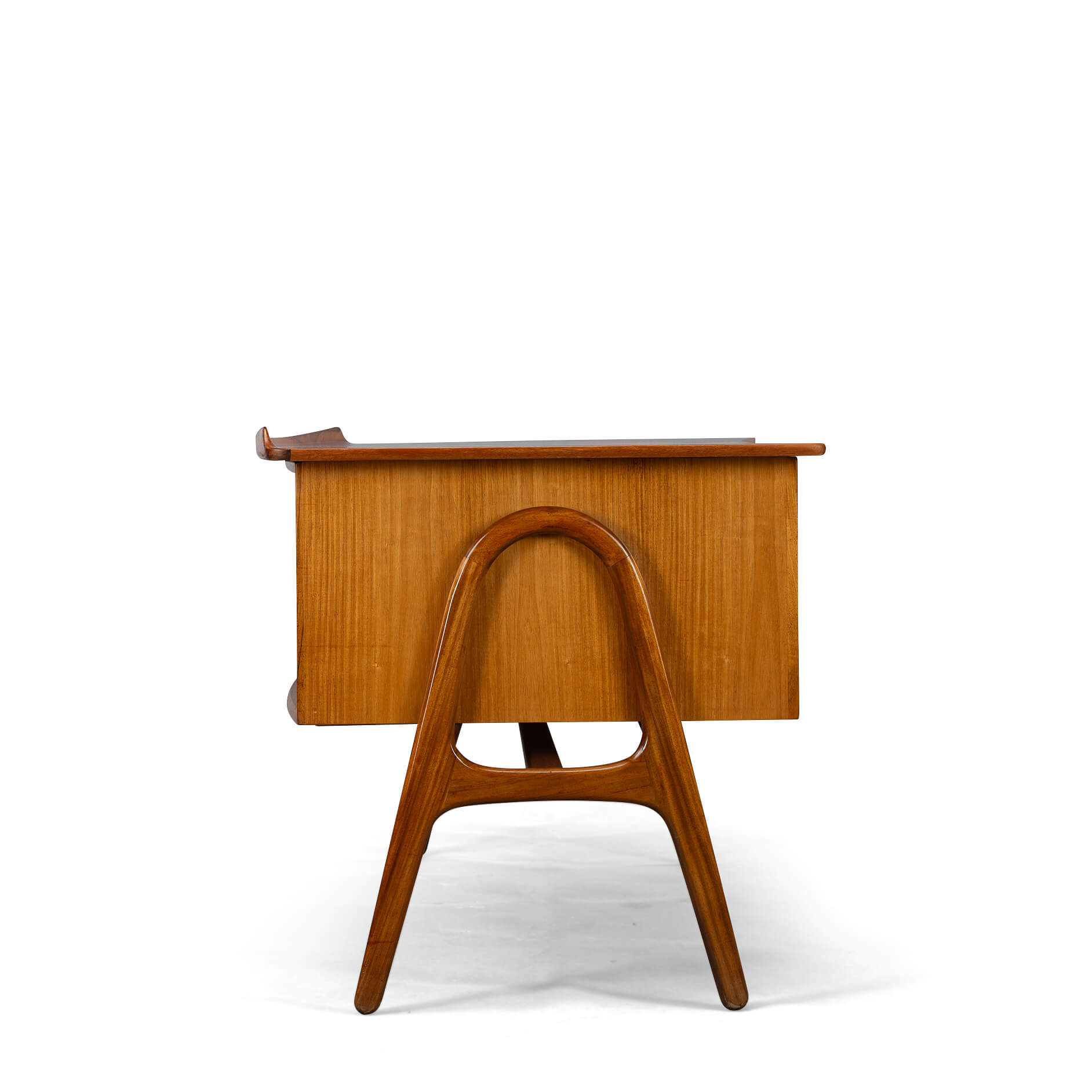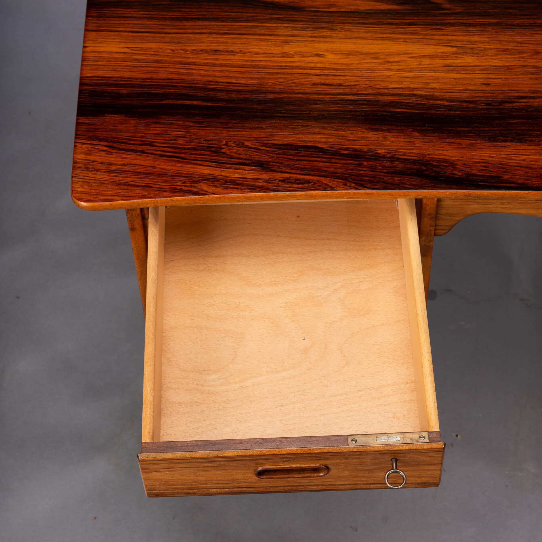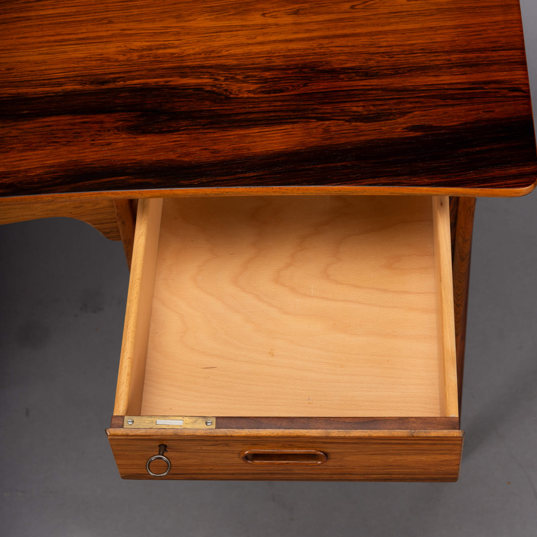 We had the top refinished with a cellulose laquer system adding a layer of robustness to the top. There are some small signs of use and time on the base frame but none of those disturb really. So this desk is in a very good vintage condition.
