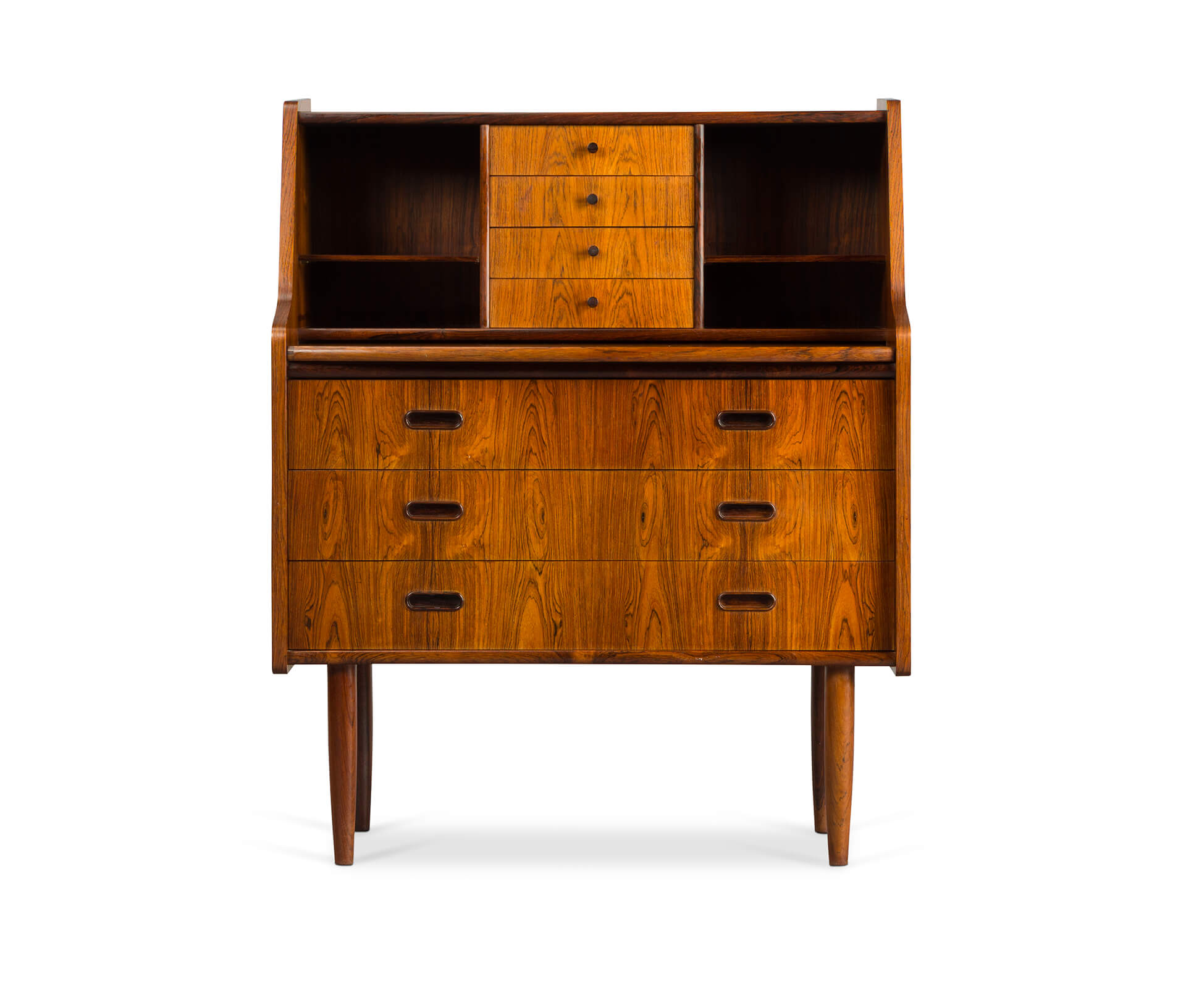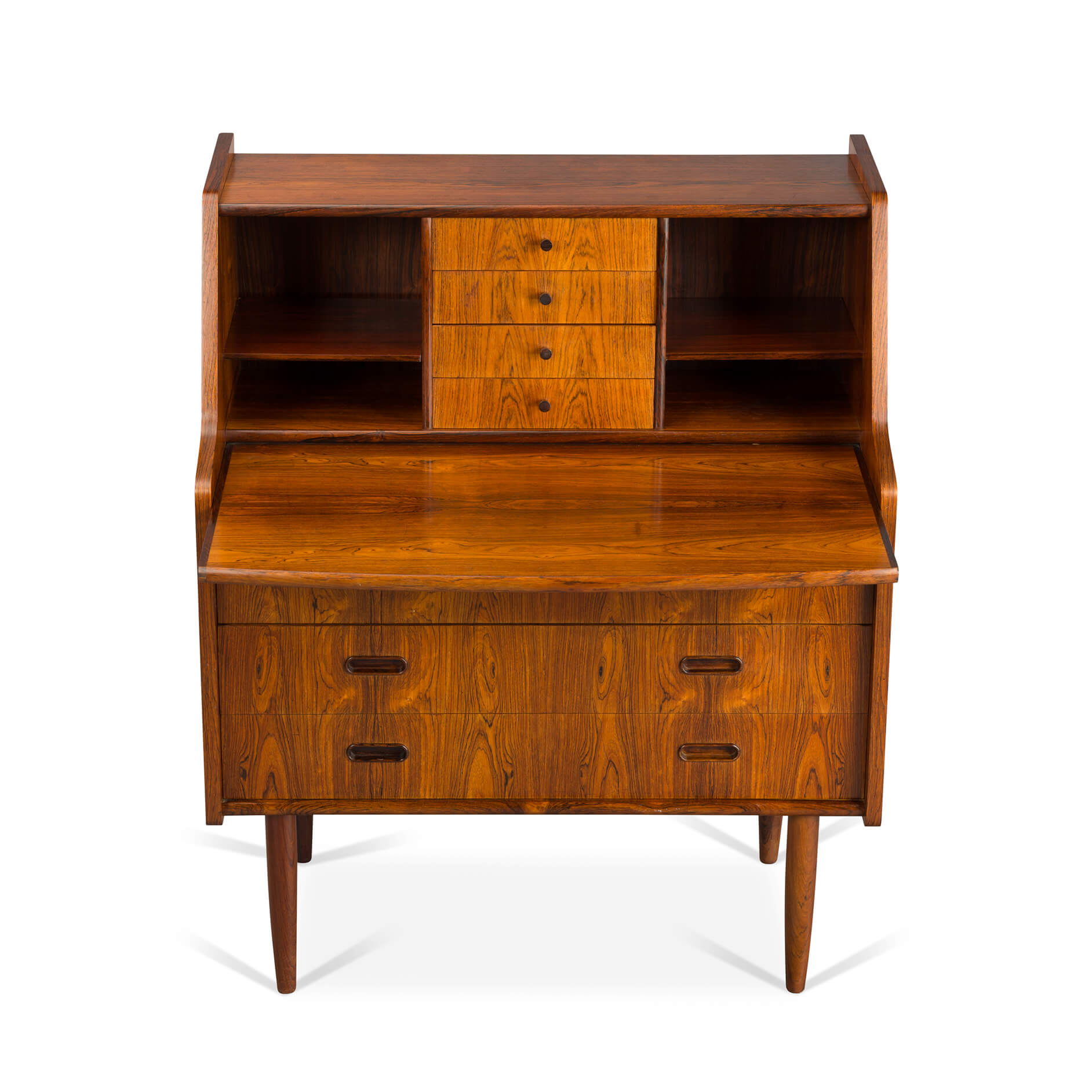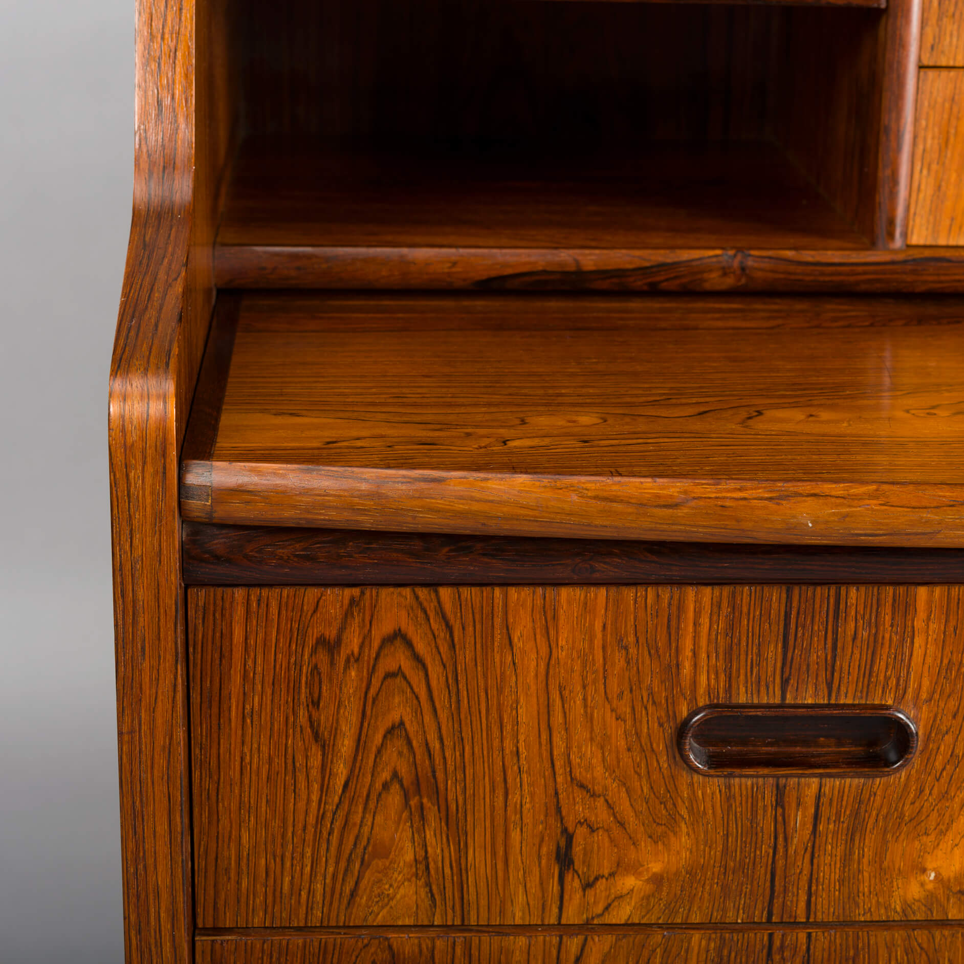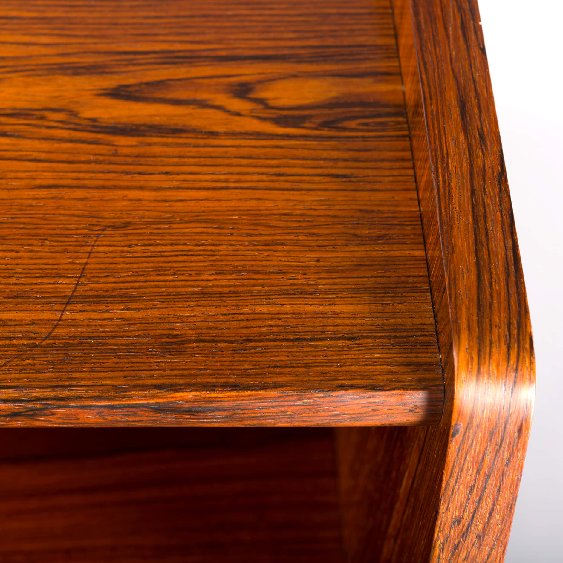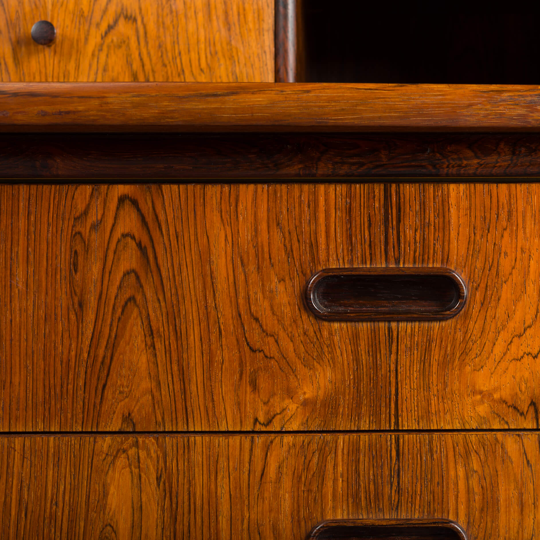 Super stylish! Everything is spot on with this Danish writing desk. Made out of a lovely rosewood veneer and meticulously worked in every detail. Patterning of the veneer is subtle and are topped off with subtly cut solid rosewood knobs on the drawer block. This desk is over 50 years of age and it is in very good vintage condition. Only some small light stains and some scratches. See the pictures.