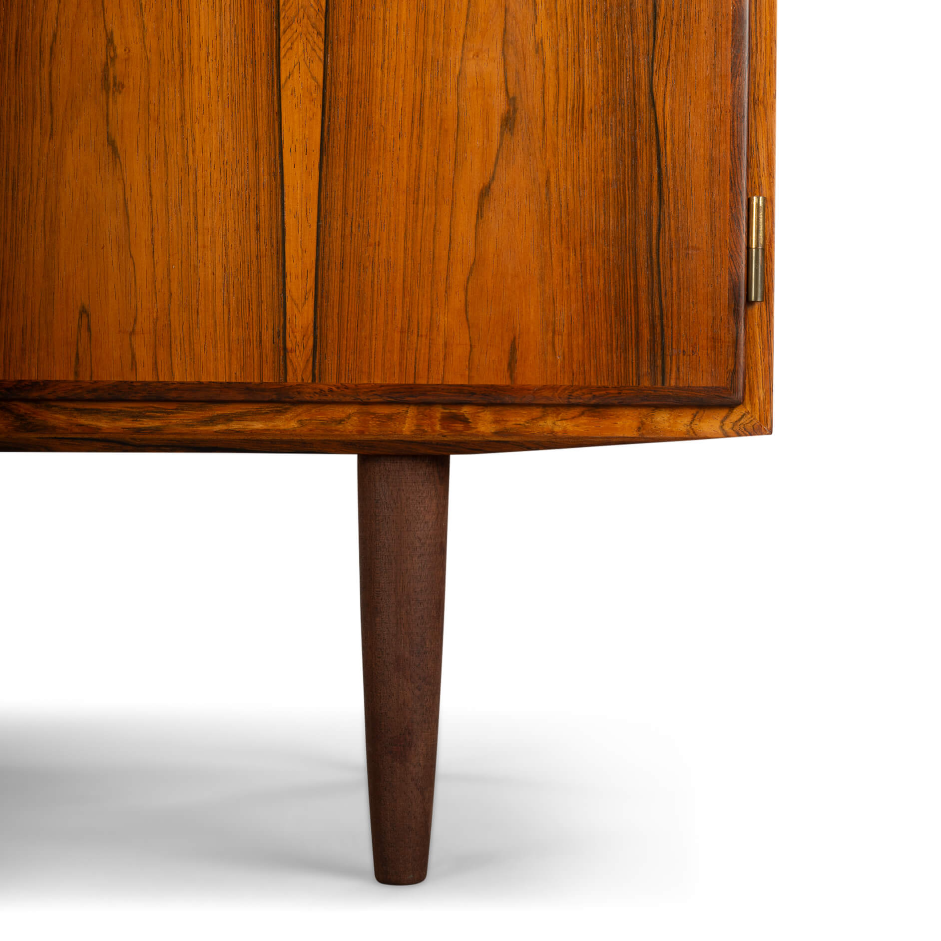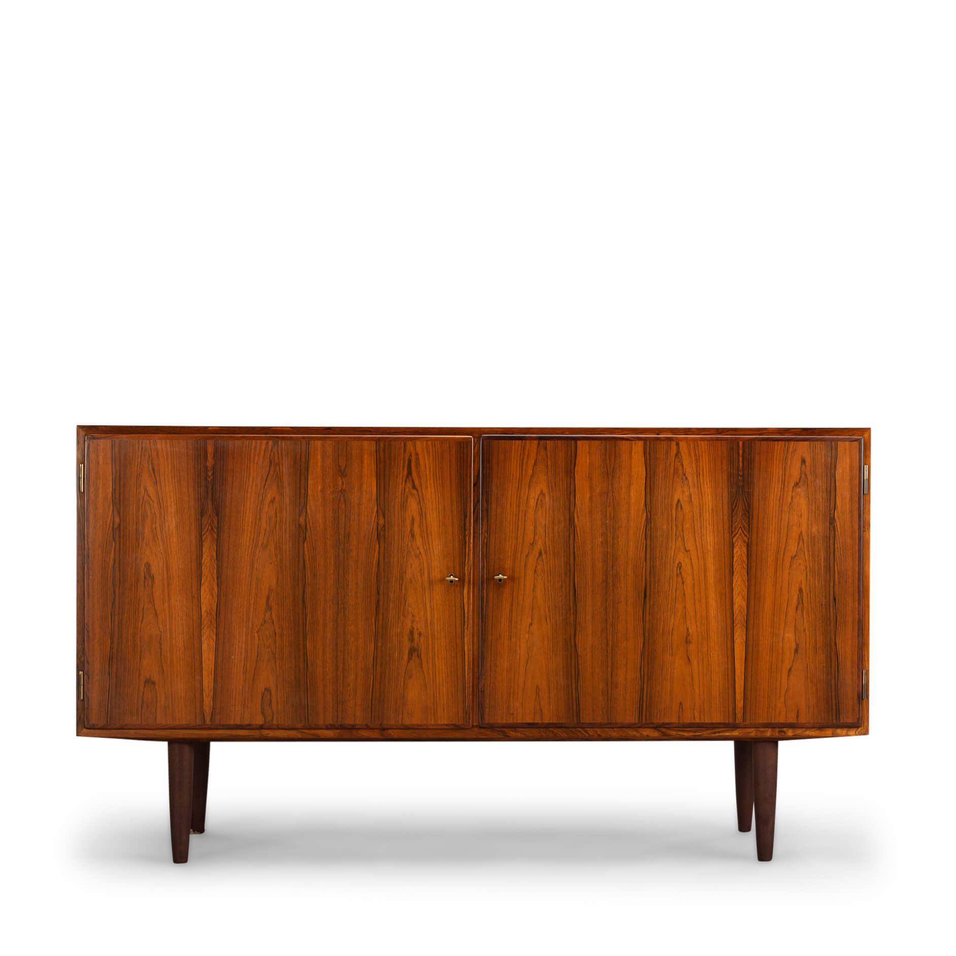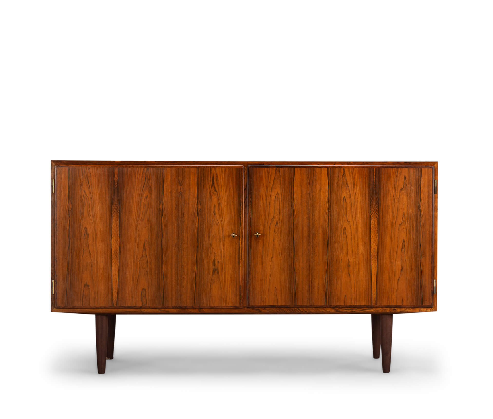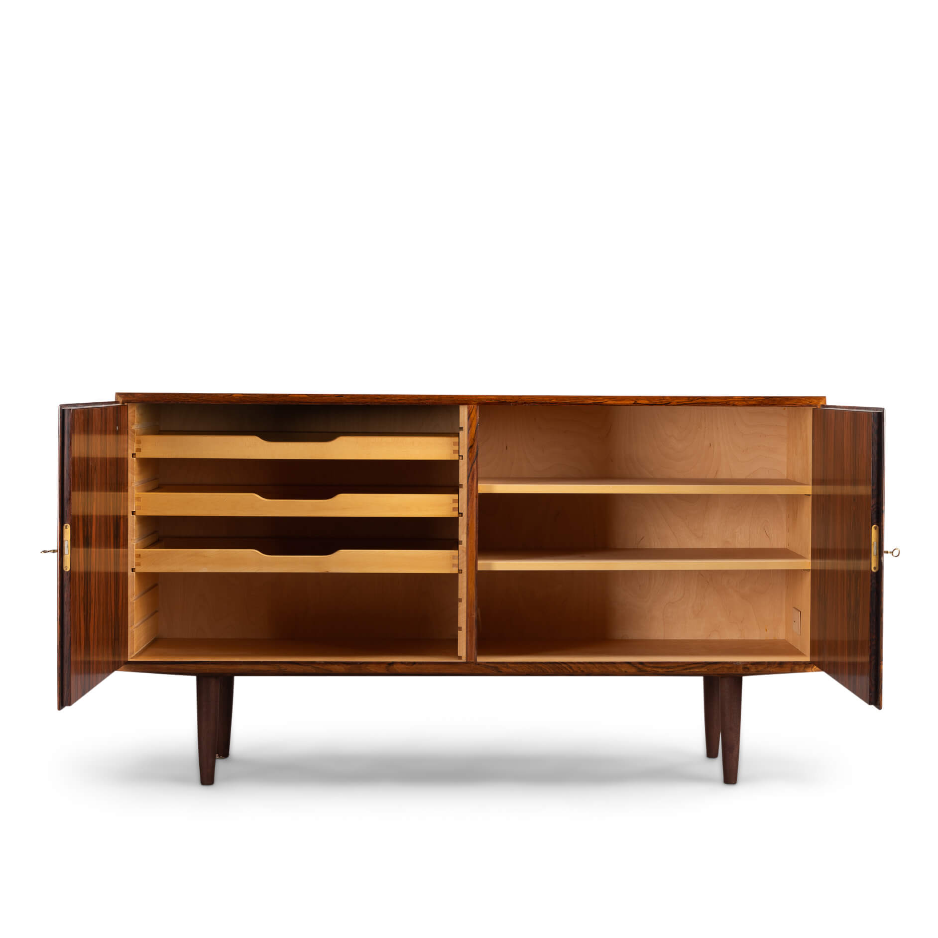 Designed by Carlo Jensen and made by Hundevad & Co. This sideboard is truly a classic design. Finished in a beautiful rosewood veneer this cabinet comes with great construction finesse and quality. There are height adjustable drawers on the left hand side of the cabinet made in ash that allow you to store also taller goods nicely. On the right side in the credenza two shelves.