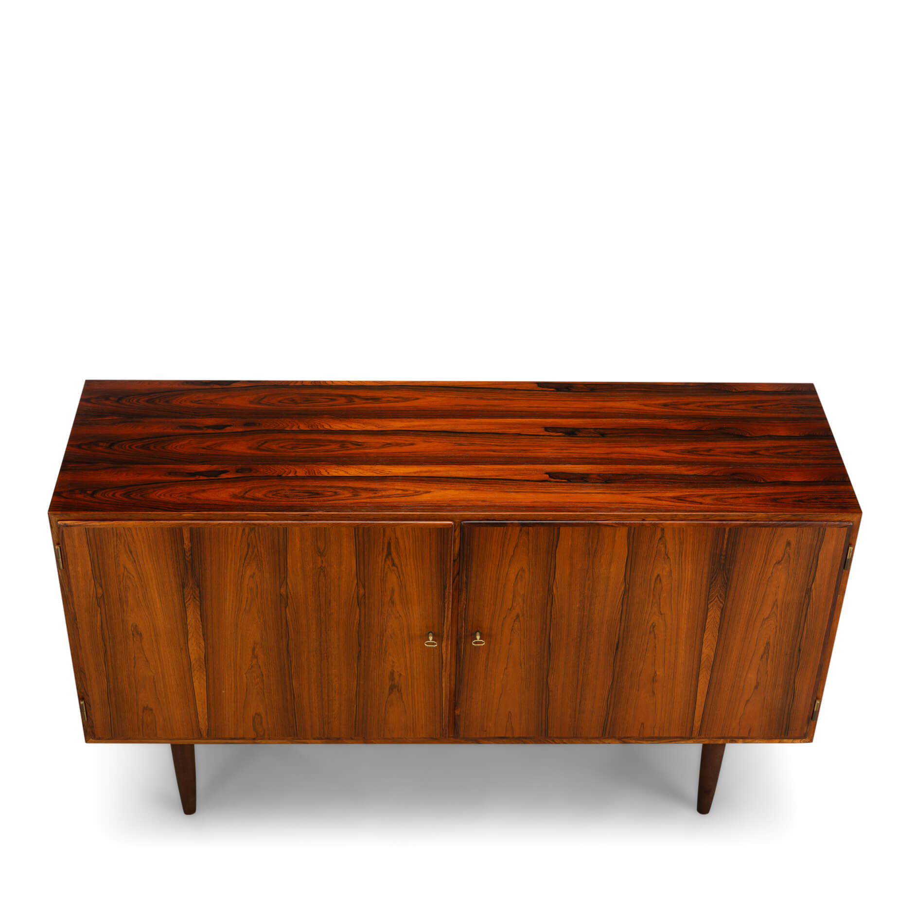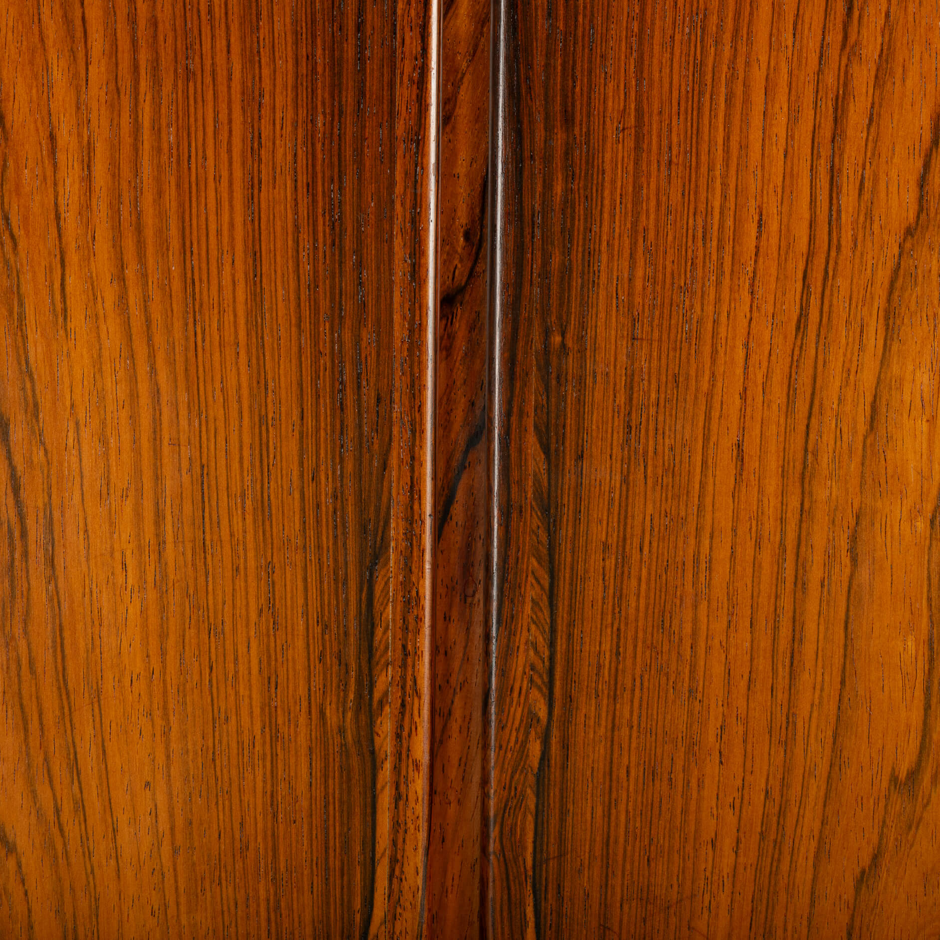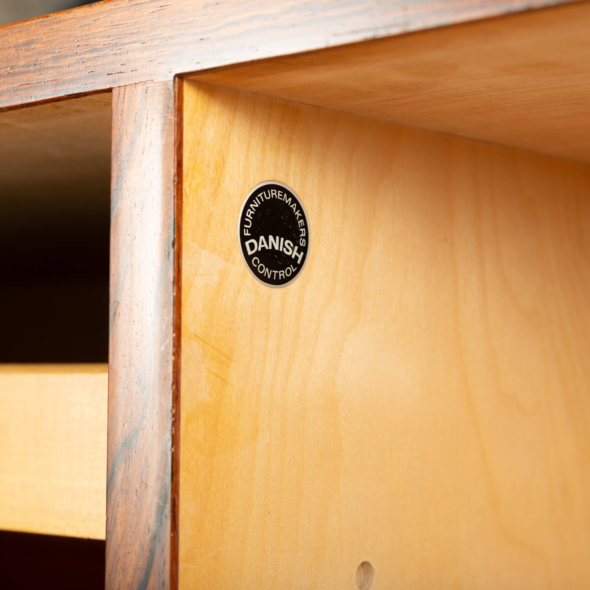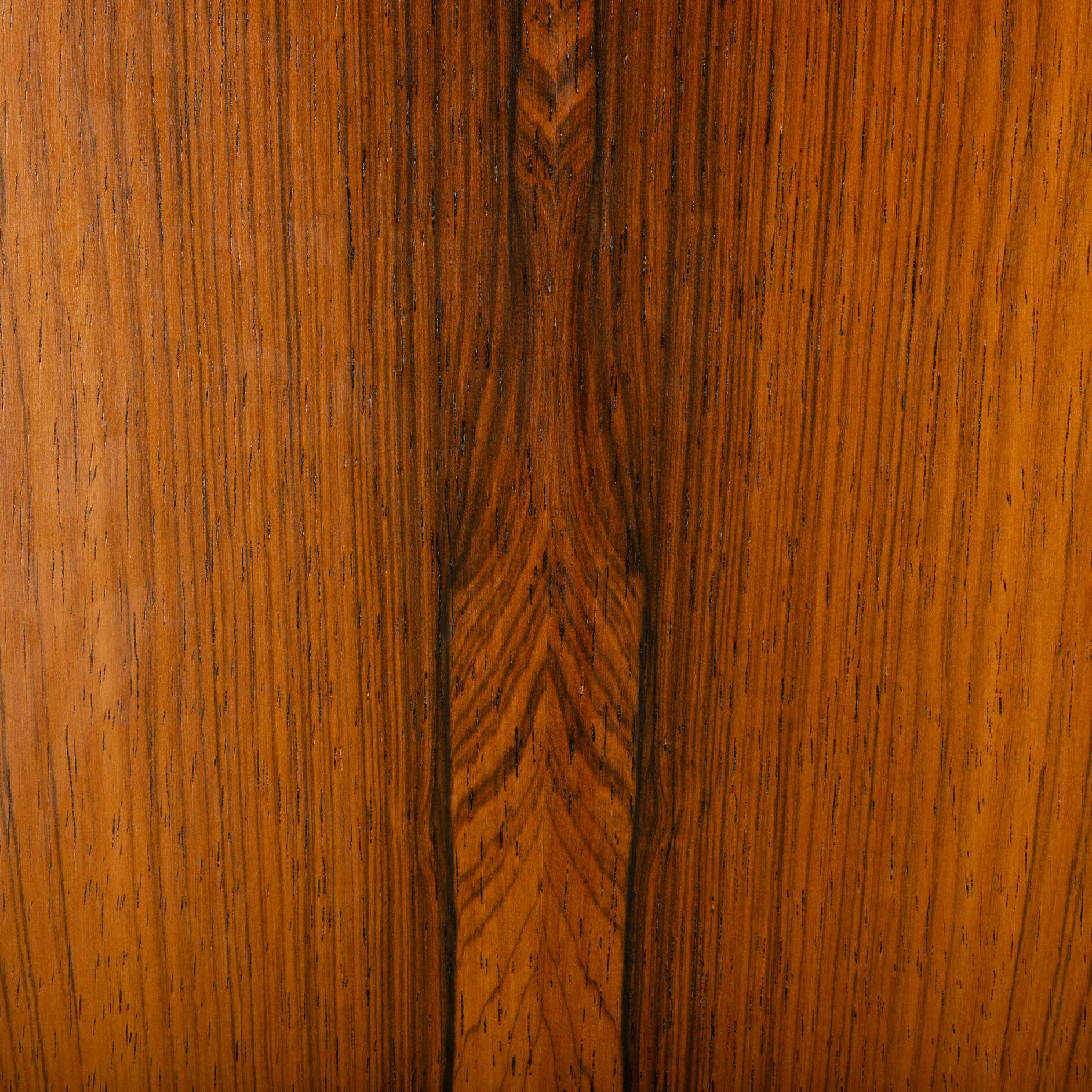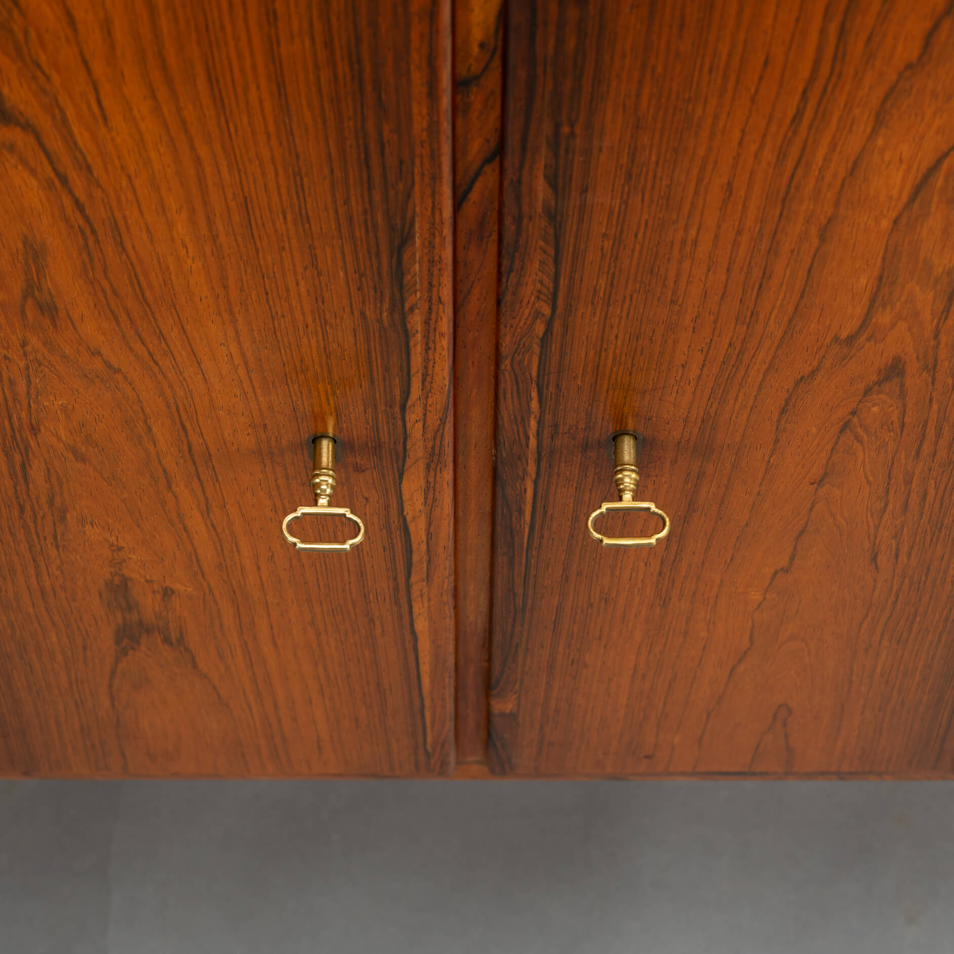 The rosewood veneer of this sideboard makes us truly happy. We had the top professionally resprayed with a high-quality cellulose coating. Nothing more was necessary. So this credenza is in very good vintage condition with minimal signs of use and age.