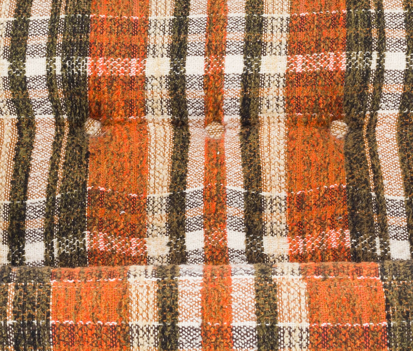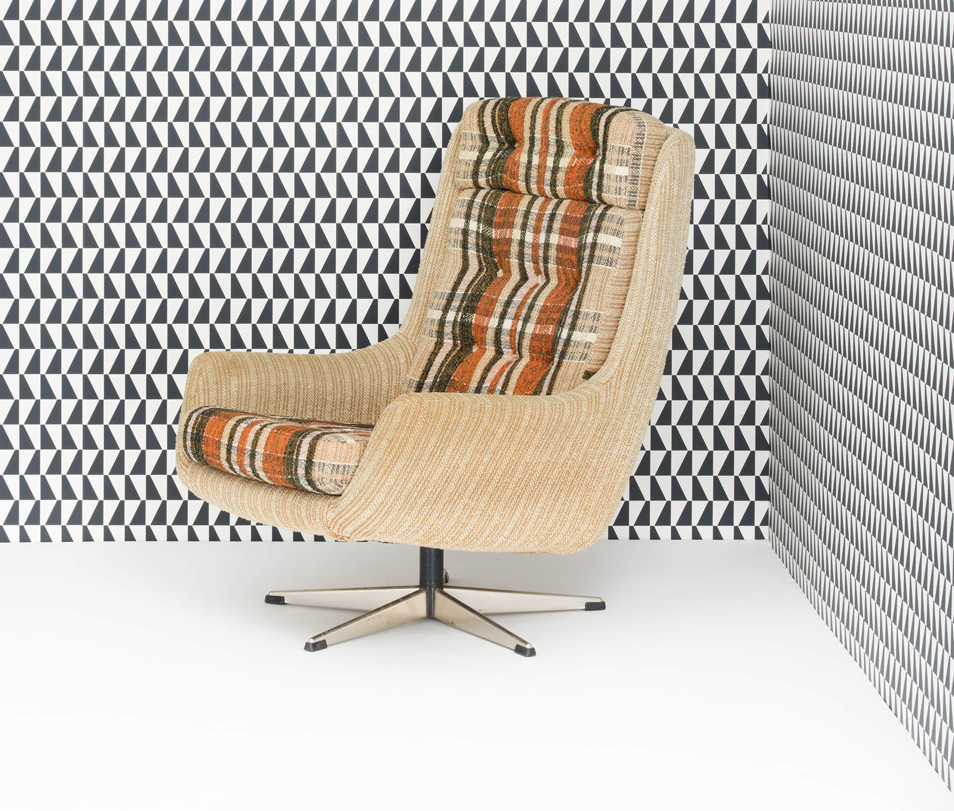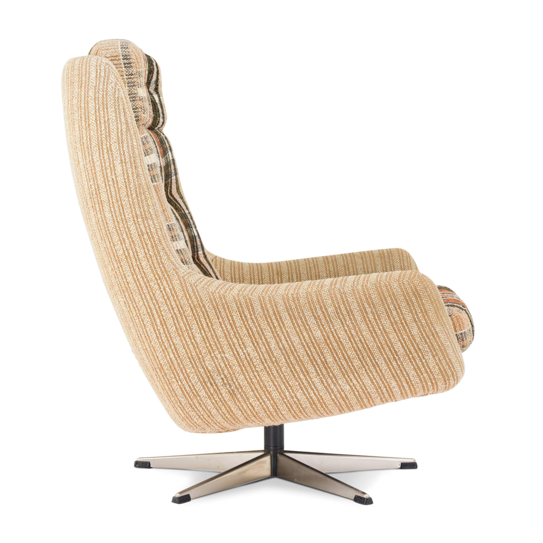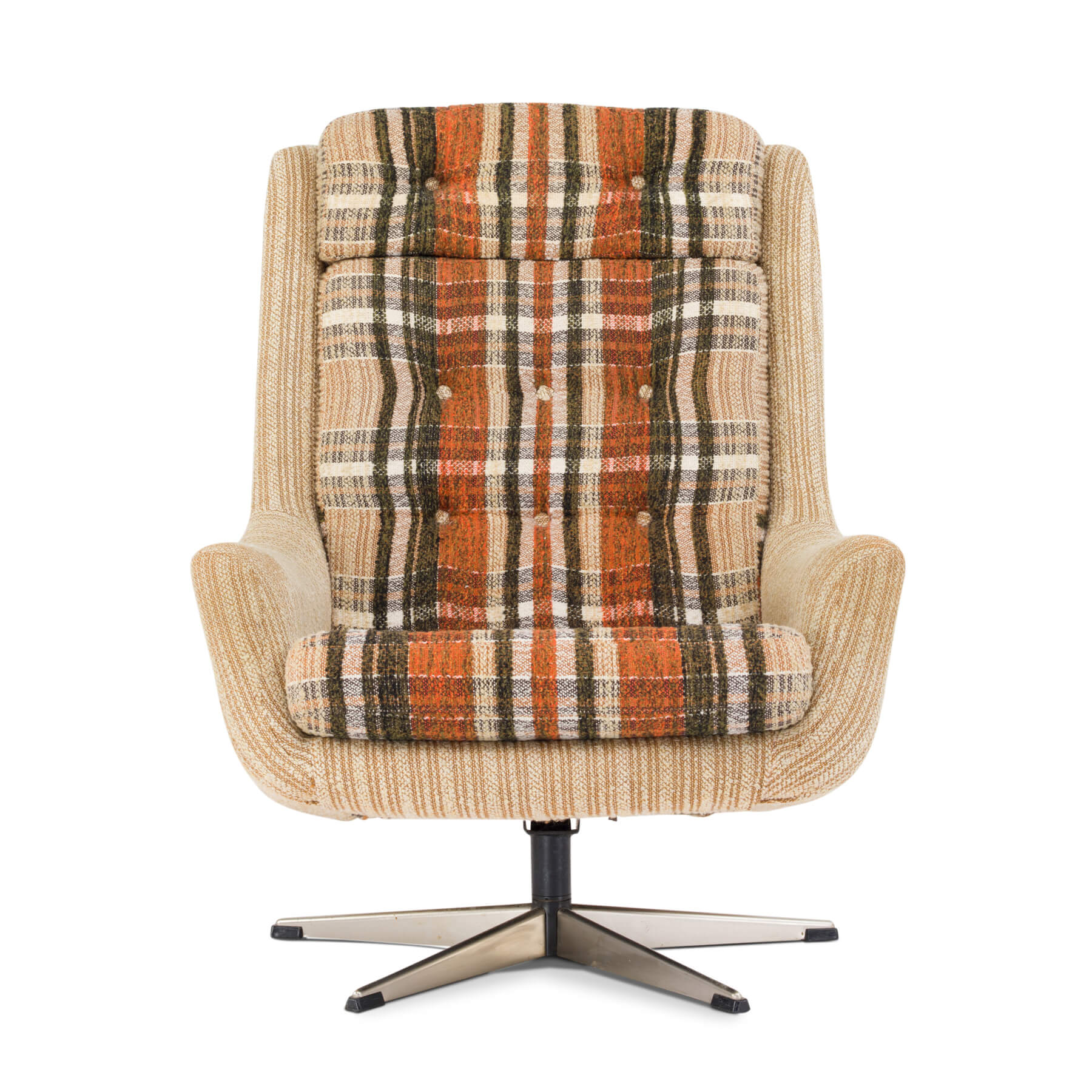 Danish very comfy swivel chair. Fabric is robust in what appears to be a 'Scottish' design. The fabric on this easy chair is still original and in good vintage condition. And not unimportant the cushions are still well filled! The chromed steel foot is also still in good condition.