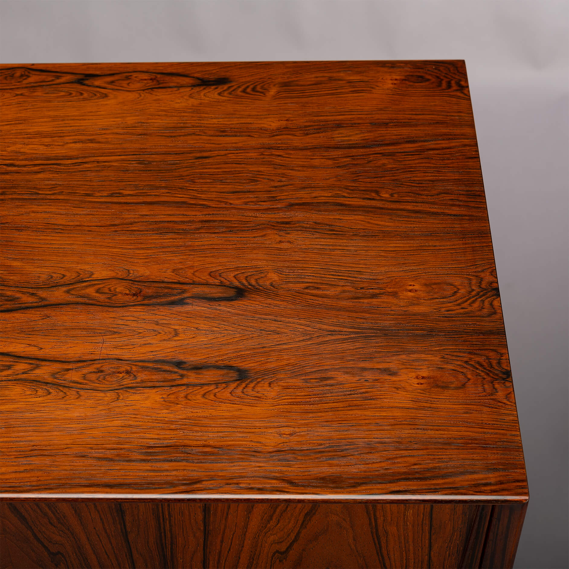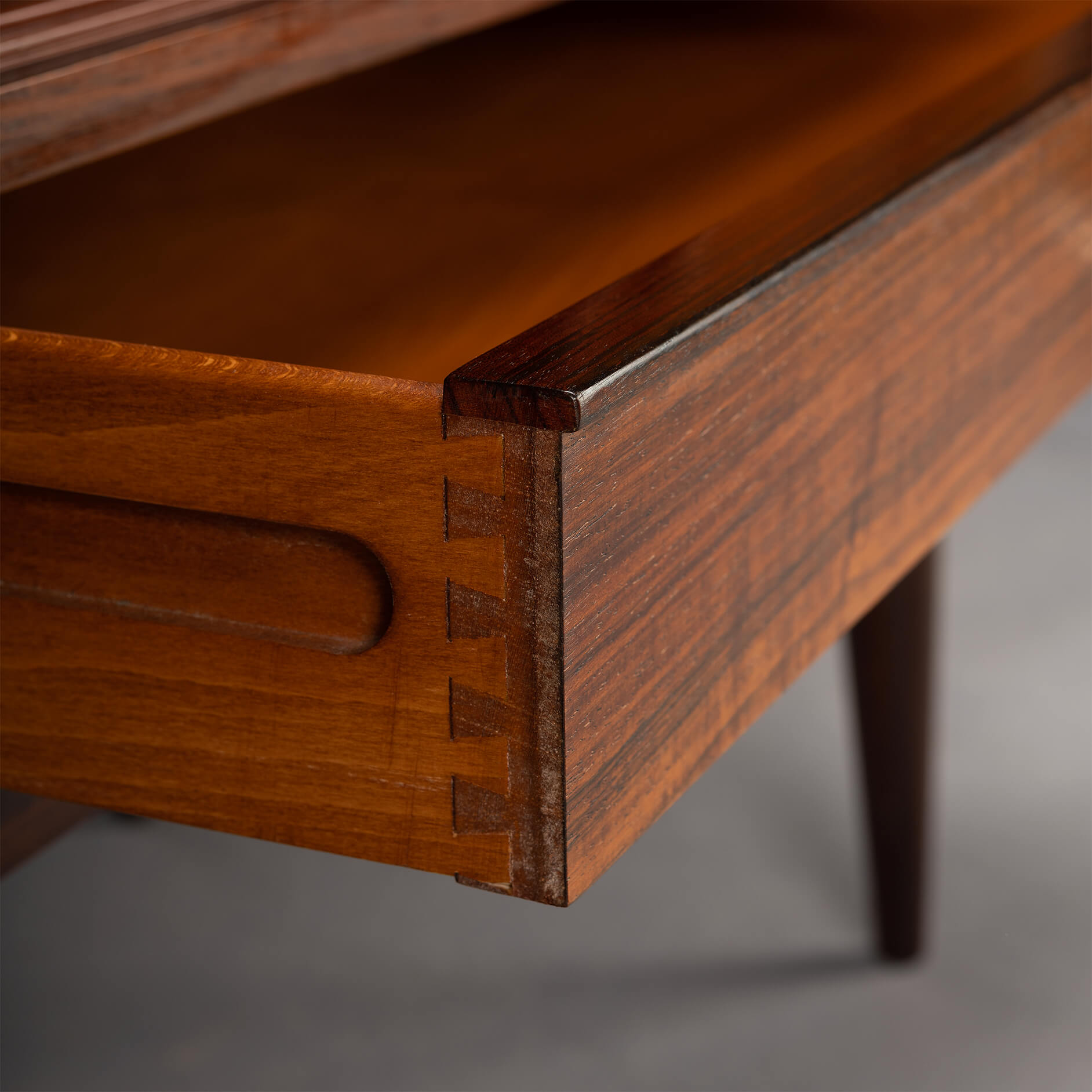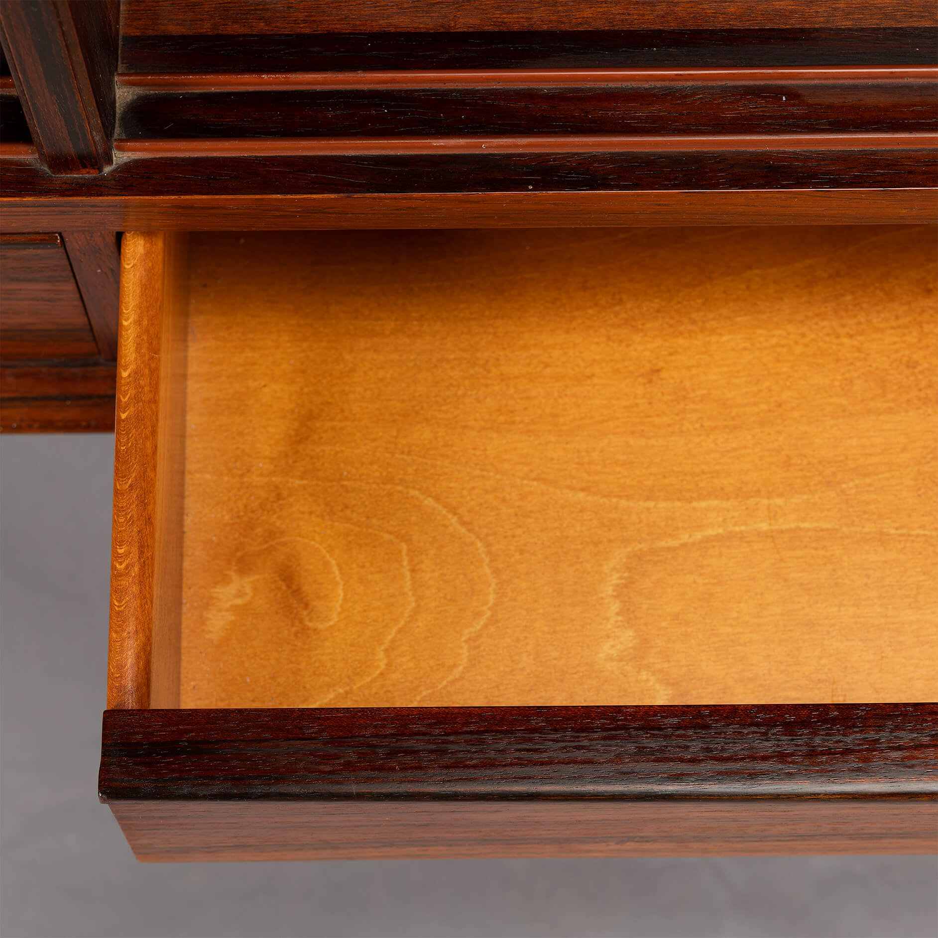 Superb level of quality and use of high end materials on top of its design make it a full pull. Doors accented by beautifully hand-sculpted rosewood handles, slide open to reveal an adjustable shelve. This credenza is in very good vintage condition with minimal signs of use and age.