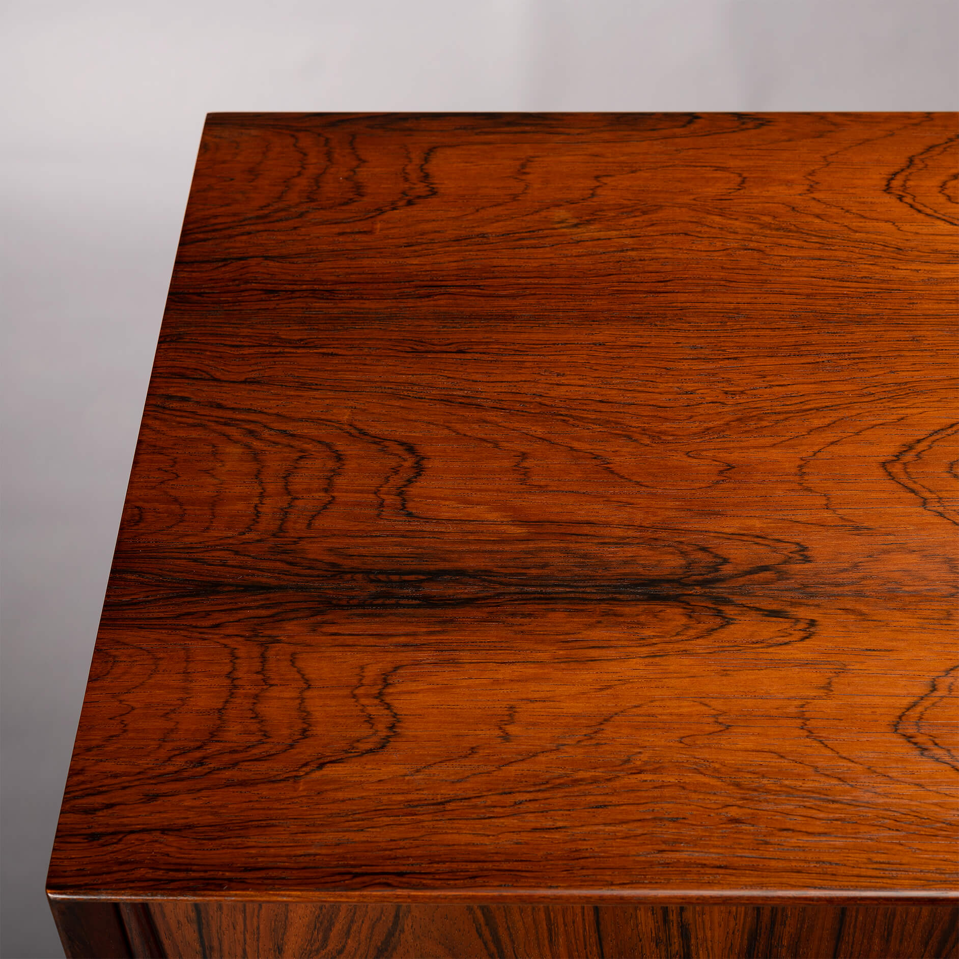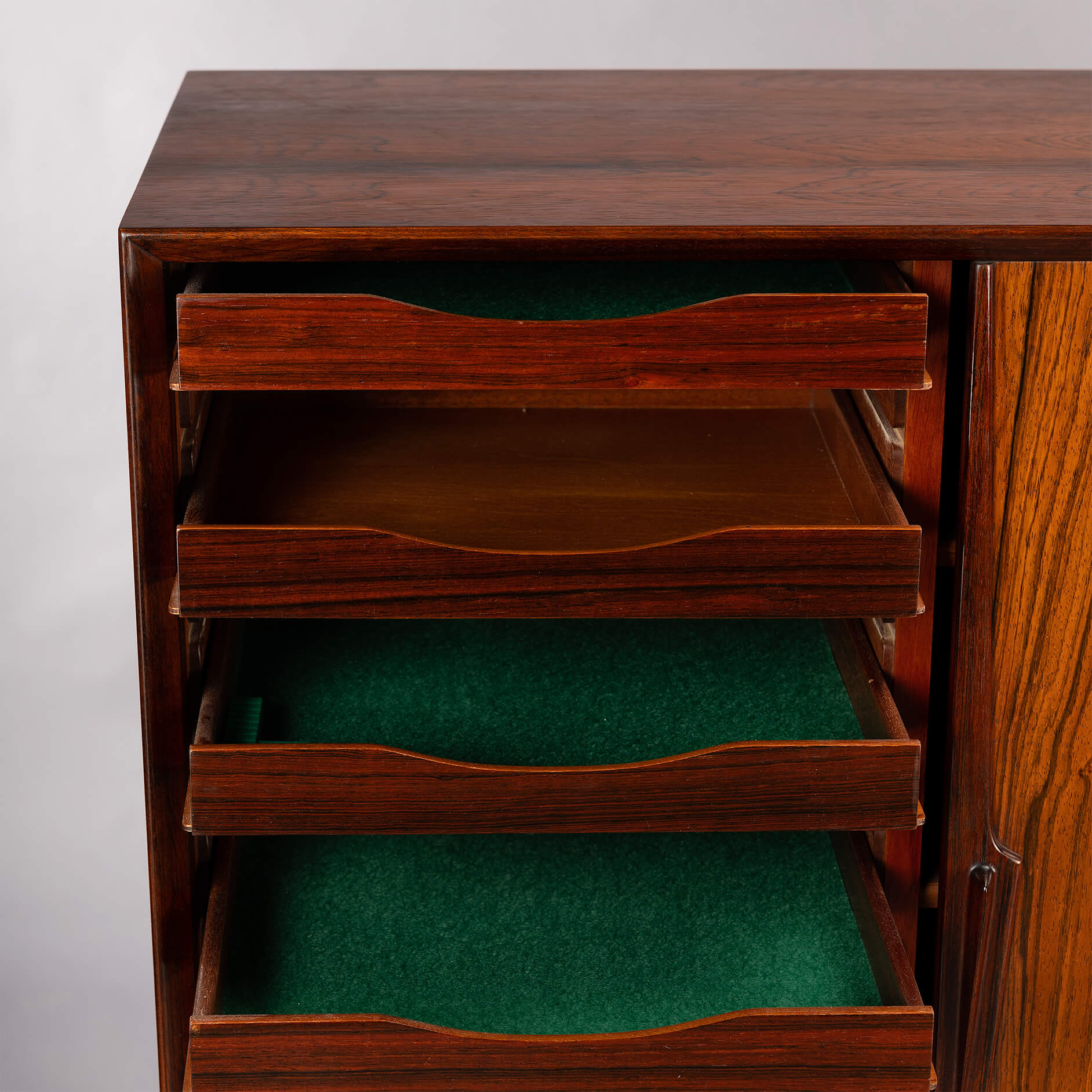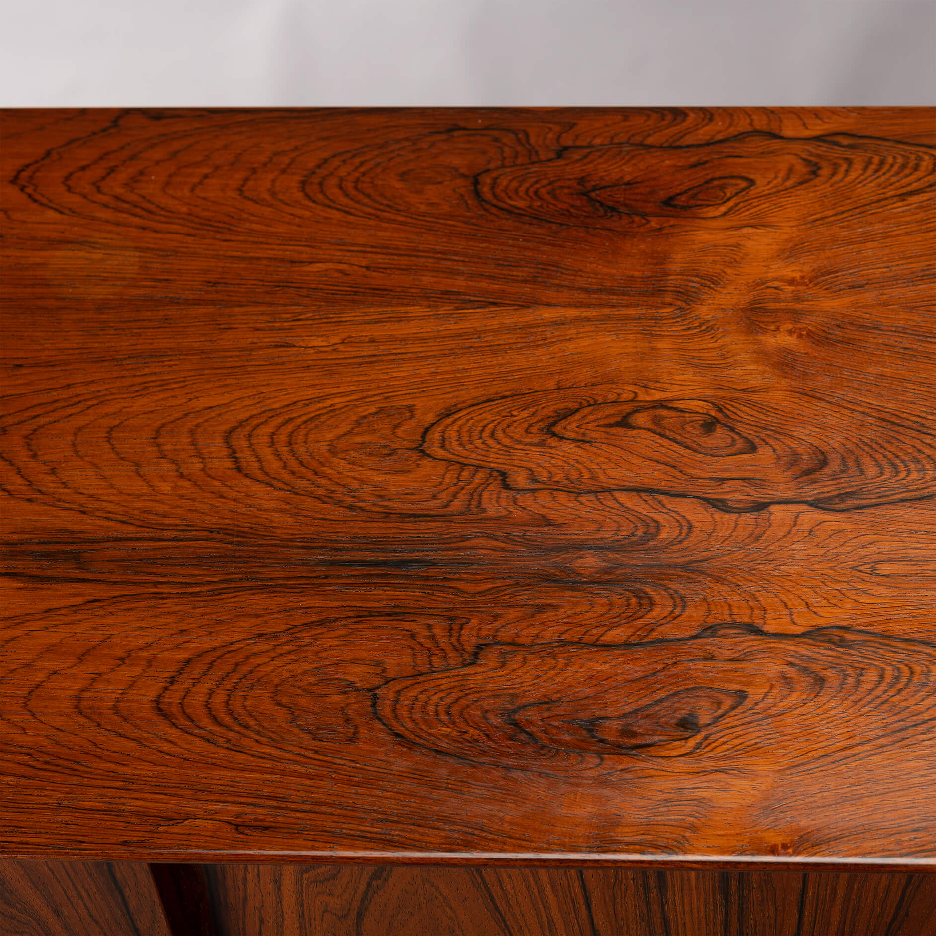 Superb level of quality and use of high end materials on top of its design make it a full pull. Doors accented by beautifully hand-sculpted rosewood handles, slide open to reveal an adjustable shelve. This credenza is in very good vintage condition with minimal signs of use and age.