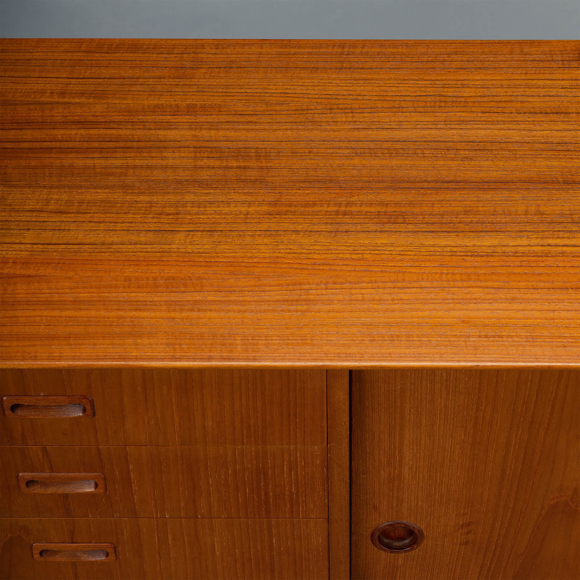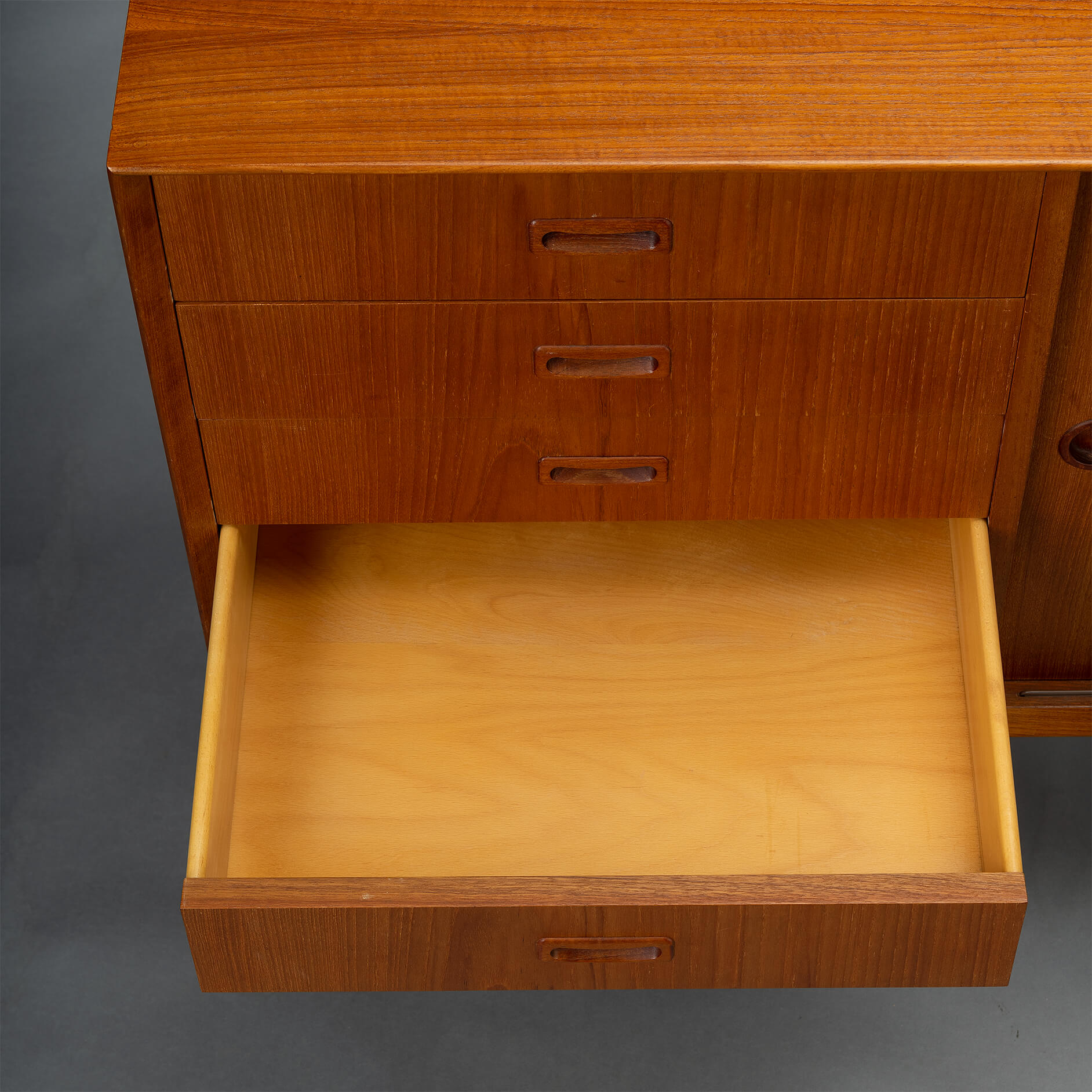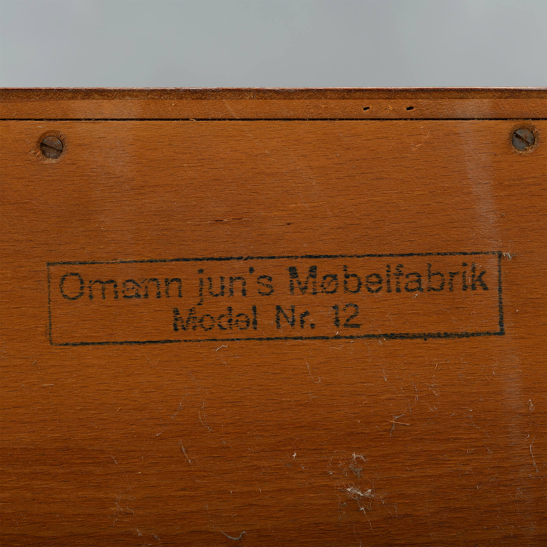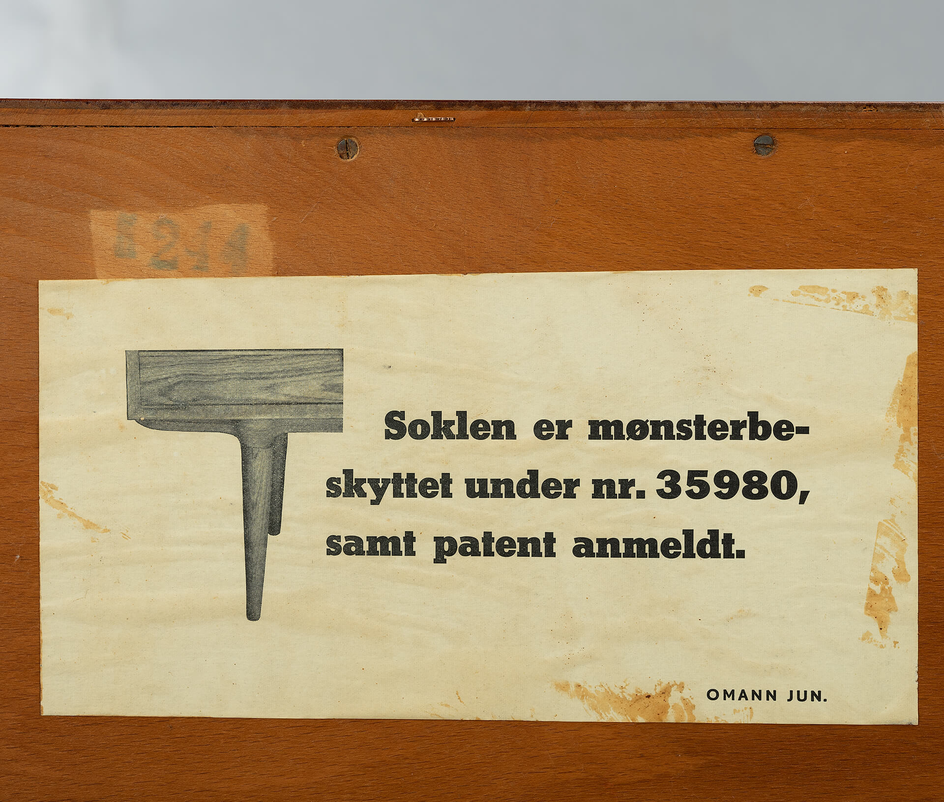 - Finished with a big Omann Jun label on the back and the number of the cabinet (this is number 244) of the Model 12 sideboards made. The cabinet is in very good vintage condition with minimal signs of wear, just a few scratches on the top. Visible as dark stripes, see photos.