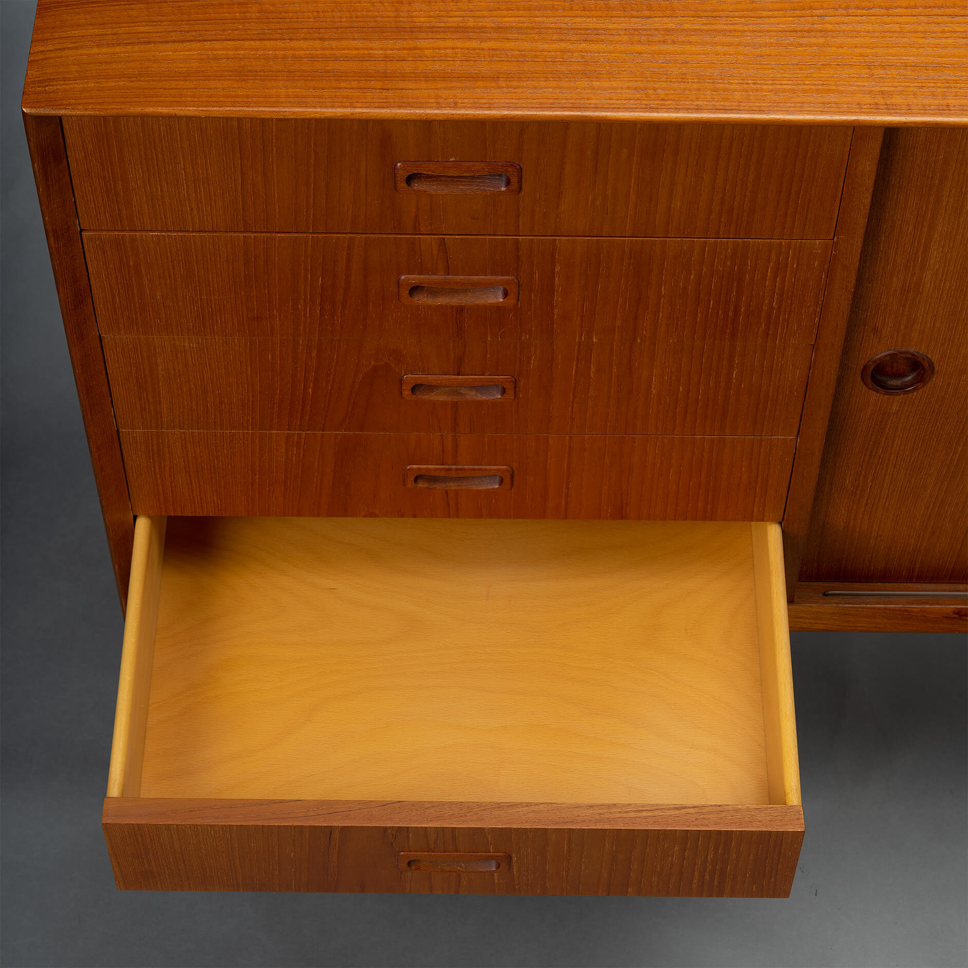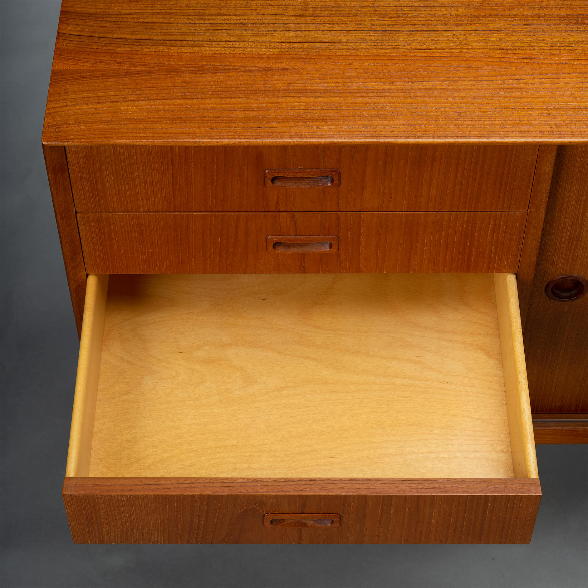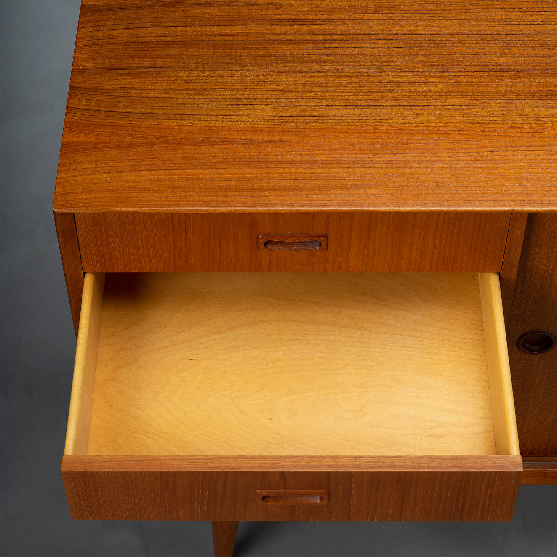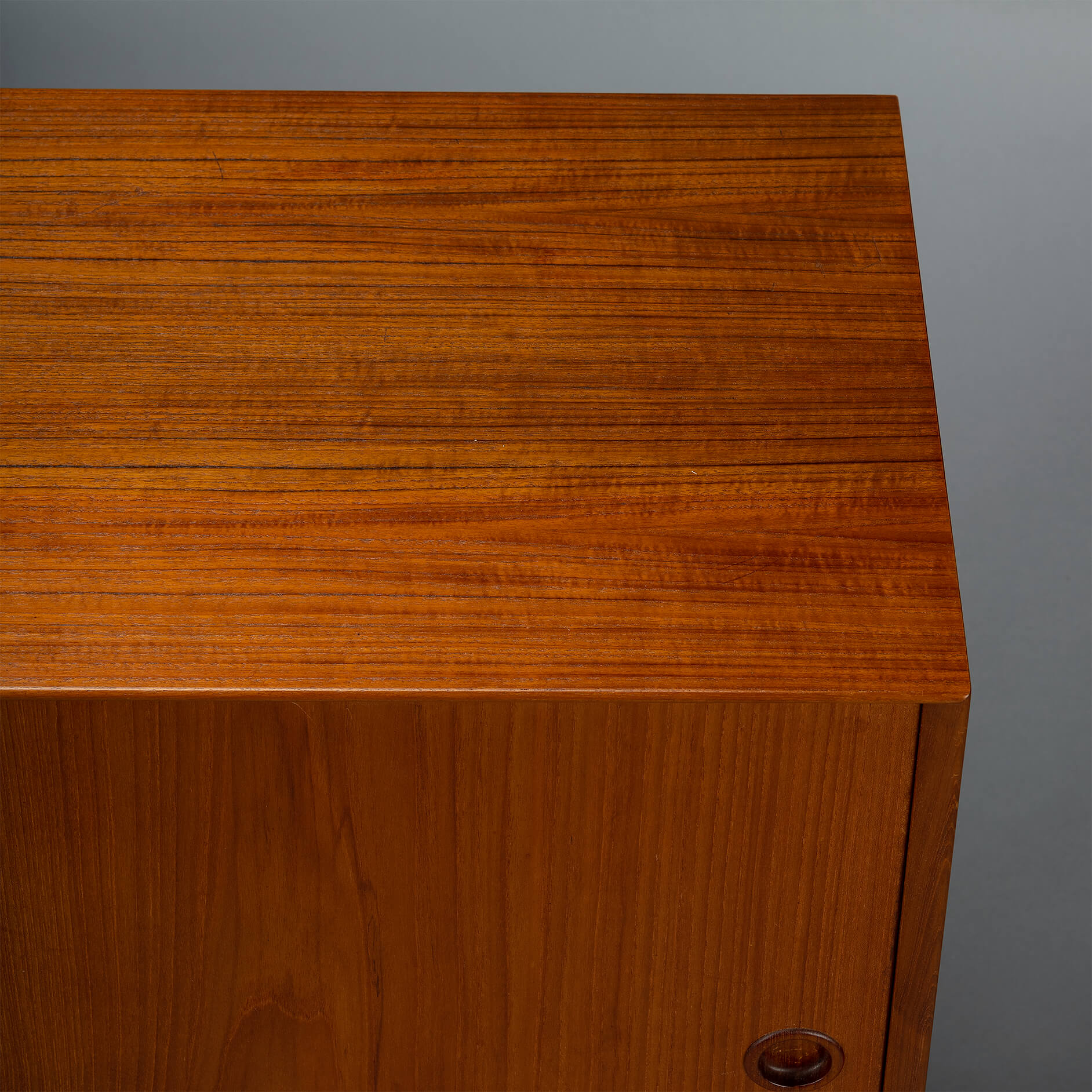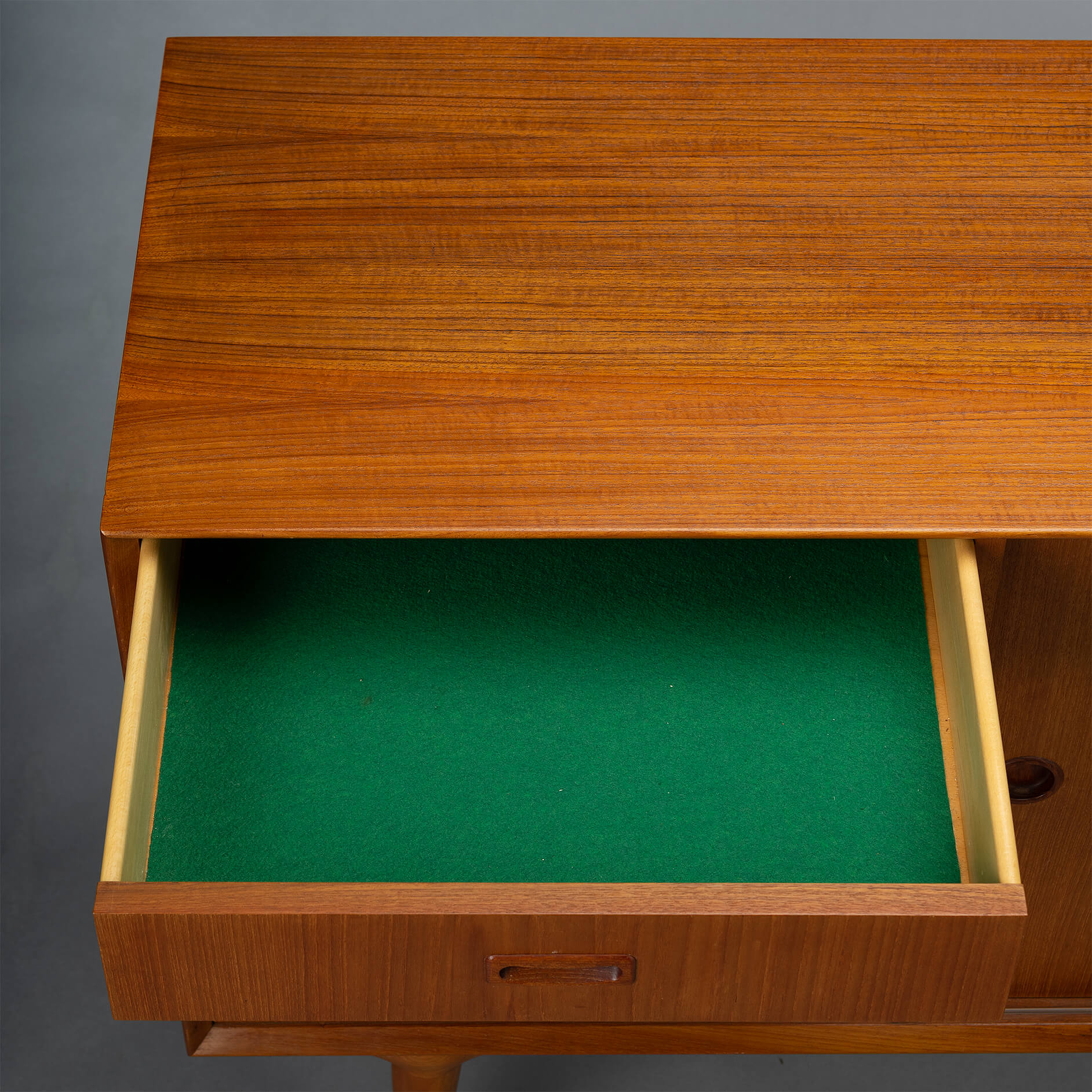 - Finished with a big Omann Jun label on the back and the number of the cabinet (this is number 244) of the Model 12 sideboards made. The cabinet is in very good vintage condition with minimal signs of wear, just a few scratches on the top. Visible as dark stripes, see photos.