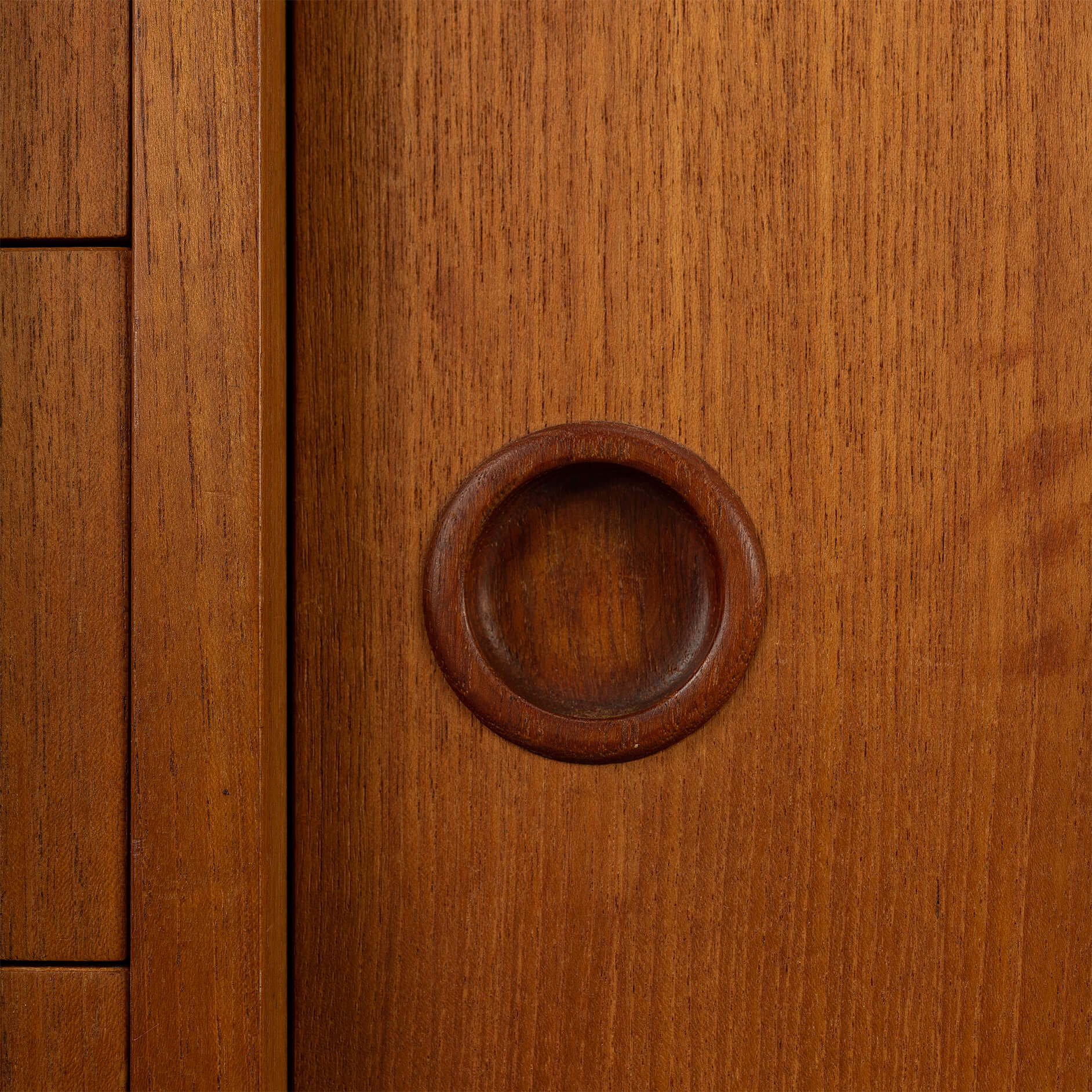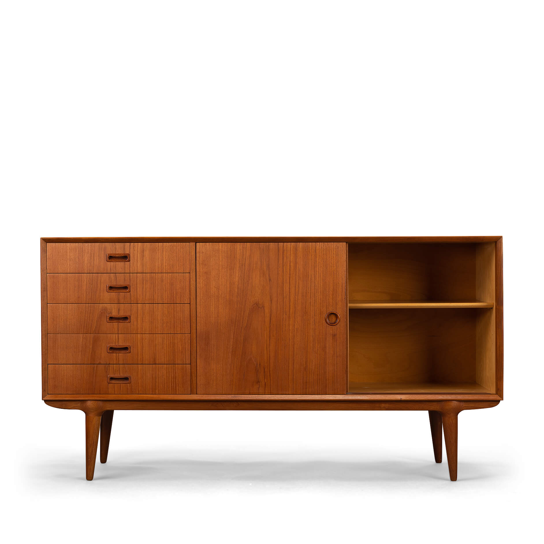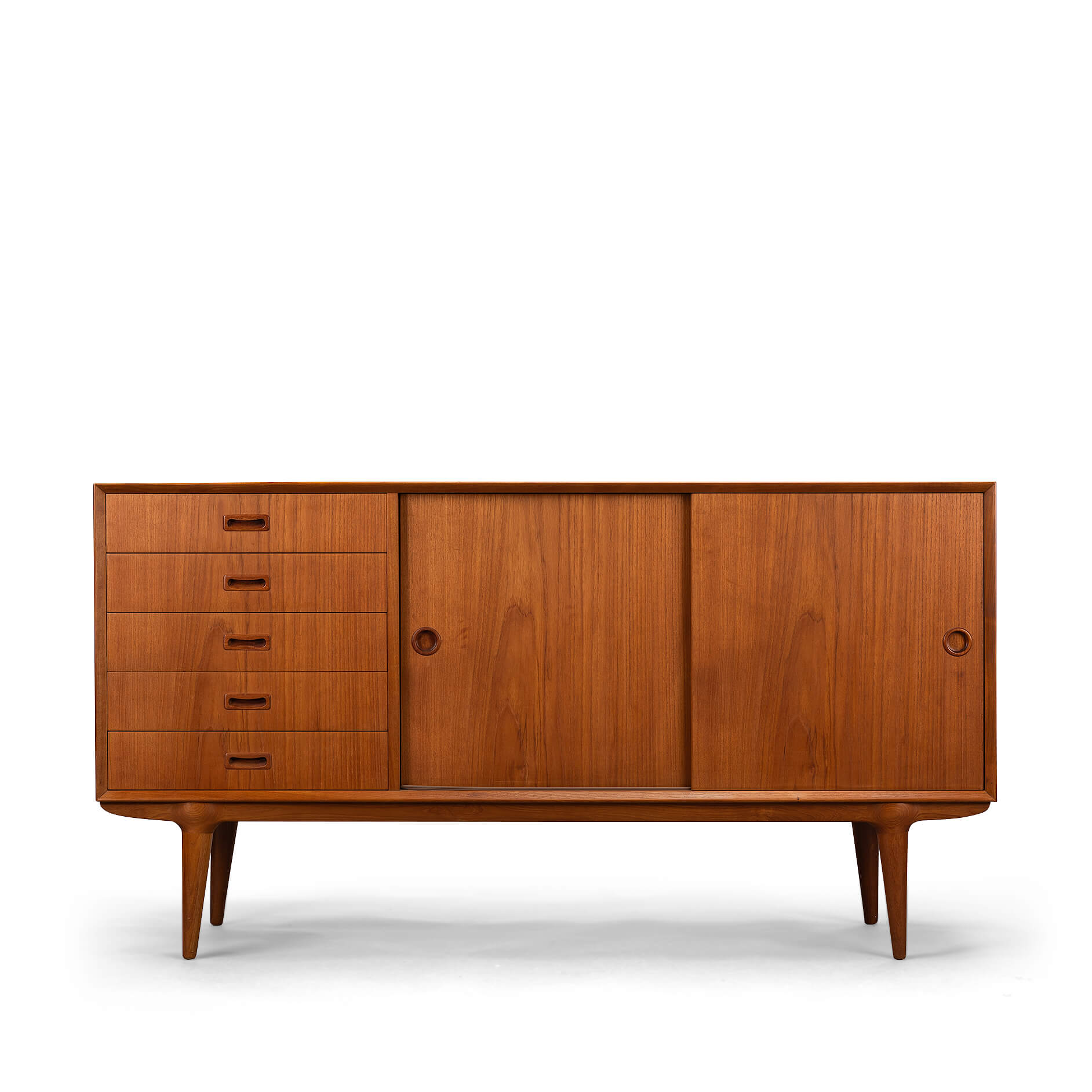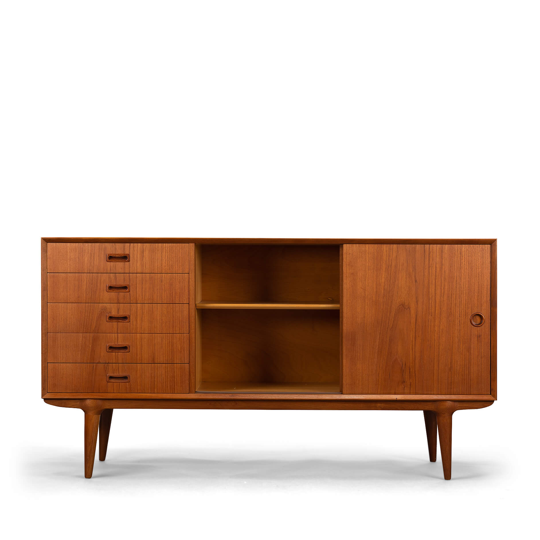 A classic among credenza's, this teak model #12 credenza designed by Gunni Omann for Omann Jun Møbelfabrik. Recognisable design features and perfectly proportioned, with a raised height of 86 cm, this piece will work well with any modern decor. Superb level of quality and use of high end materials on top of its design make it a full pull. The doors slides open to reveal an adjustable shelve. A bank of four drawers with distinctive grips provide for enough additional storage.