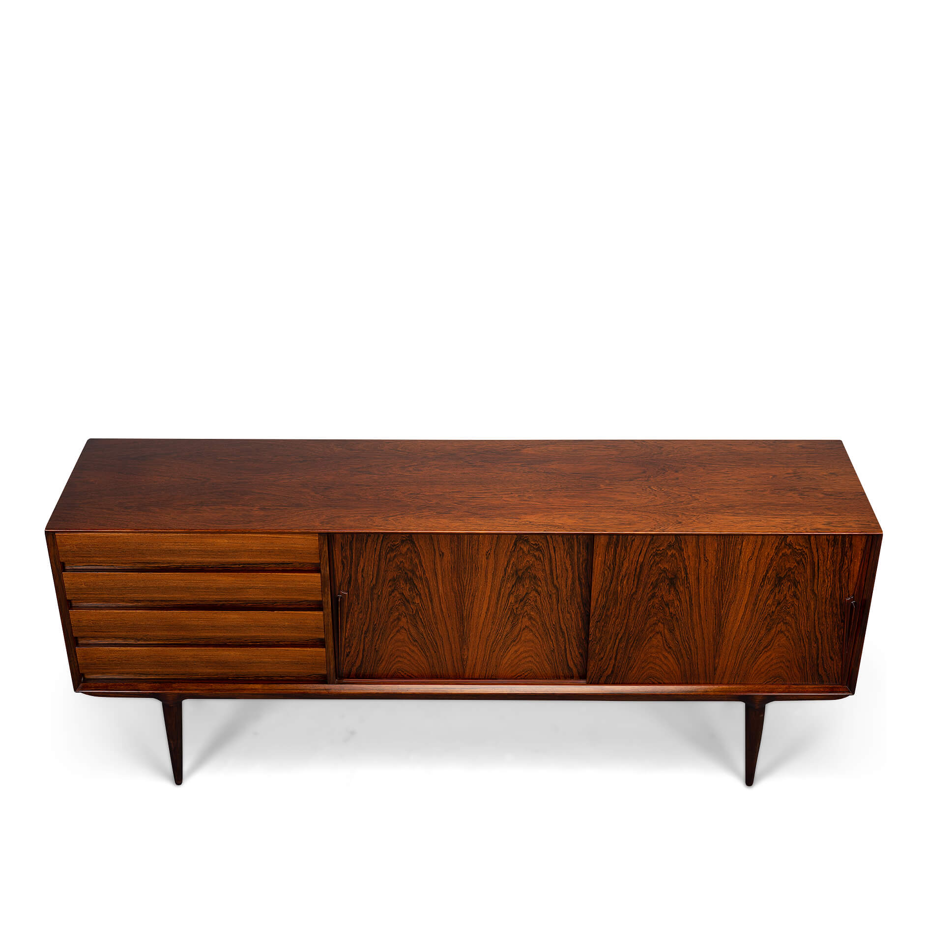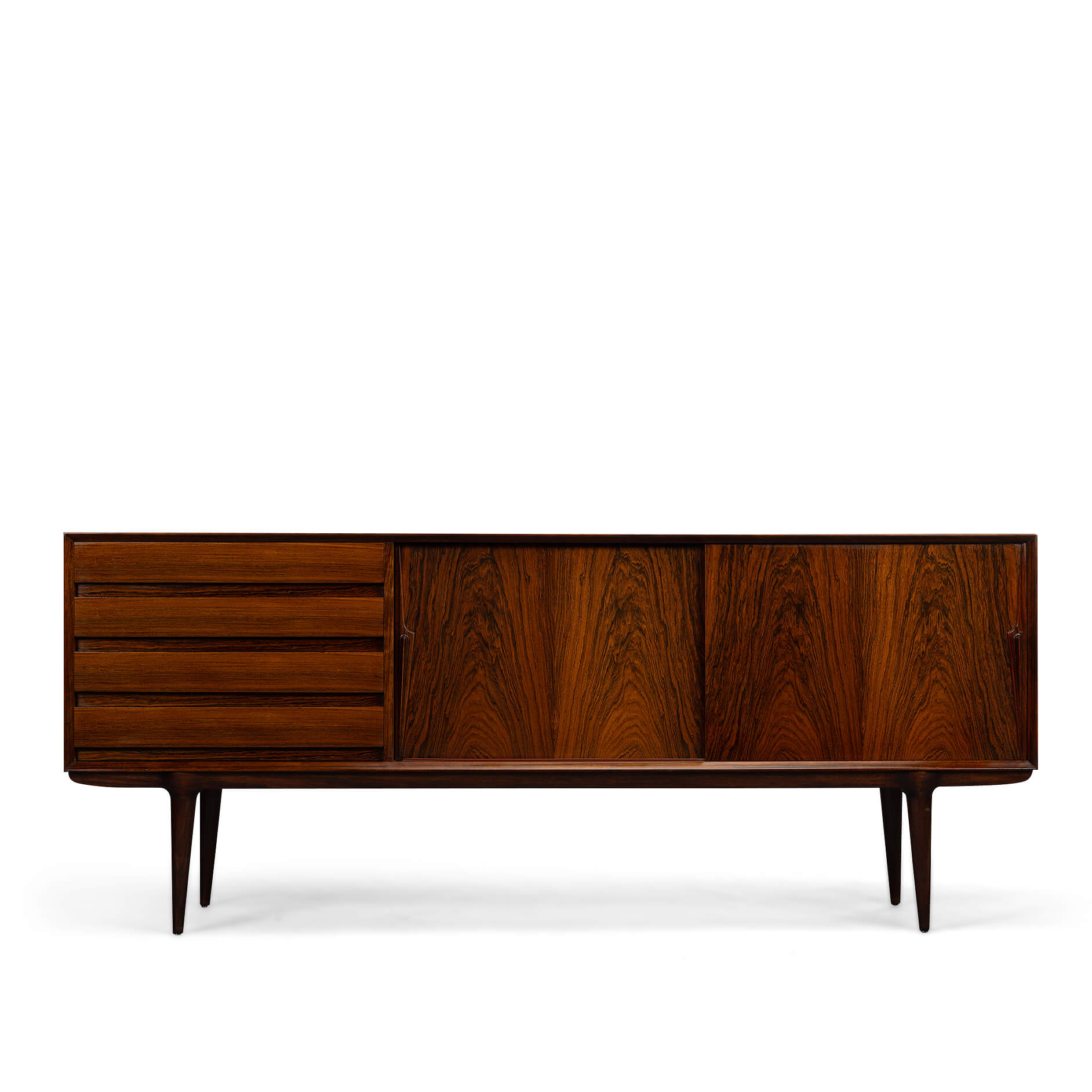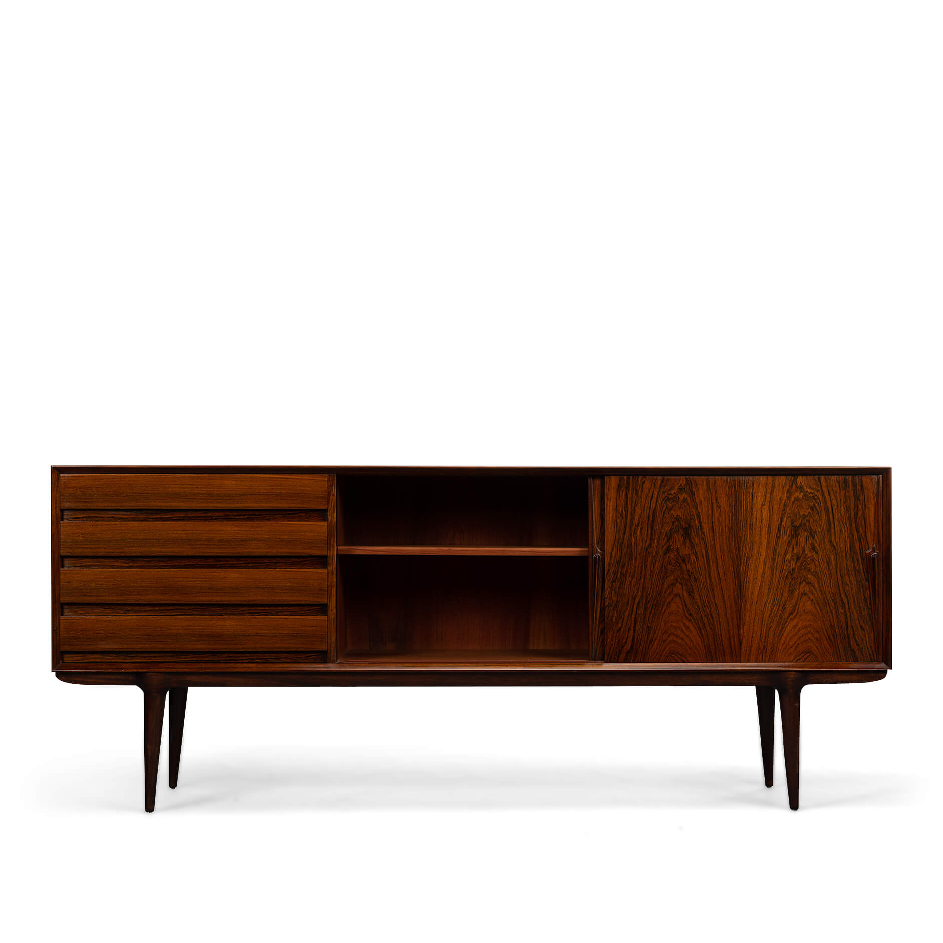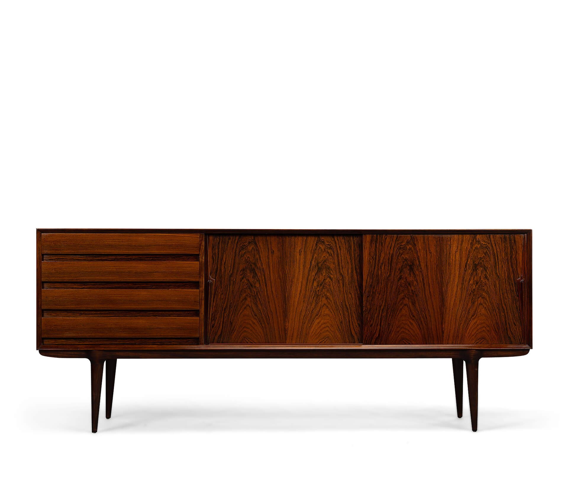 Superb level of quality and use of high end materials on top of its design make it a full pull. Doors accented by beautifully hand-sculpted rosewood handles, slide open to reveal an adjustable shelve. A bank of four drawers provide for enough additional storage. This credenza is in very good vintage condition with minimal signs of use and age.