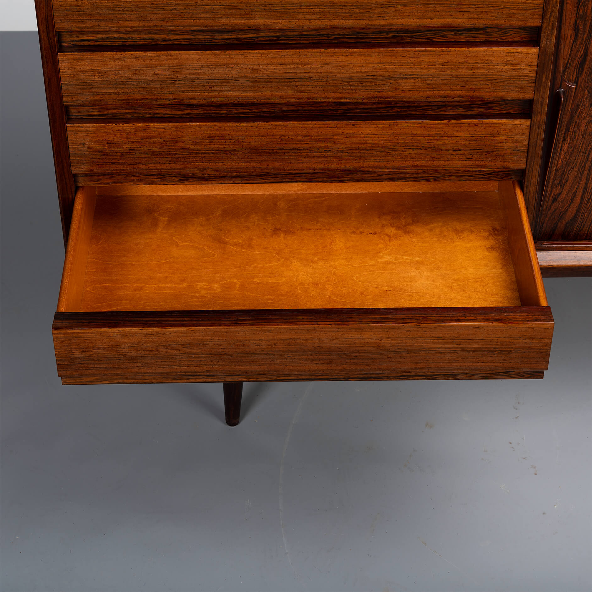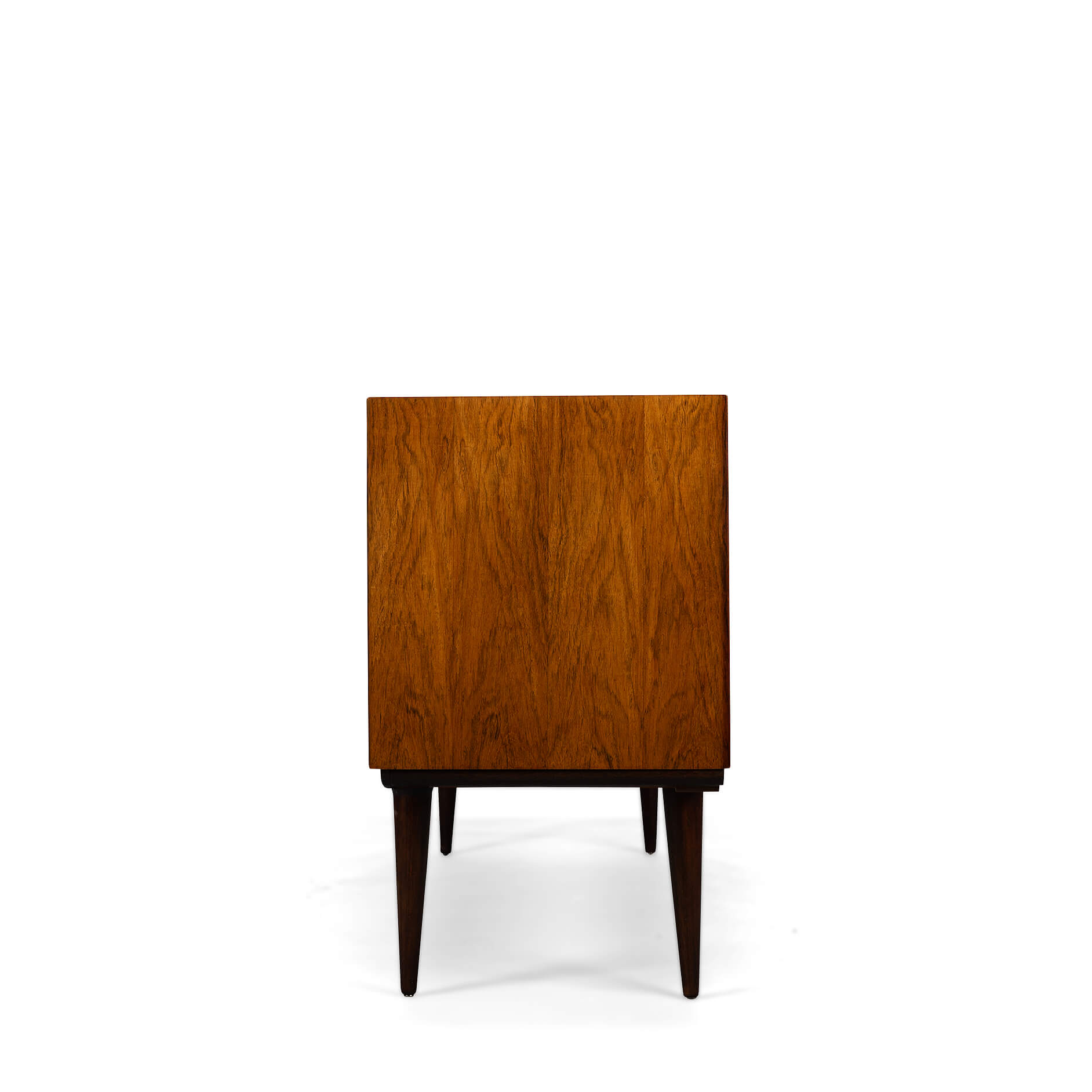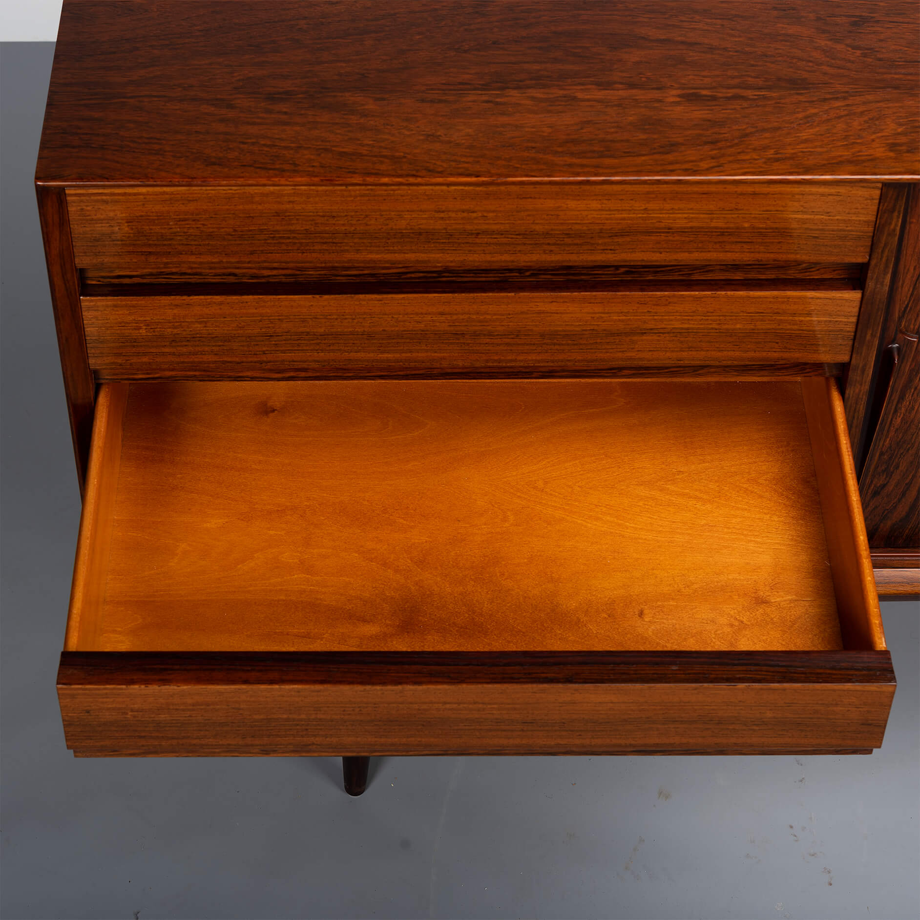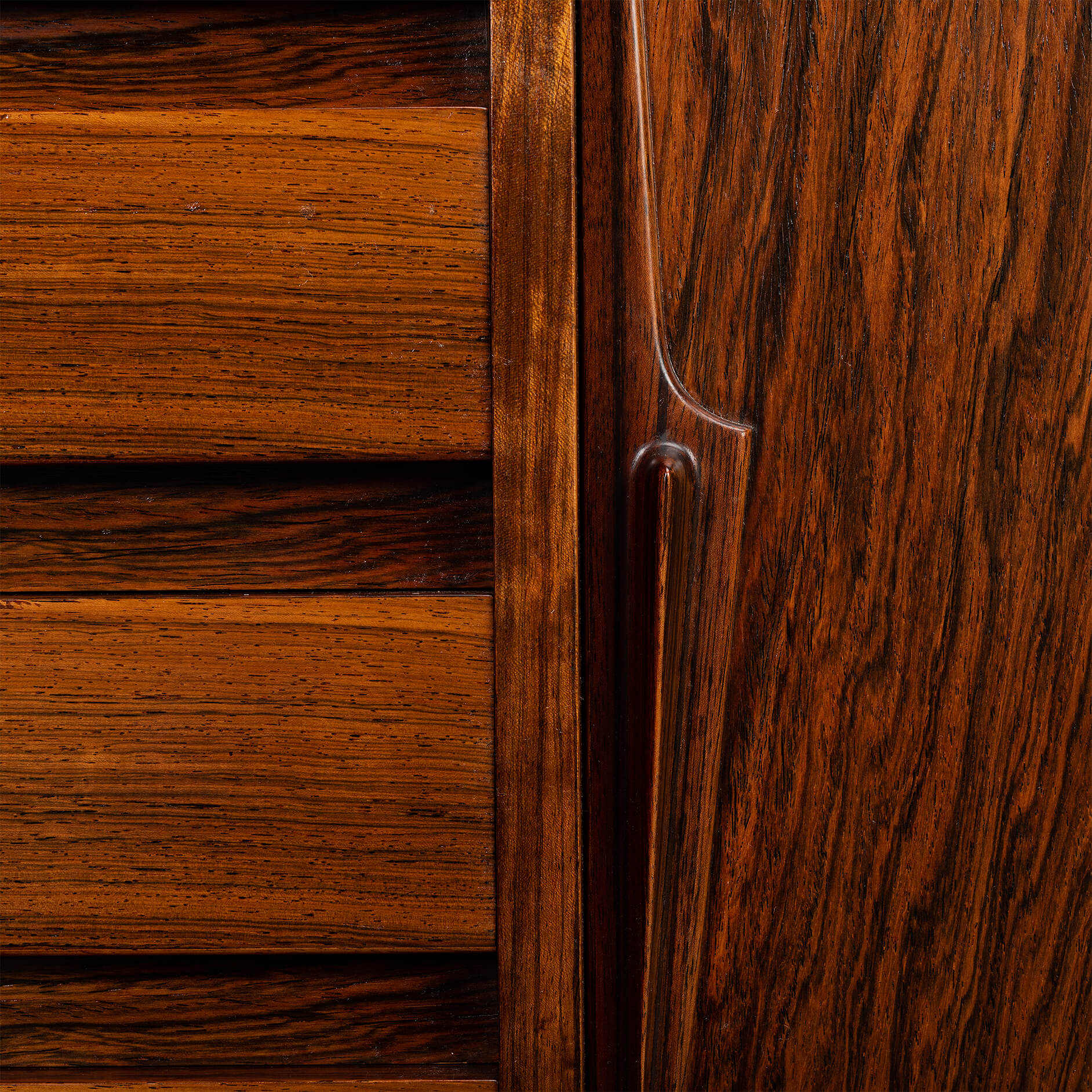 Superb level of quality and use of high end materials on top of its design make it a full pull. Doors accented by beautifully hand-sculpted rosewood handles, slide open to reveal an adjustable shelve. A bank of four drawers provide for enough additional storage. This credenza is in very good vintage condition with minimal signs of use and age.